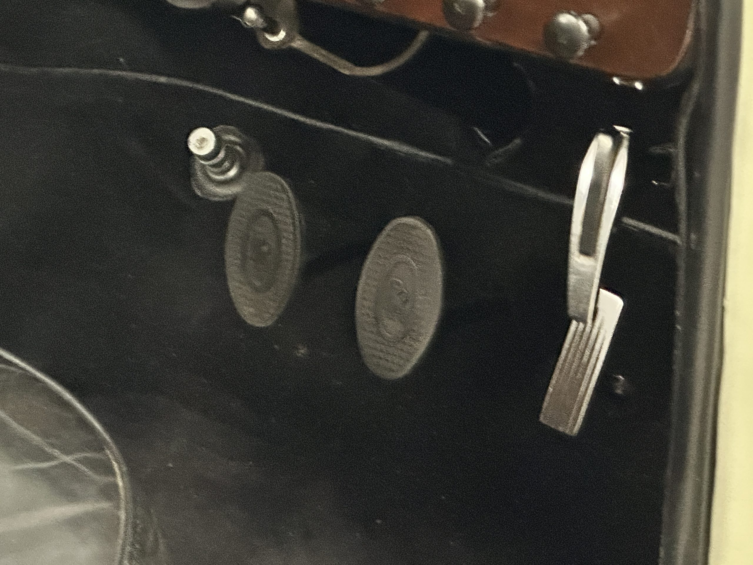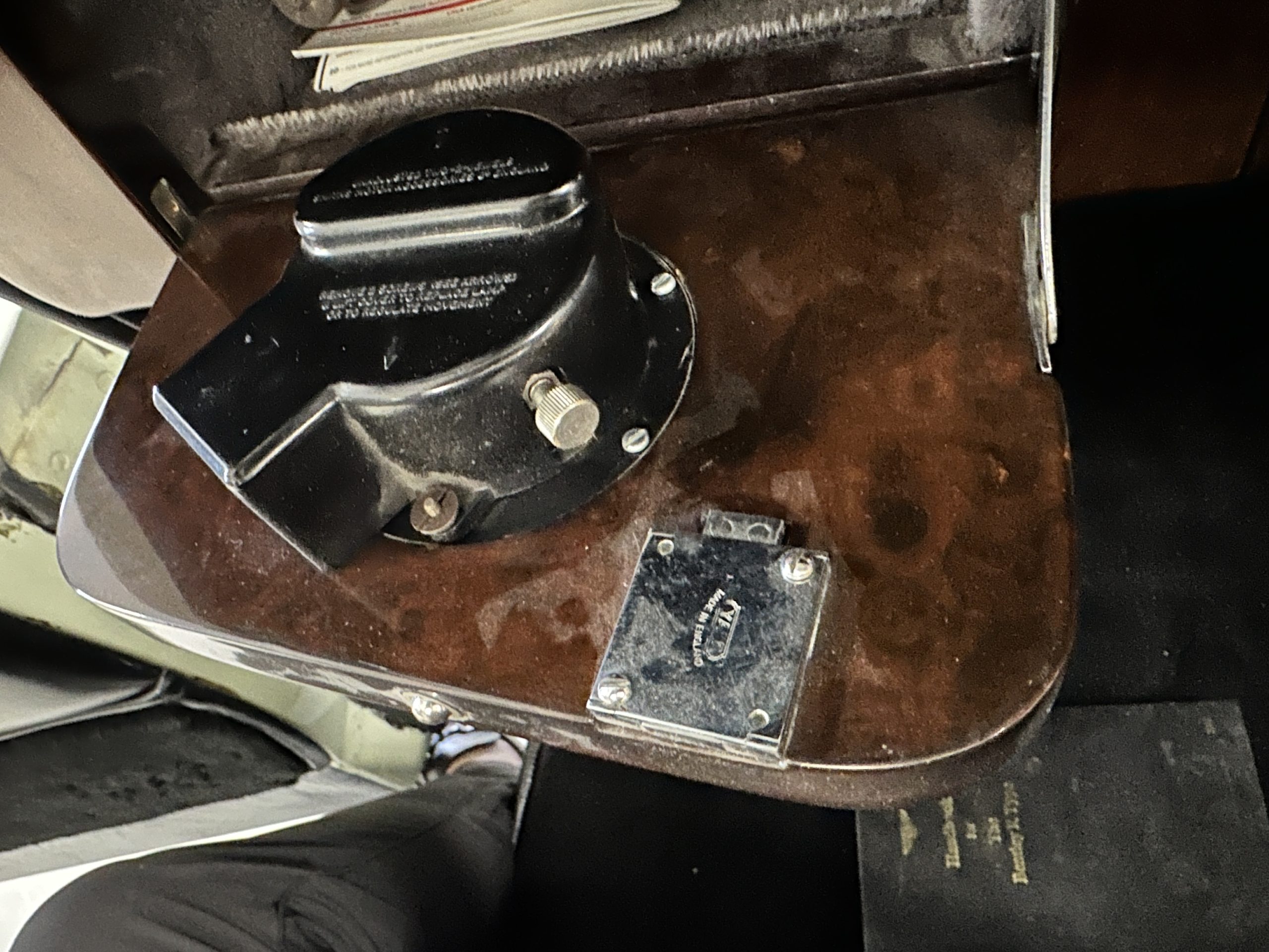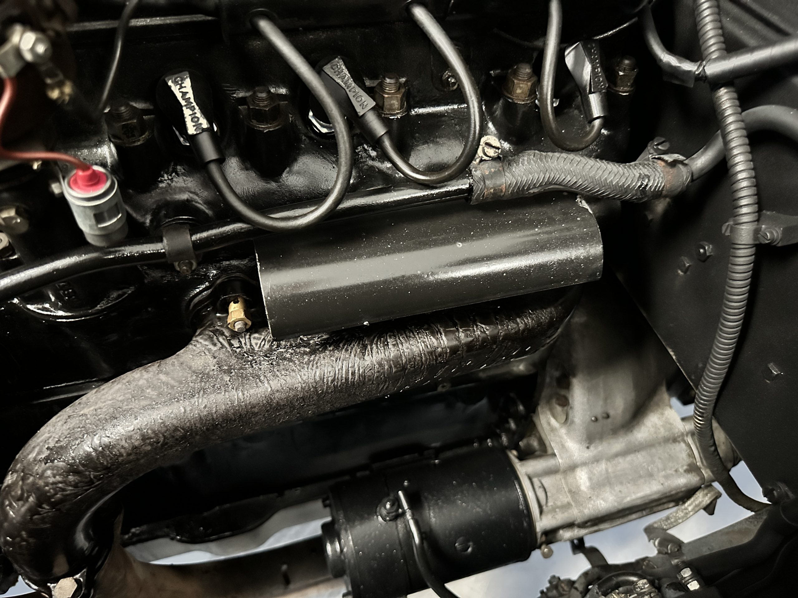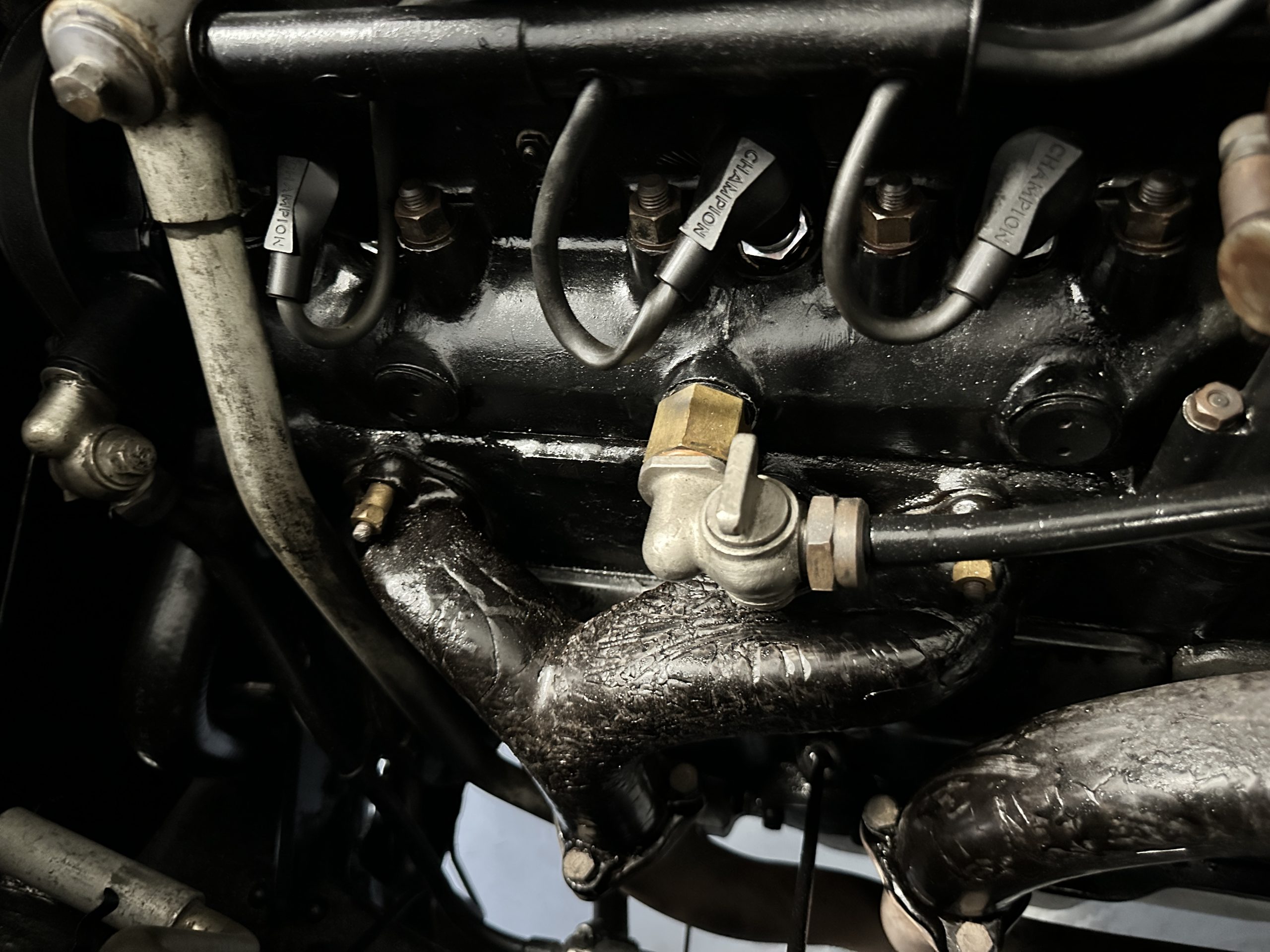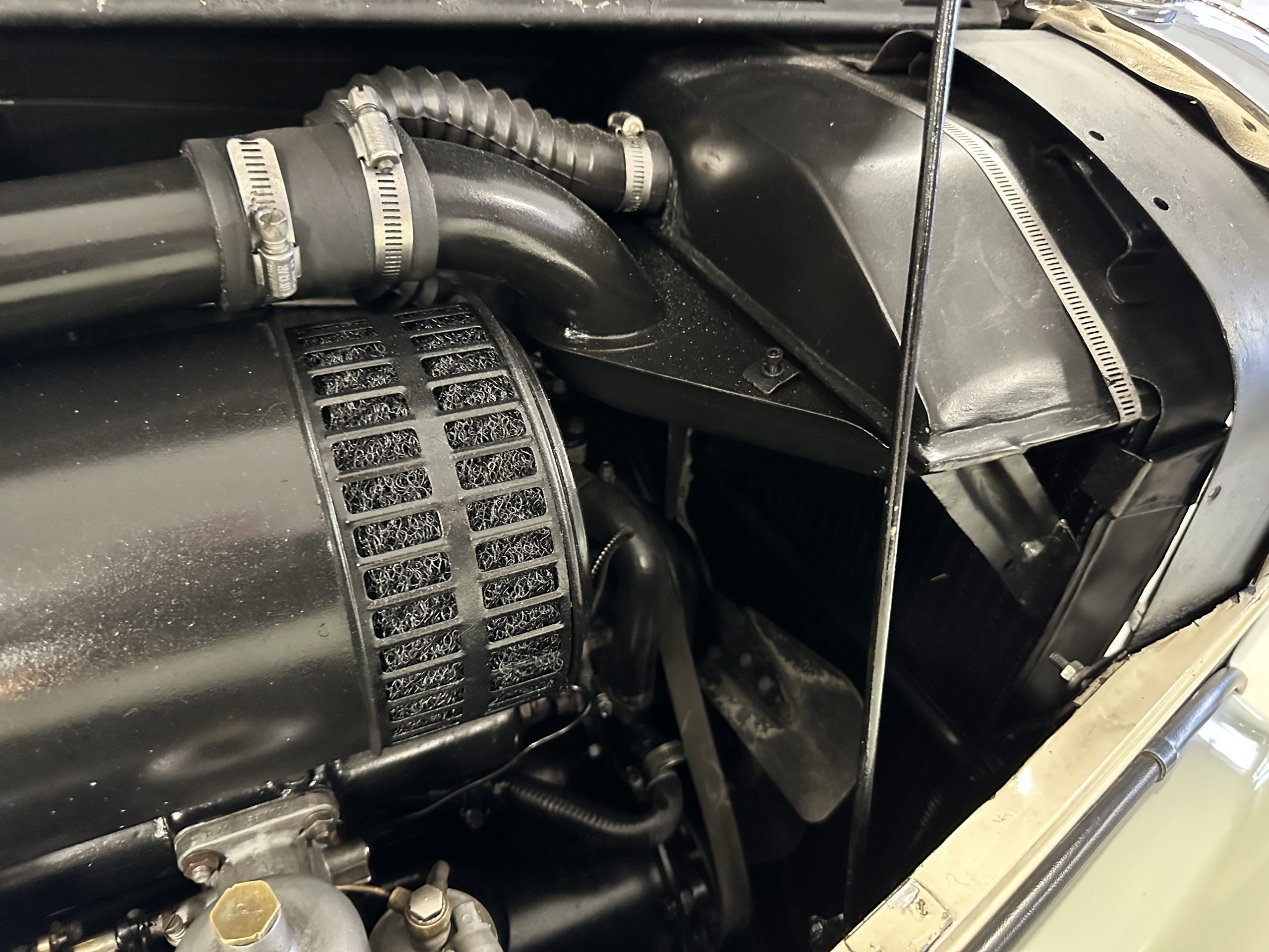 The interior is largely original in its Black Leather which is in very nice condition. The leather is without cracks and has a lovely patina. The luscious dark wood is also original and in excellent condition. The black carpet is also in very nice condition. It is difficult to discern exactly which portions of the interior are original versus an older restored example. But overall, the interior has a nice consistent patina and presents very well. The instruments work well, and its radio has been removed from the dashboard.
