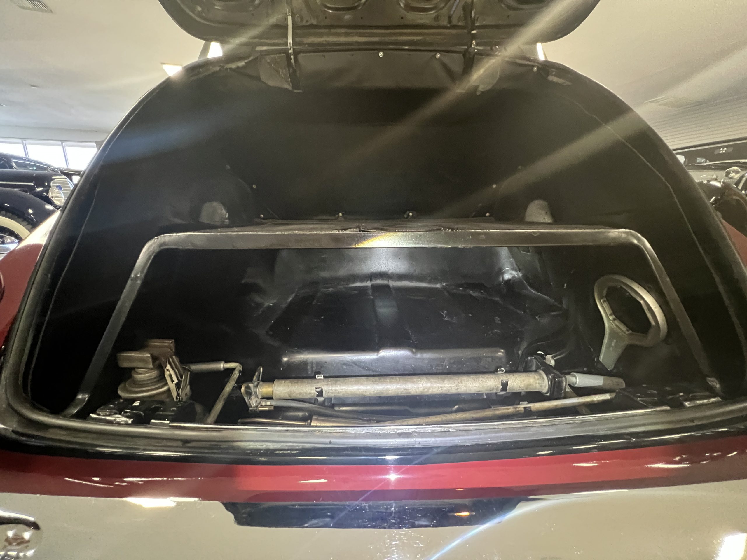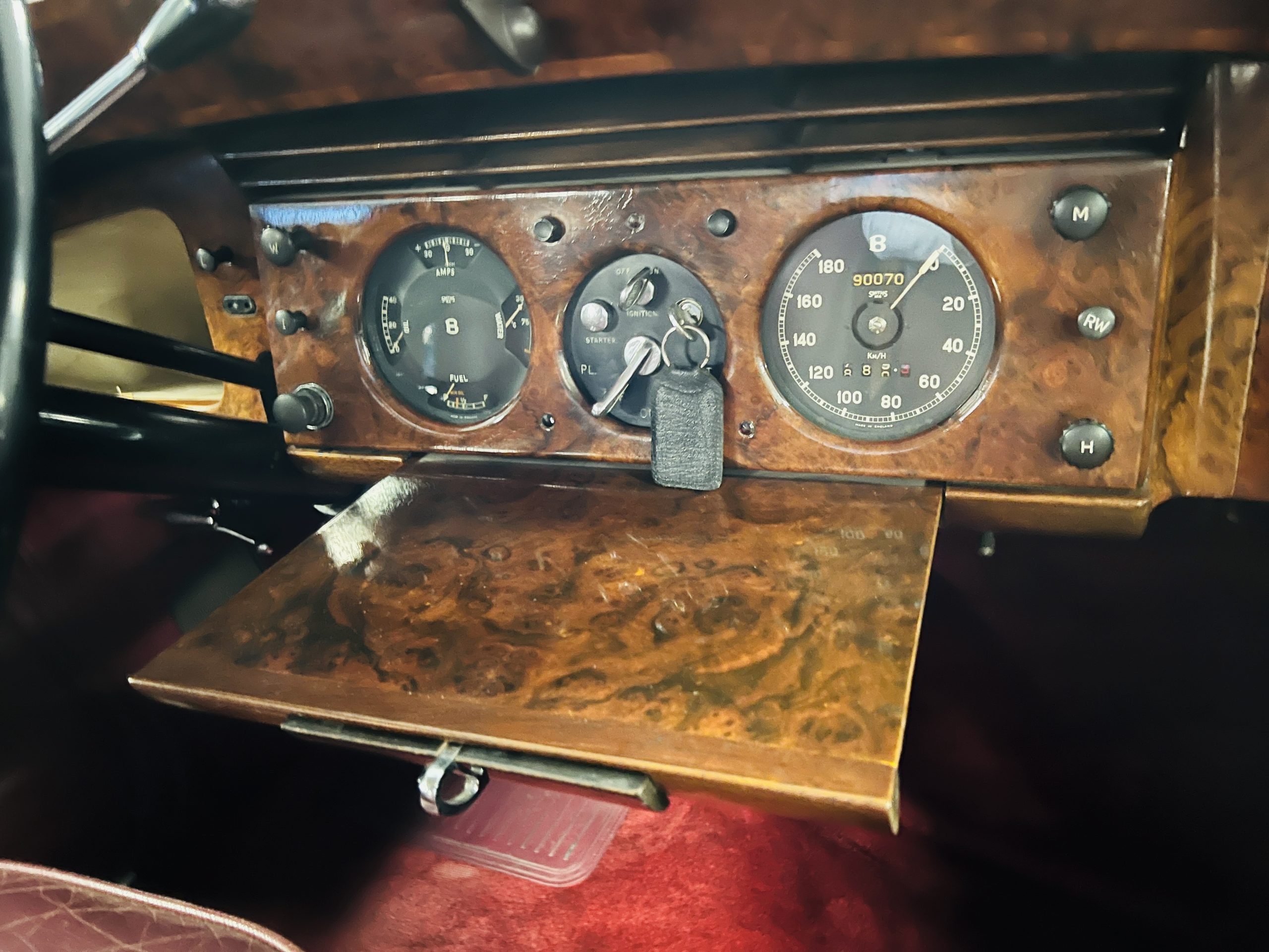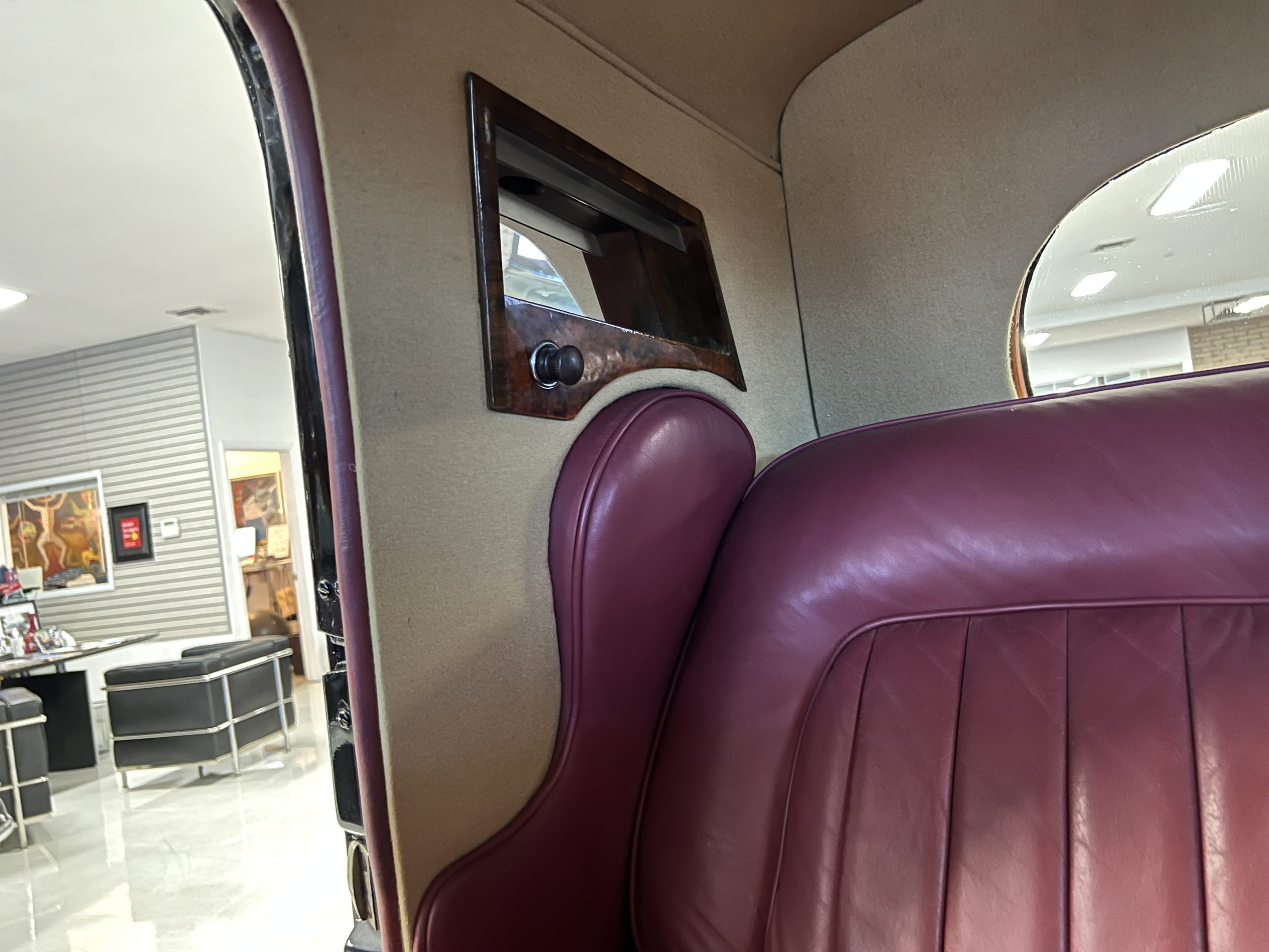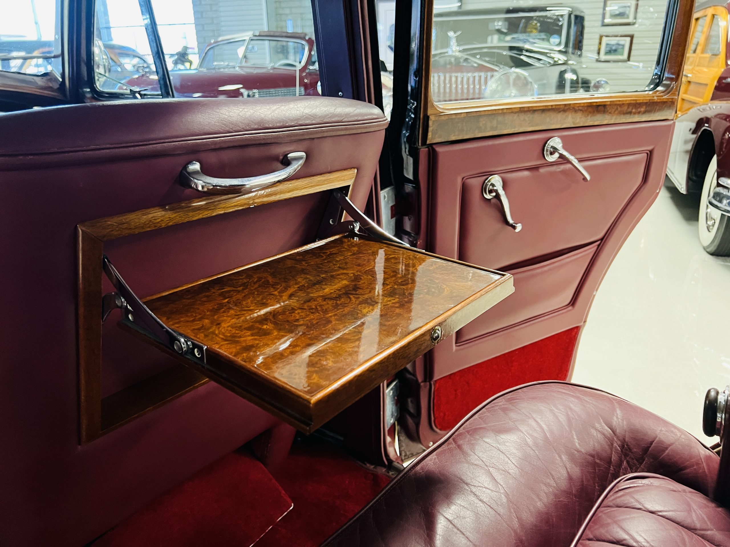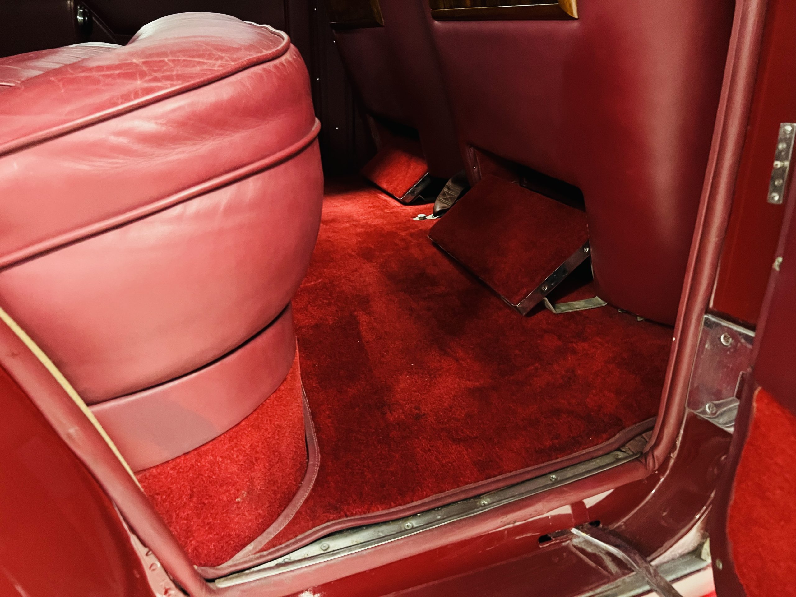 The wood trim is in overall good condition showing some patina. The newer burgundy leather interior is equally as nice and is very soft and supple. There is very minor superficial creasing in the burgundy leather. The Wilton wool carpets are in great condition, with slight shrinkage and otherwise free of blemishes. The steering wheel is good but cracked in a few places. The picnic tables are in excellent condition.