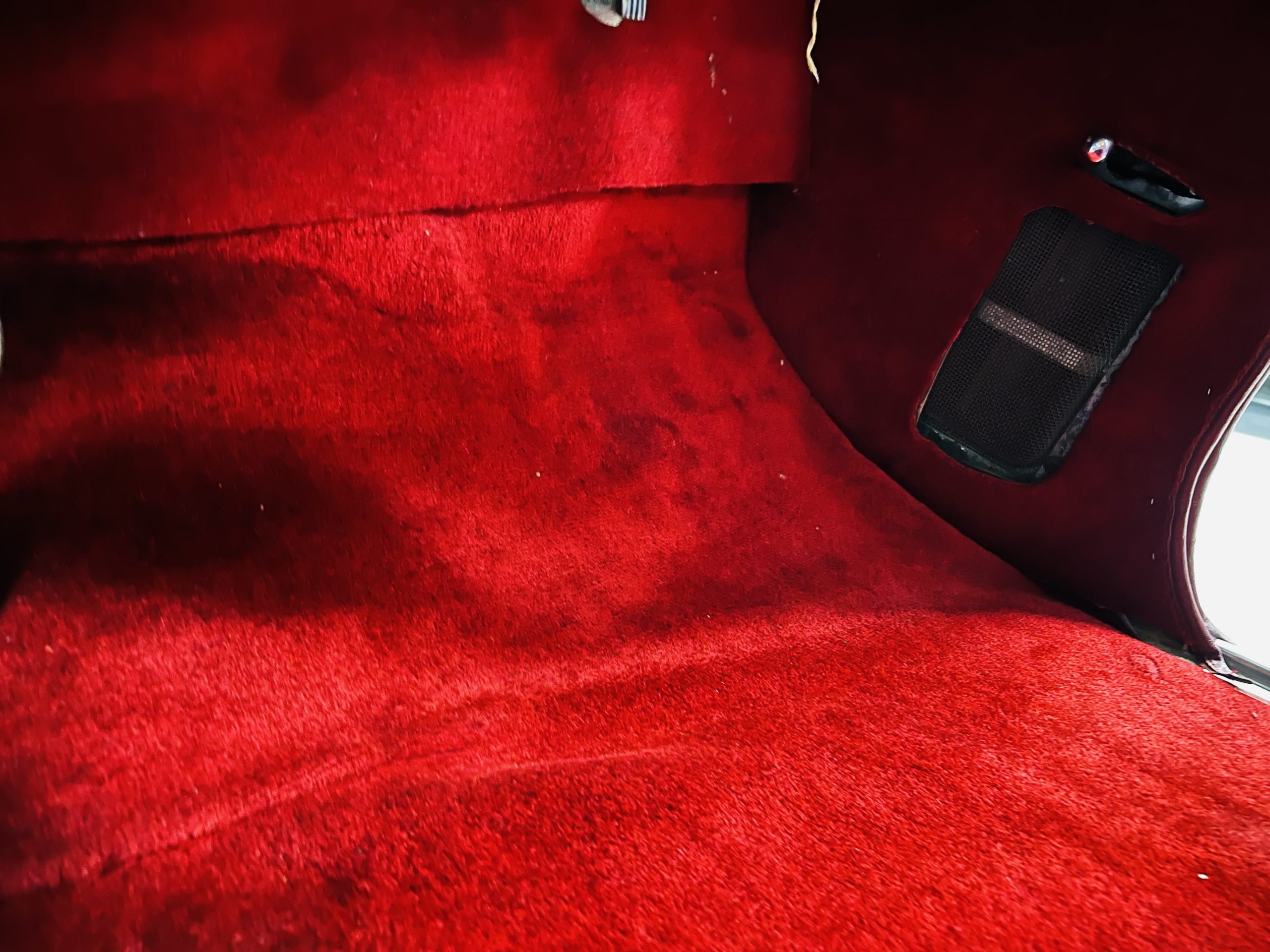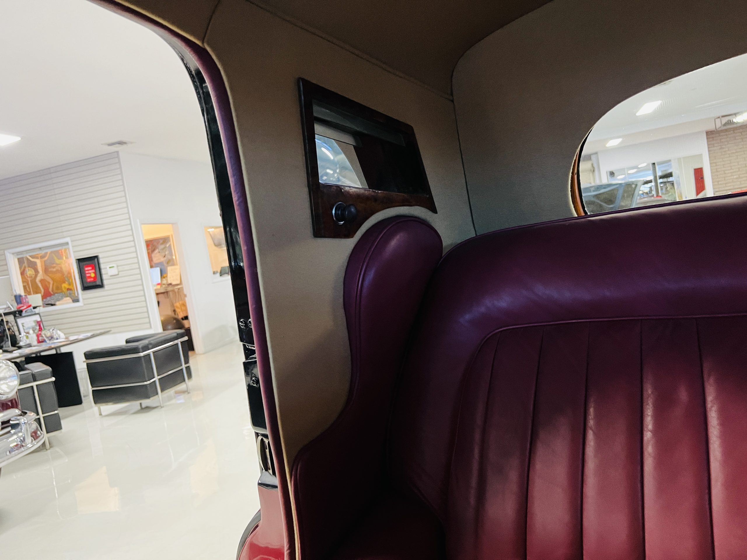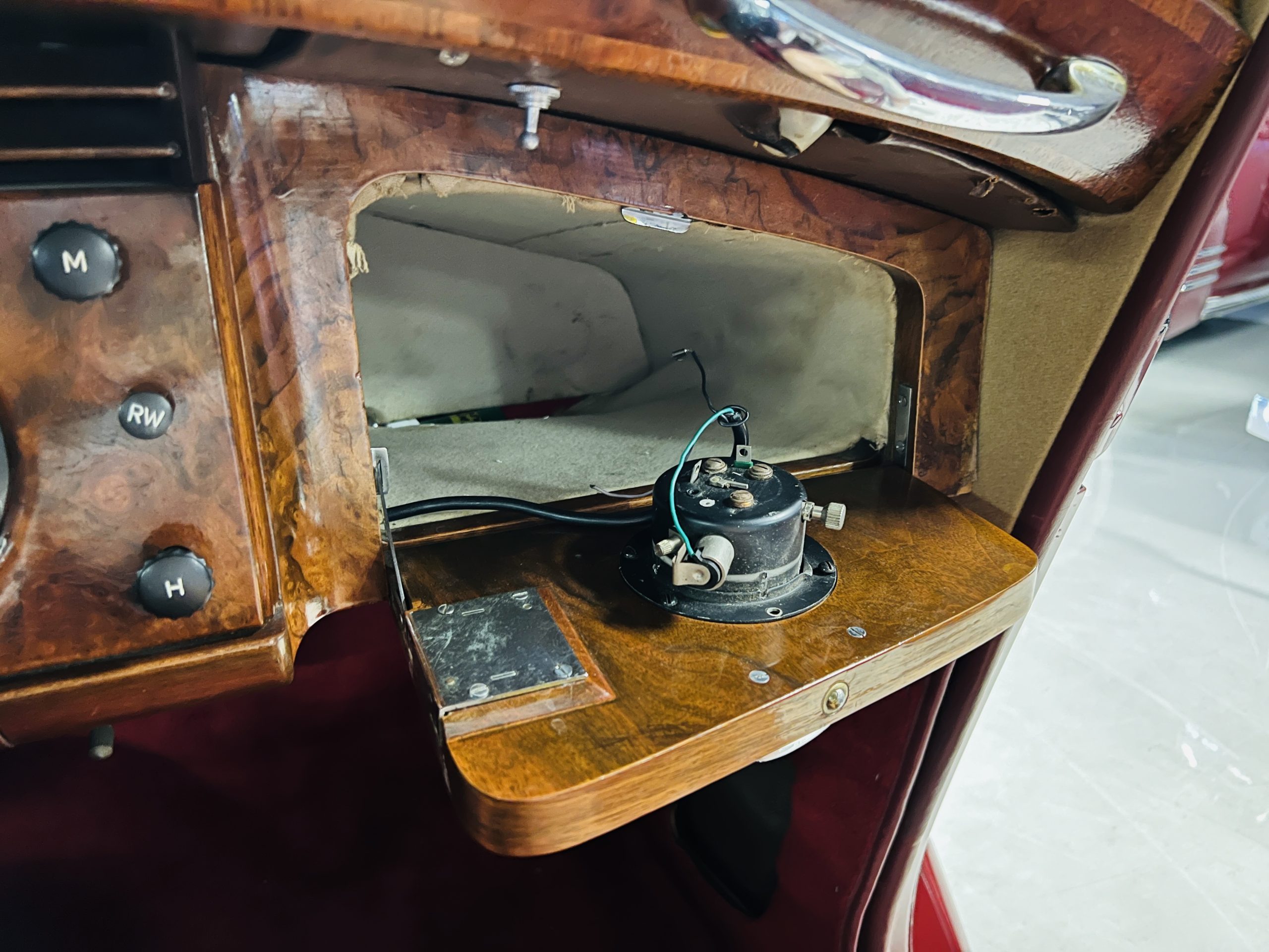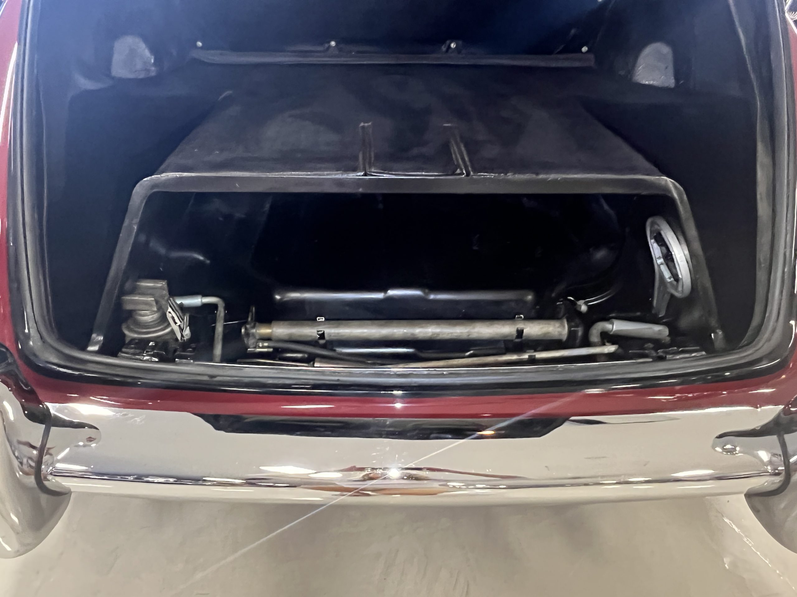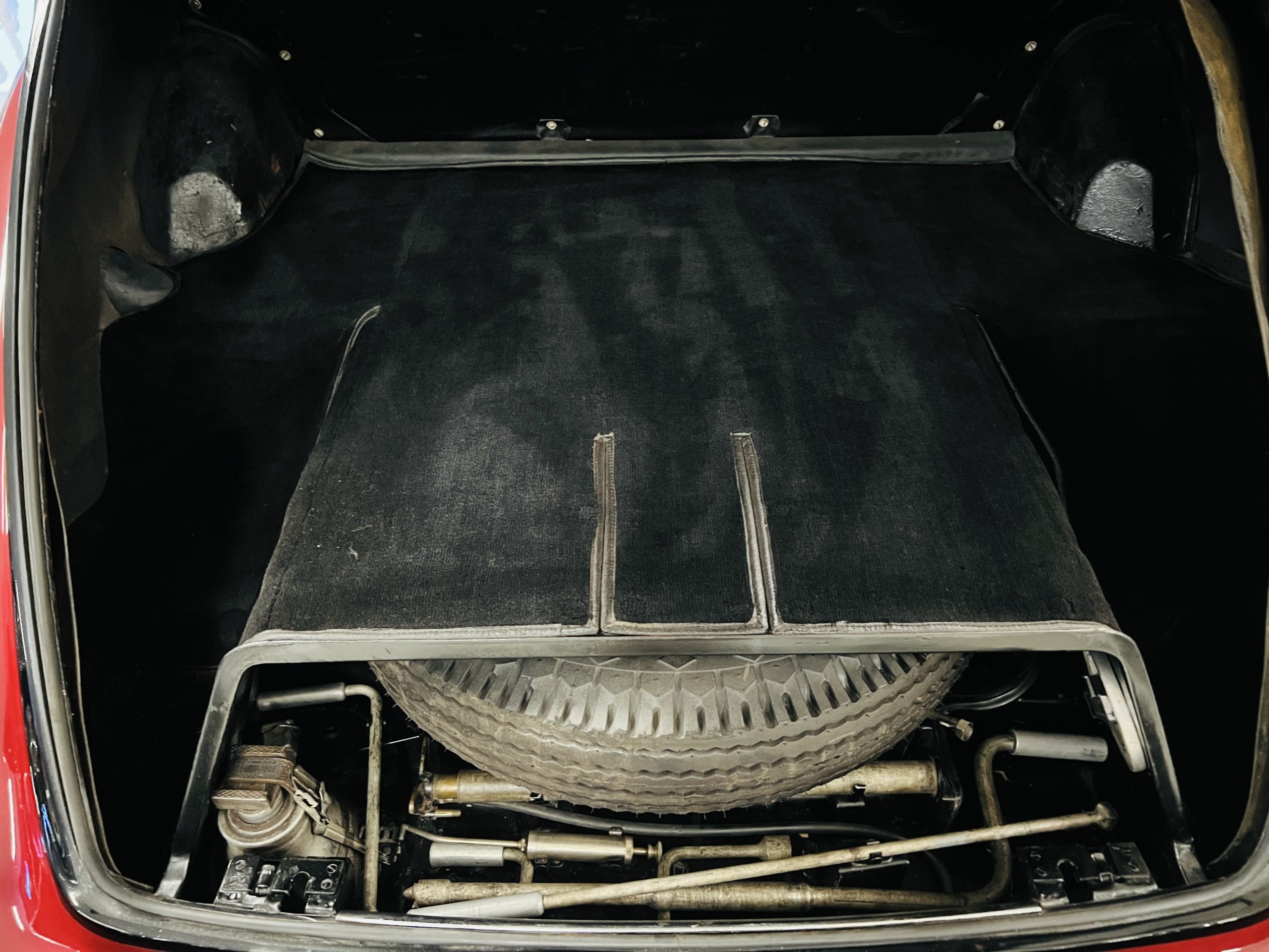 The wood trim is in overall good condition showing some patina. The newer burgundy leather interior is equally as nice and is very soft and supple. There is very minor superficial creasing in the burgundy leather. The Wilton wool carpets are in great condition, with slight shrinkage and otherwise free of blemishes. The steering wheel is good but cracked in a few places. The picnic tables are in excellent condition.