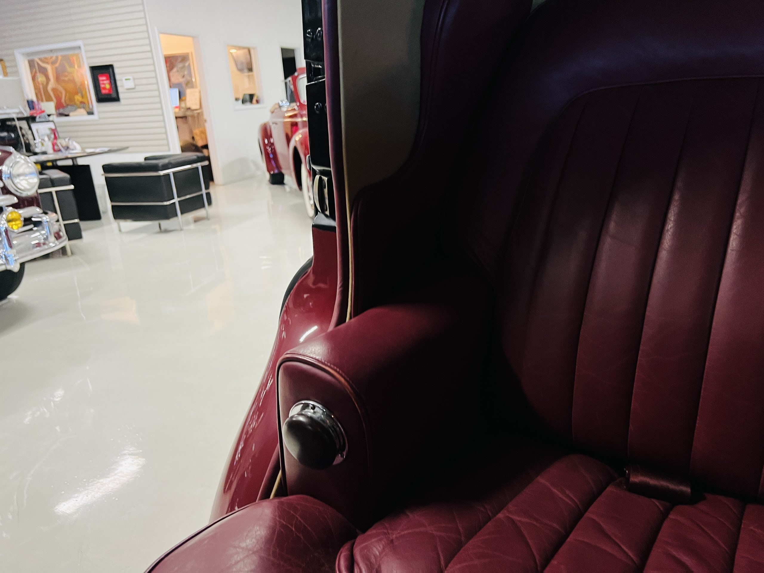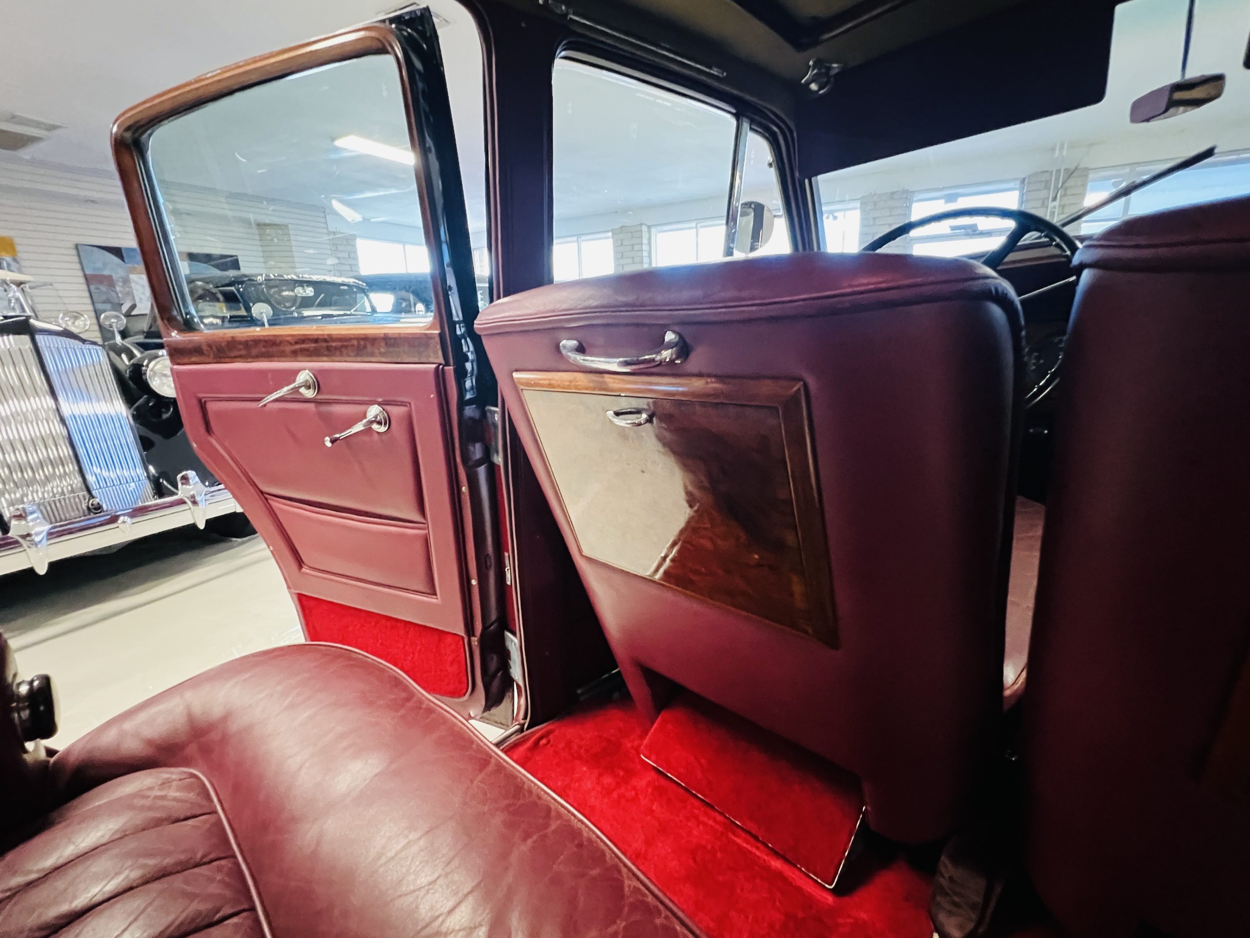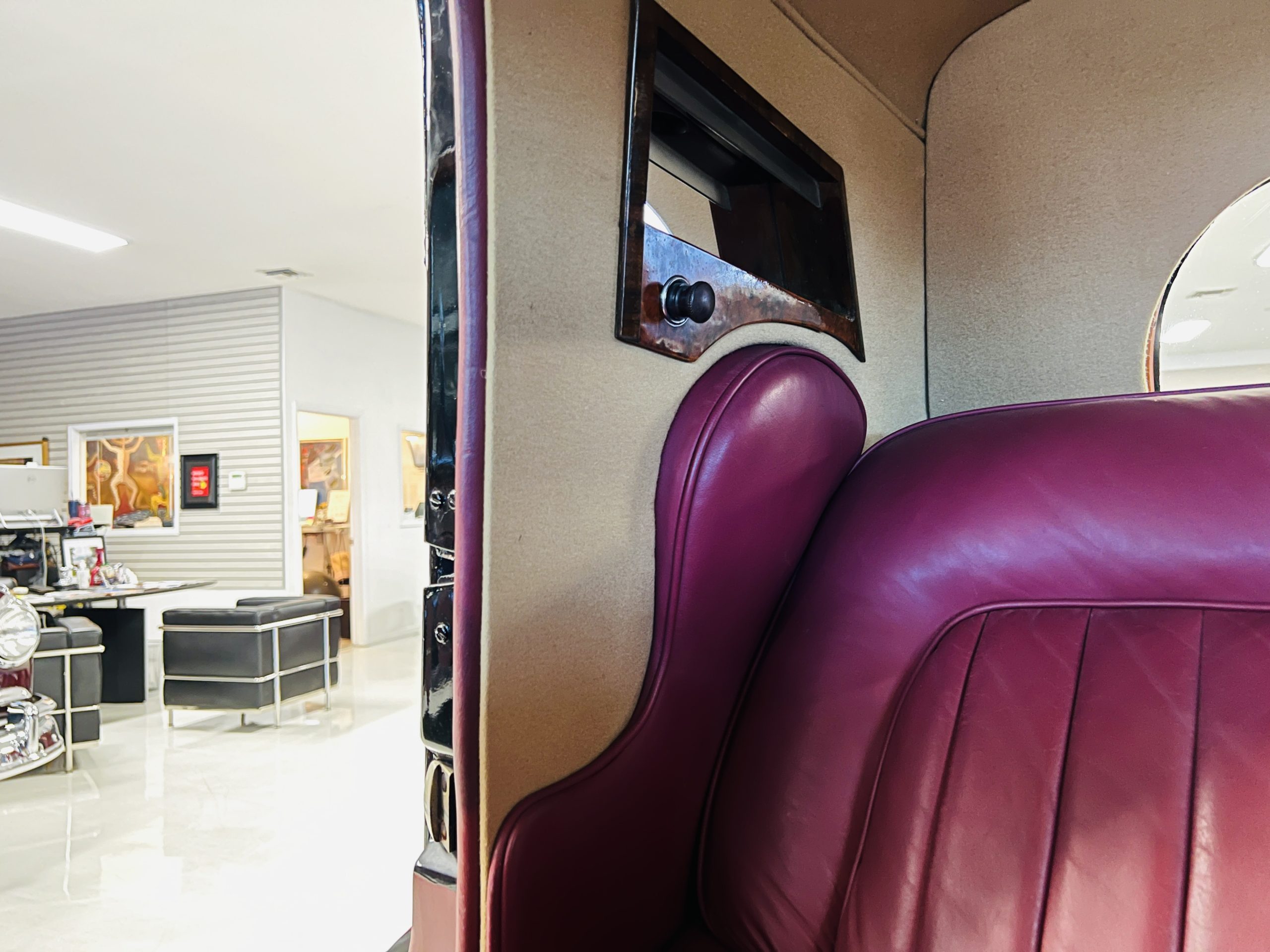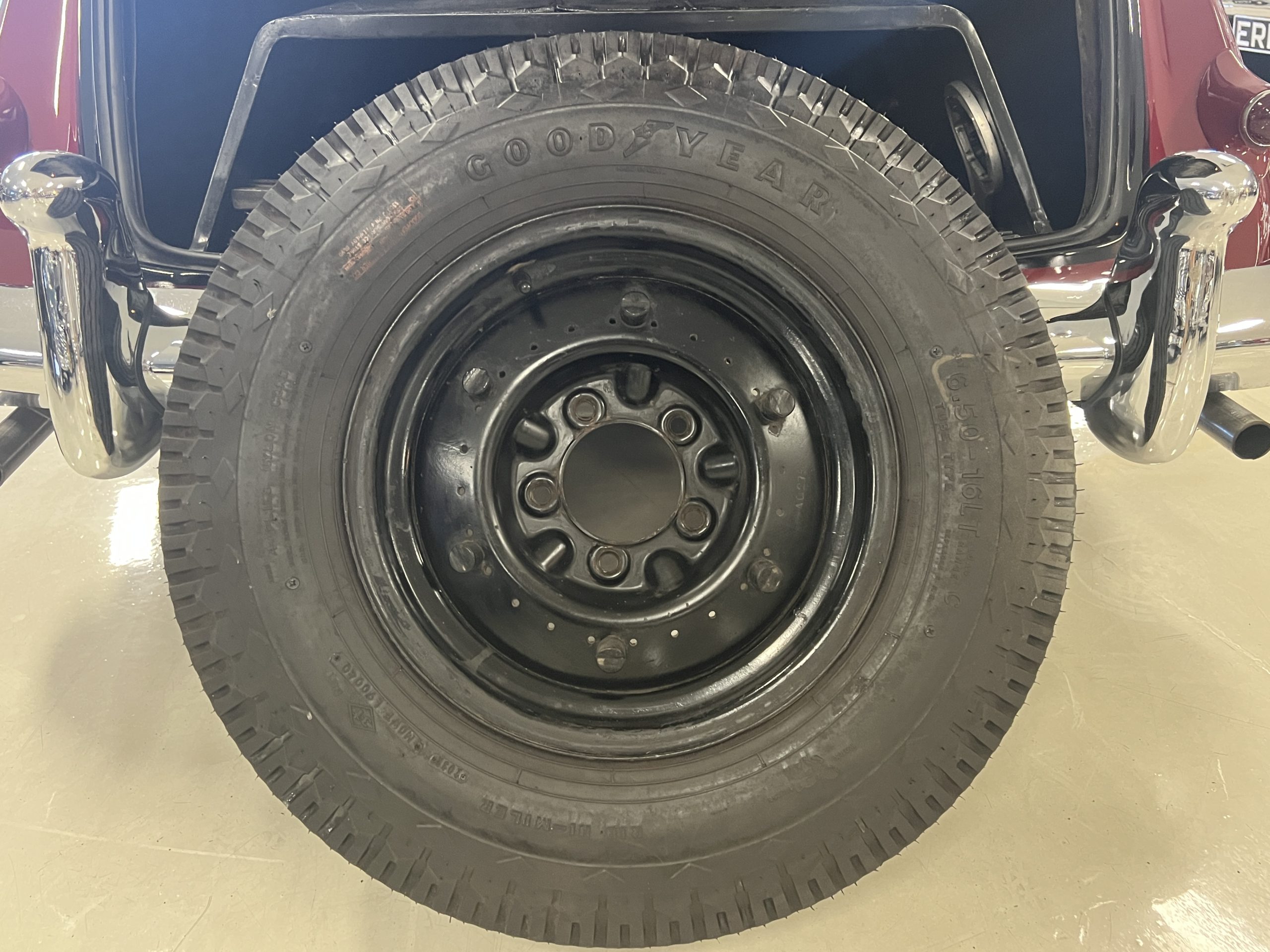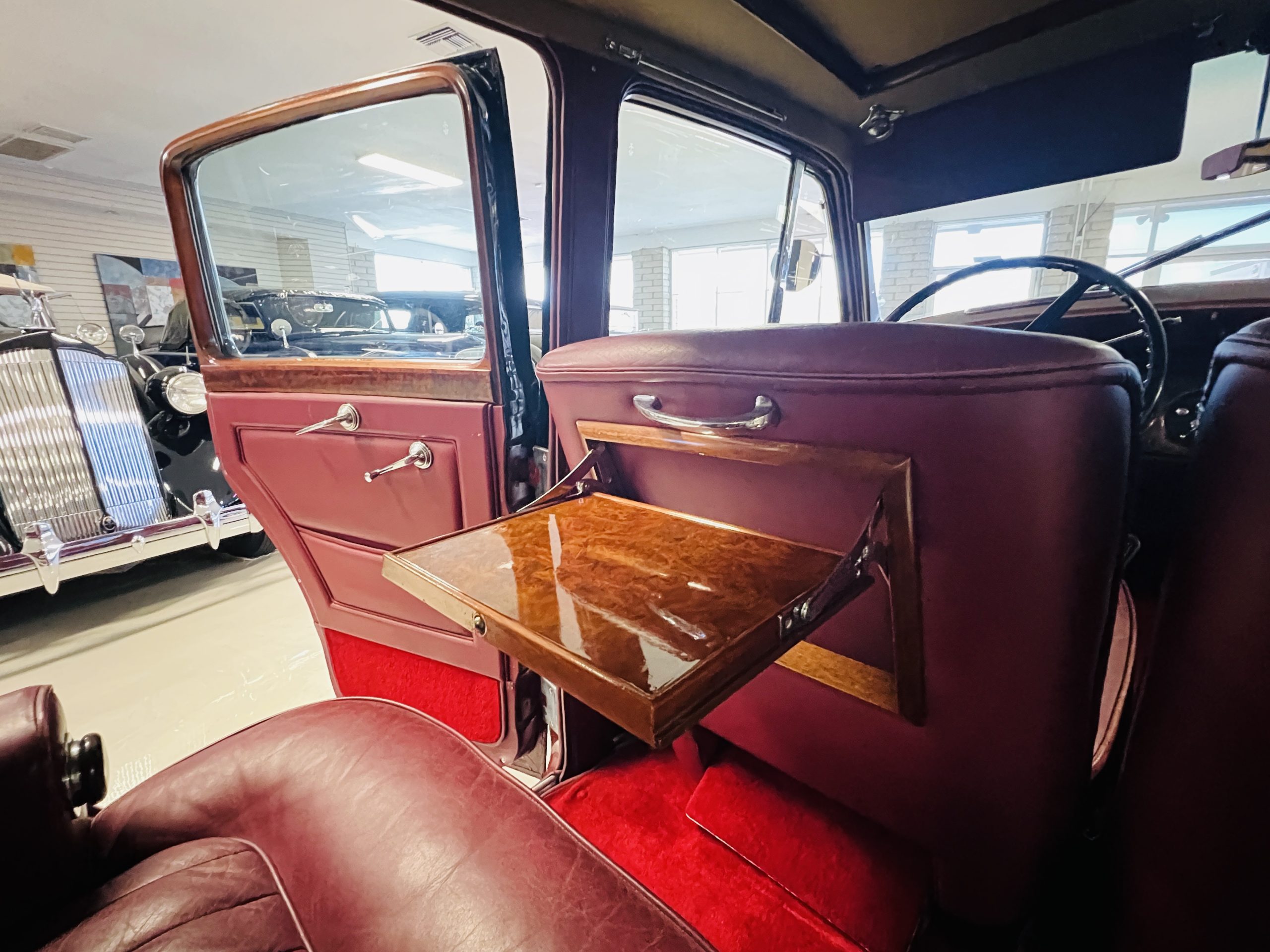 The wood trim is in overall good condition showing some patina. The newer burgundy leather interior is equally as nice and is very soft and supple. There is very minor superficial creasing in the burgundy leather. The Wilton wool carpets are in great condition, with slight shrinkage and otherwise free of blemishes. The steering wheel is good but cracked in a few places. The picnic tables are in excellent condition.