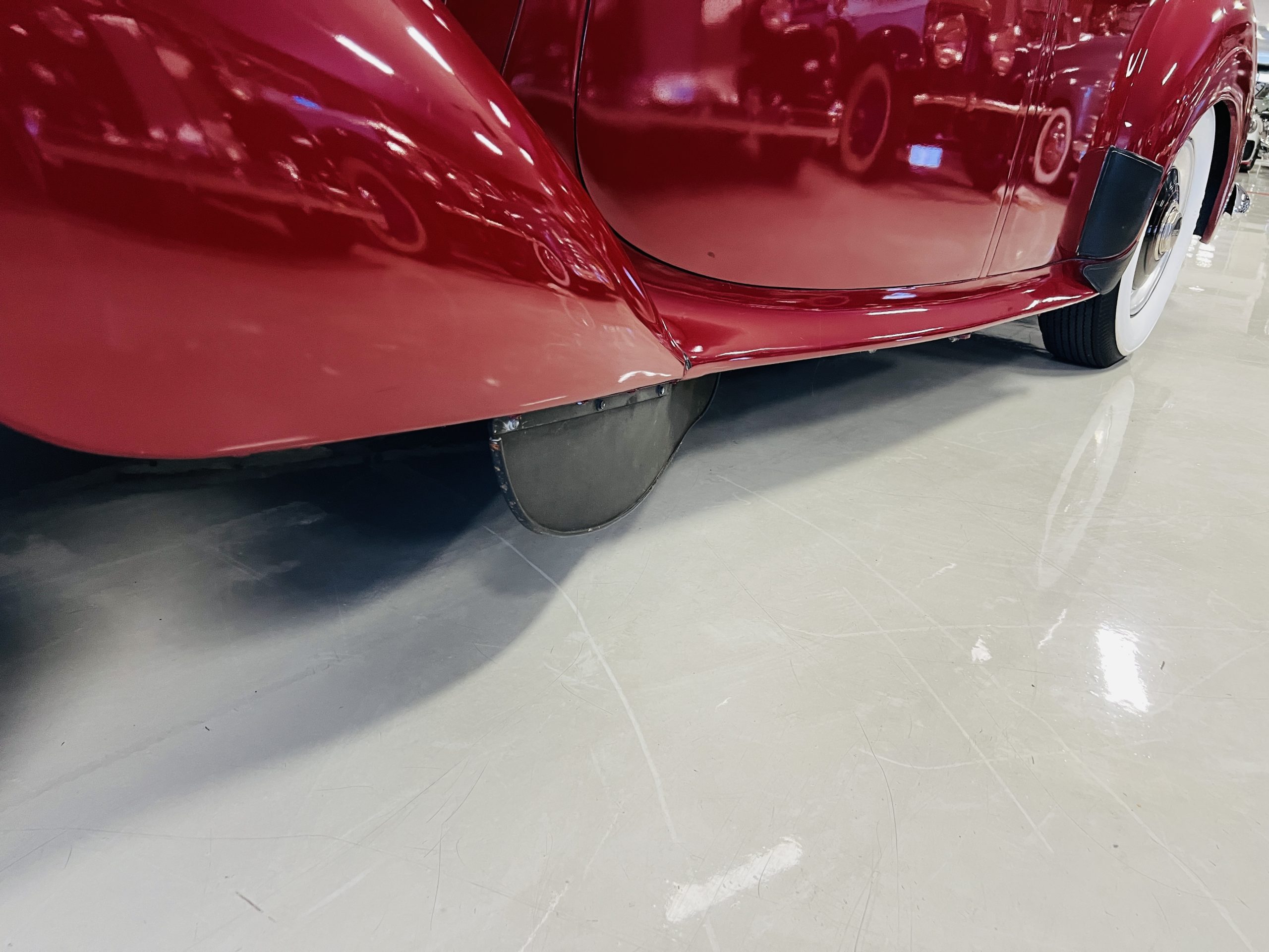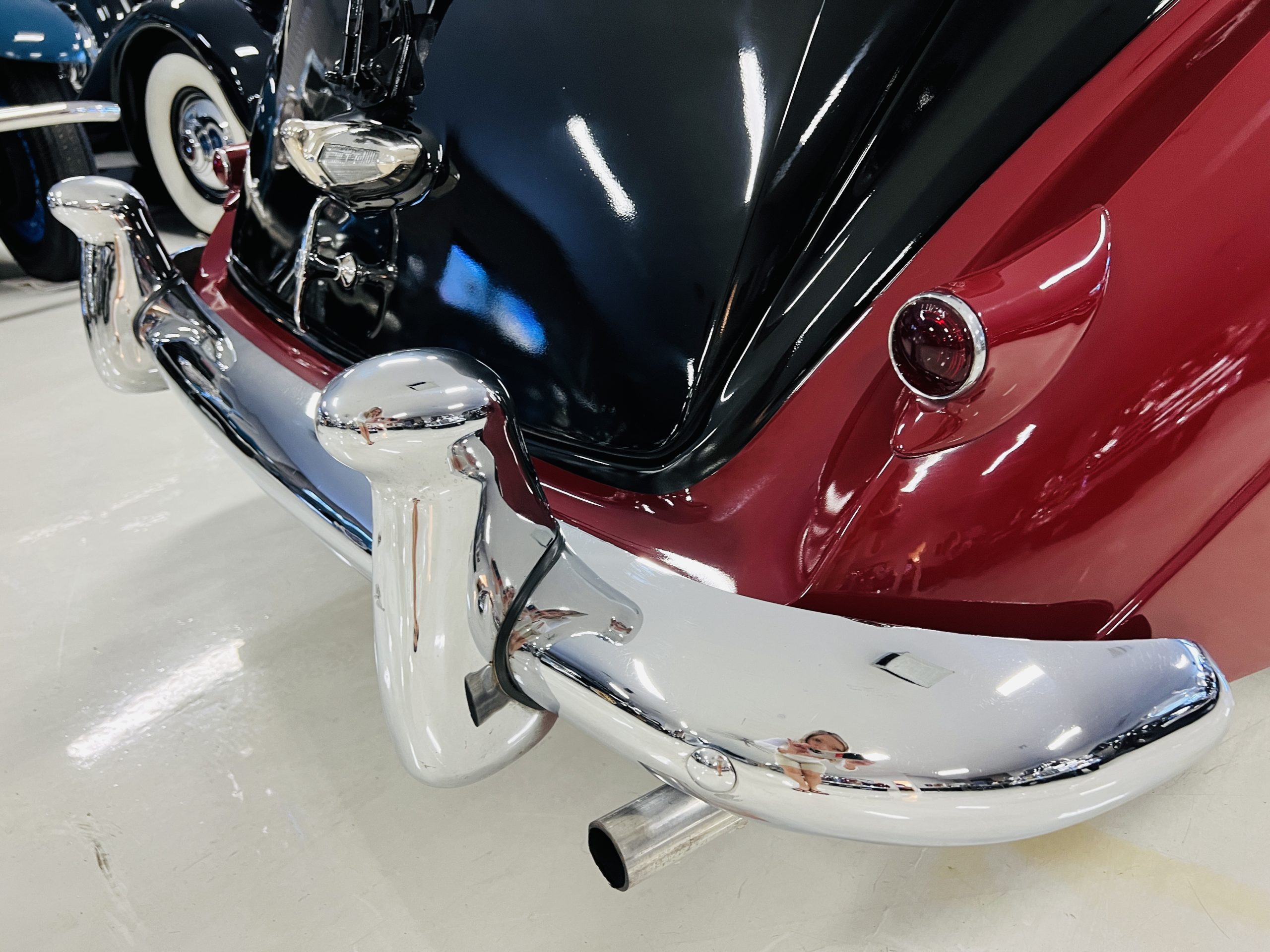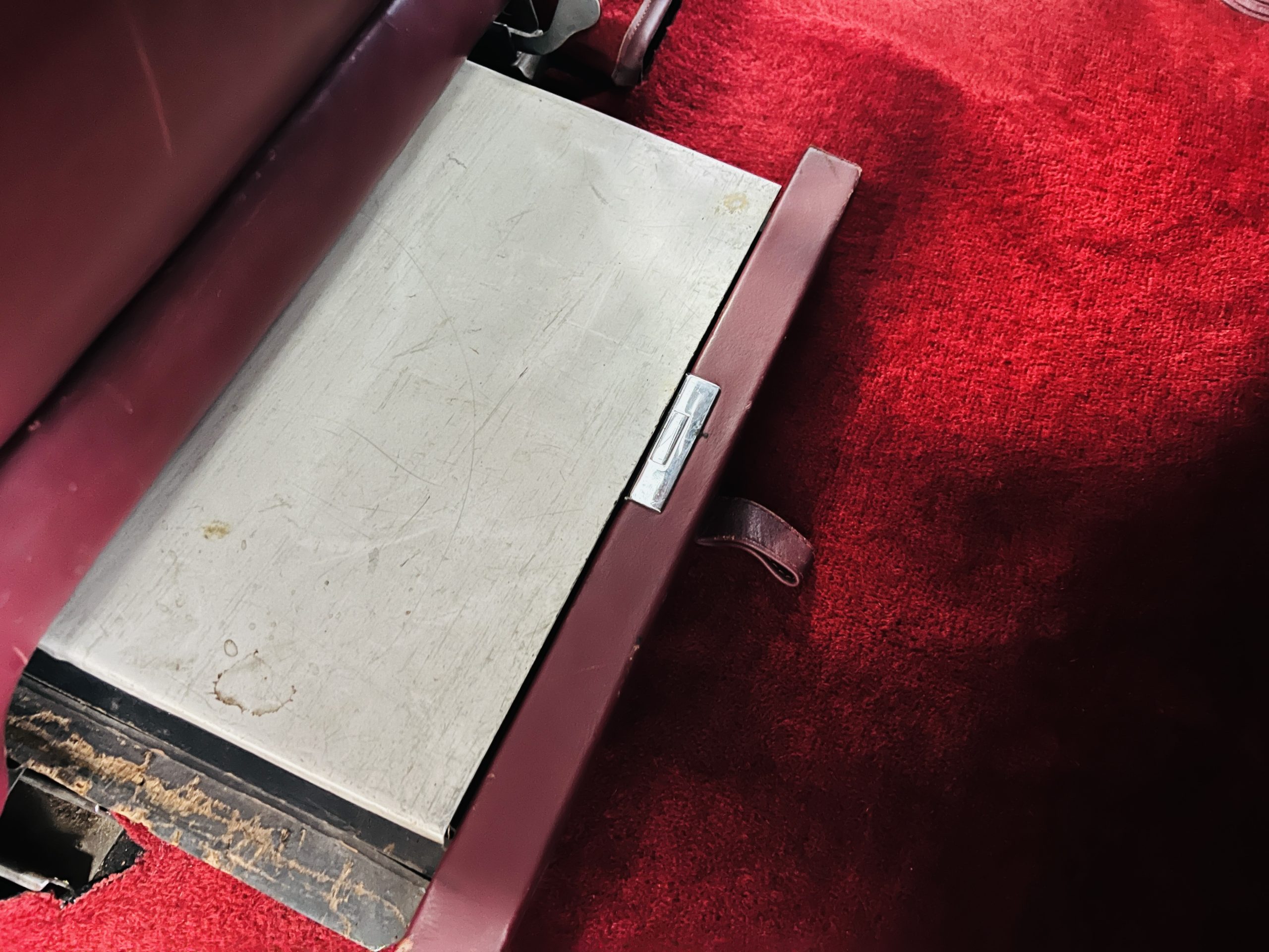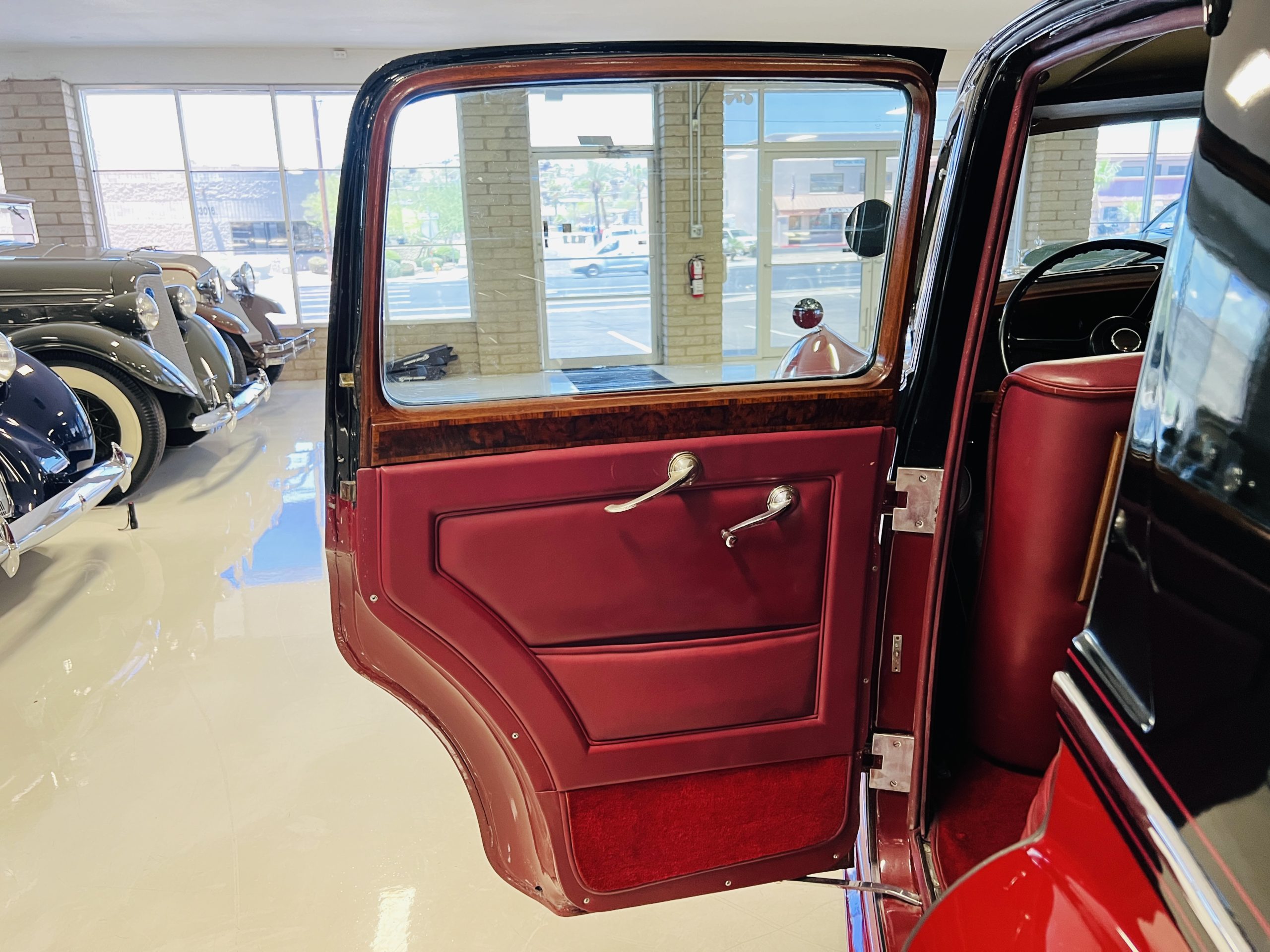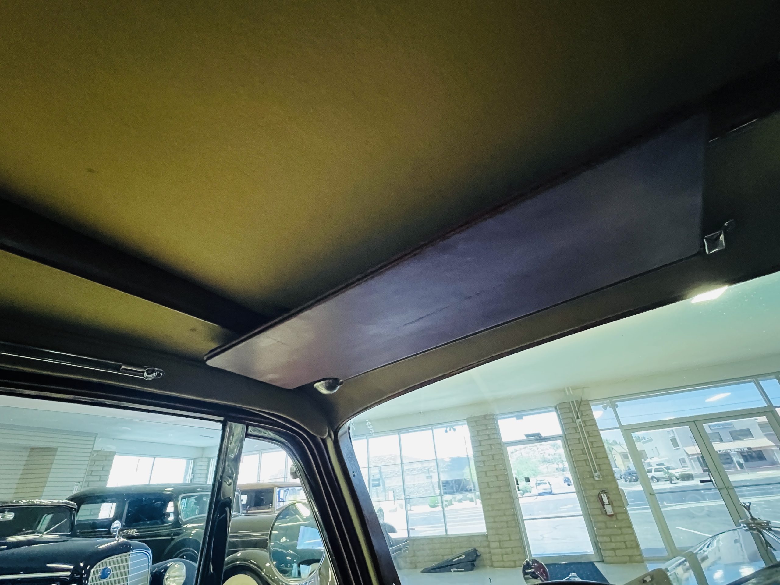 The wood trim is in overall good condition showing some patina. The newer burgundy leather interior is equally as nice and is very soft and supple. There is very minor superficial creasing in the burgundy leather. The Wilton wool carpets are in great condition, with slight shrinkage and otherwise free of blemishes. The steering wheel is good but cracked in a few places. The picnic tables are in excellent condition.