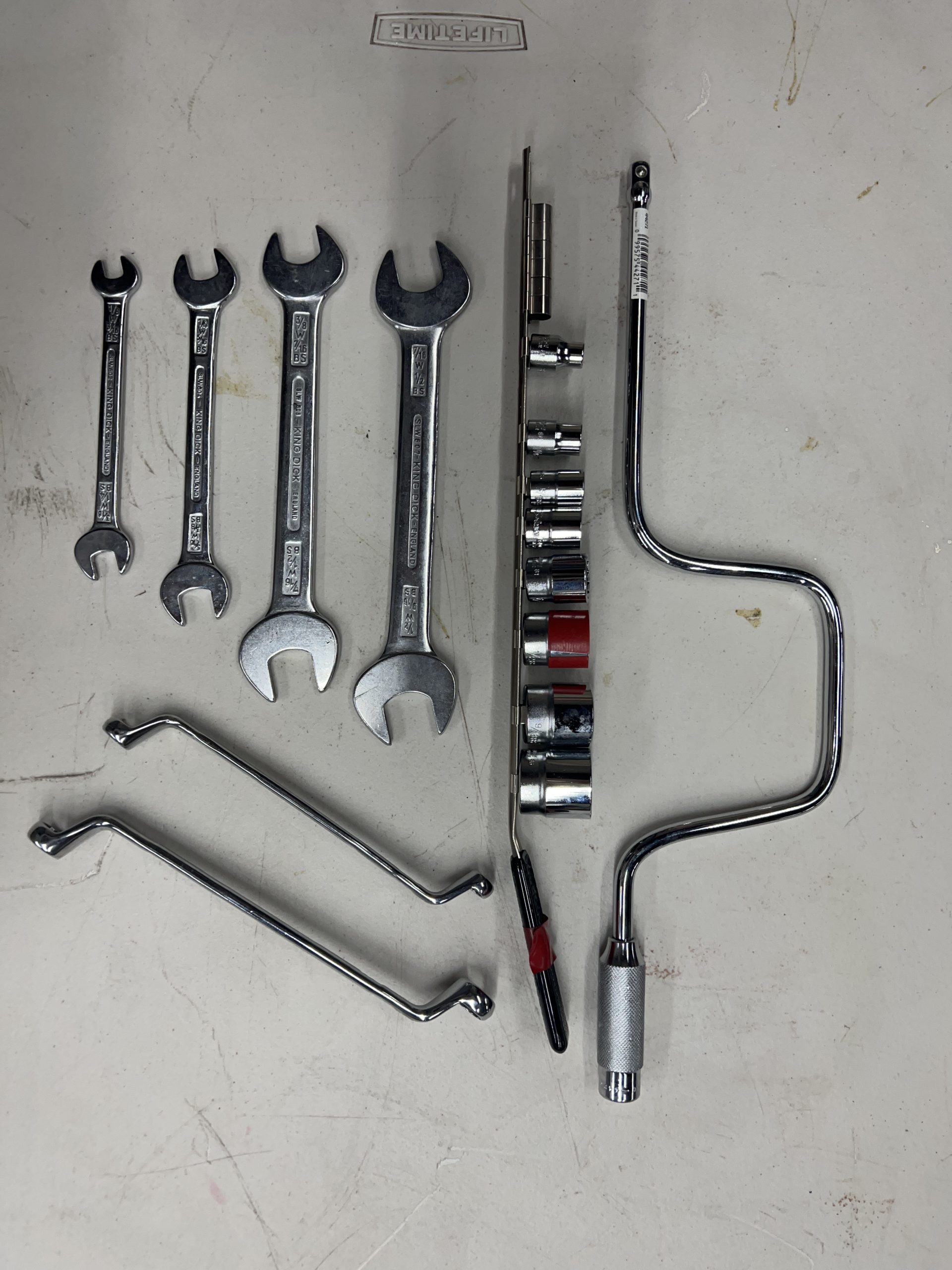 This Bentley comes with a spare tire and jack tool kit with oil gun and tire pump. The small tool tray under the passenger seat is almost complete. She also has her schedule of spare parts, service handbook, owner’s manual, and an extra set of keys.