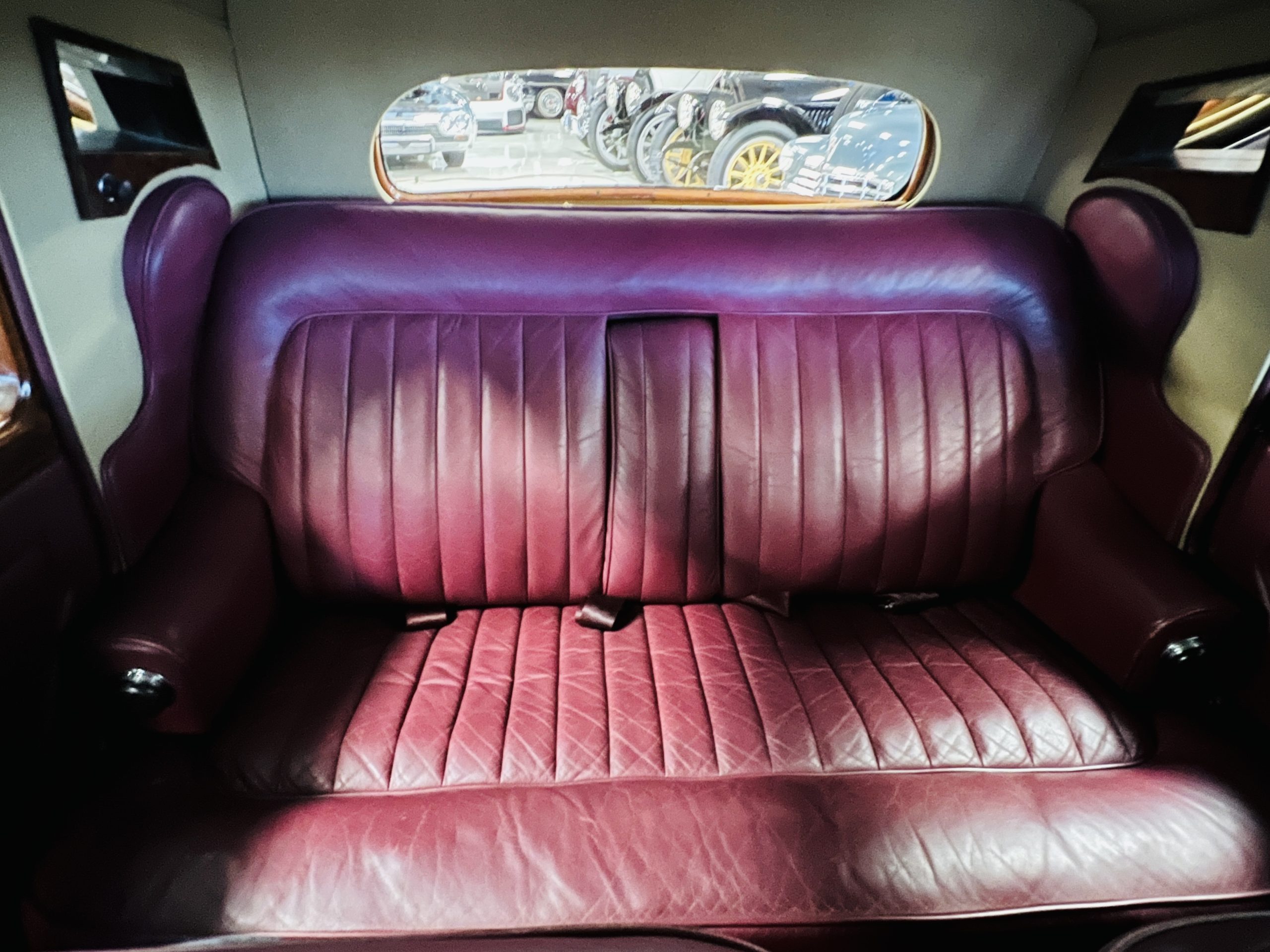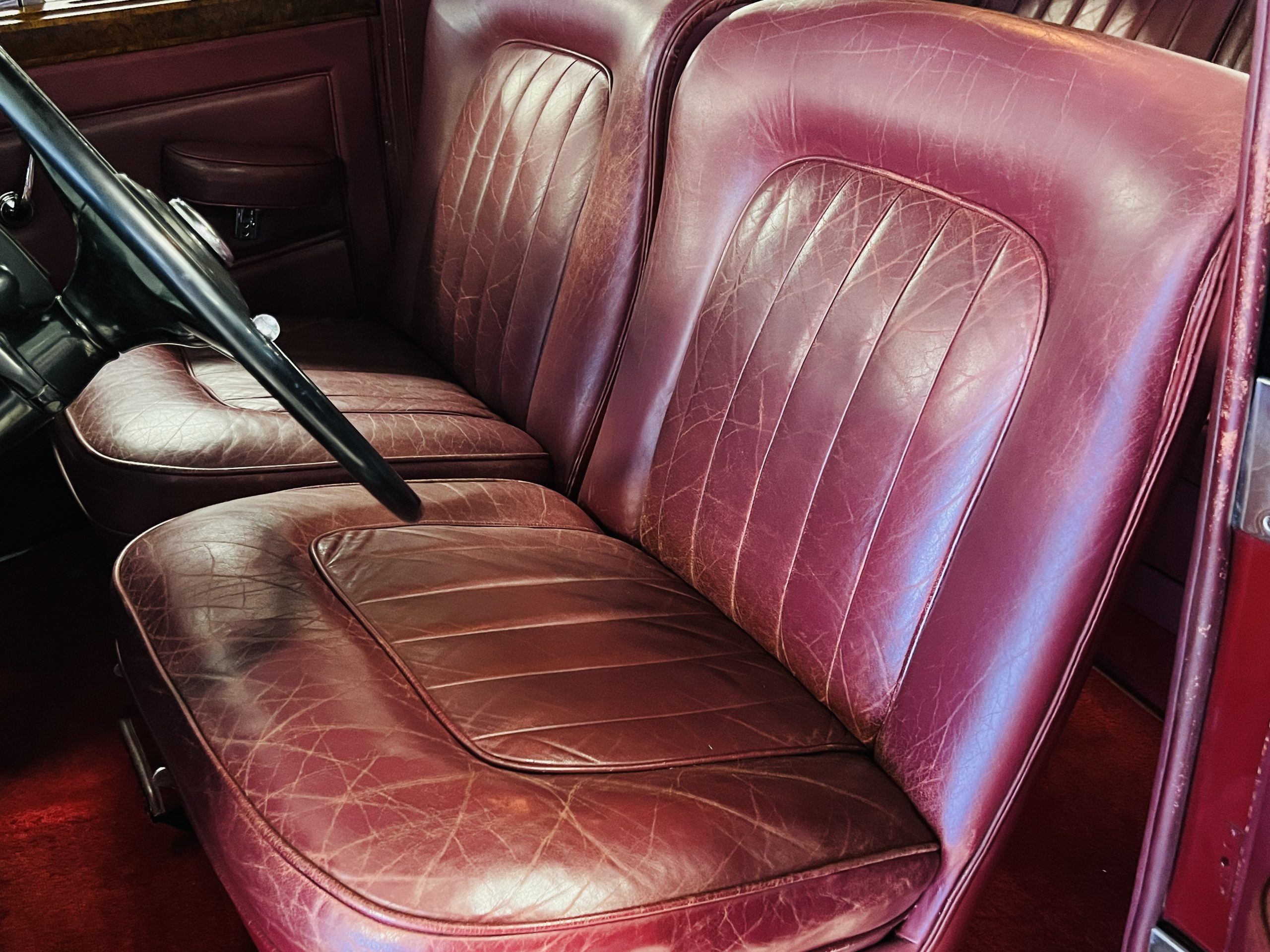 The striking Claret and Black livery has wonderful depth and shine and is complemented by the white wall tires and its brilliant chrome and stainless trim. The paint has a beautiful, rich finish, but is of driver quality with many touched up chips from normal use. The chrome on the bumpers is in particularly good condition, although there is some pitting in the center taillight chrome. The Bentley comes with a driver’s side rear-view mirror, a correct period spotlight and auxiliary fog lights. We love the very large sunroofs featured on these later R-Types.