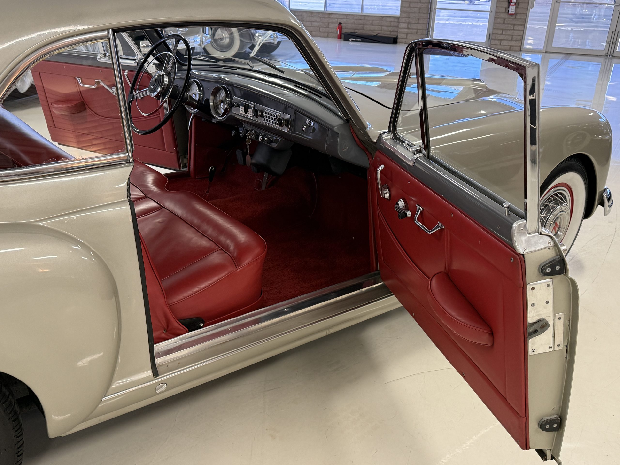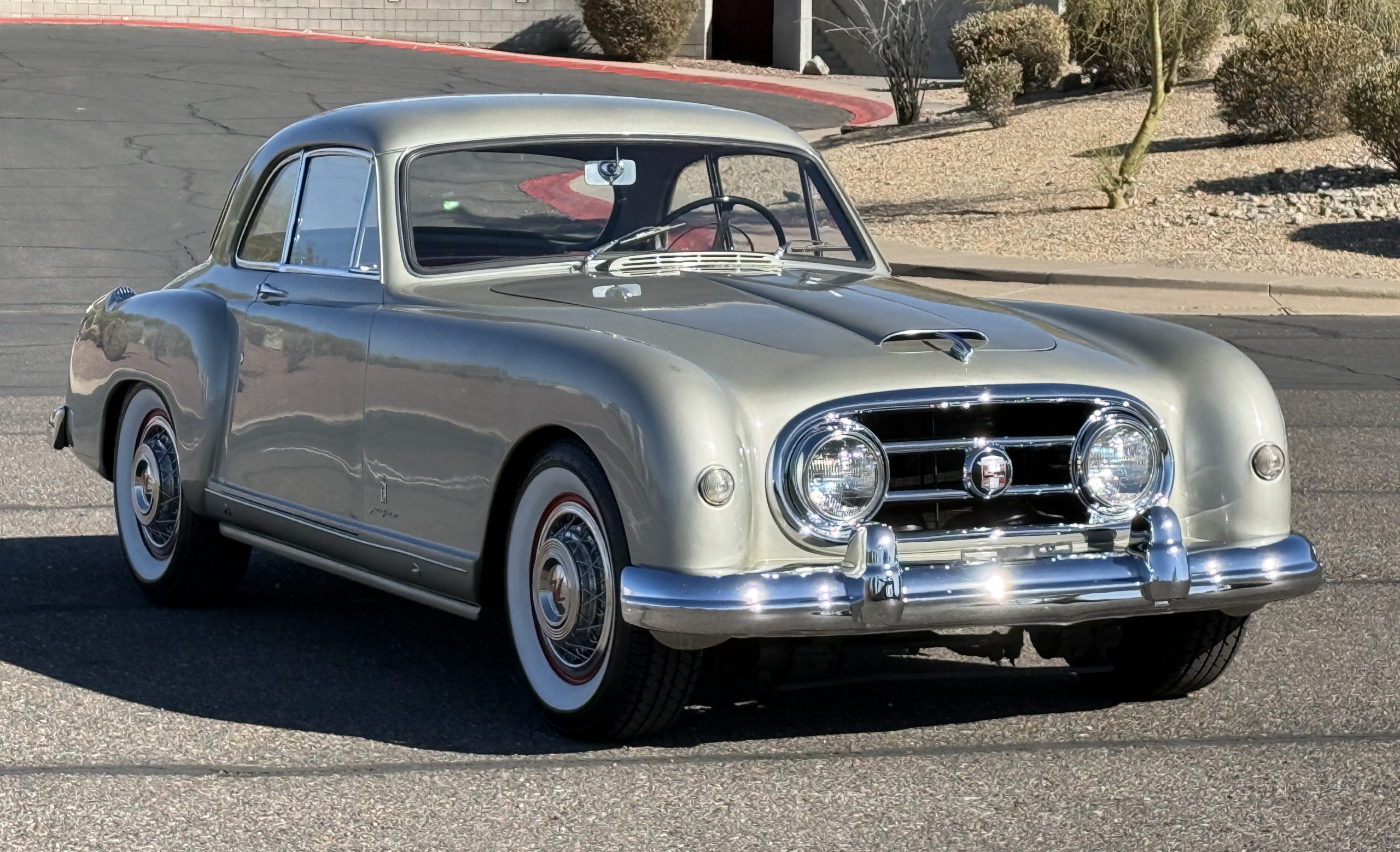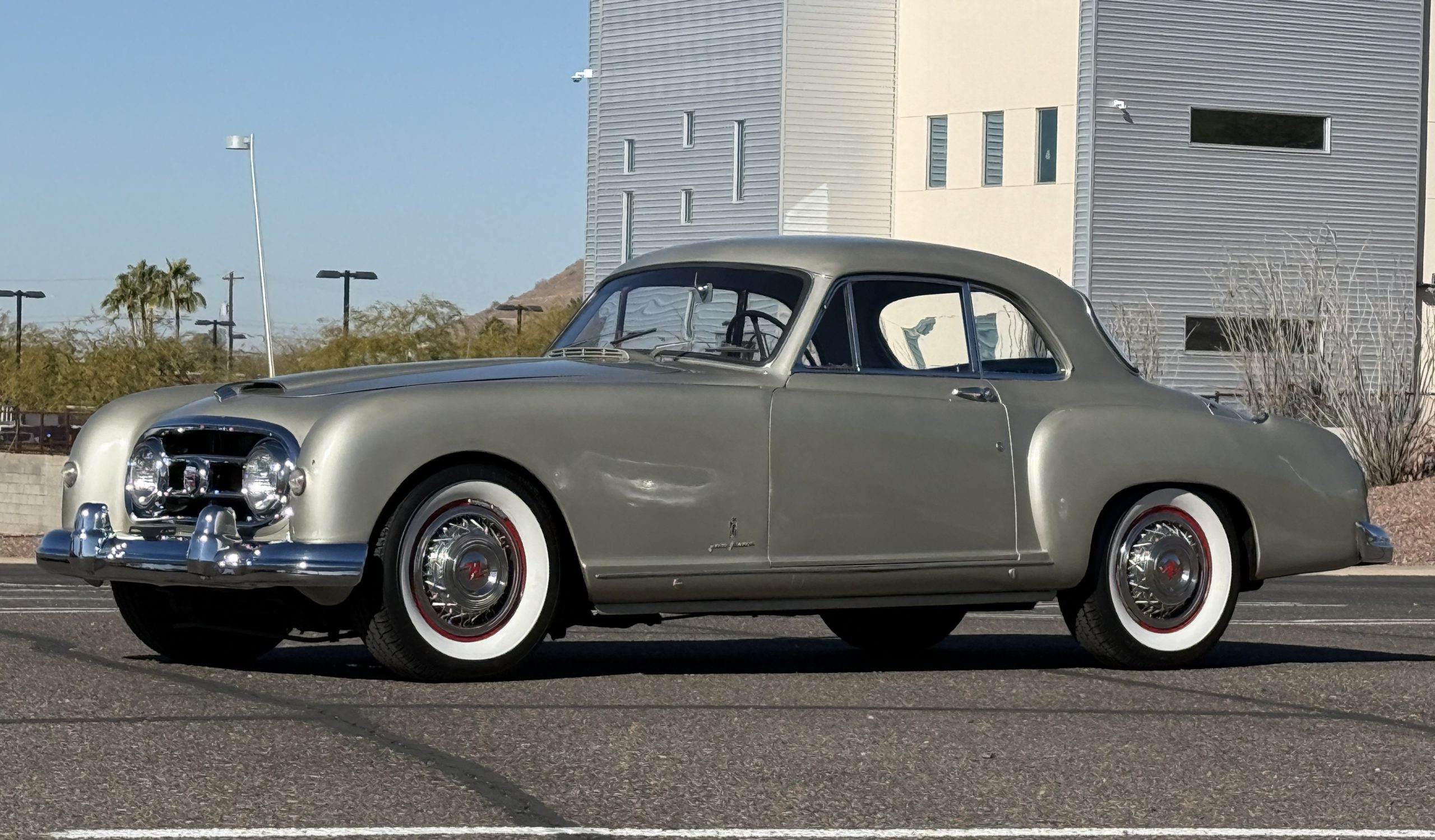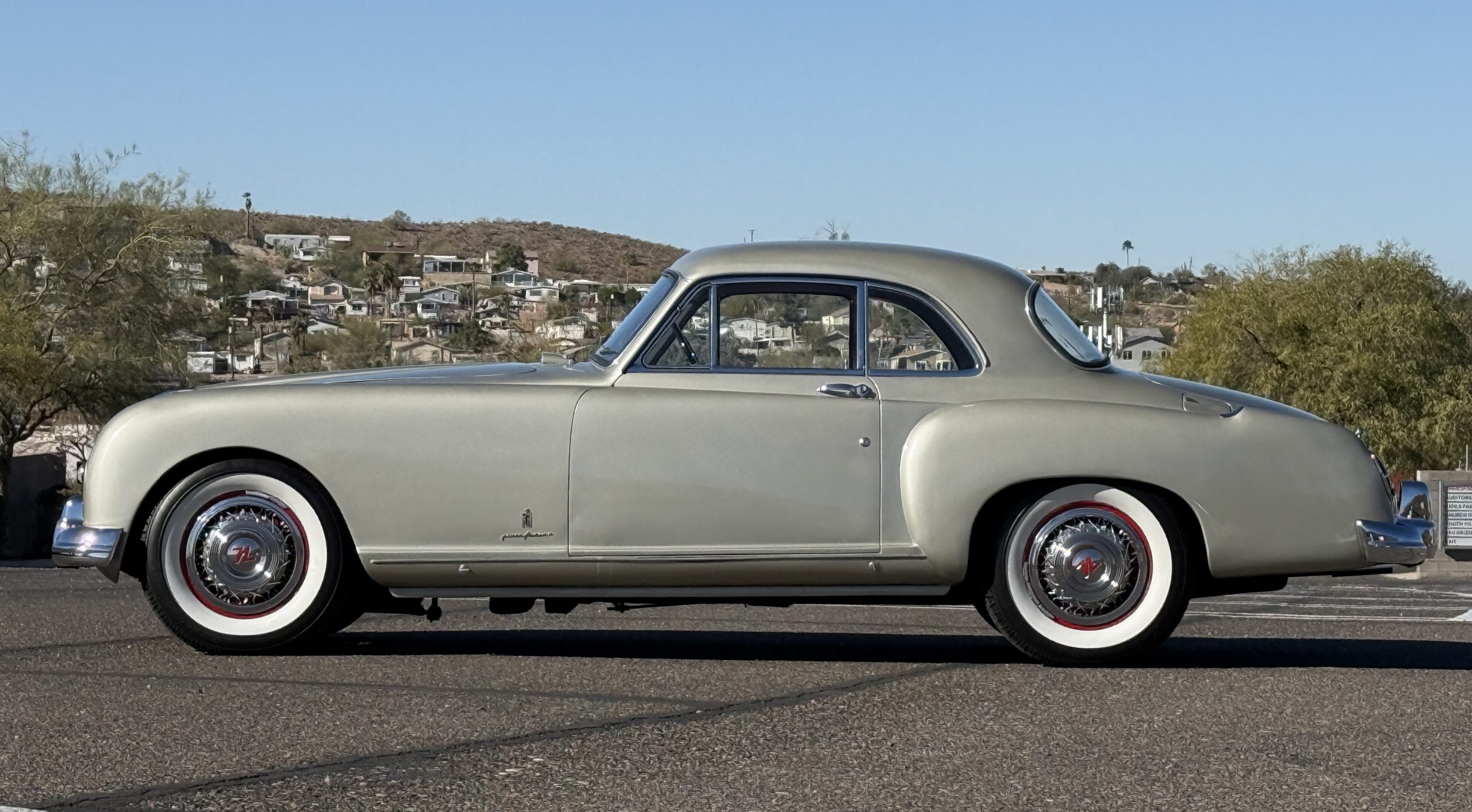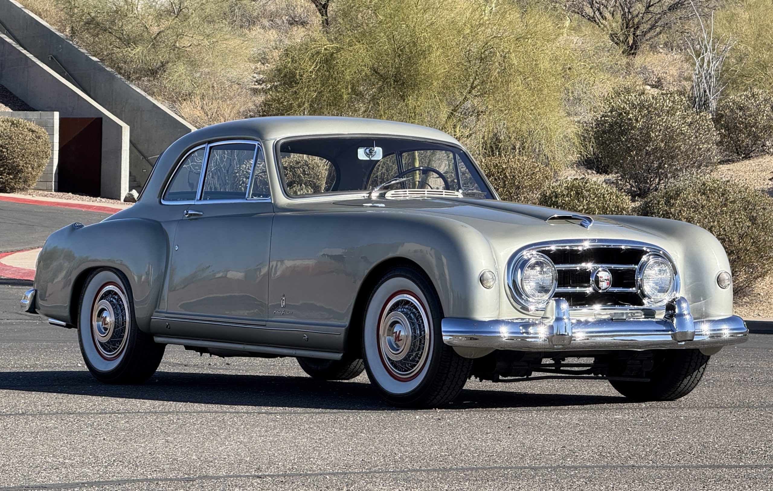 This 1954 Nash-Healey is one of approximately 150 Le Mans coupes produced over two model years, and one of only 62 of the desirable oval window examples. The car is finished in platinum over red leather upholstery, and power comes from a 252ci inline-six paired with a three-speed manual gearbox with overdrive. Acquired by the selling dealer in 2024, the vehicle was serviced in preparation for the sale with a valve adjustment, overhauls of the brakes and the carburetors, and replacement of fuel hoses, engine mounts, tires, and an engine accessory belt.
