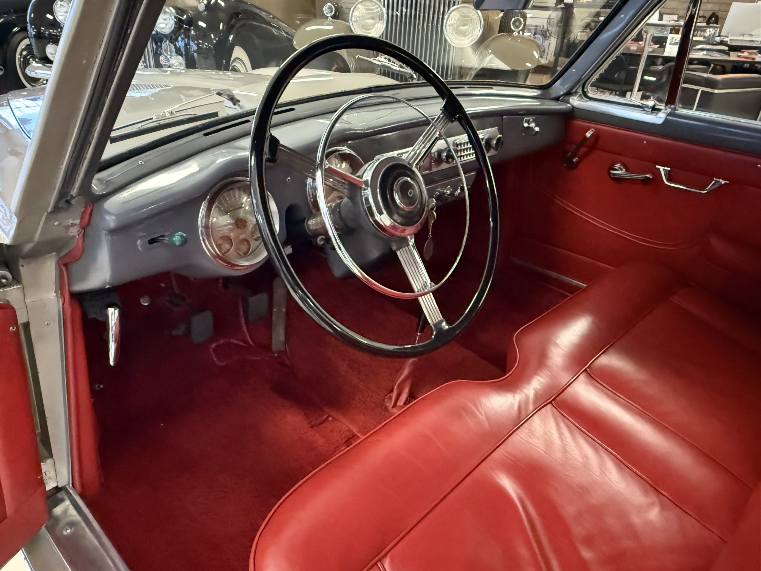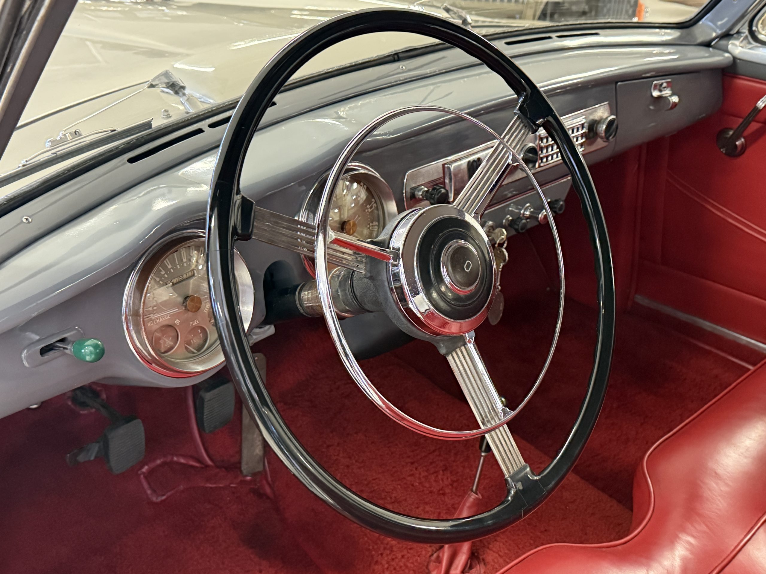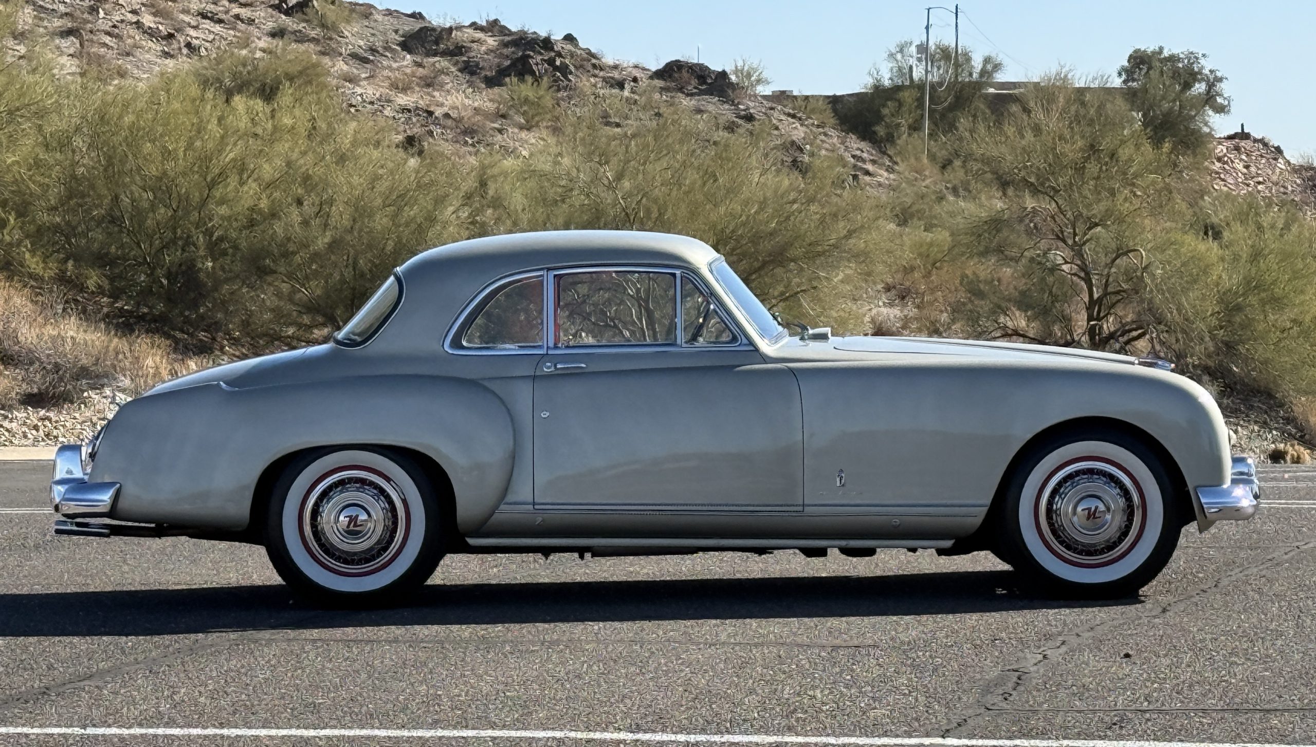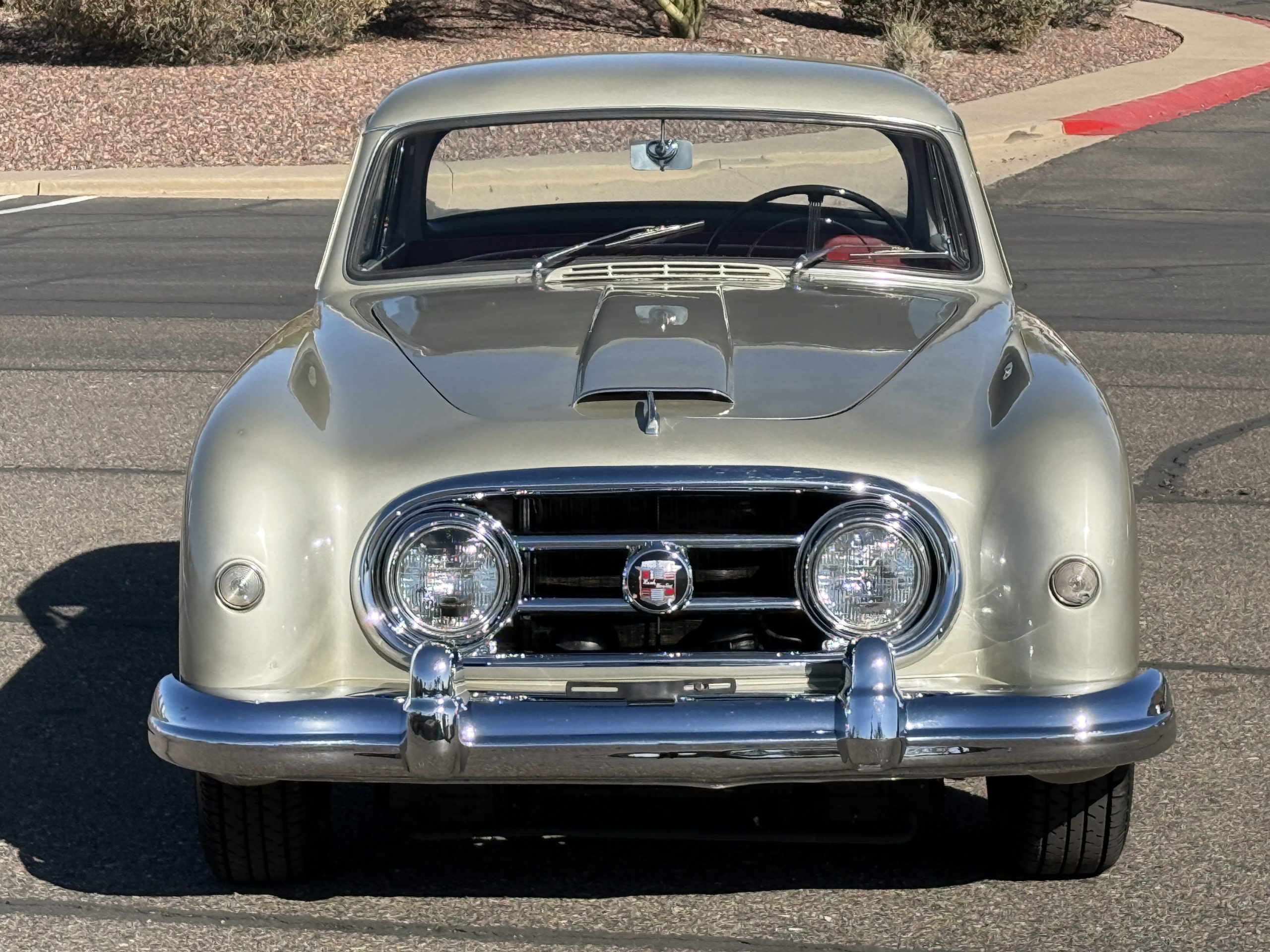 This 1954 Nash-Healey is one of approximately 150 Le Mans coupes produced over two model years, and one of only 62 of the desirable oval window examples. The car is finished in platinum over red leather upholstery, and power comes from a 252ci inline-six paired with a three-speed manual gearbox with overdrive. Acquired by the selling dealer in 2024, the vehicle was serviced in preparation for the sale with a valve adjustment, overhauls of the brakes and the carburetors, and replacement of fuel hoses, engine mounts, tires, and an engine accessory belt.