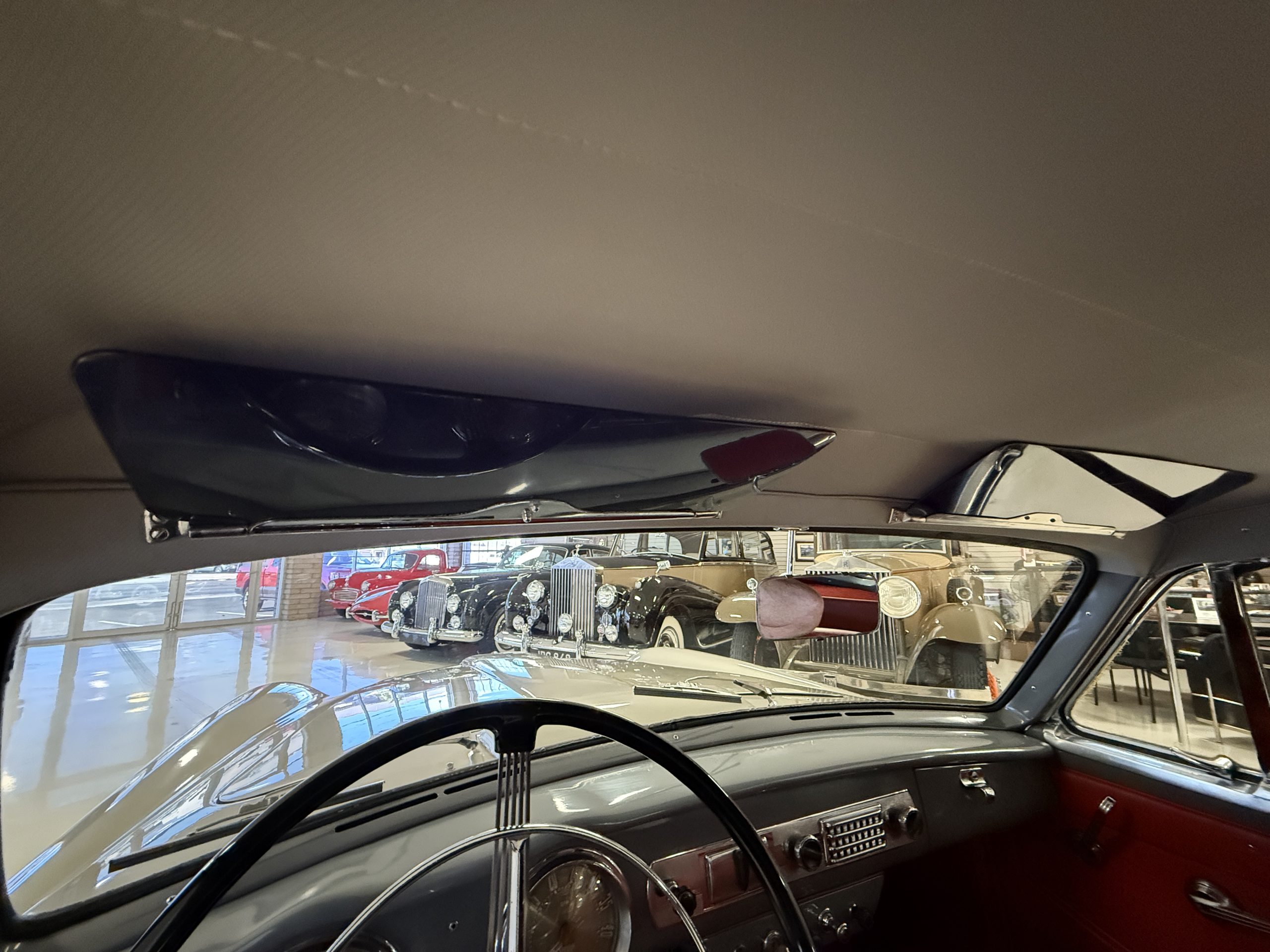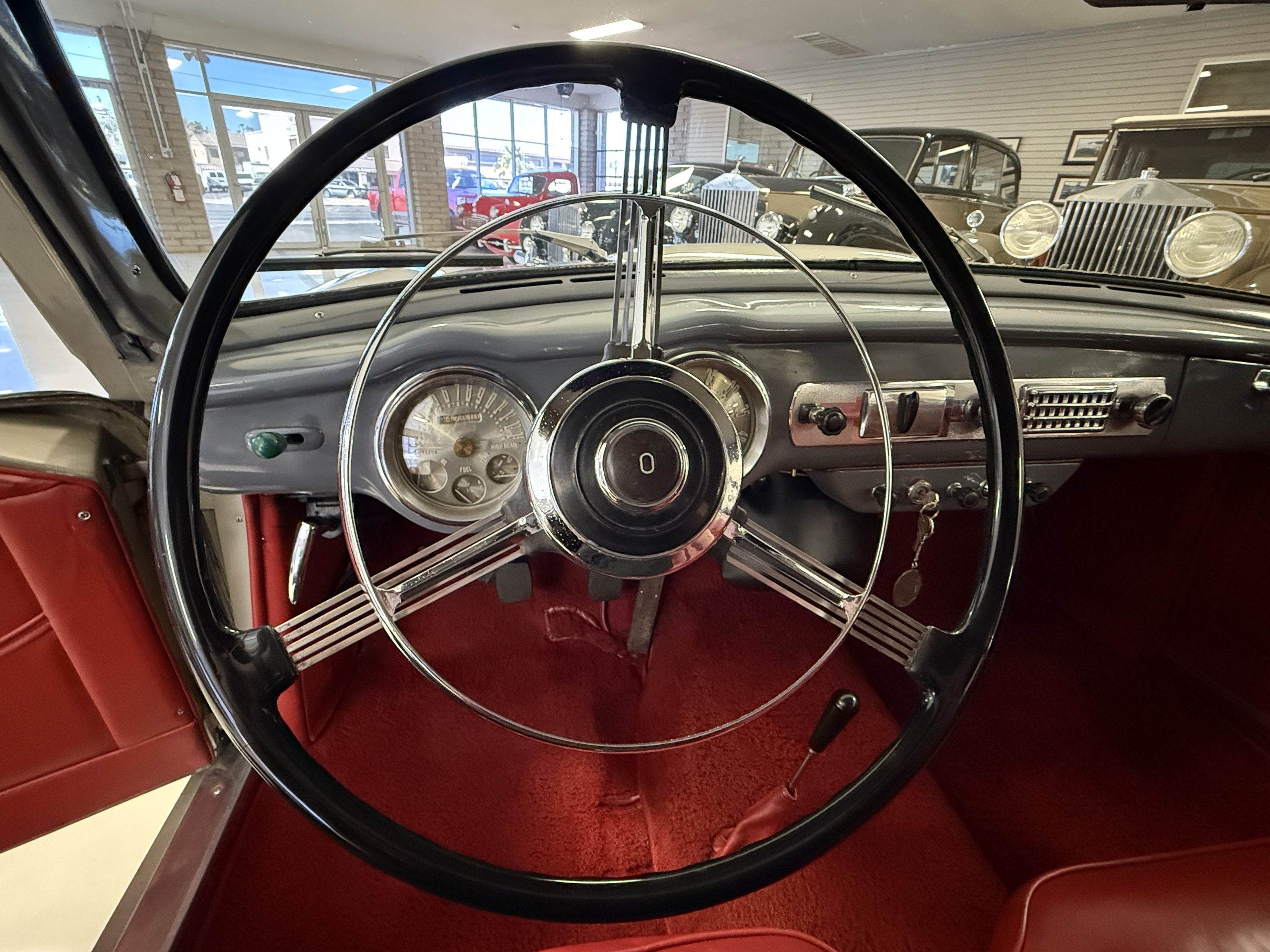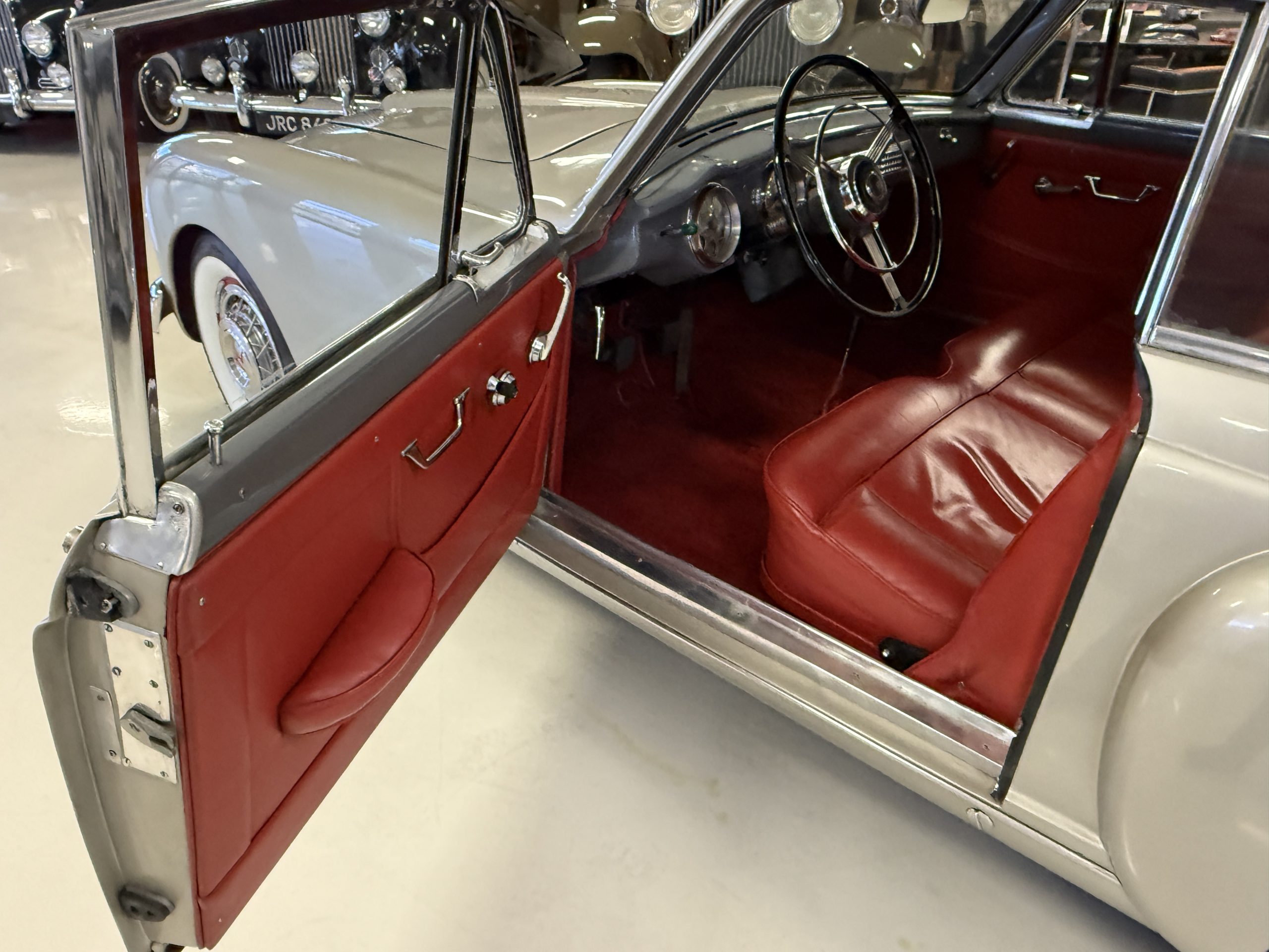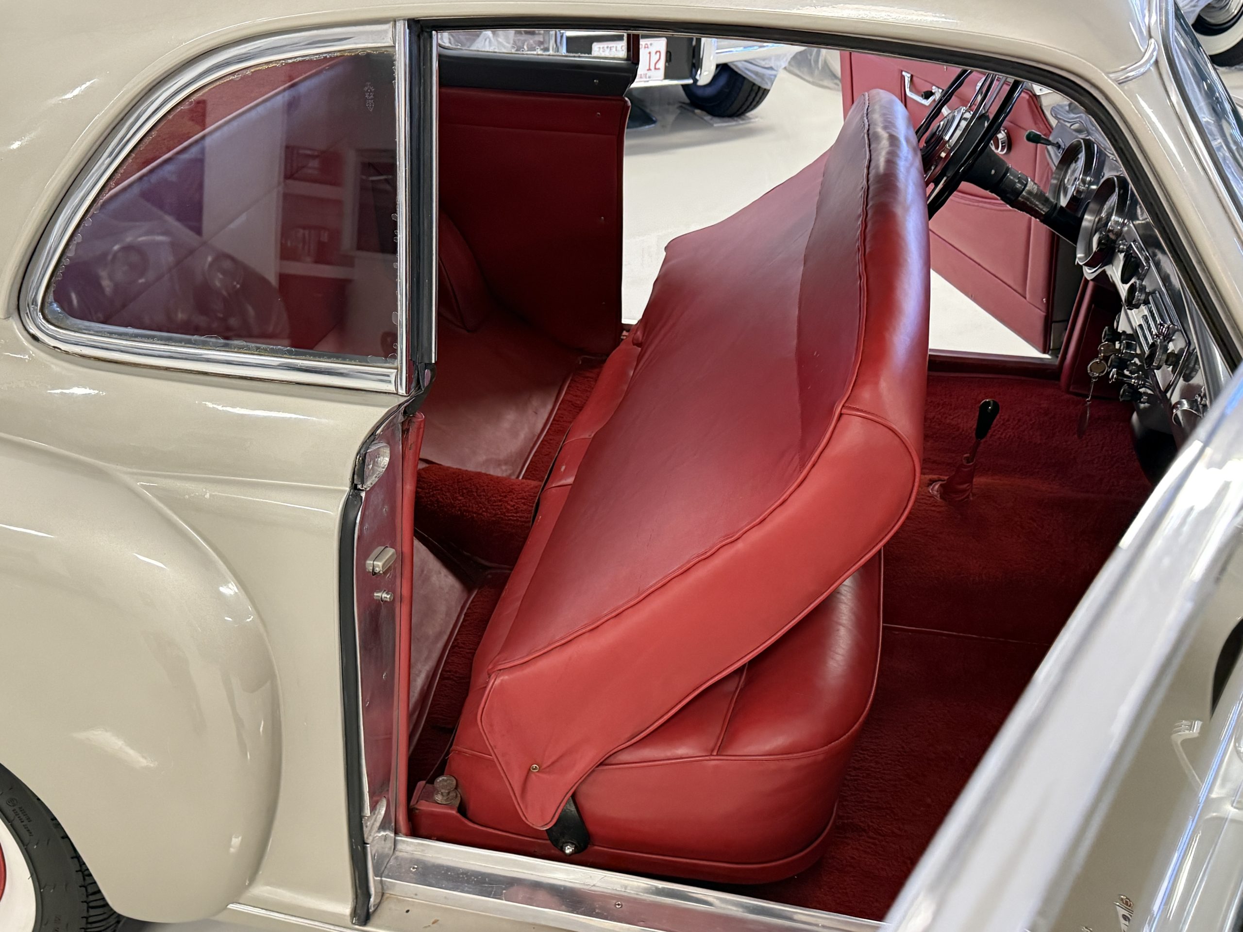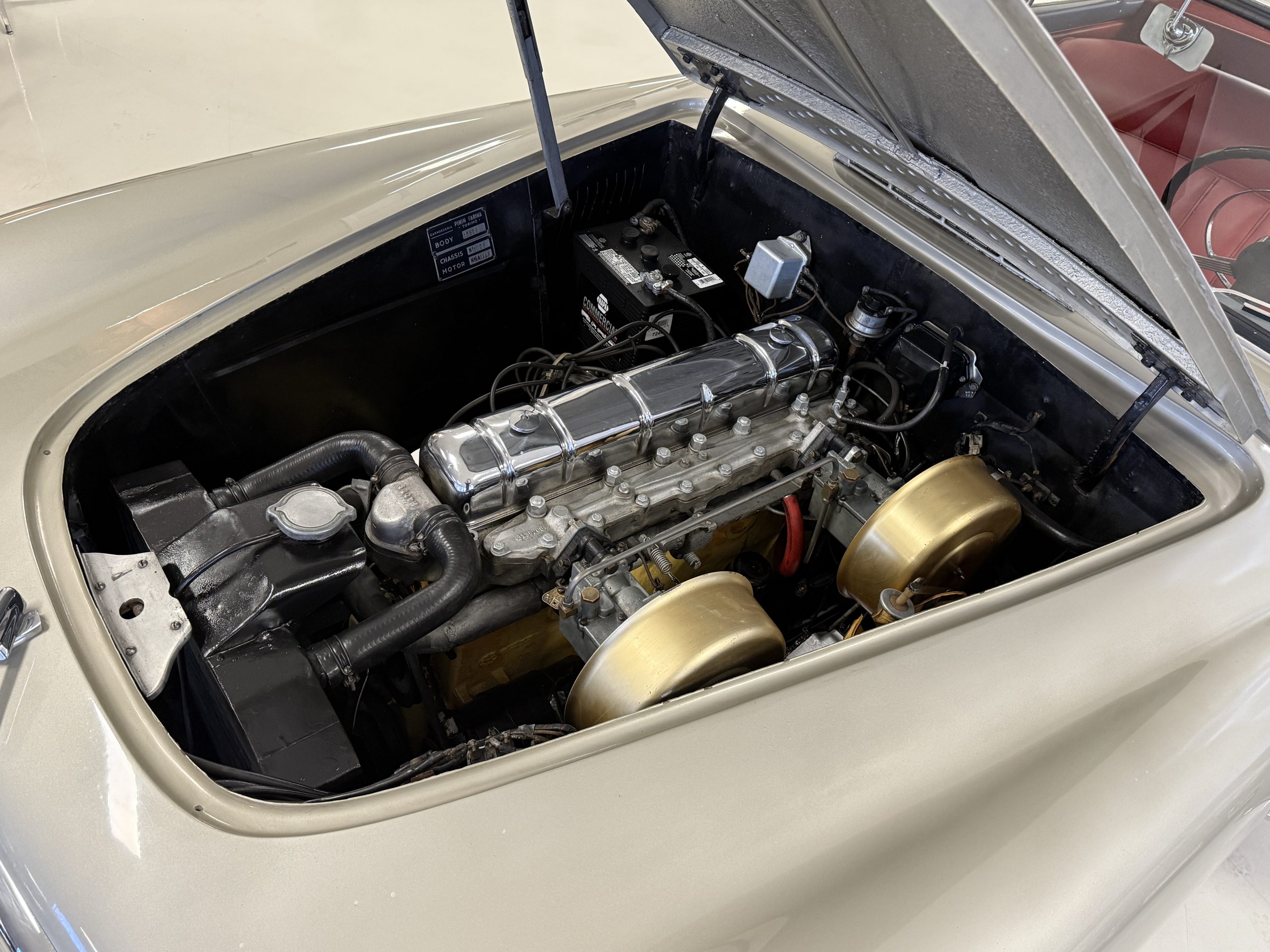 This 1954 Nash-Healey is one of approximately 150 Le Mans coupes produced over two model years, and one of only 62 of the desirable oval window examples. The car is finished in platinum over red leather upholstery, and power comes from a 252ci inline-six paired with a three-speed manual gearbox with overdrive. Acquired by the selling dealer in 2024, the vehicle was serviced in preparation for the sale with a valve adjustment, overhauls of the brakes and the carburetors, and replacement of fuel hoses, engine mounts, tires, and an engine accessory belt.
