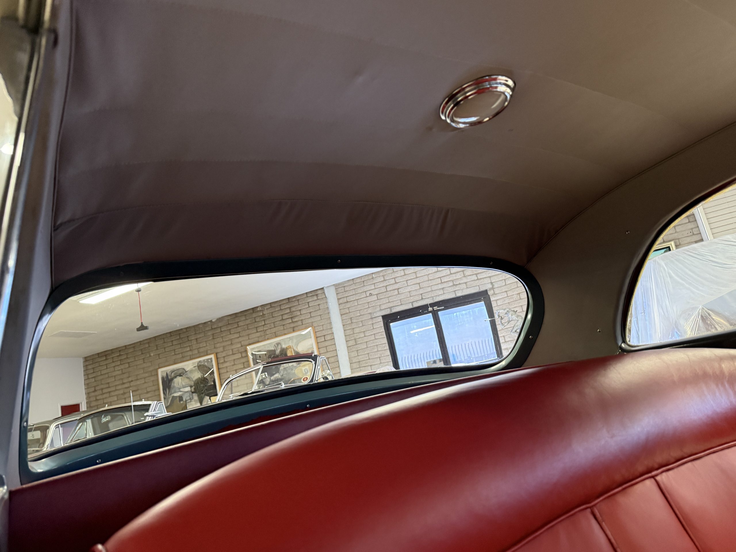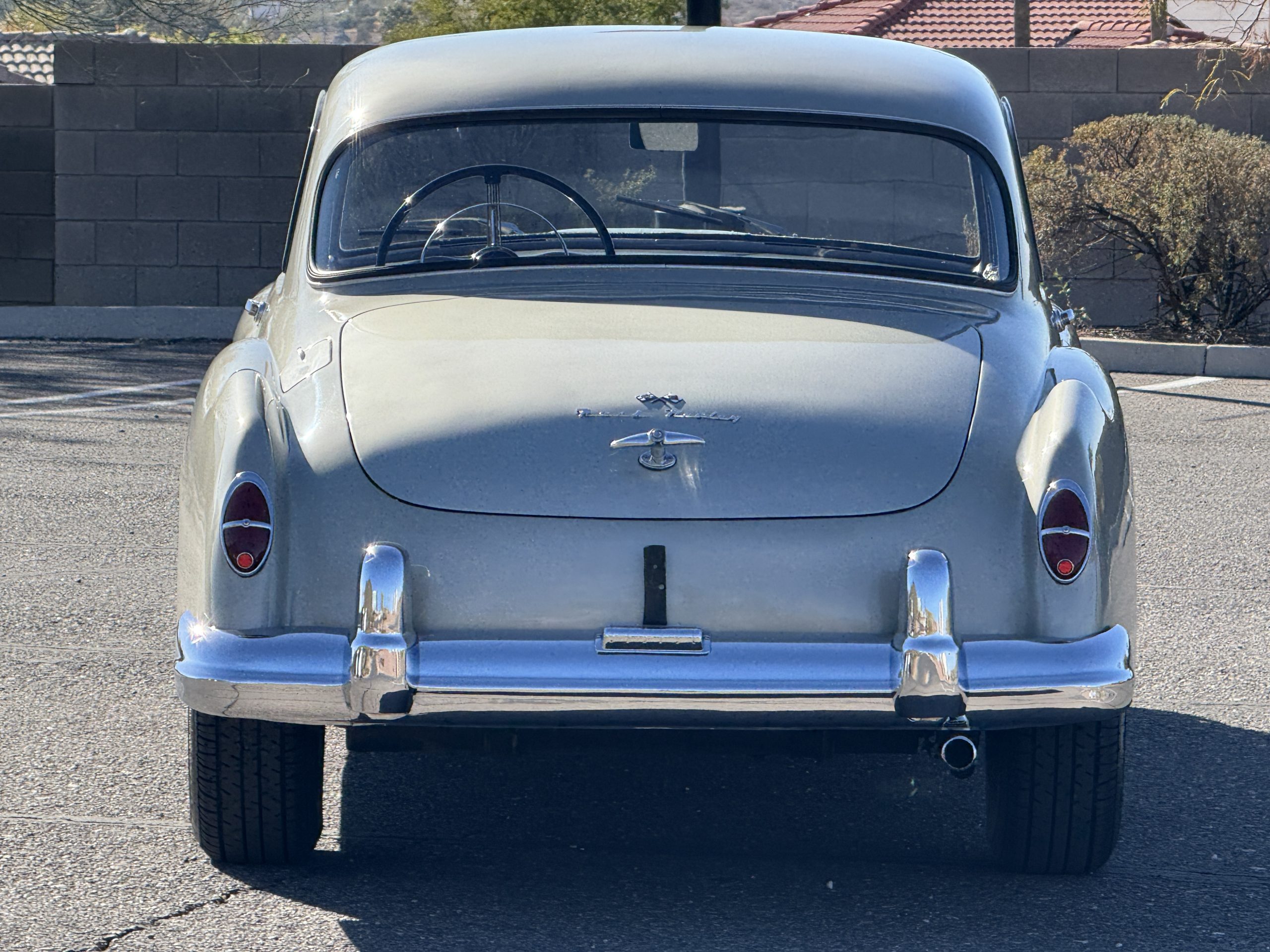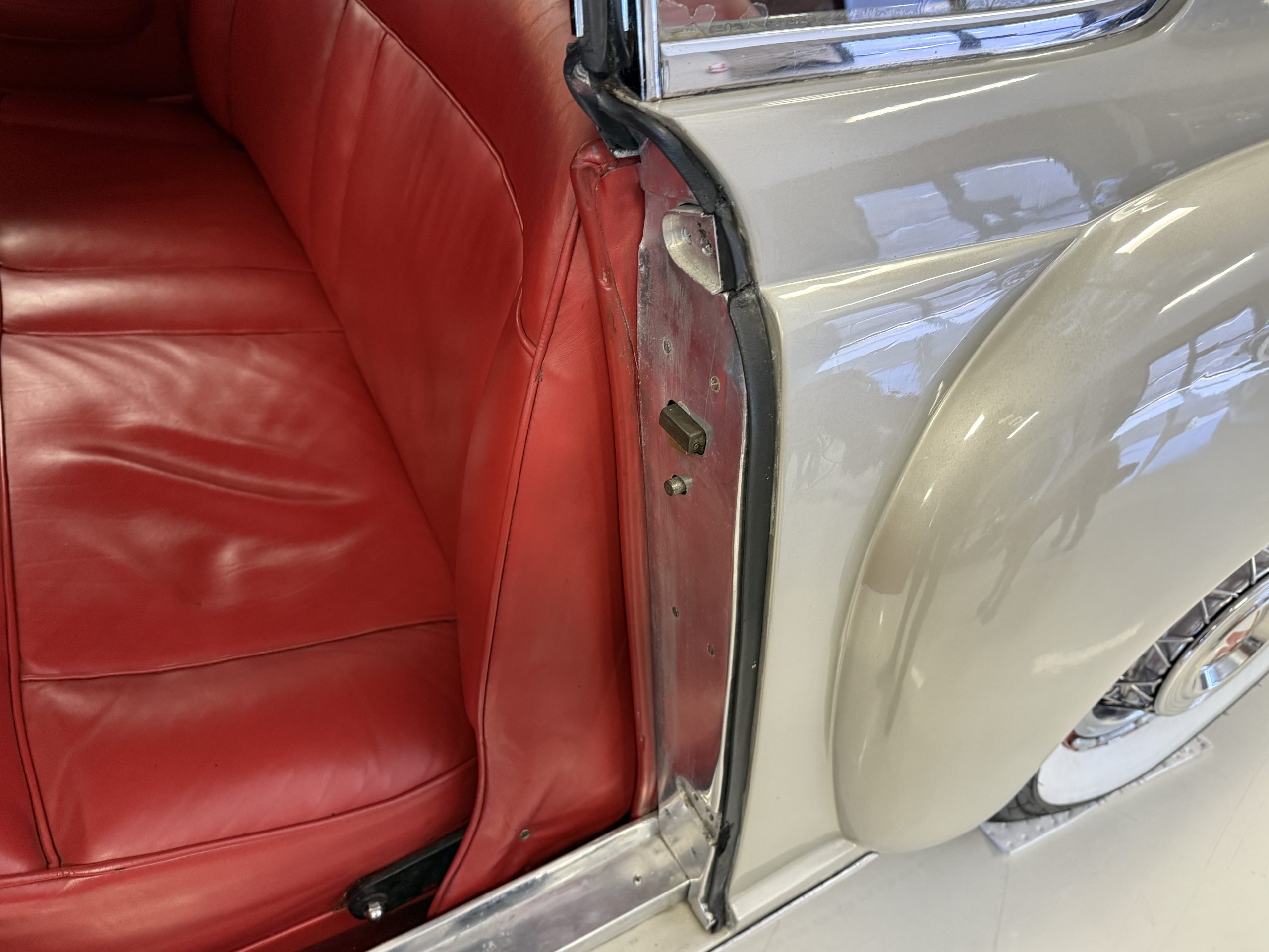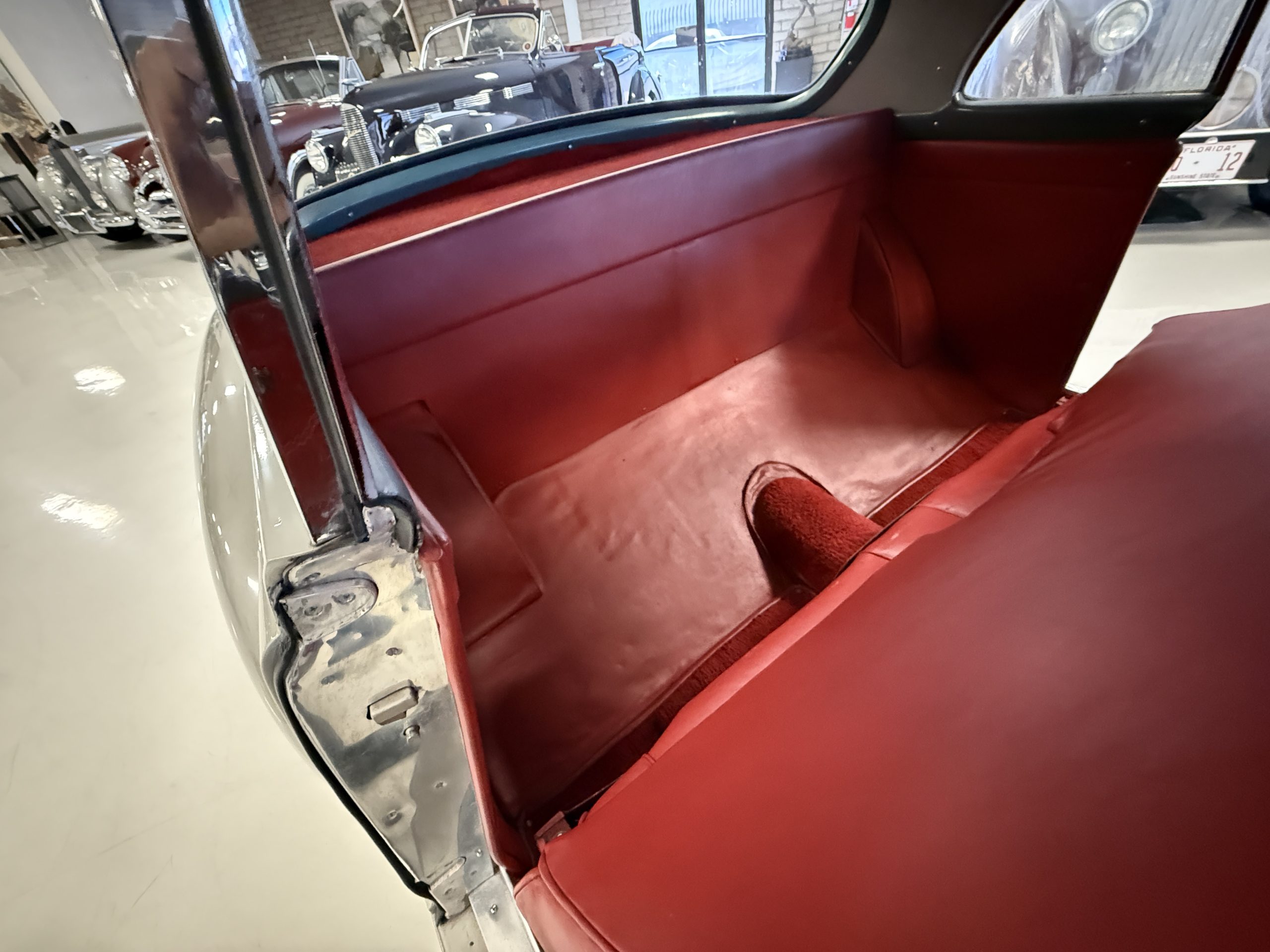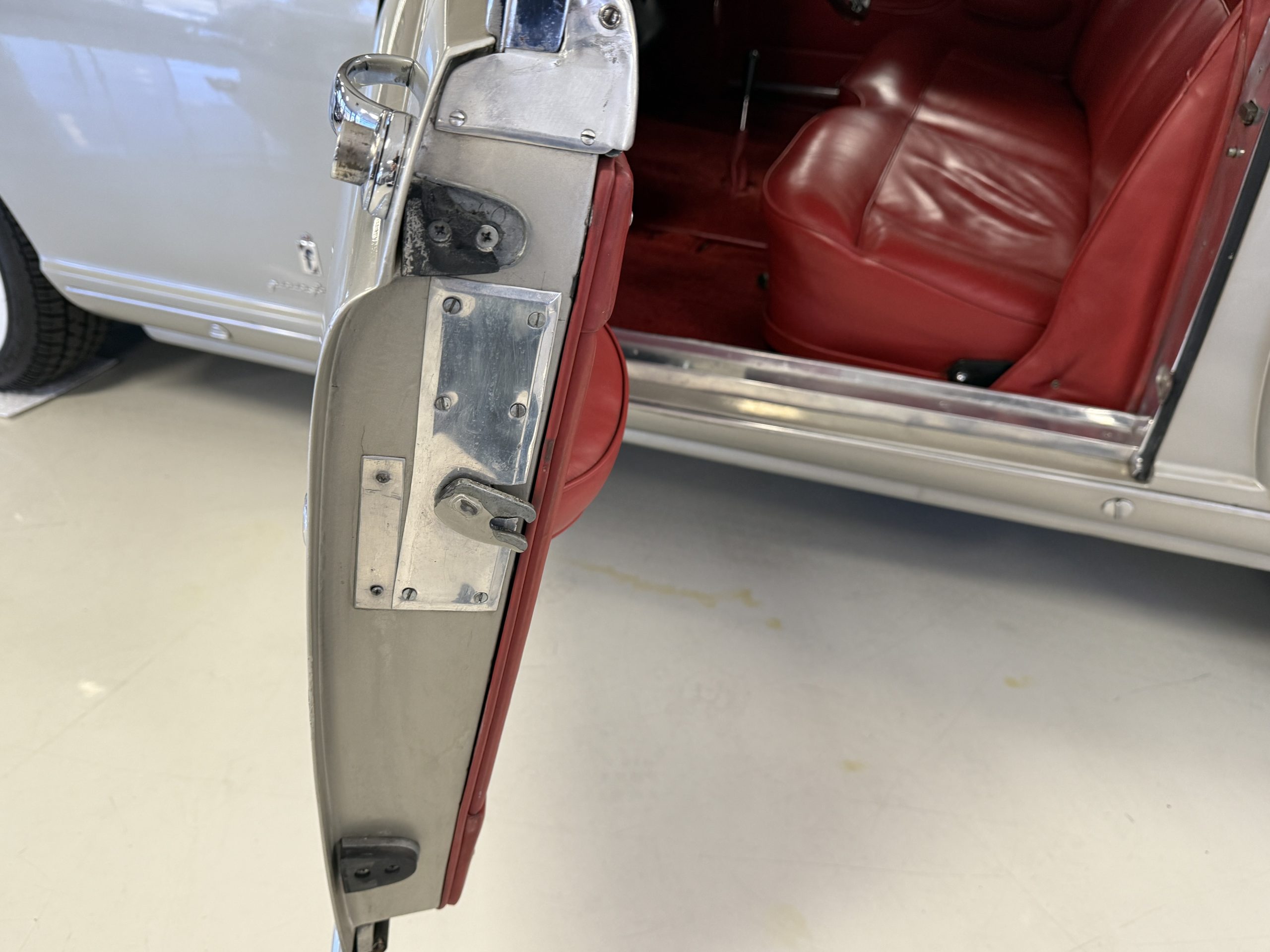 This 1954 Nash-Healey is one of approximately 150 Le Mans coupes produced over two model years, and one of only 62 of the desirable oval window examples. The car is finished in platinum over red leather upholstery, and power comes from a 252ci inline-six paired with a three-speed manual gearbox with overdrive. Acquired by the selling dealer in 2024, the vehicle was serviced in preparation for the sale with a valve adjustment, overhauls of the brakes and the carburetors, and replacement of fuel hoses, engine mounts, tires, and an engine accessory belt.