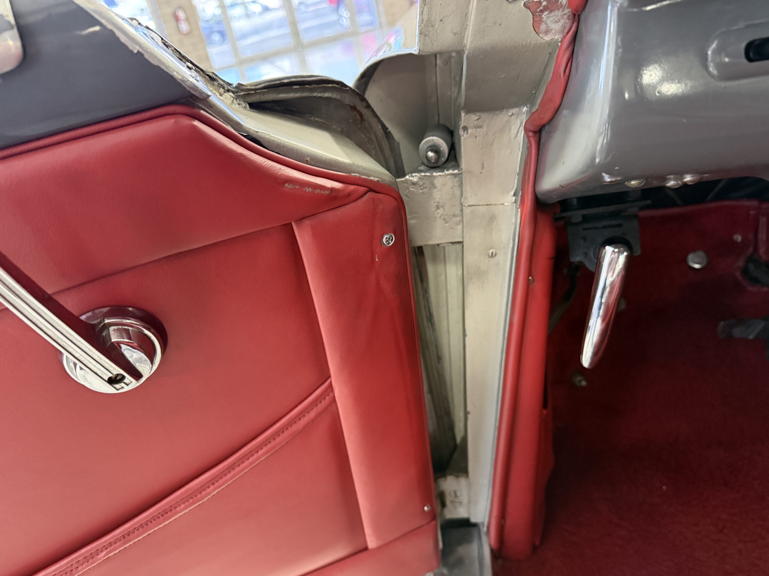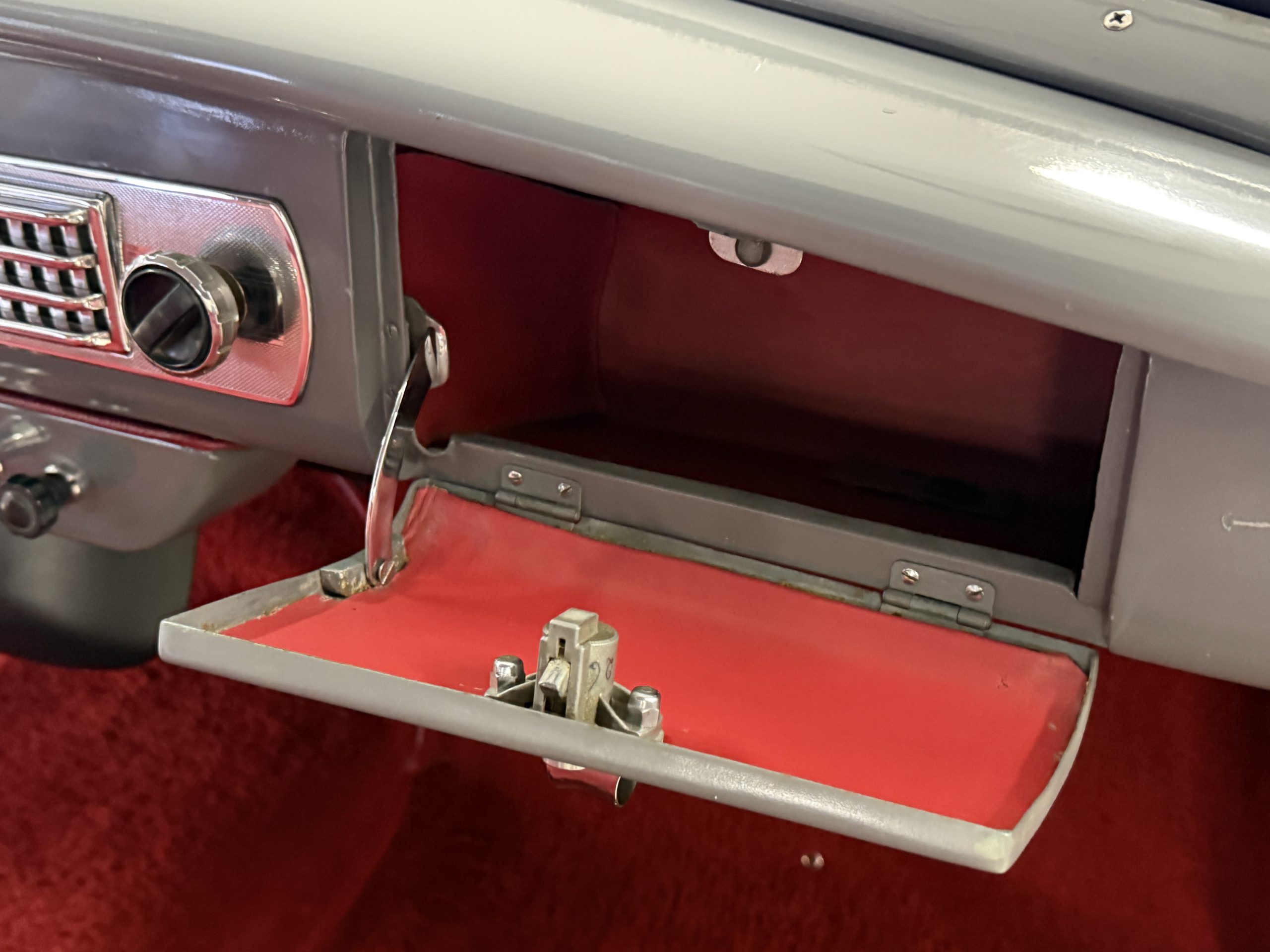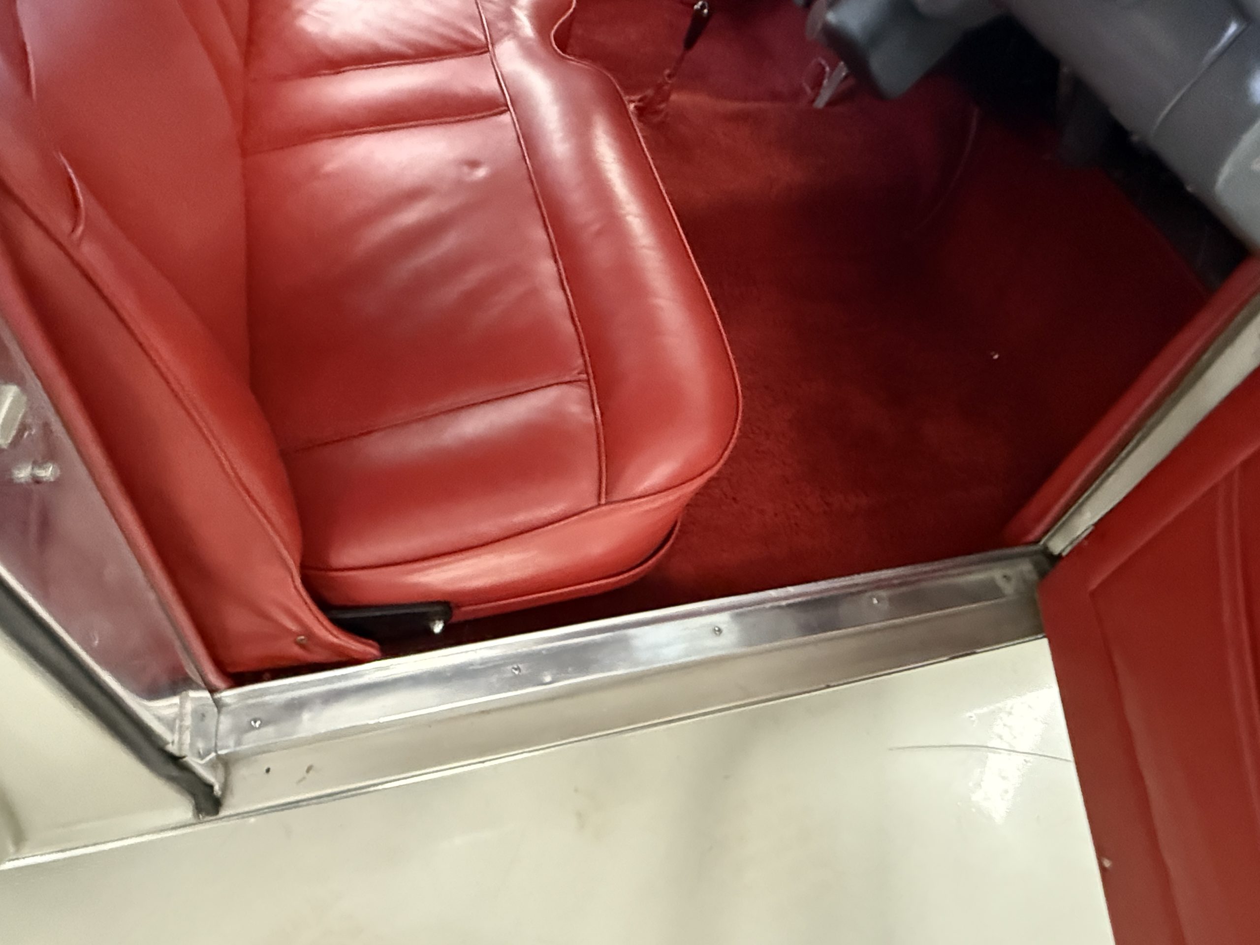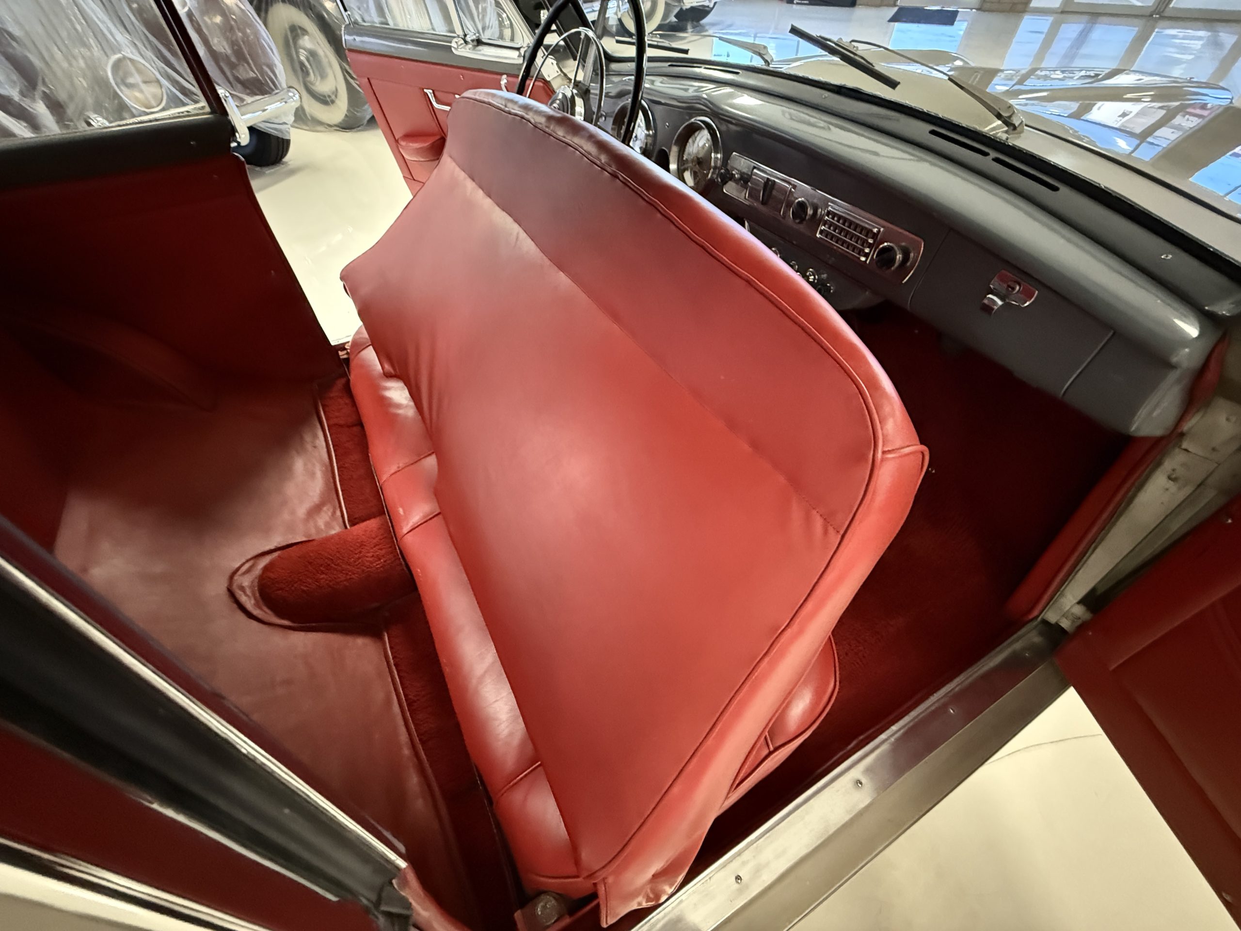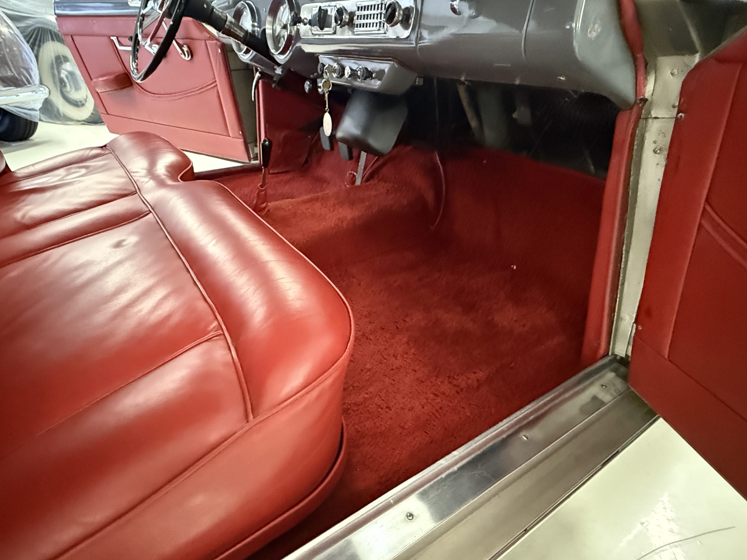 The cabin features a bench seat trimmed in red leather along with color-coordinated door panels and carpets. It is also equipped with tinted visors and a factory AM radio.