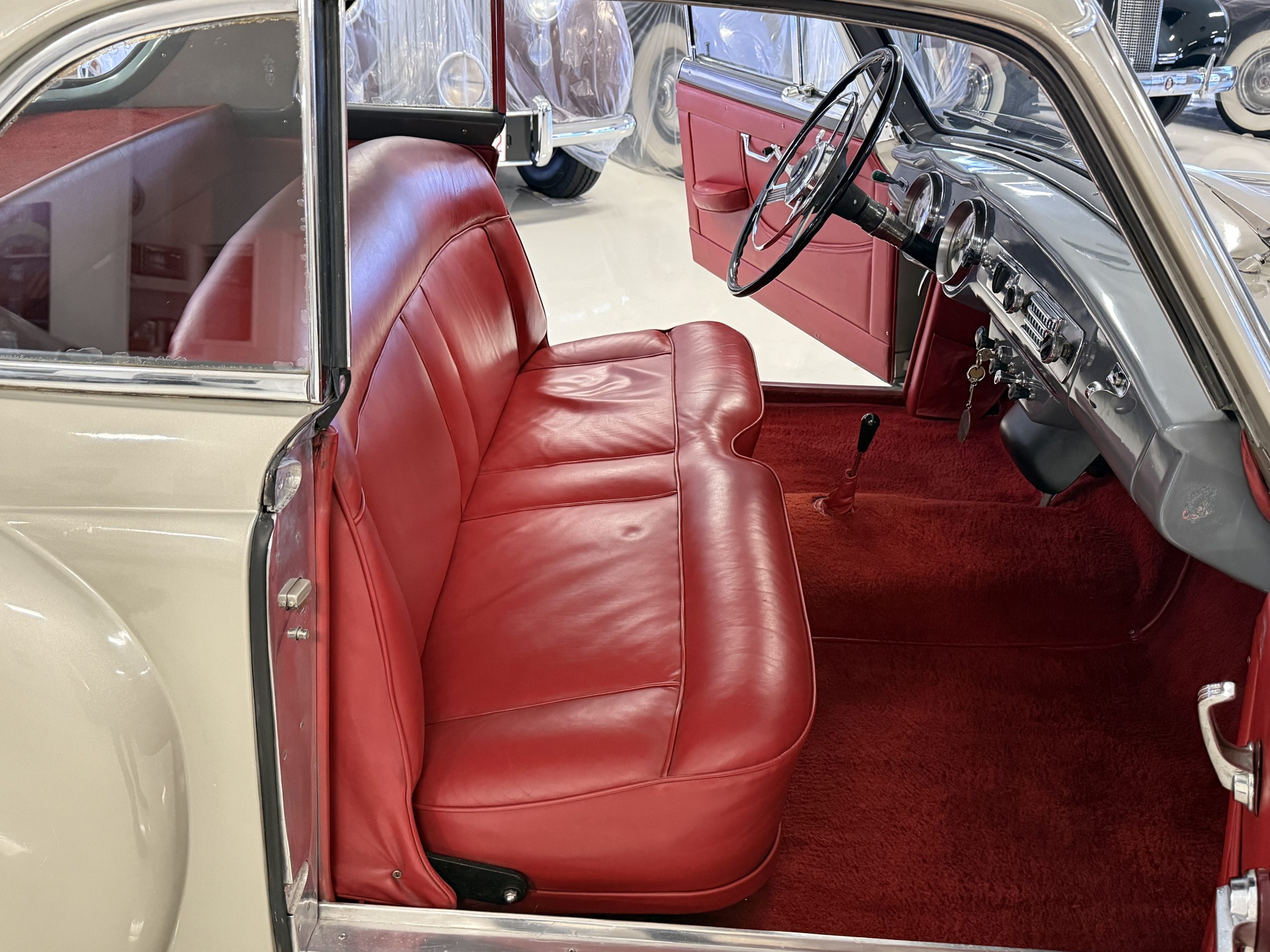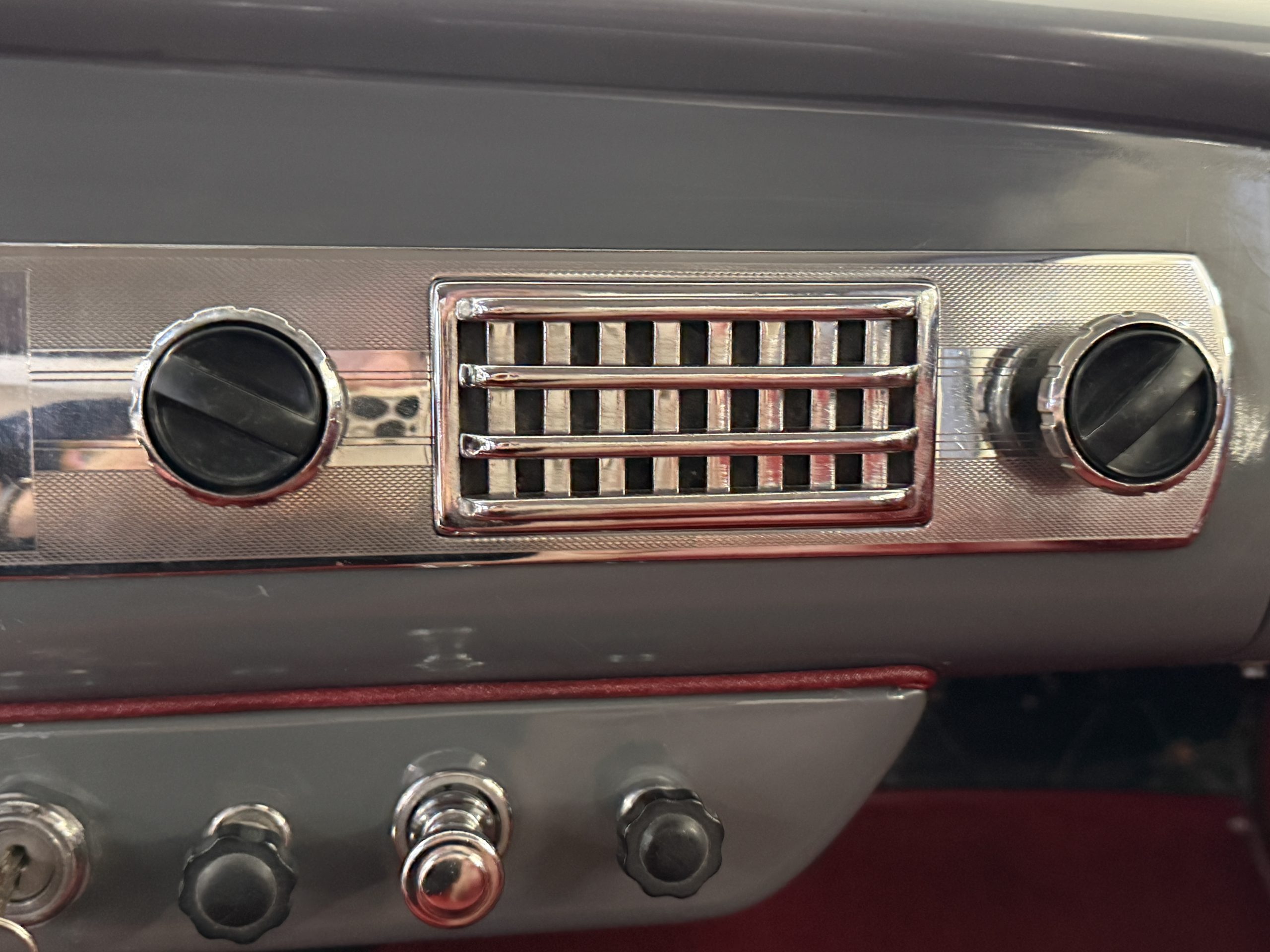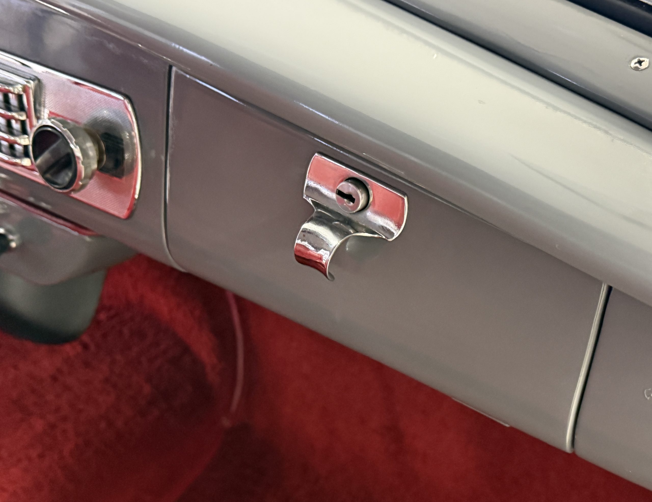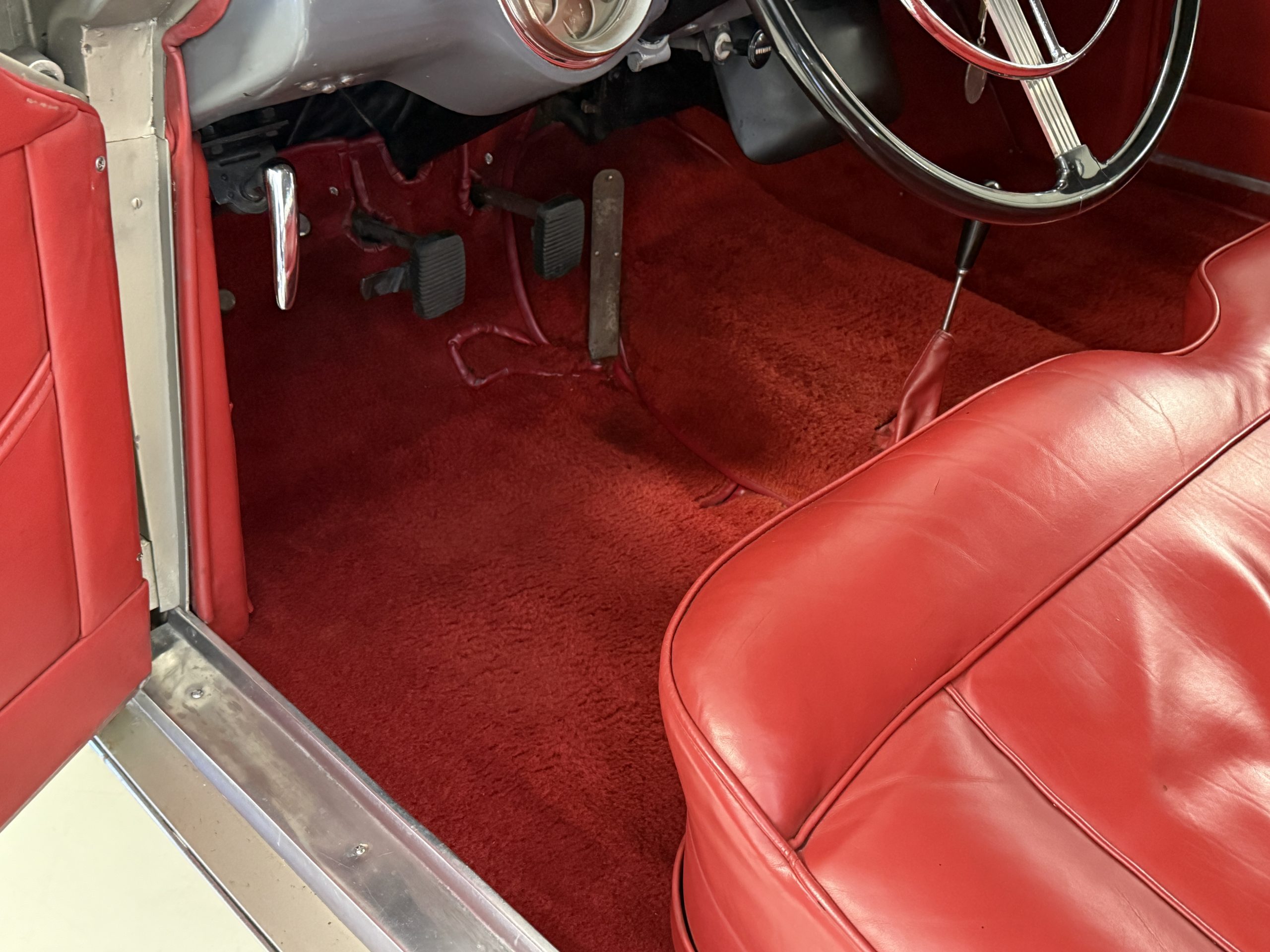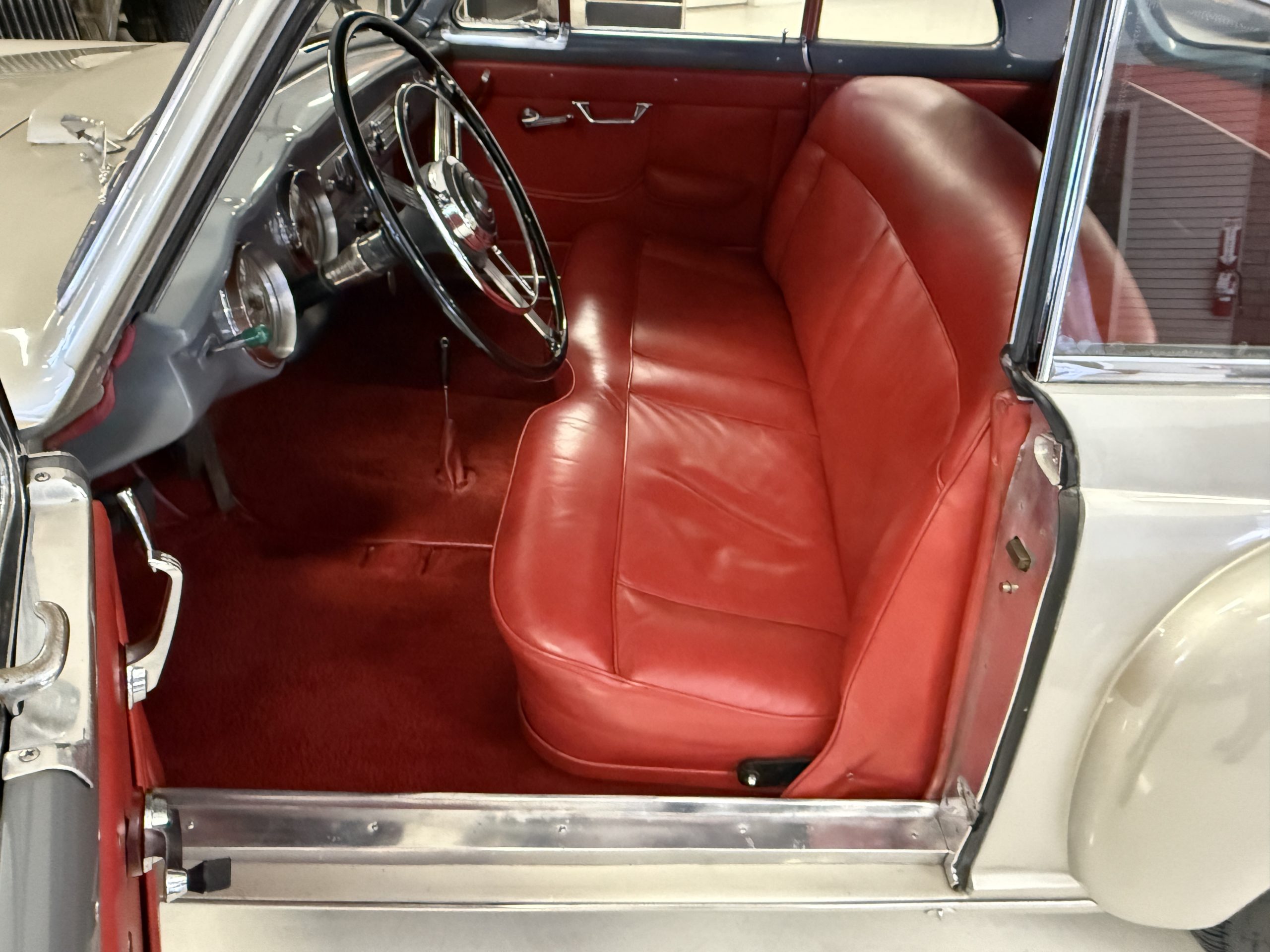 The cabin features a bench seat trimmed in red leather along with color-coordinated door panels and carpets. It is also equipped with tinted visors and a factory AM radio.