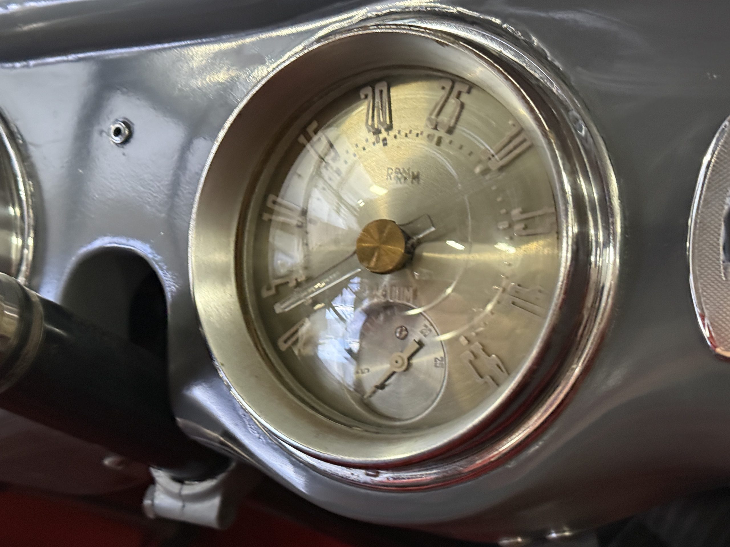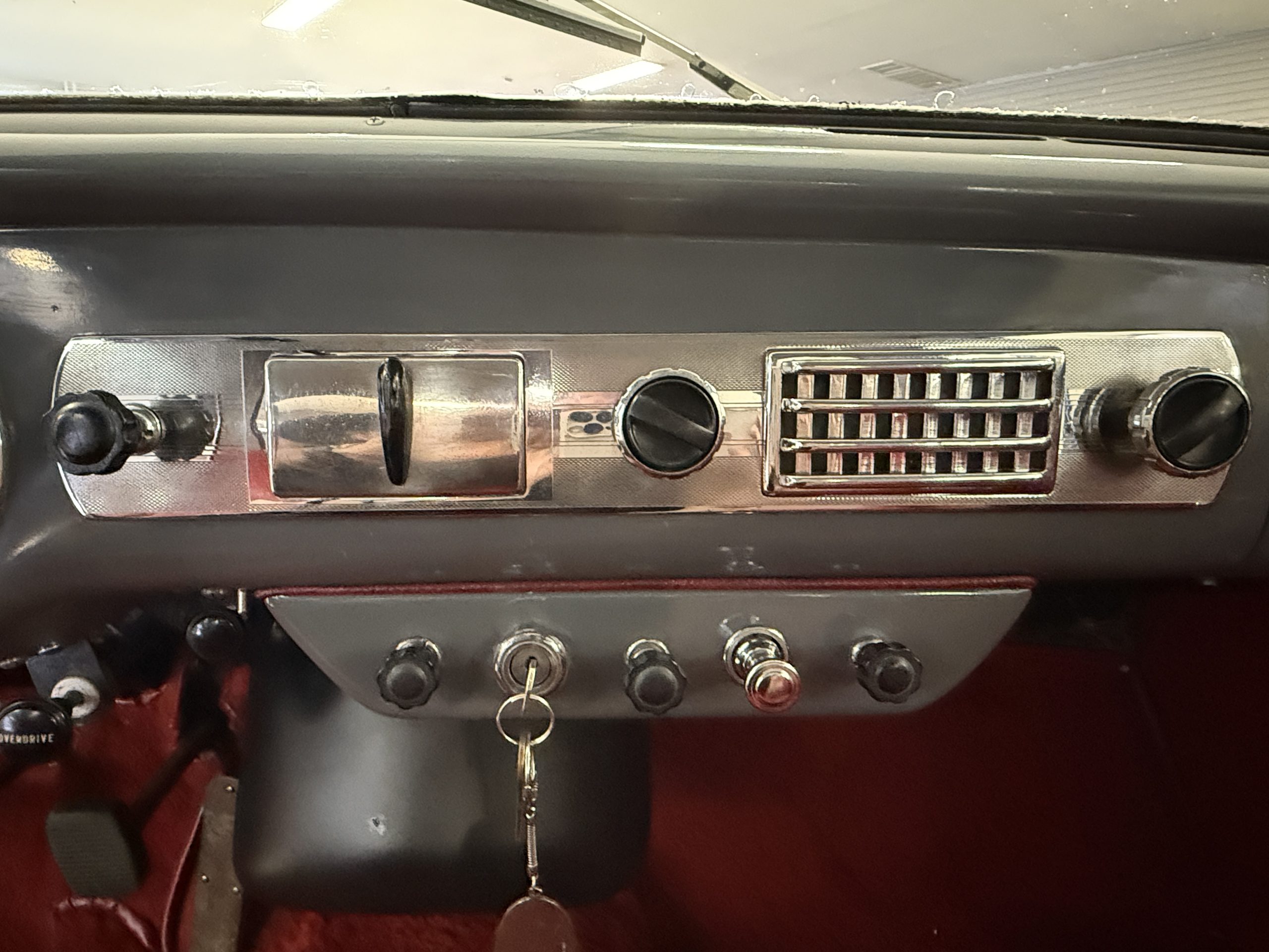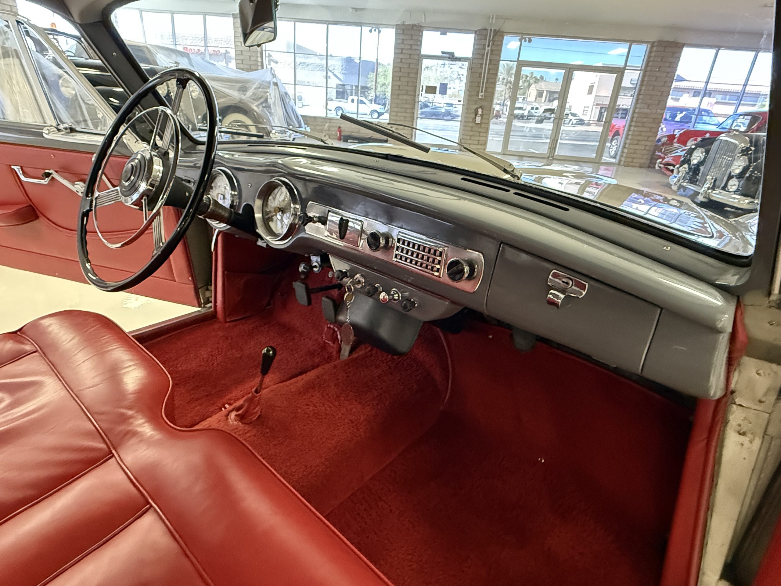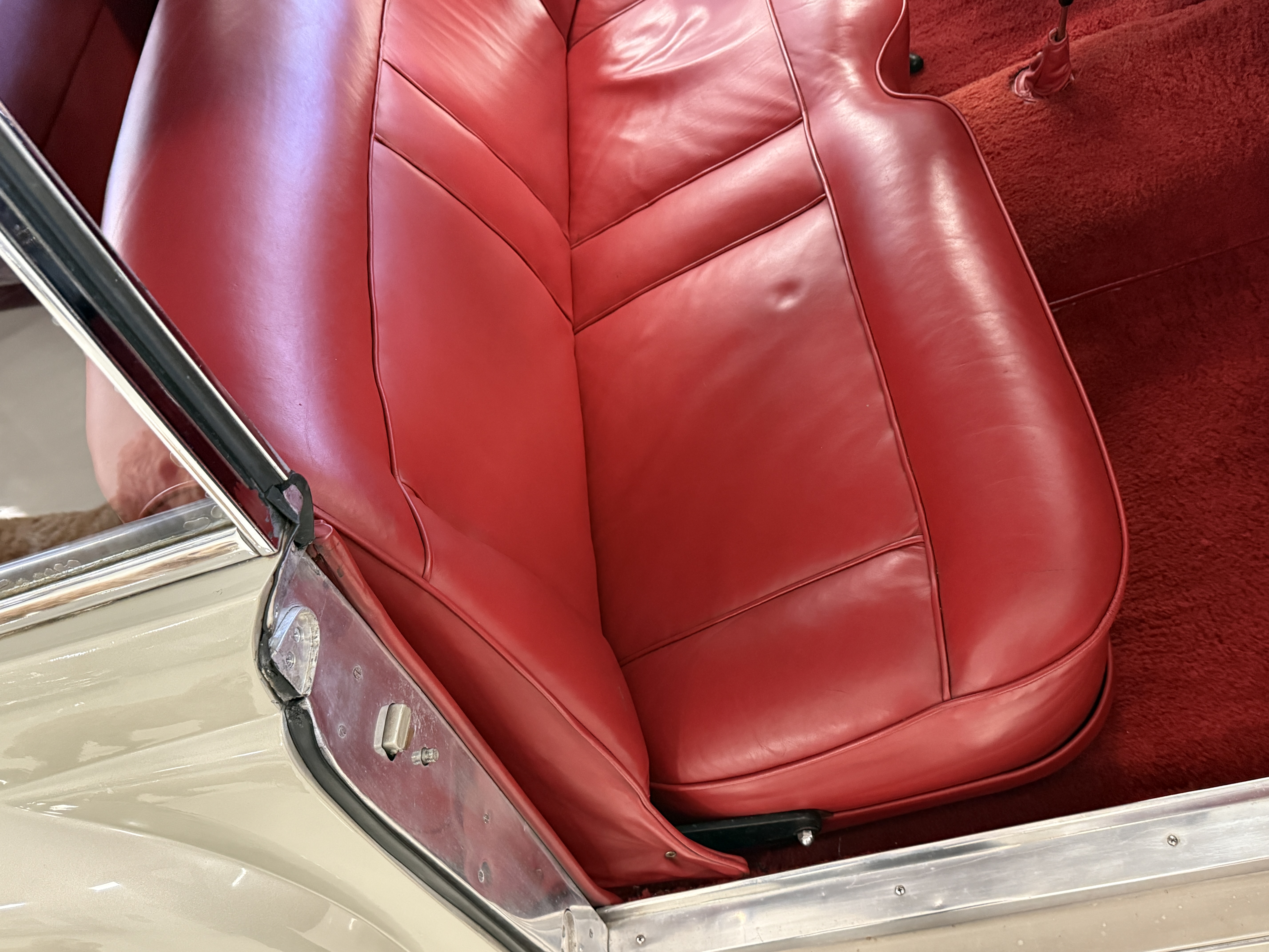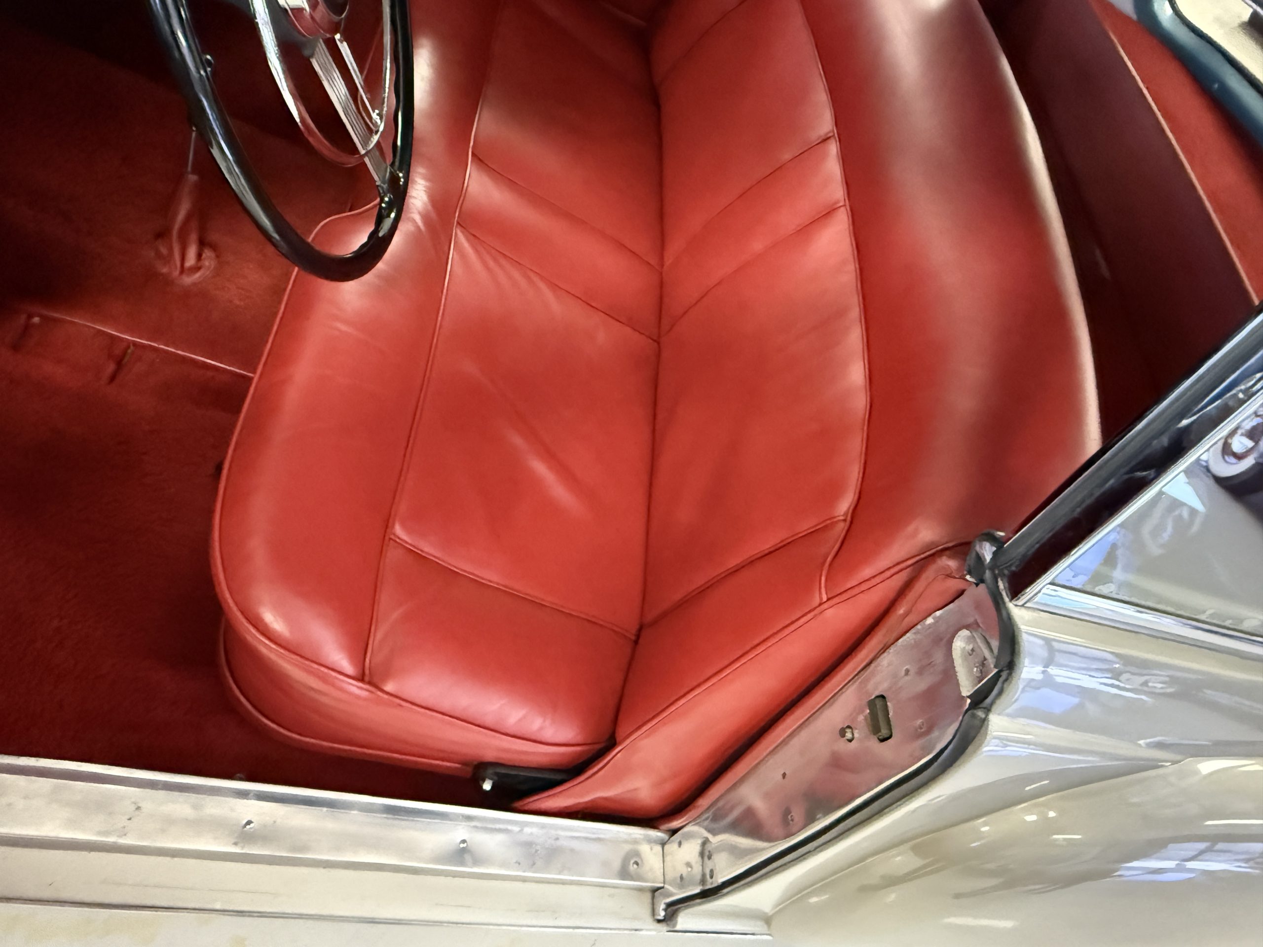 The cabin features a bench seat trimmed in red leather along with color-coordinated door panels and carpets. It is also equipped with tinted visors and a factory AM radio.