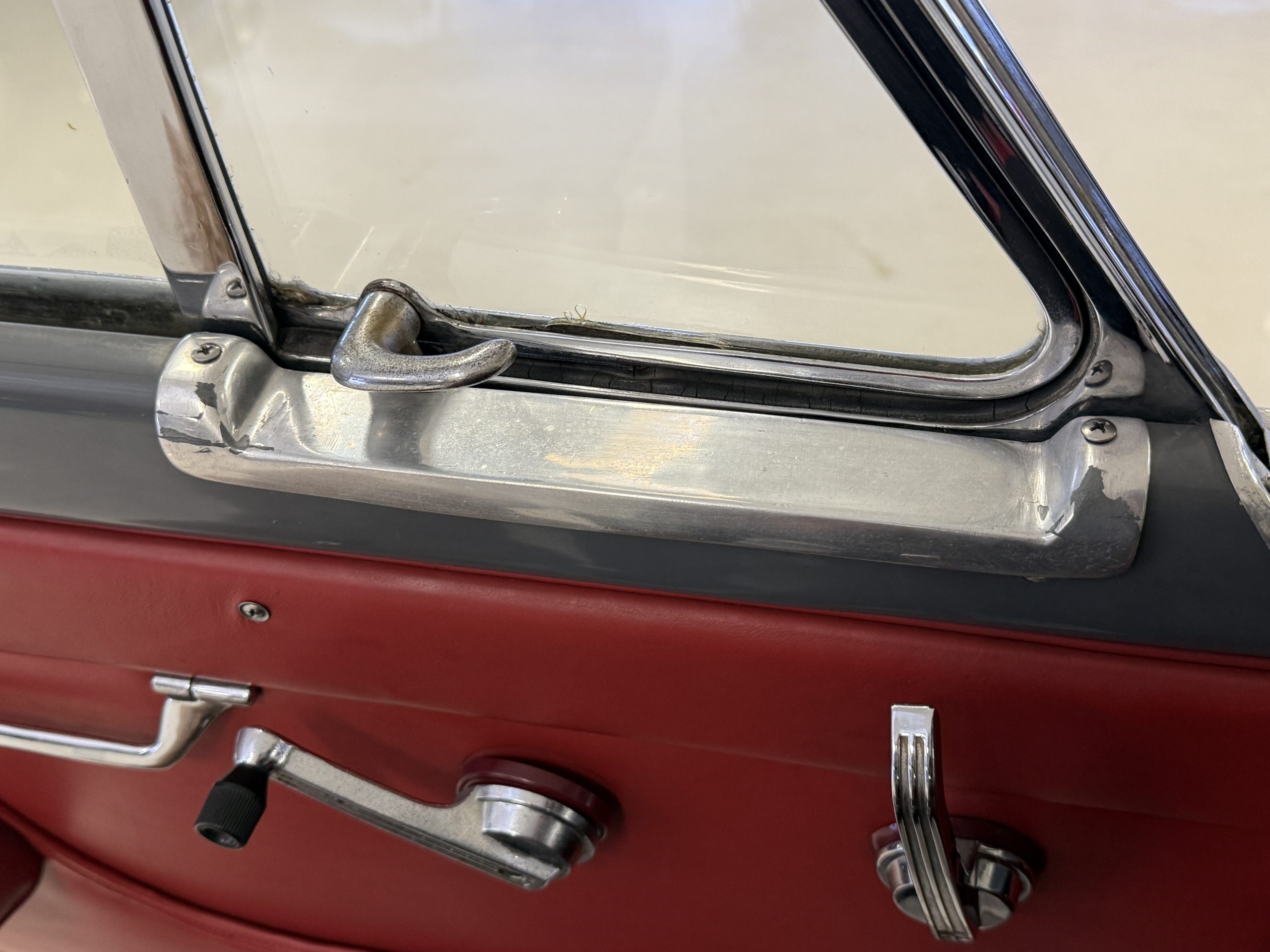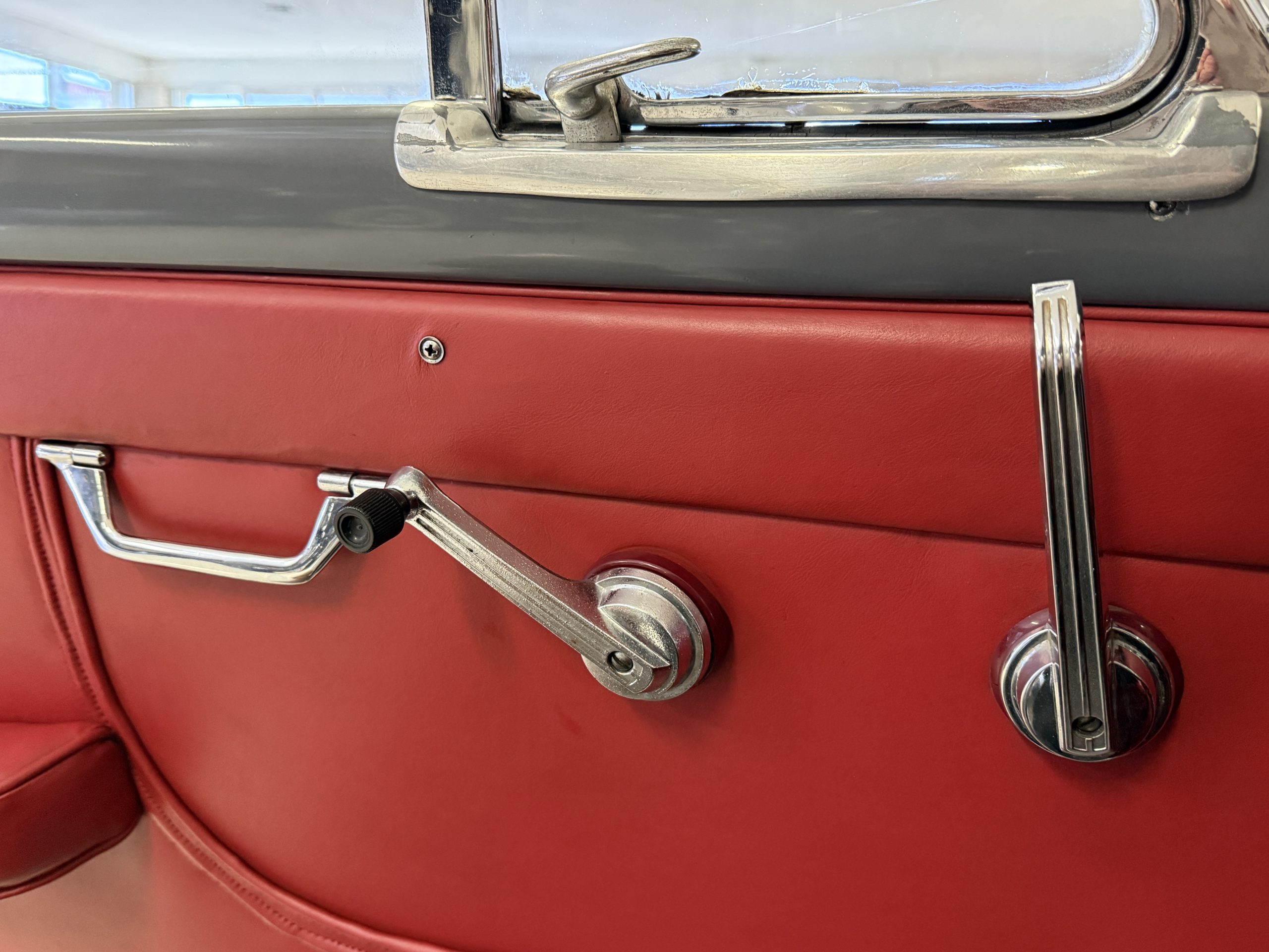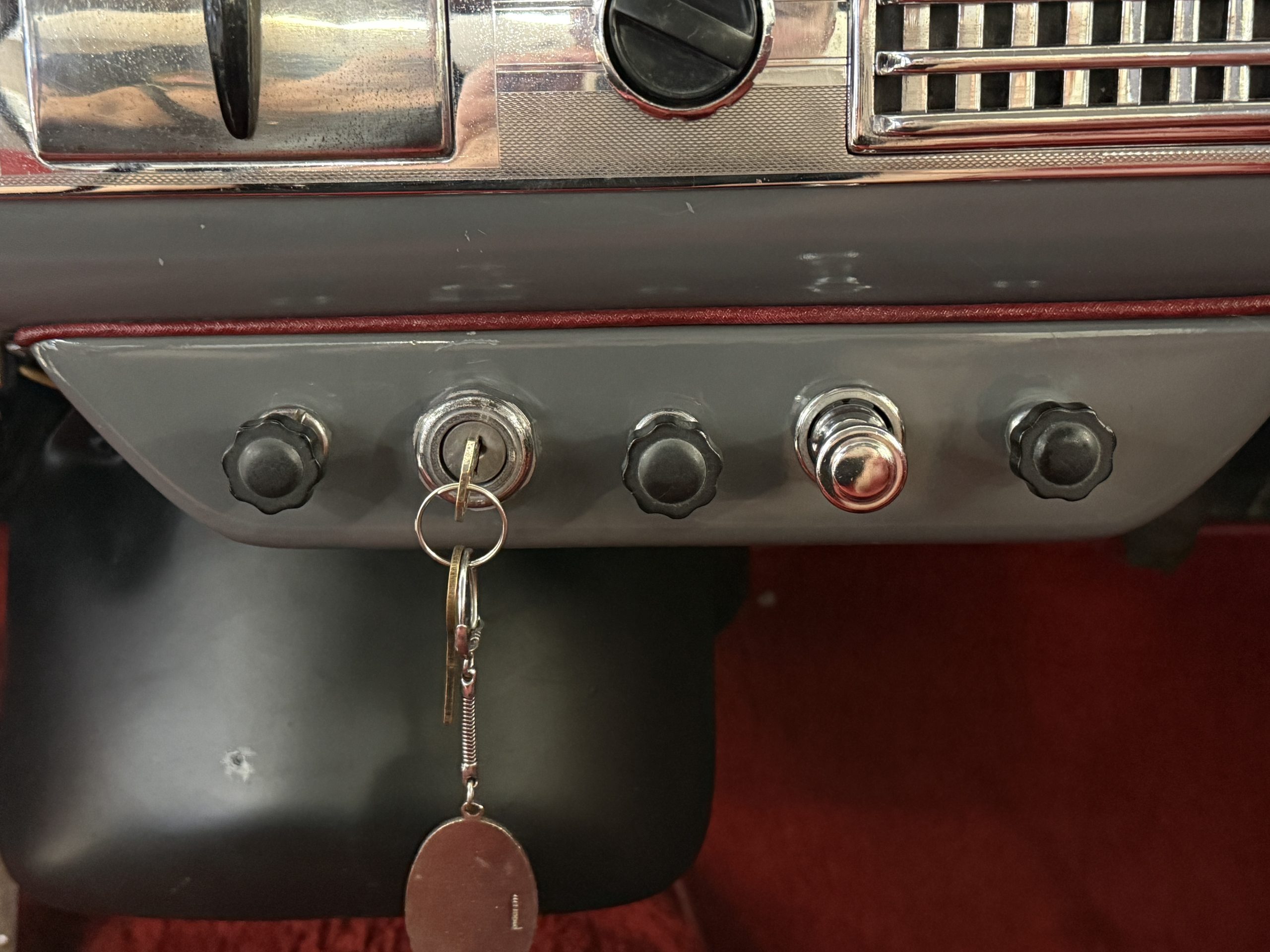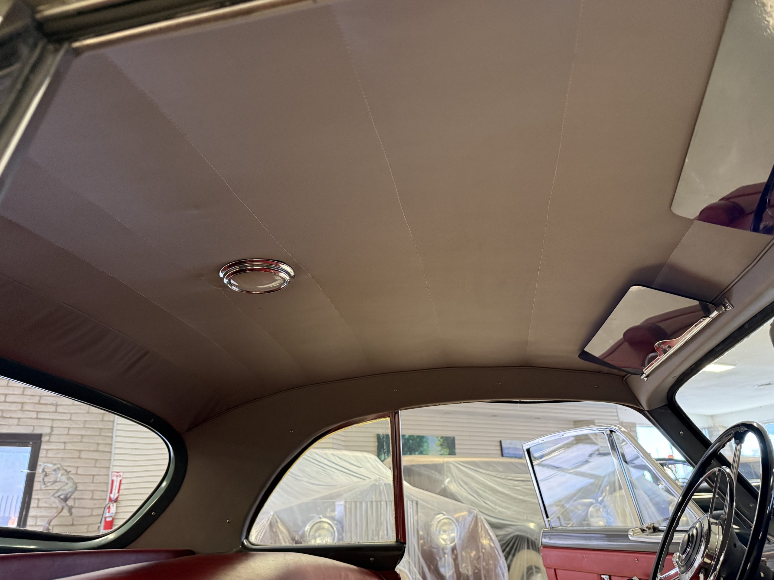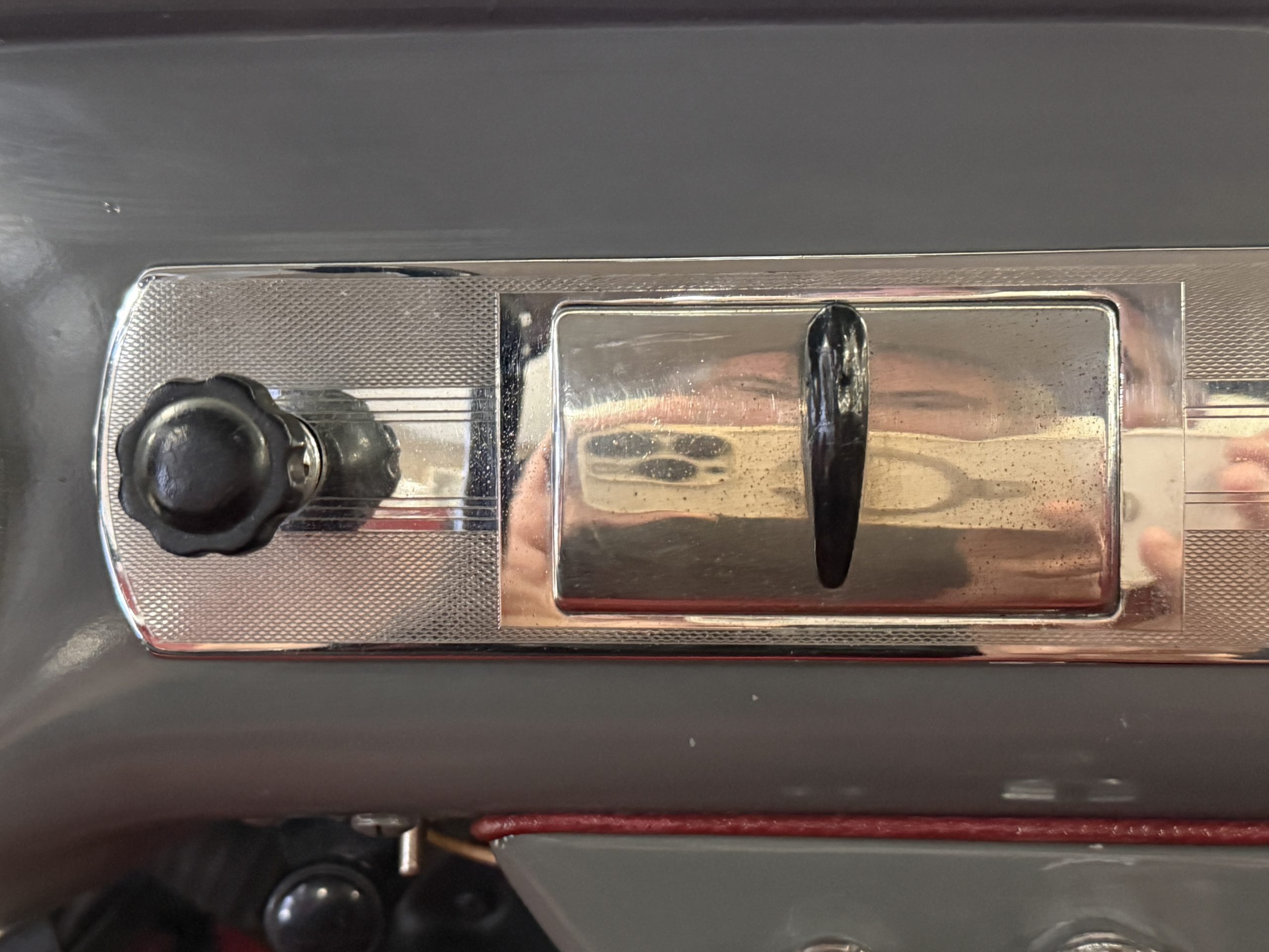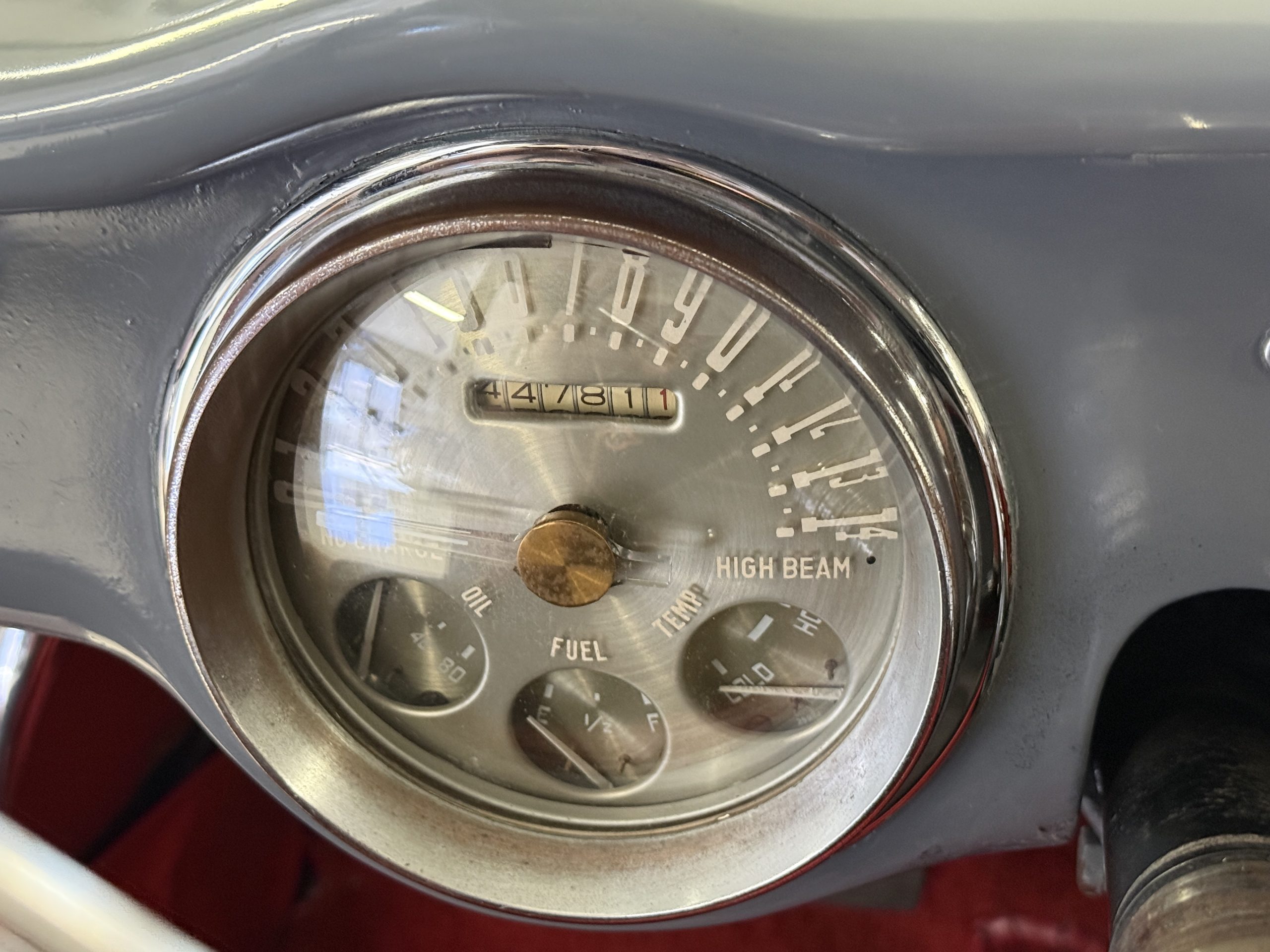 The cabin features a bench seat trimmed in red leather along with color-coordinated door panels and carpets. It is also equipped with tinted visors and a factory AM radio.