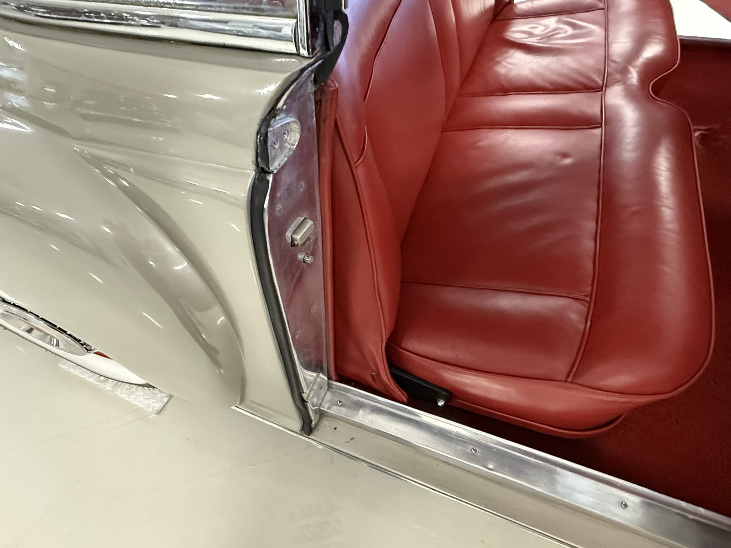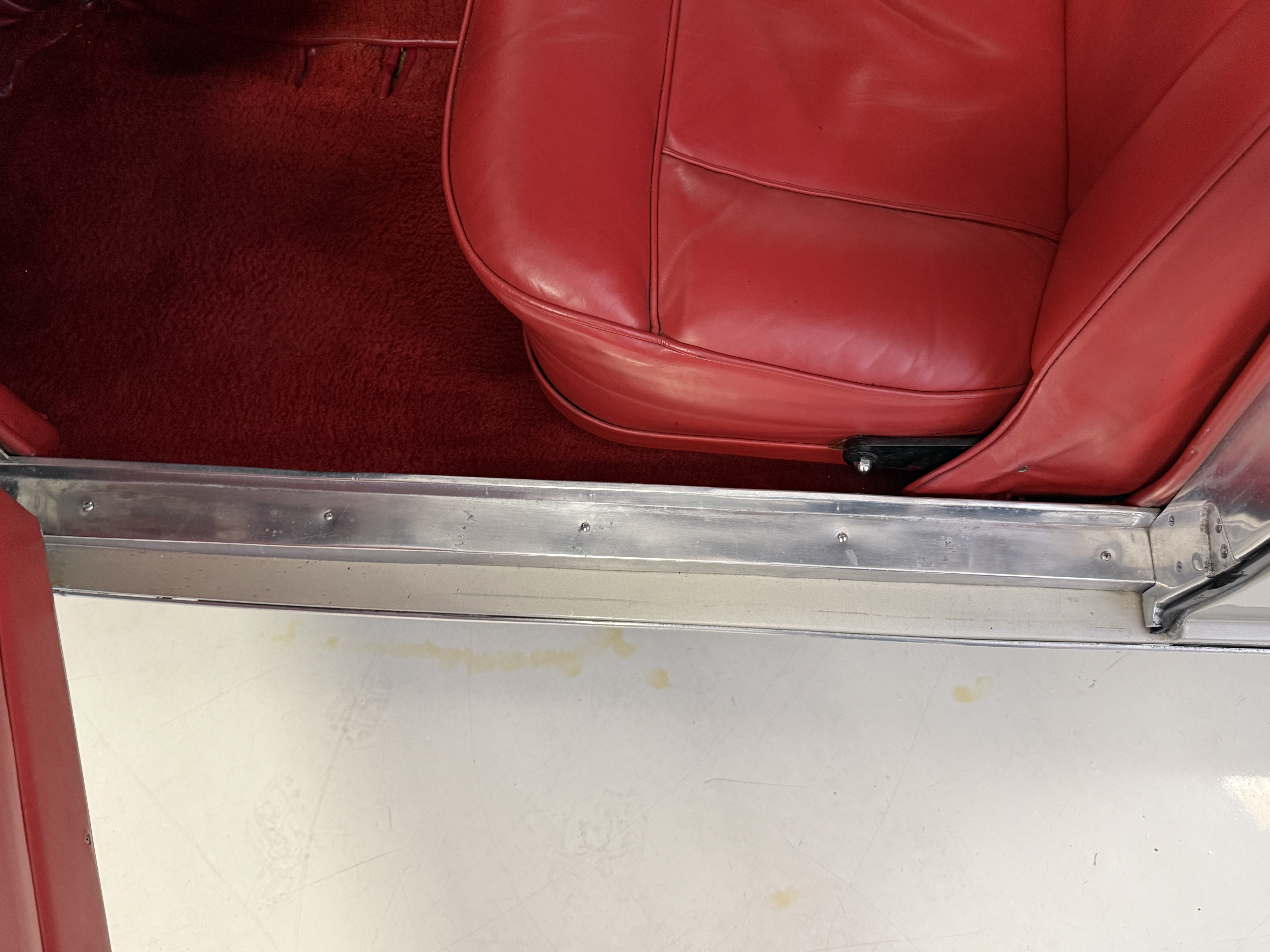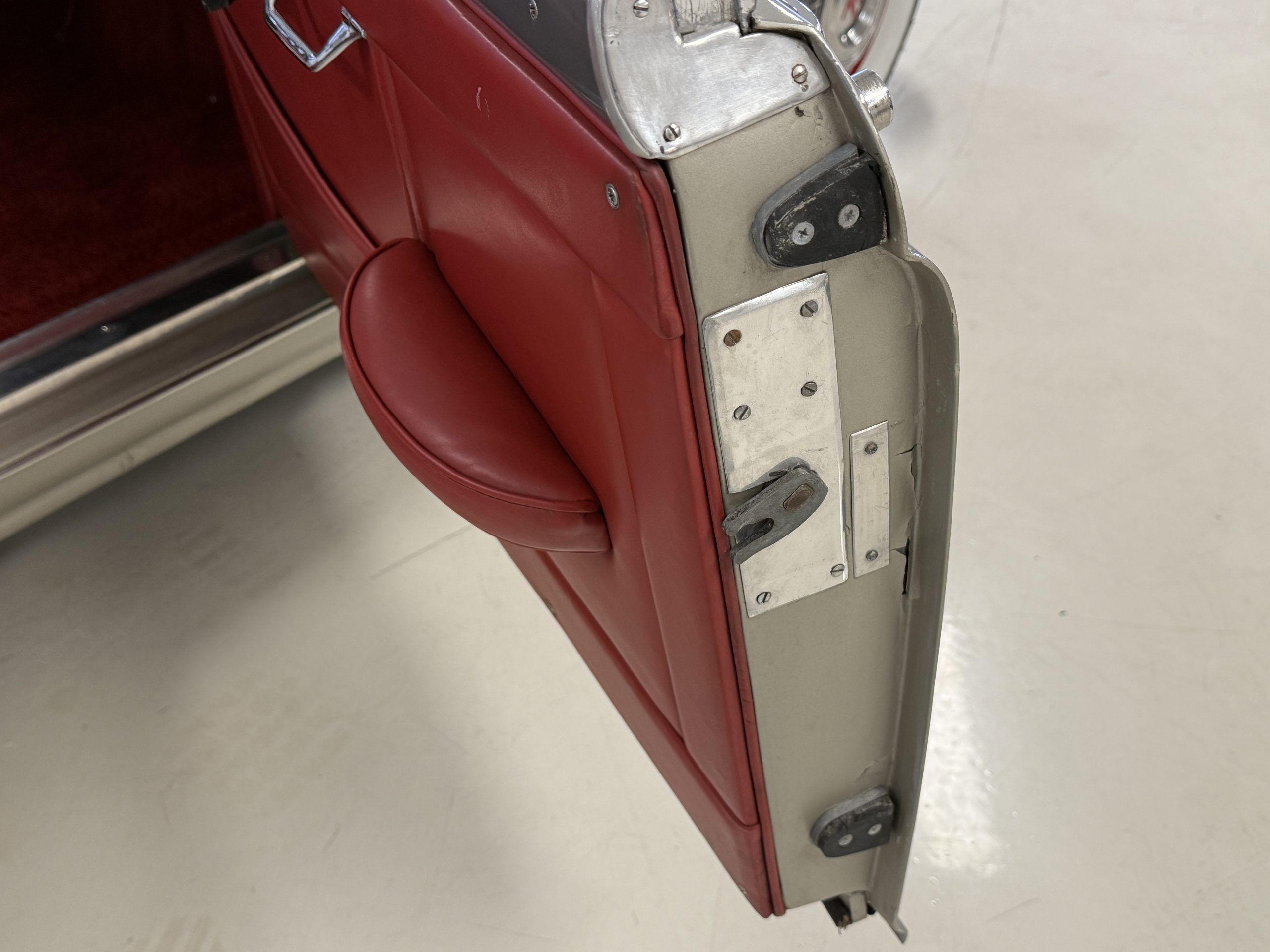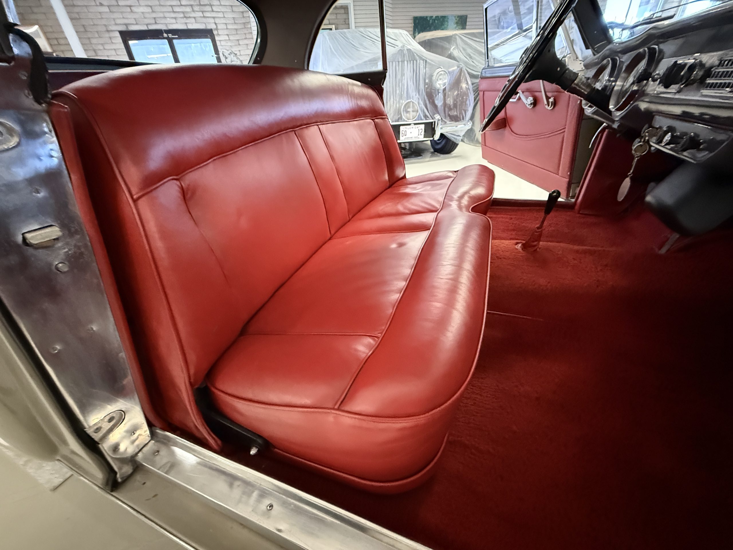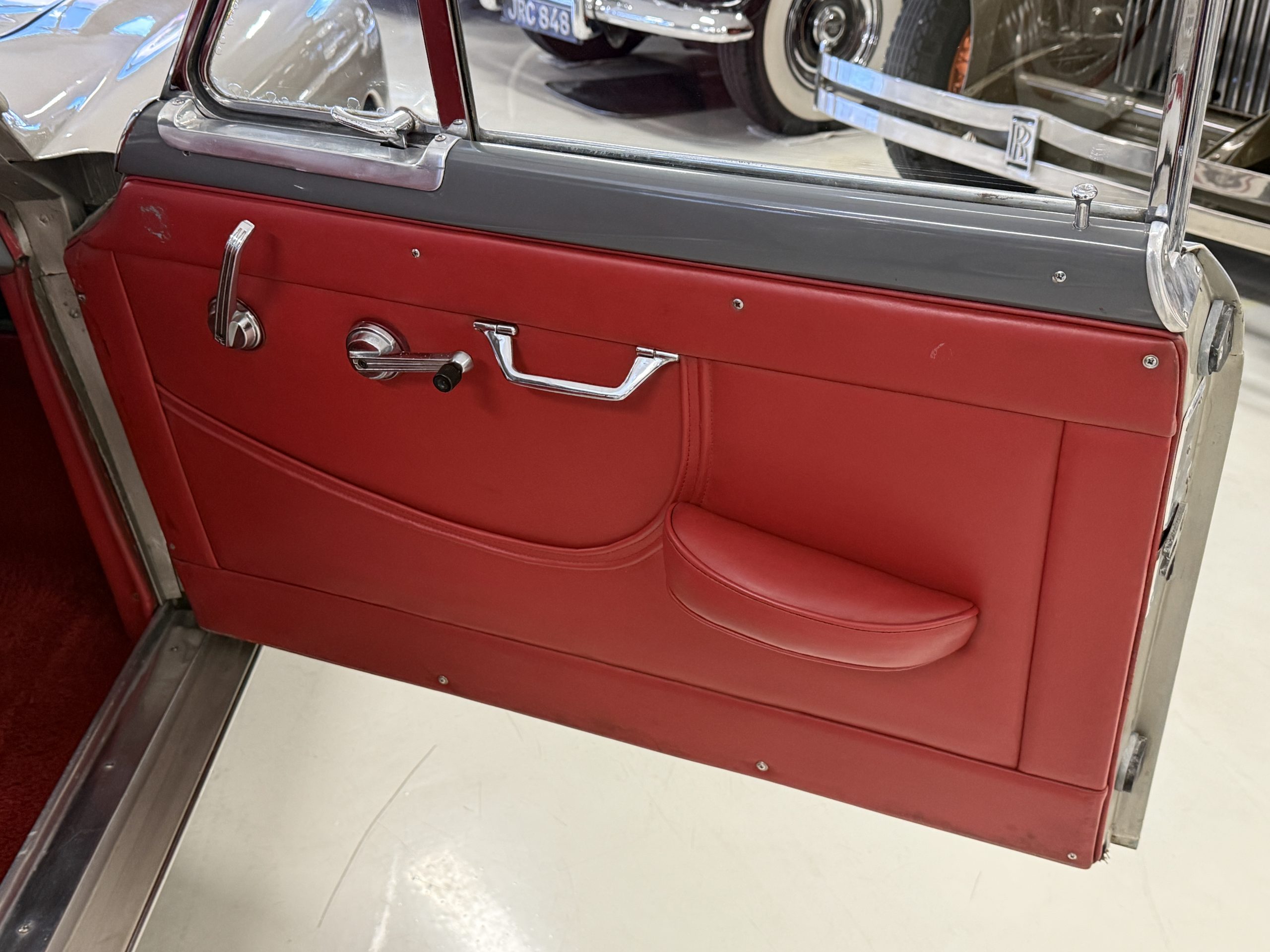 The cabin features a bench seat trimmed in red leather along with color-coordinated door panels and carpets. It is also equipped with tinted visors and a factory AM radio.