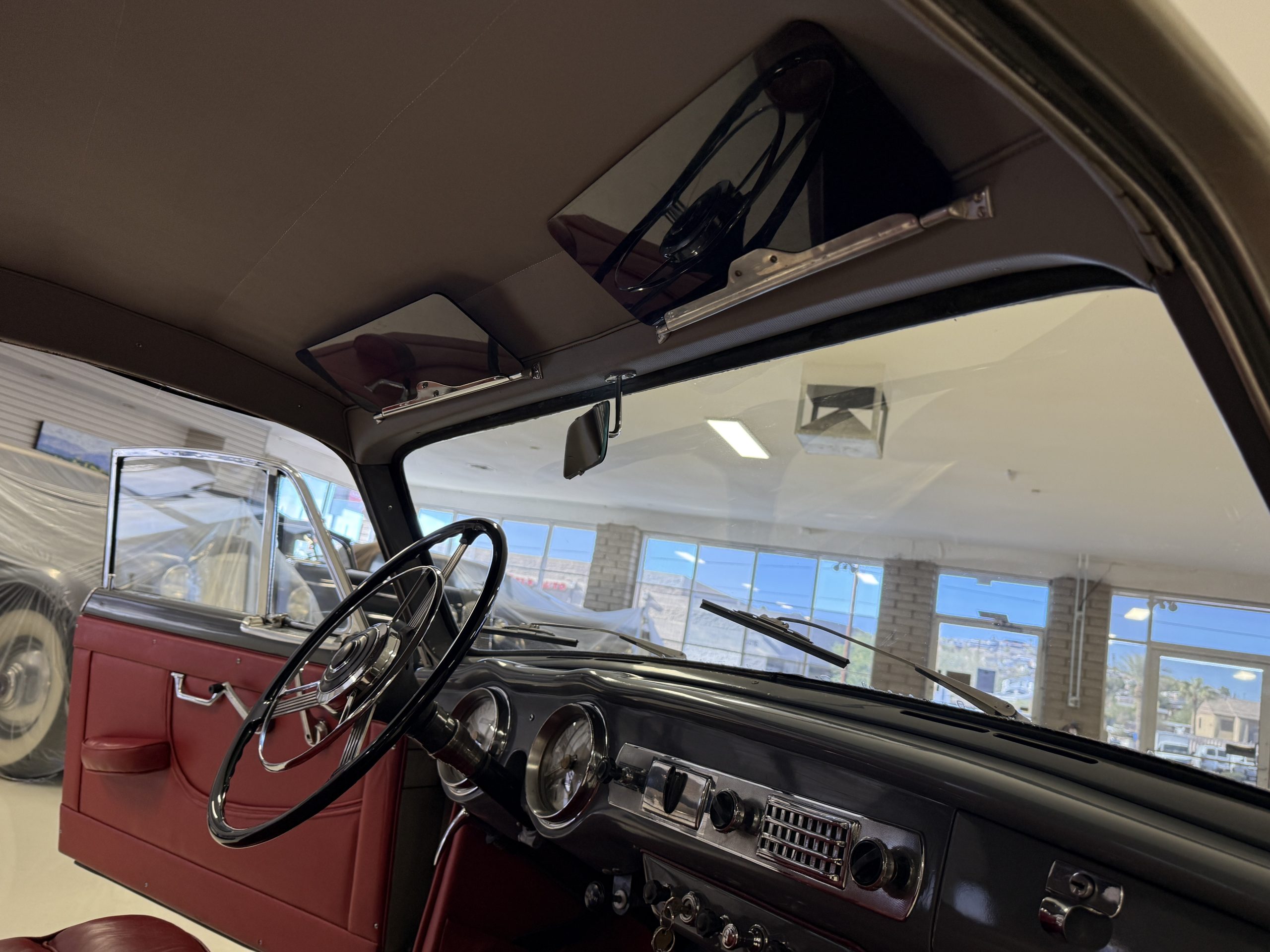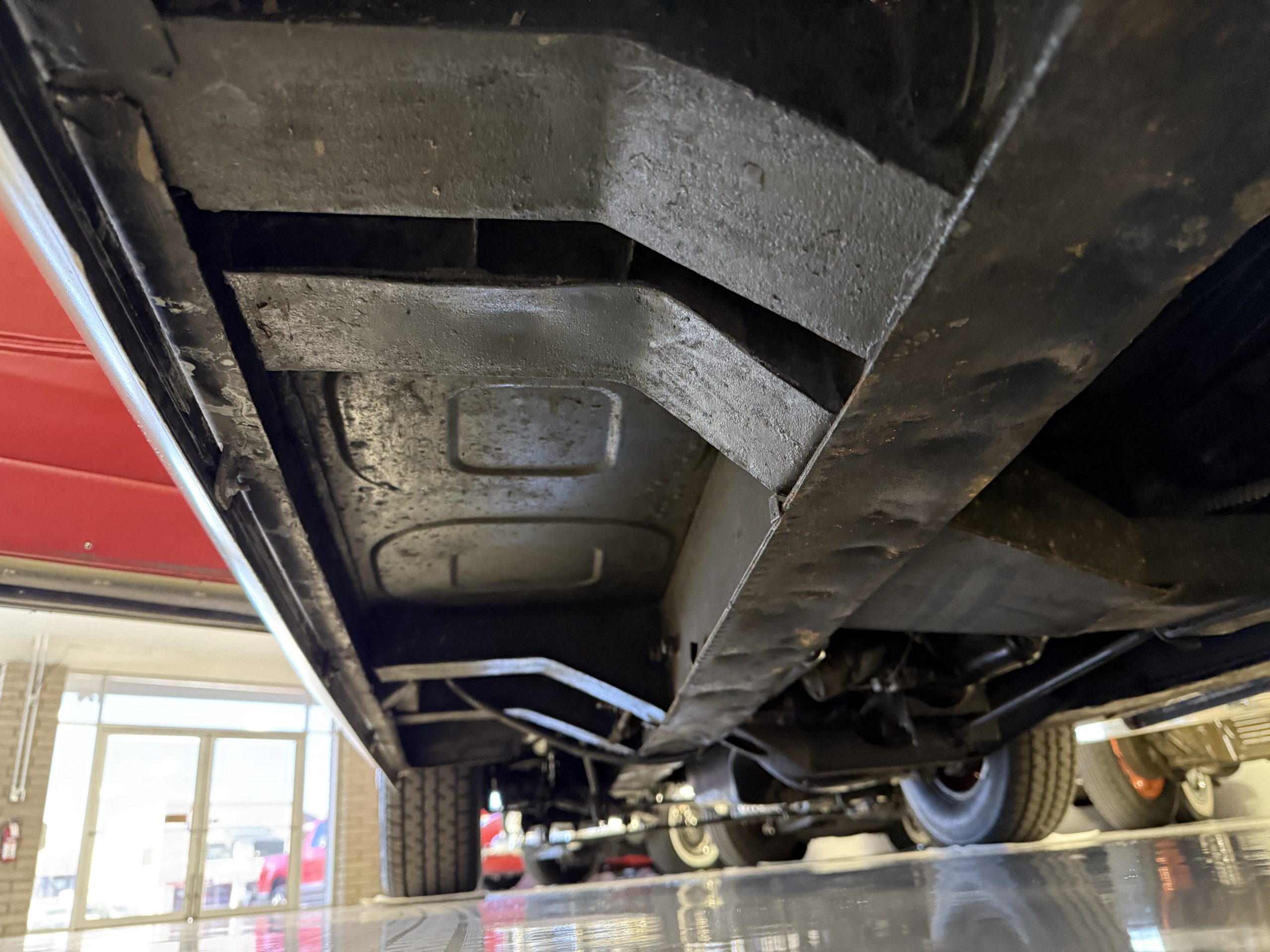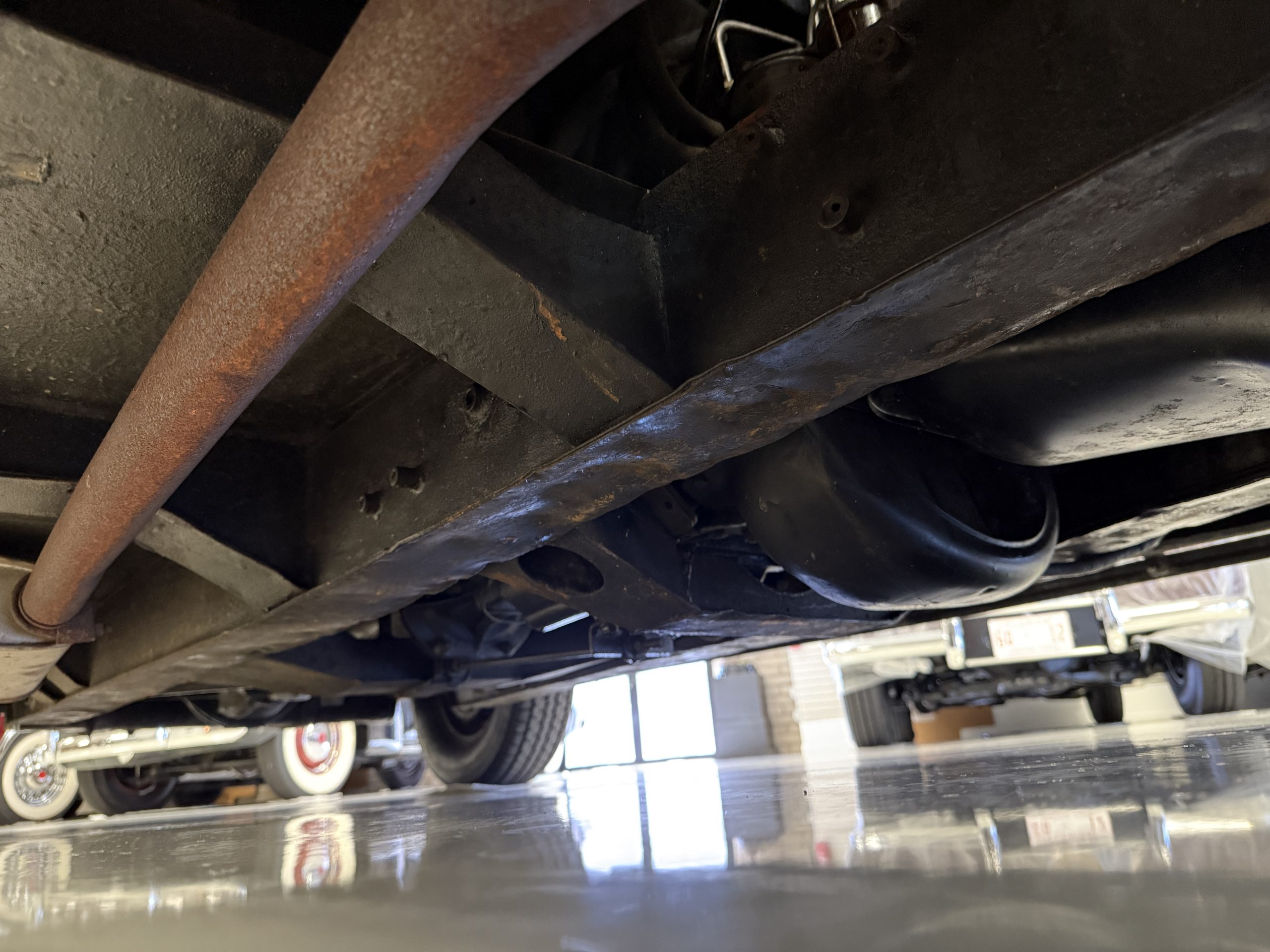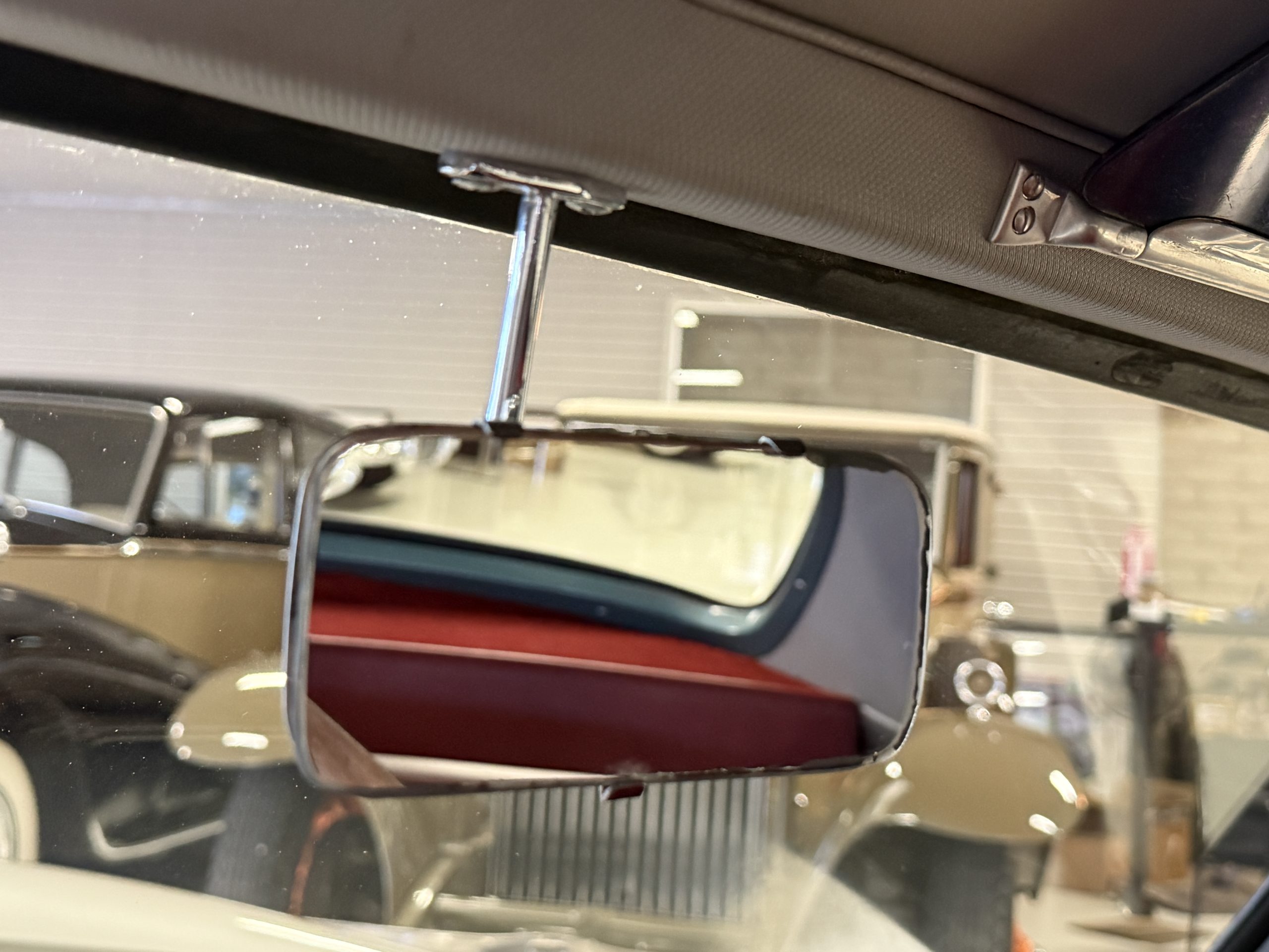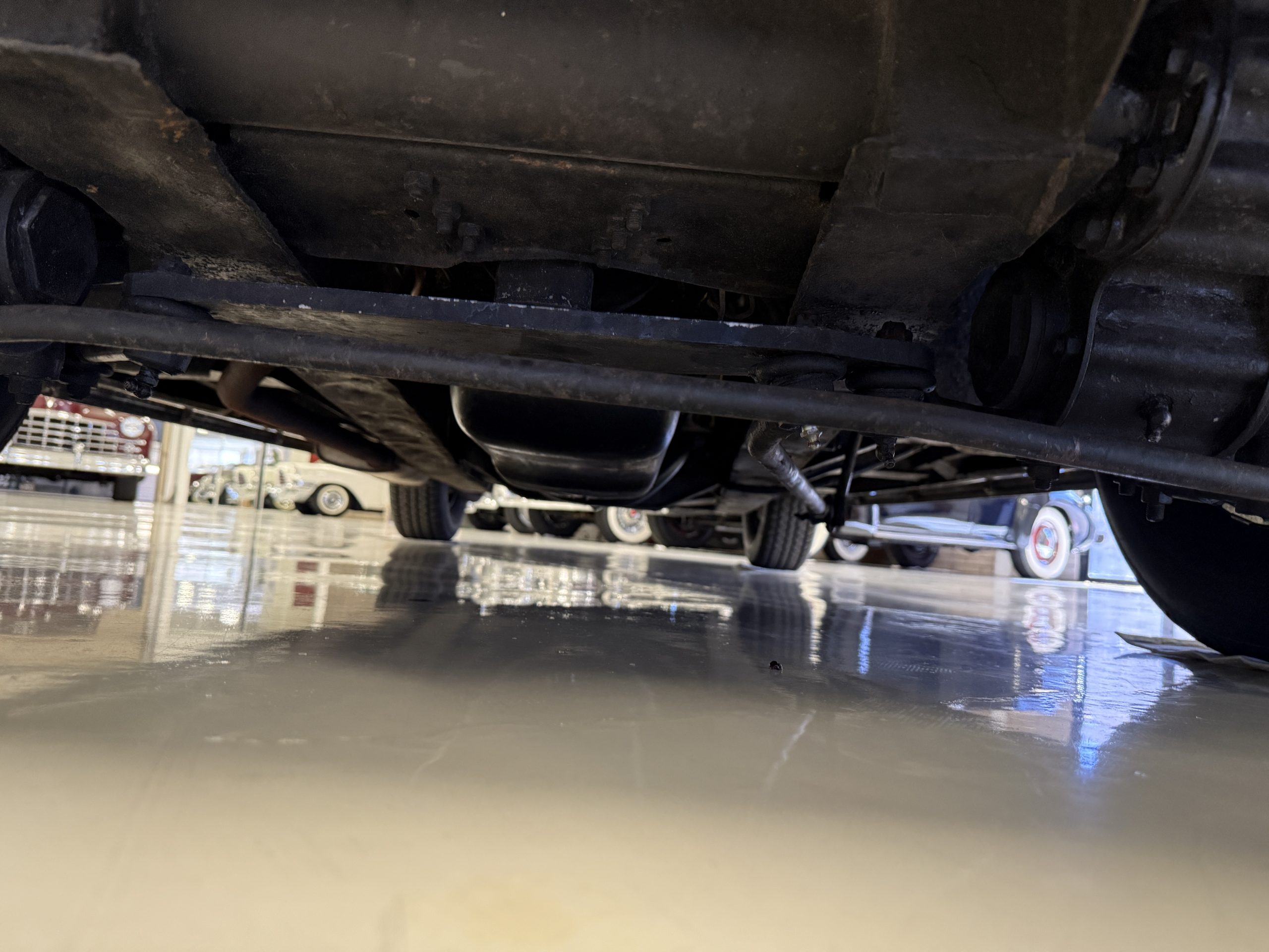 The cabin features a bench seat trimmed in red leather along with color-coordinated door panels and carpets. It is also equipped with tinted visors and a factory AM radio.