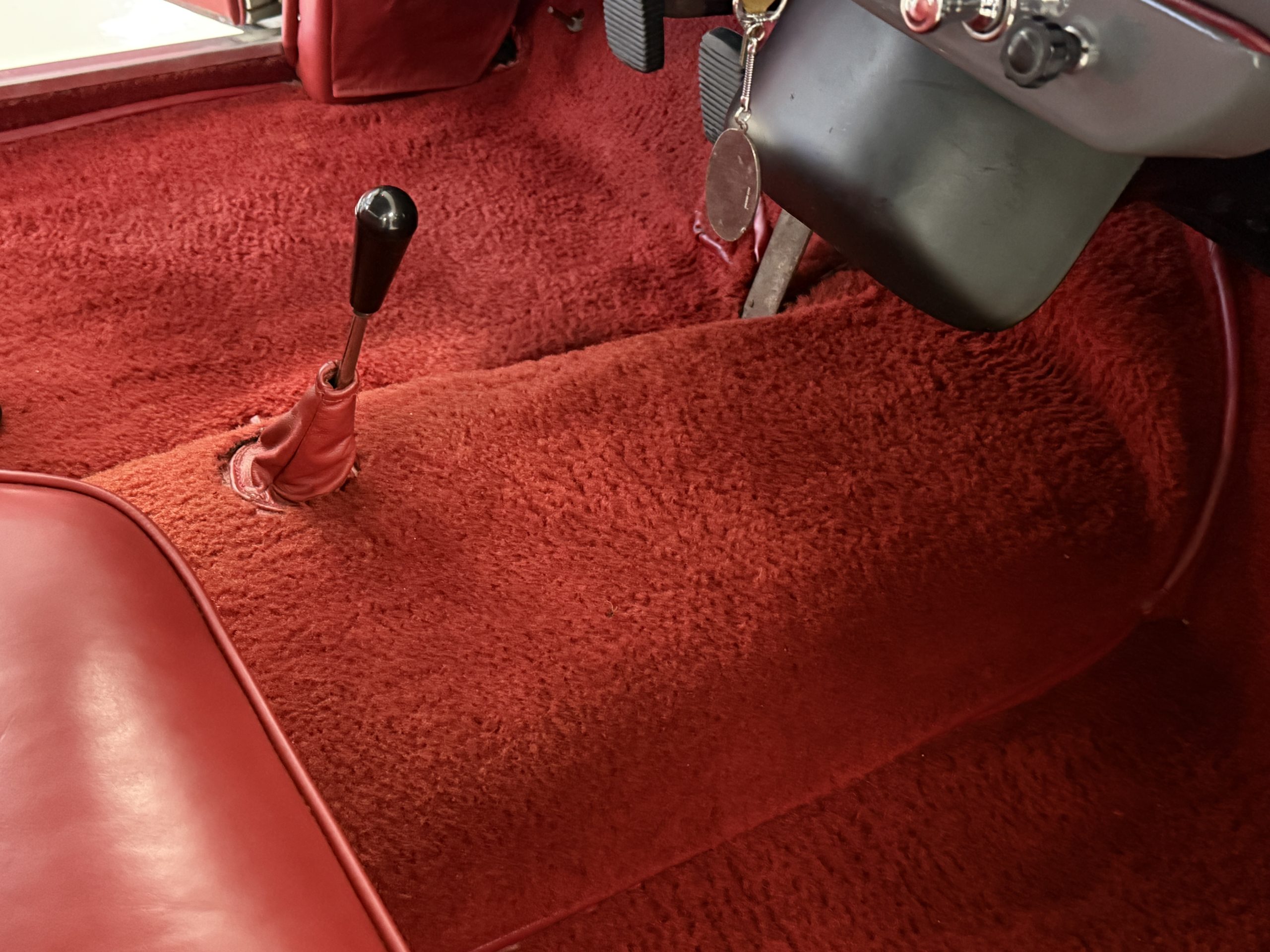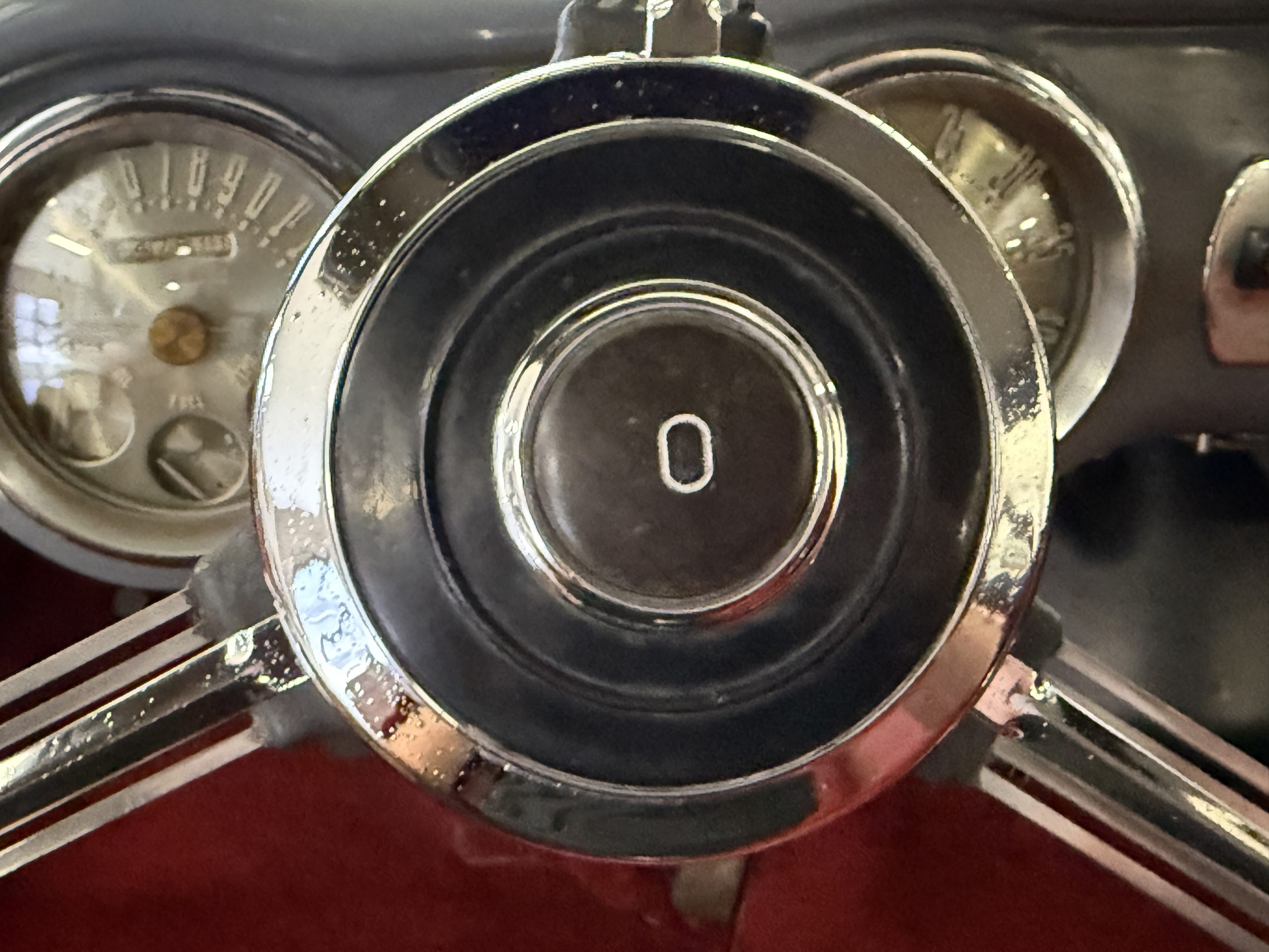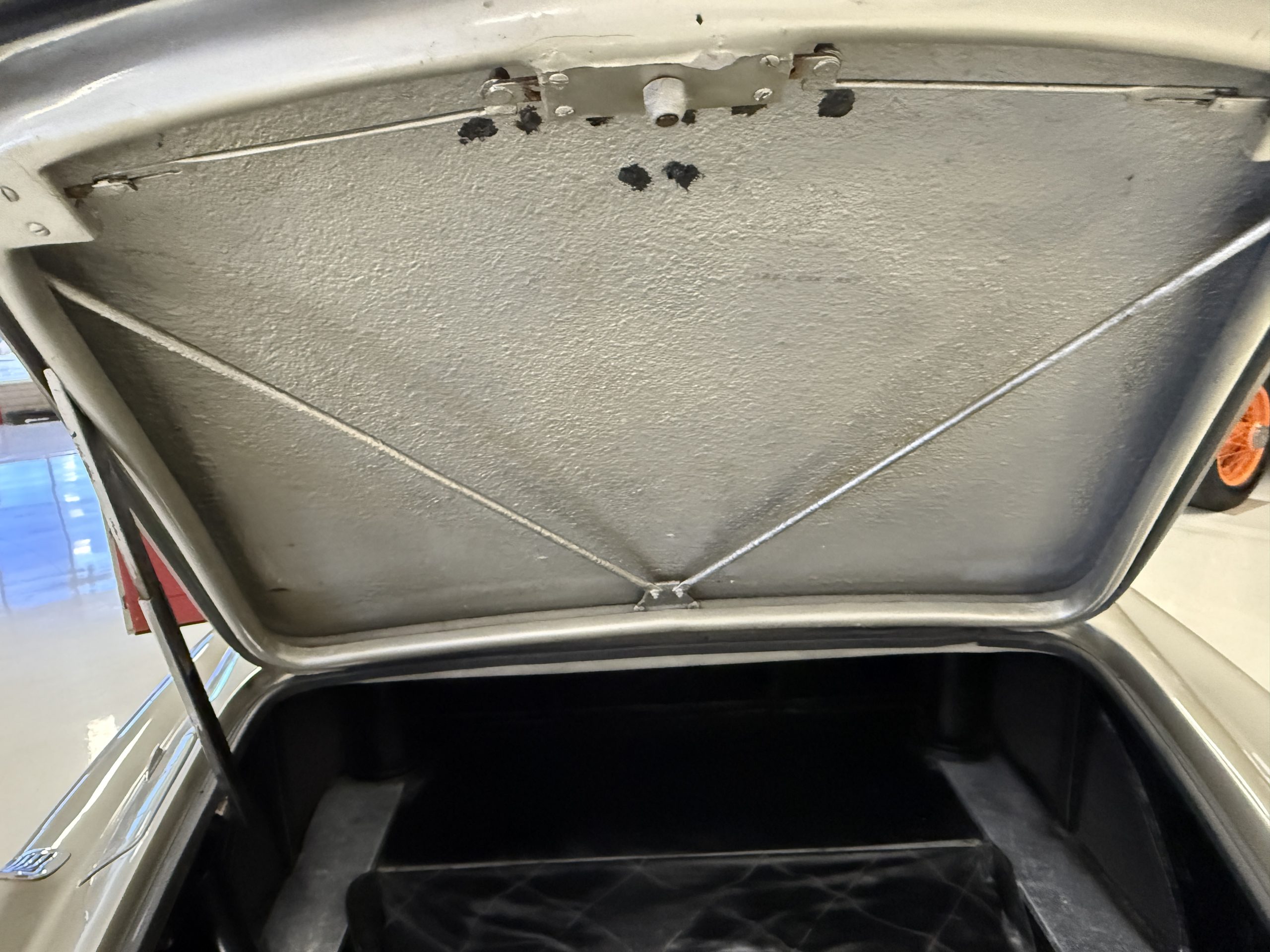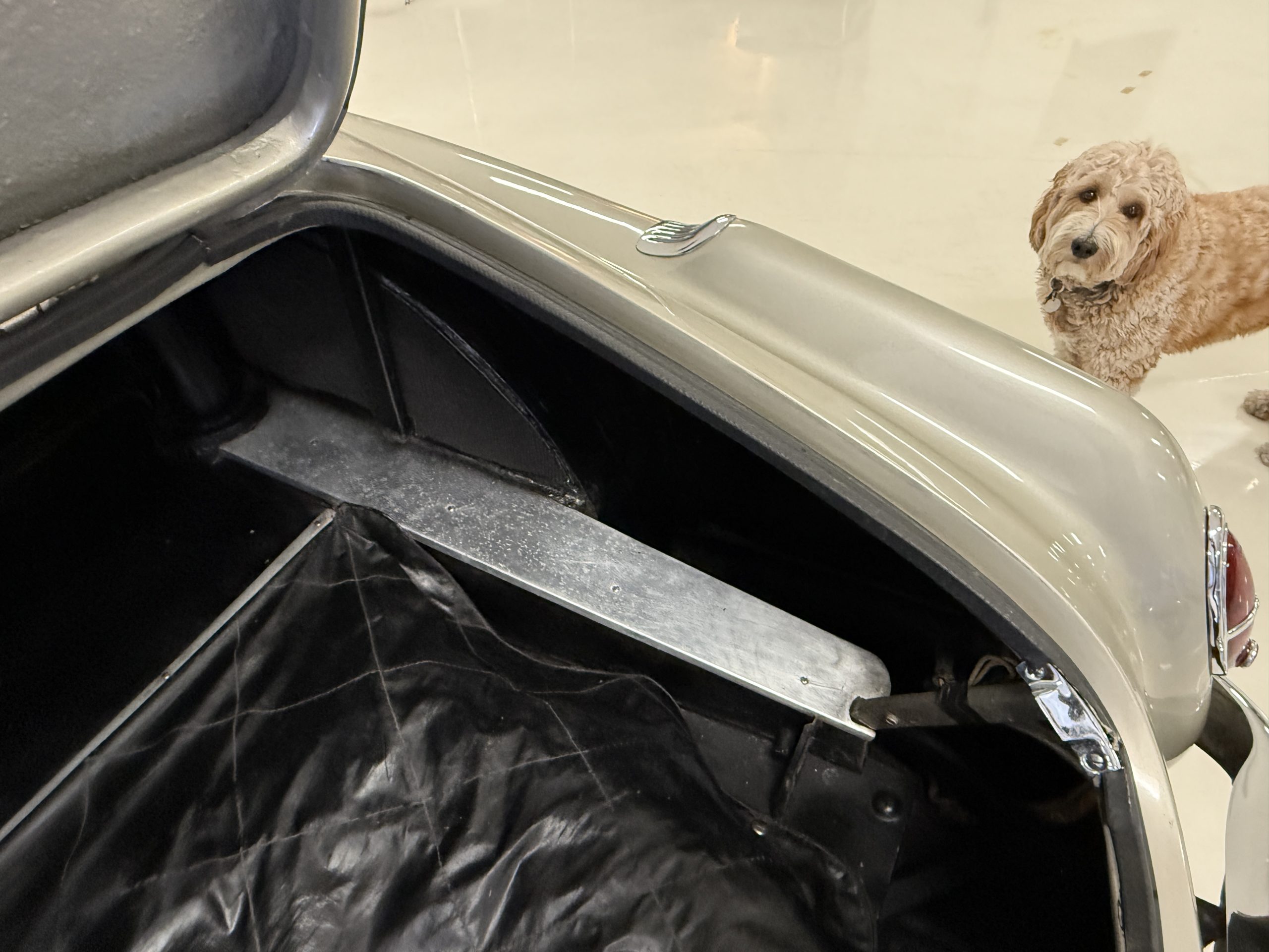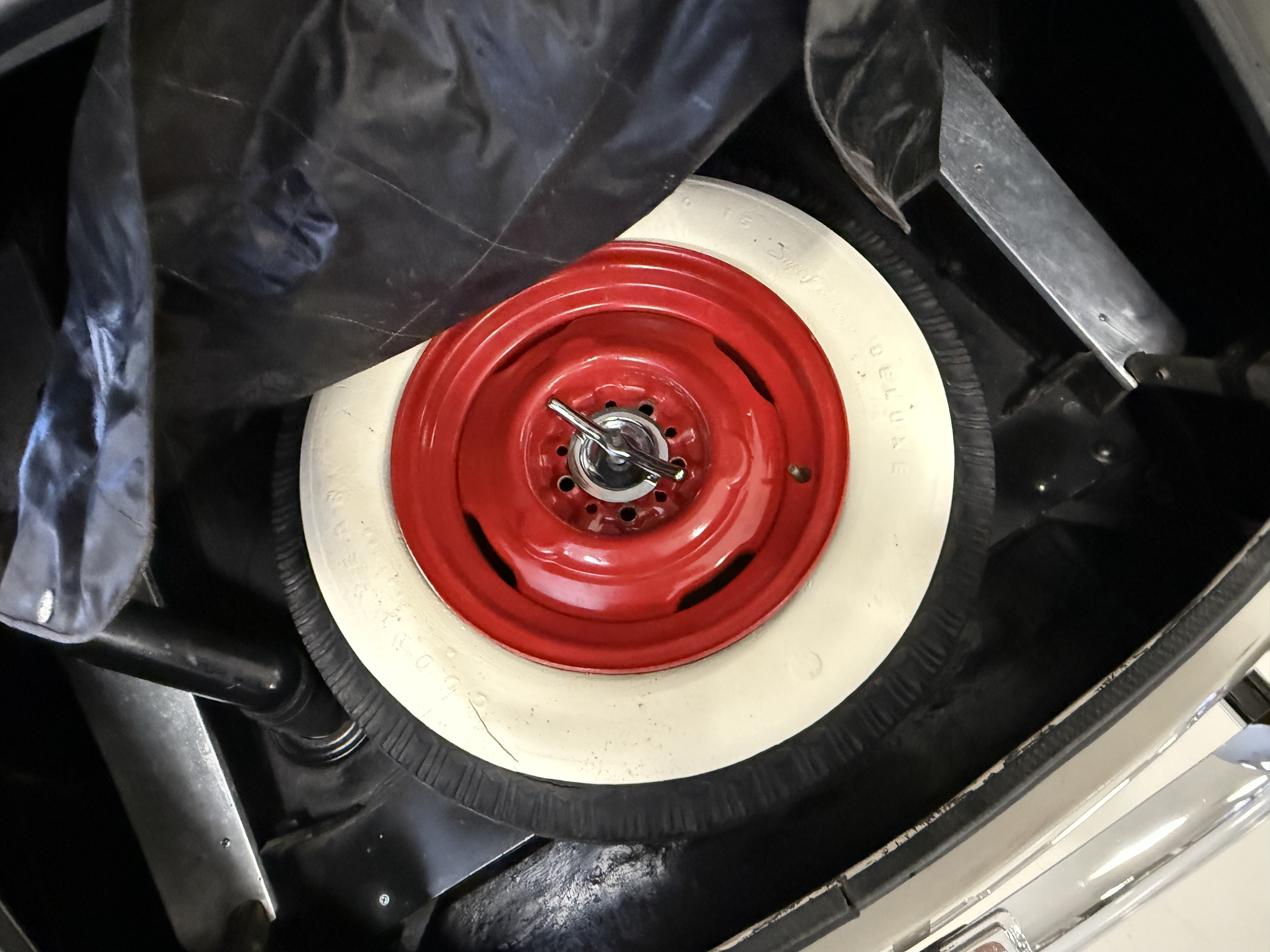 Red-painted 15″ steel wheels wear chrome wire covers, and they are mounted with 215/75 Coker Classic whitewall radial tires that were installed in December 2024. A matching spare wheel with a Goodyear bias-ply tire is stowed in the trunk. The Le Mans rides on a 108″ wheelbase and utilizes a box-section frame, front trailing-arm suspension derived from the Healey Silverstone, and a coil-sprung solid rear axle. Stopping power is provided by four-wheel drum brakes that were overhauled in December 2024 with the installation of replacement wheel cylinders and hoses.