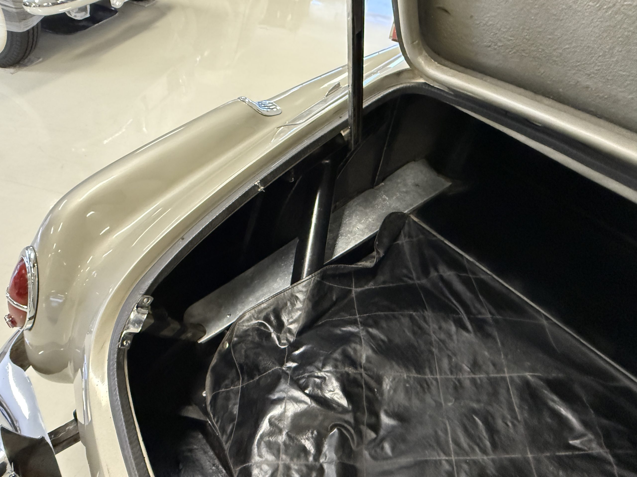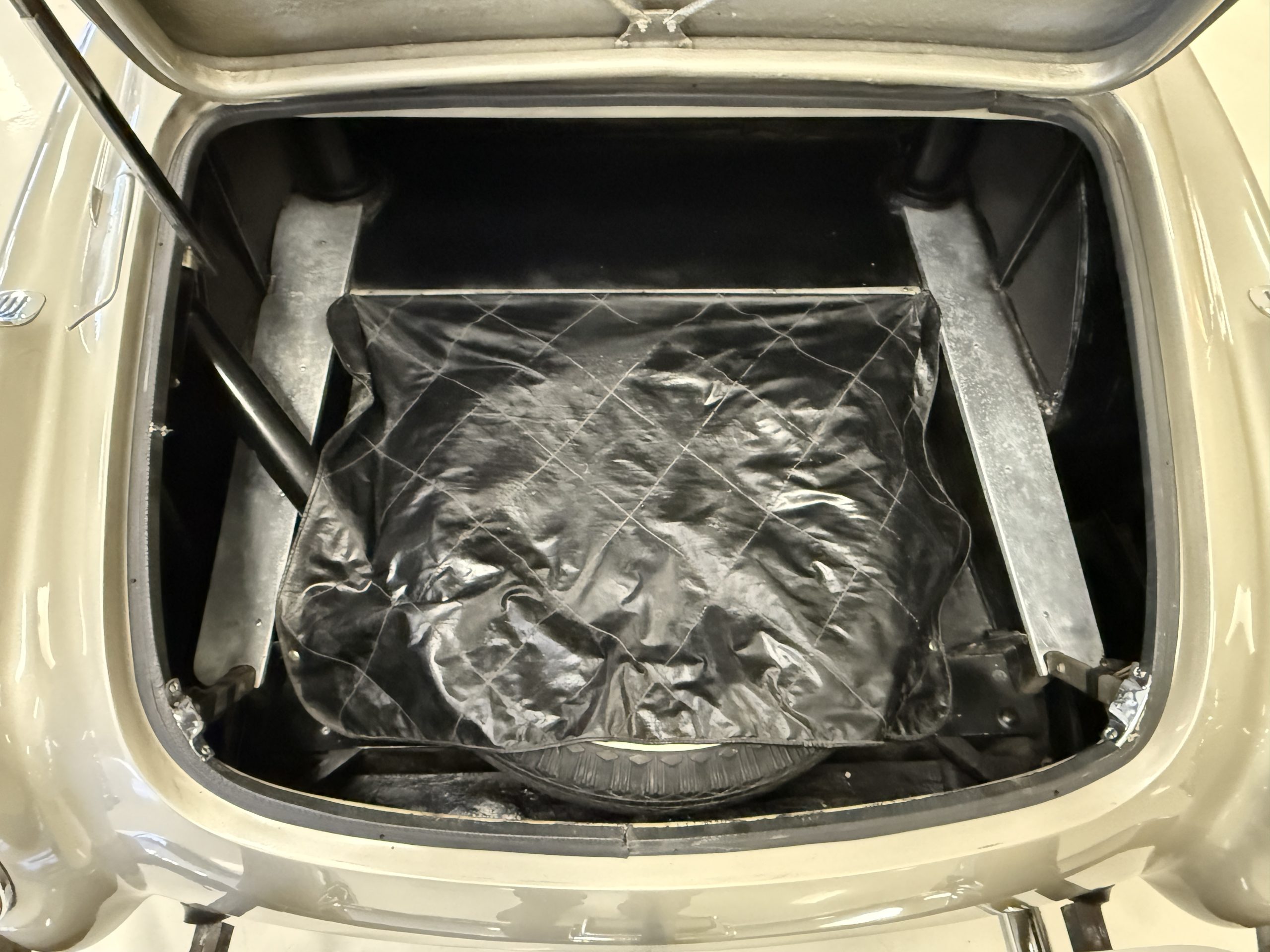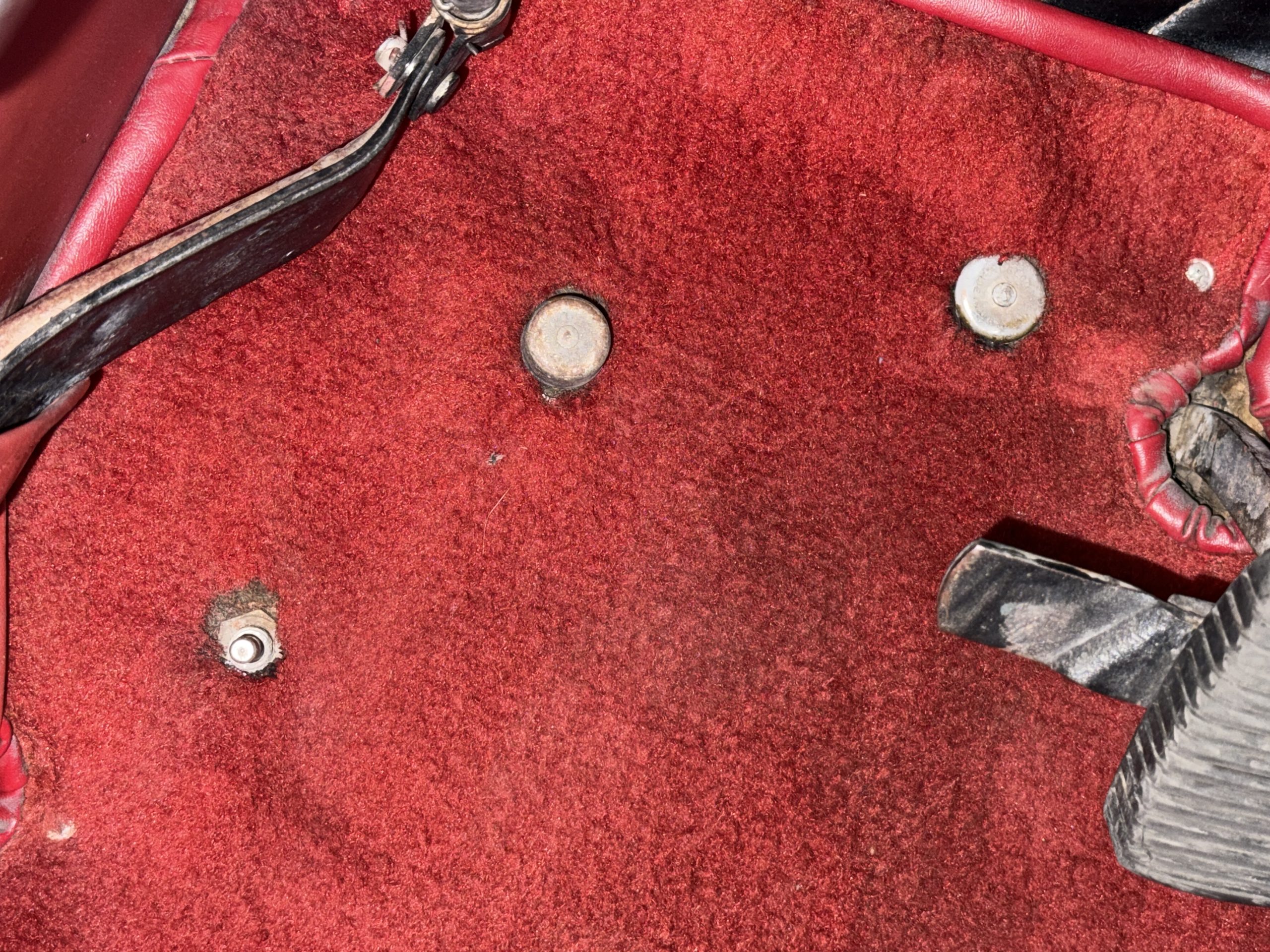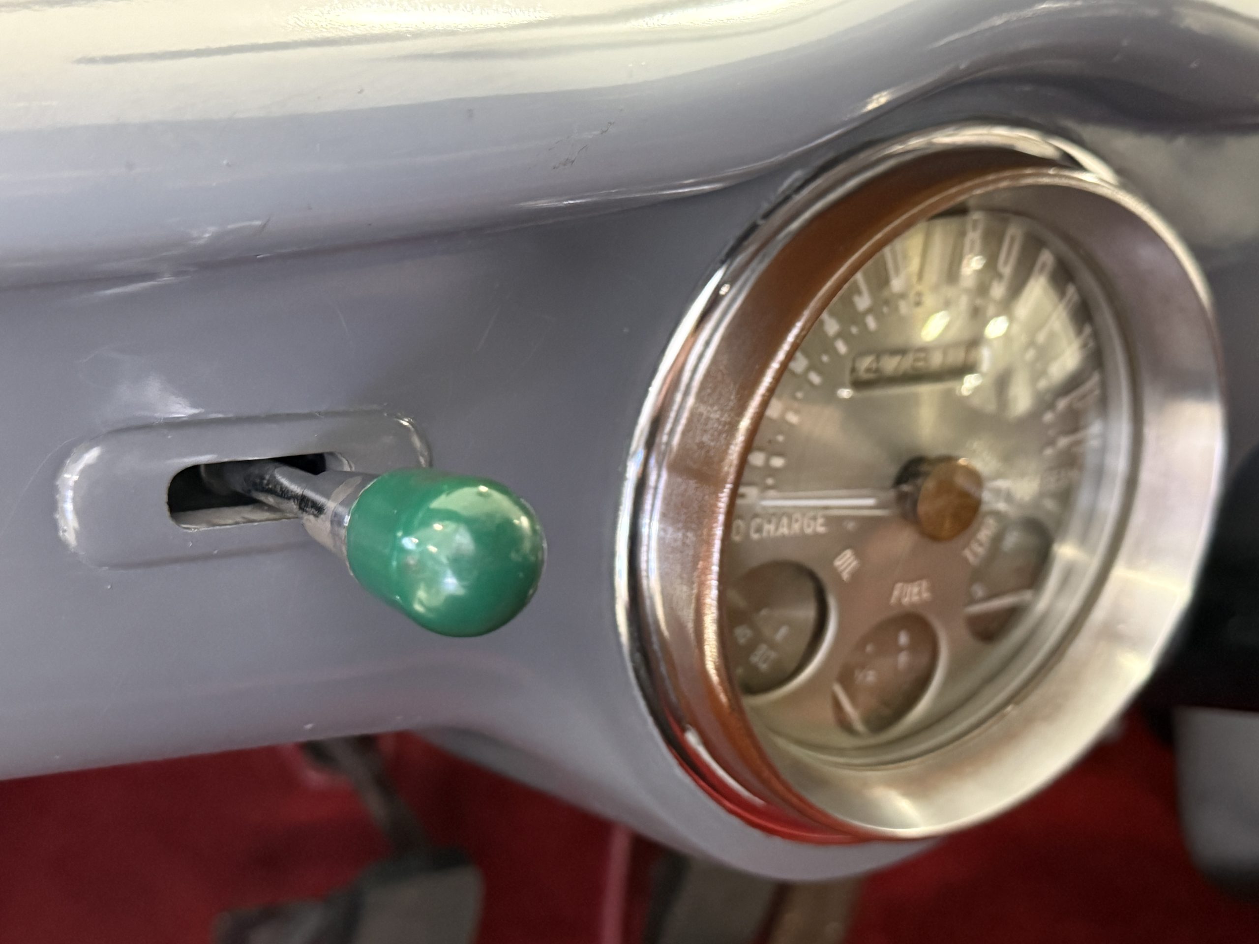 Red-painted 15″ steel wheels wear chrome wire covers, and they are mounted with 215/75 Coker Classic whitewall radial tires that were installed in December 2024. A matching spare wheel with a Goodyear bias-ply tire is stowed in the trunk. The Le Mans rides on a 108″ wheelbase and utilizes a box-section frame, front trailing-arm suspension derived from the Healey Silverstone, and a coil-sprung solid rear axle. Stopping power is provided by four-wheel drum brakes that were overhauled in December 2024 with the installation of replacement wheel cylinders and hoses.
