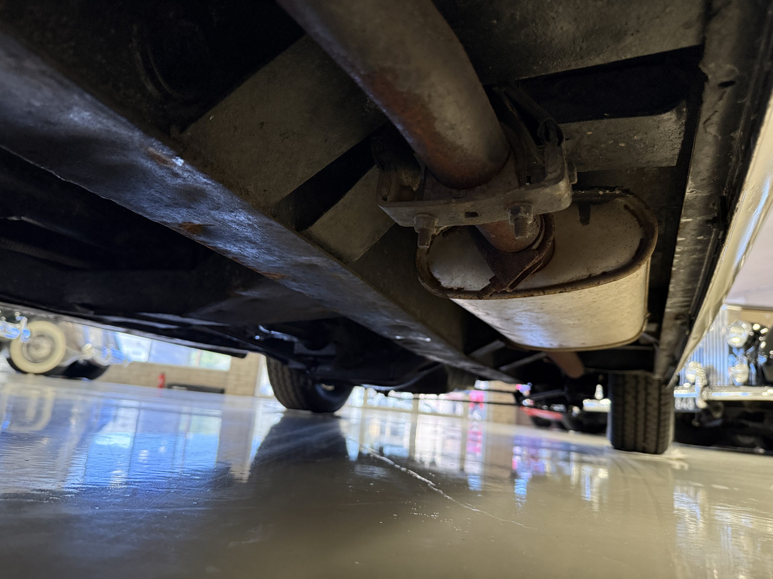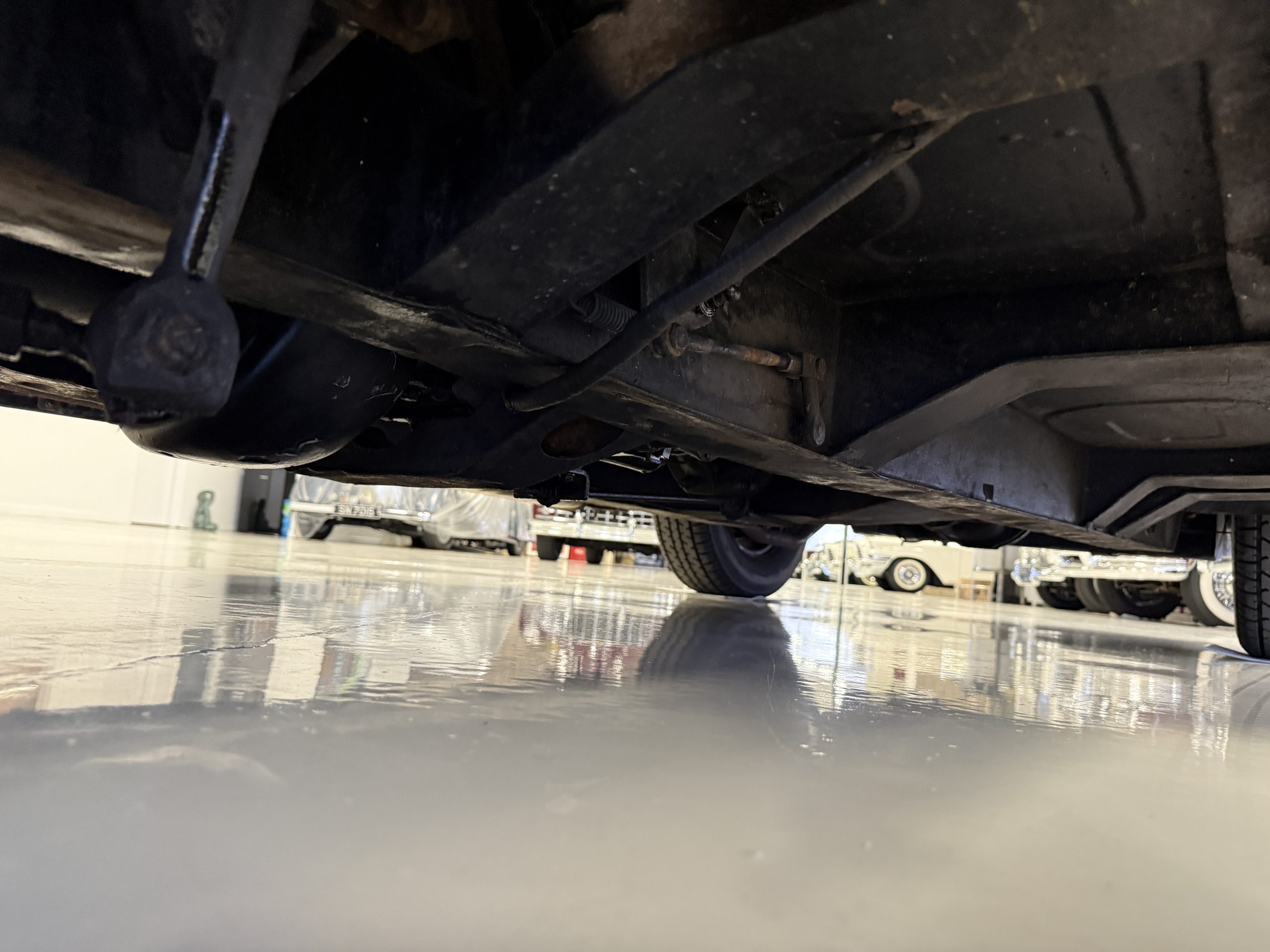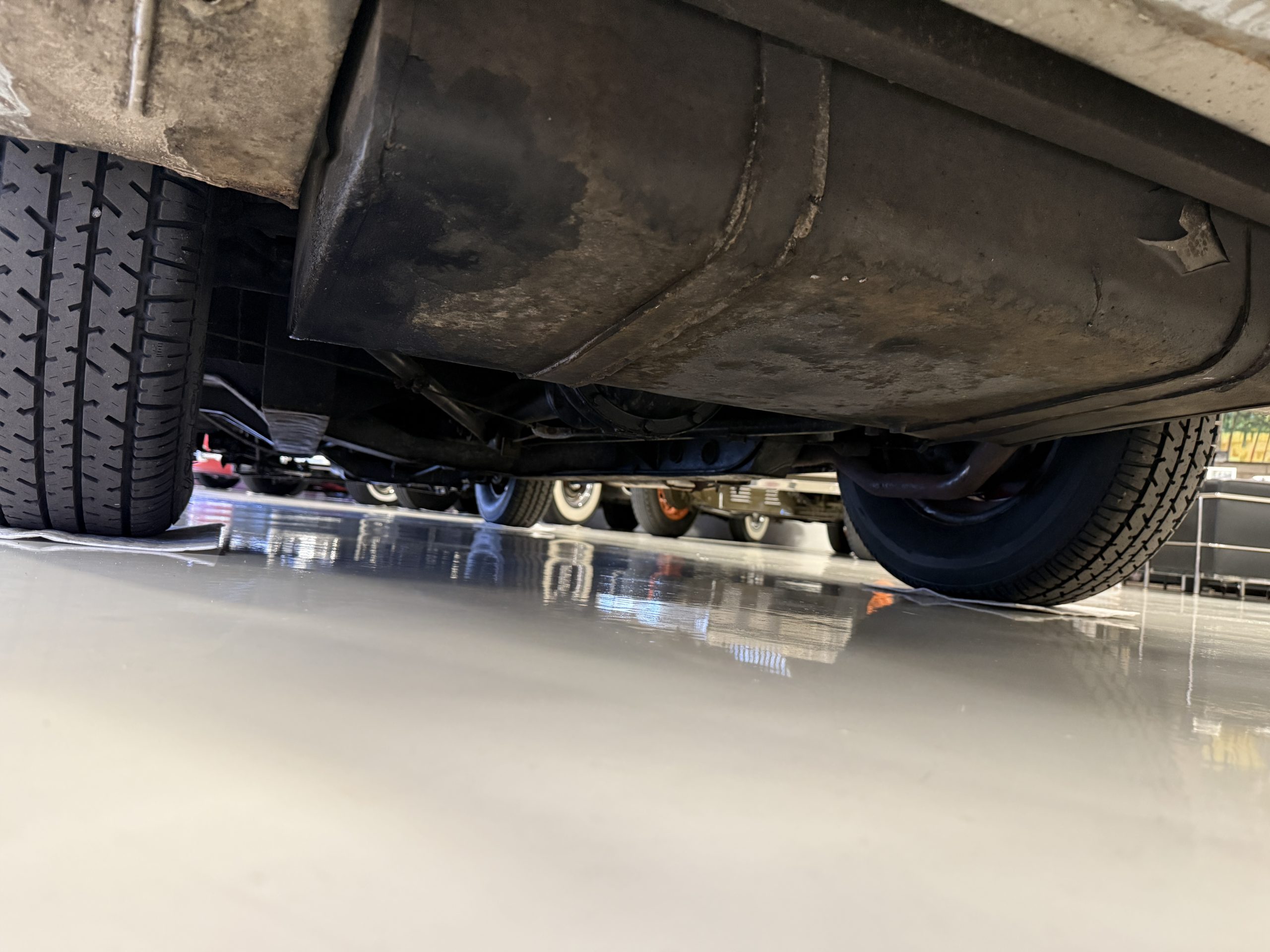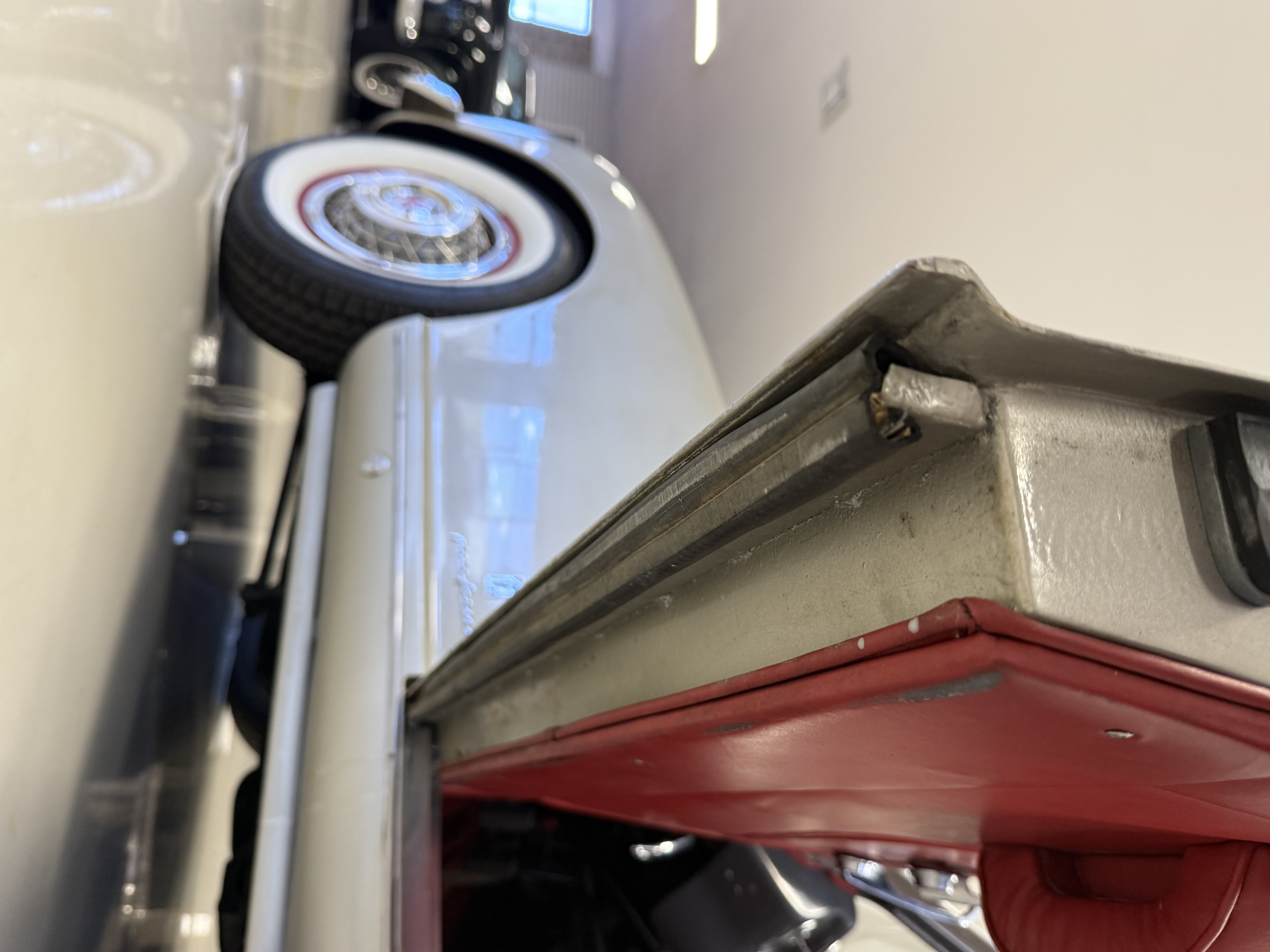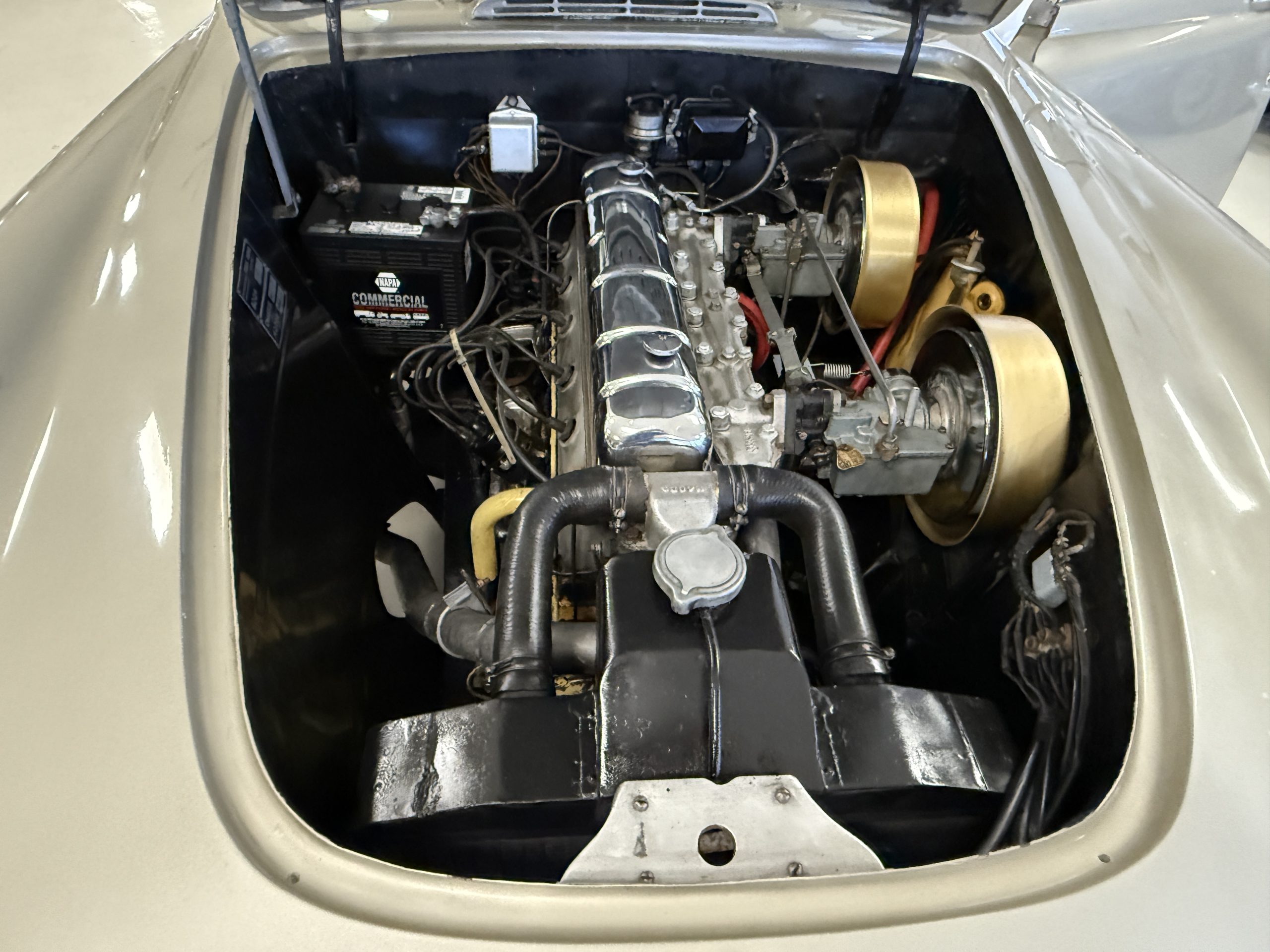 Red-painted 15″ steel wheels wear chrome wire covers, and they are mounted with 215/75 Coker Classic whitewall radial tires that were installed in December 2024. A matching spare wheel with a Goodyear bias-ply tire is stowed in the trunk. The Le Mans rides on a 108″ wheelbase and utilizes a box-section frame, front trailing-arm suspension derived from the Healey Silverstone, and a coil-sprung solid rear axle. Stopping power is provided by four-wheel drum brakes that were overhauled in December 2024 with the installation of replacement wheel cylinders and hoses.