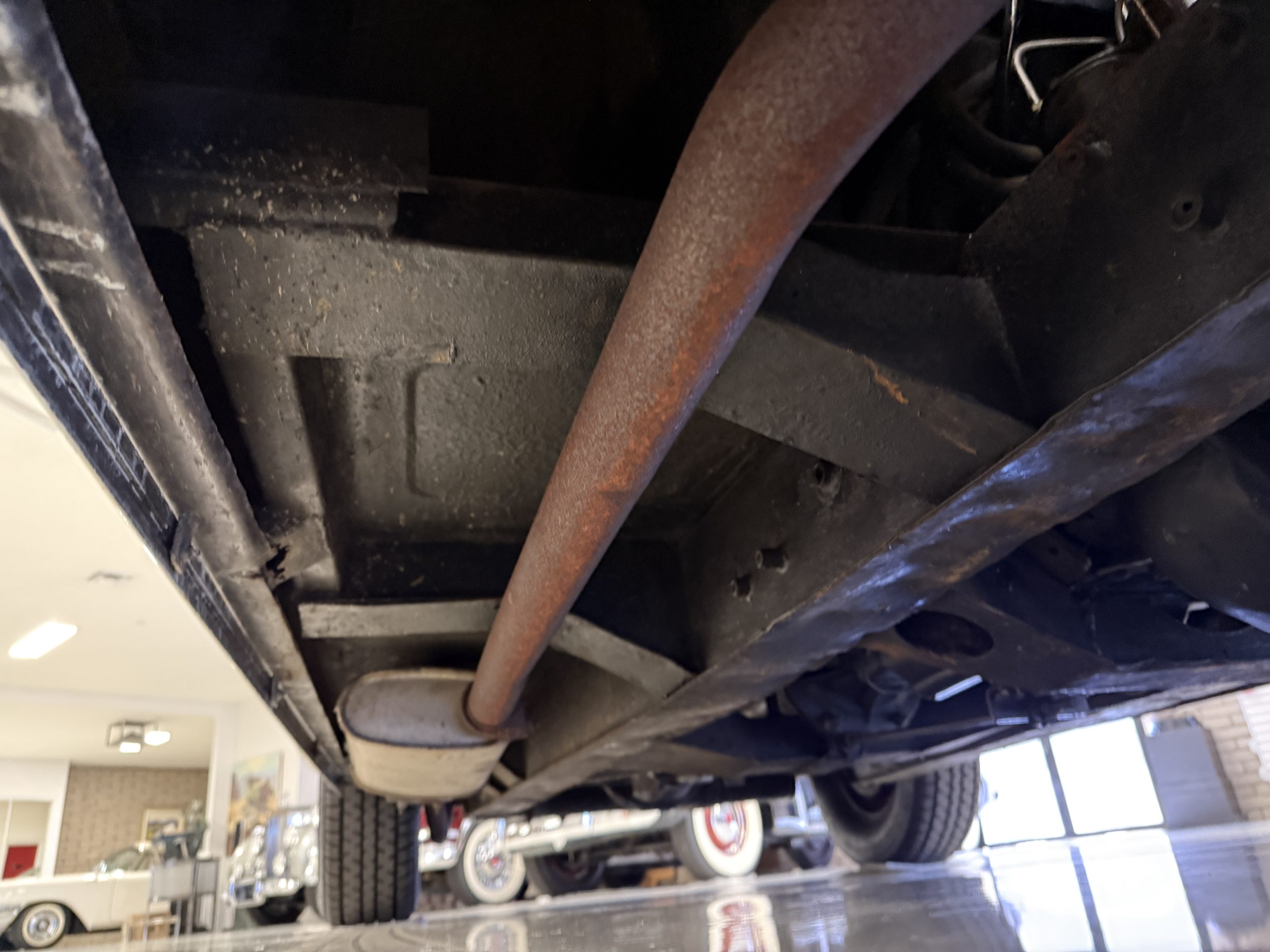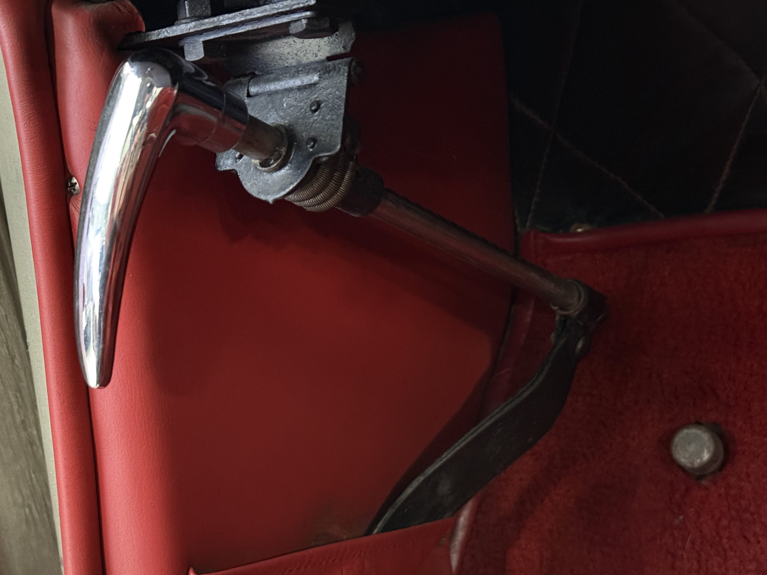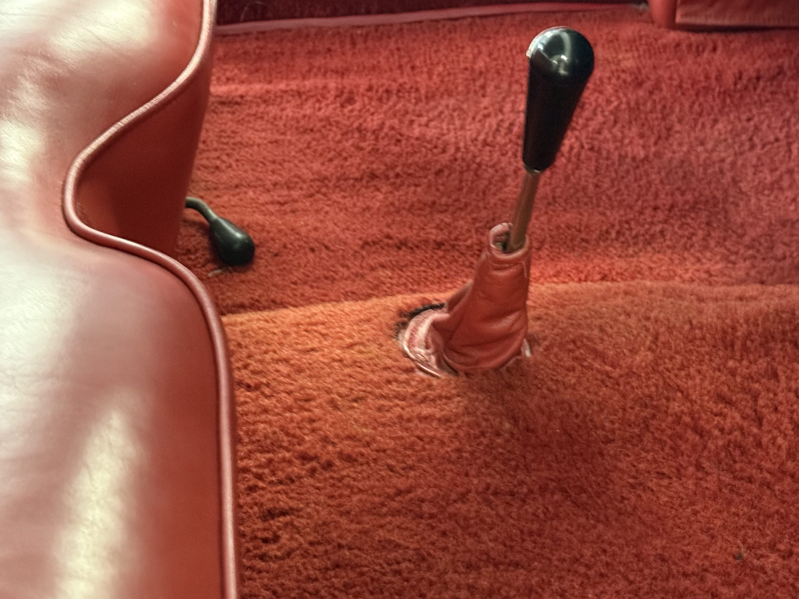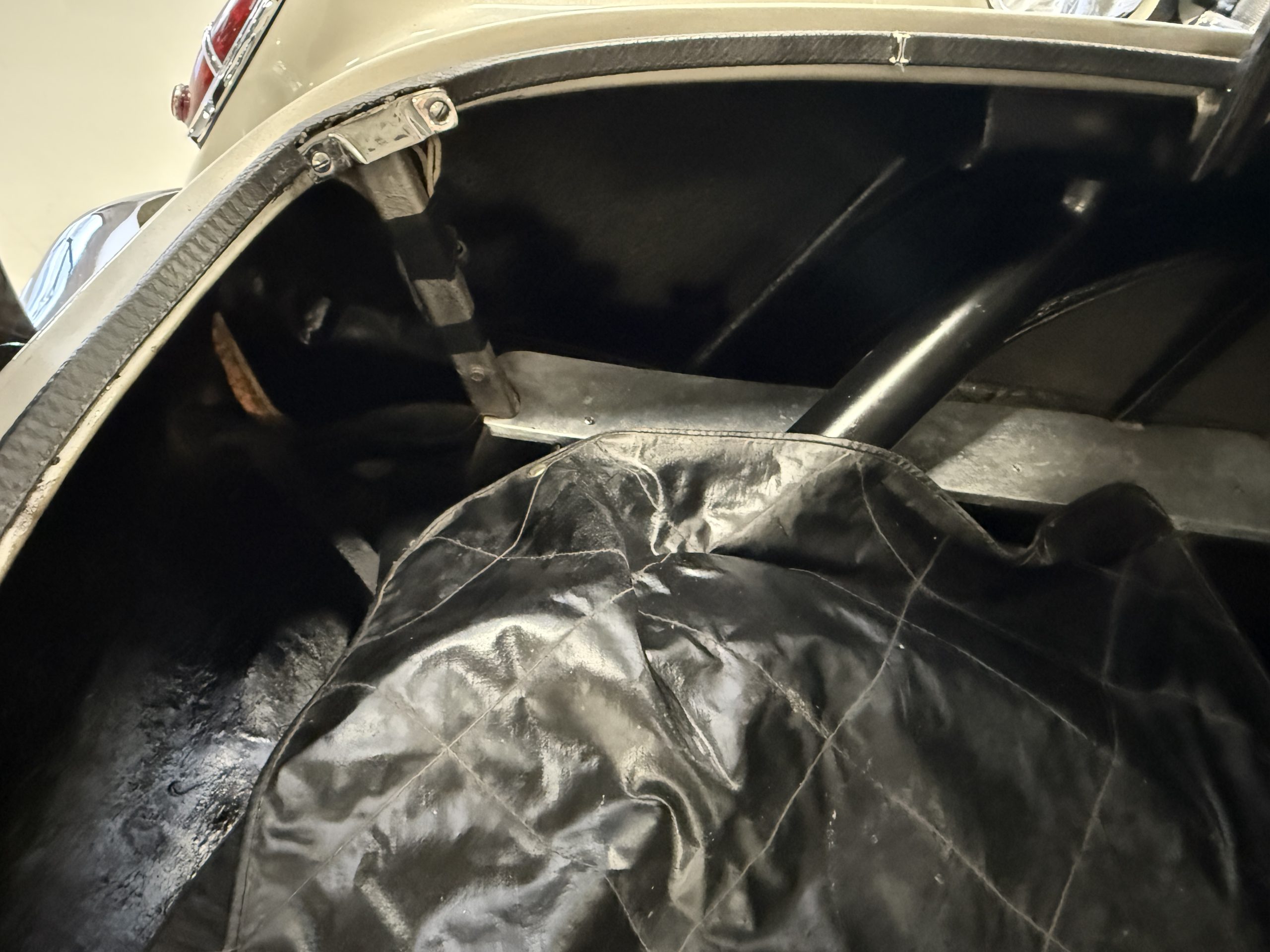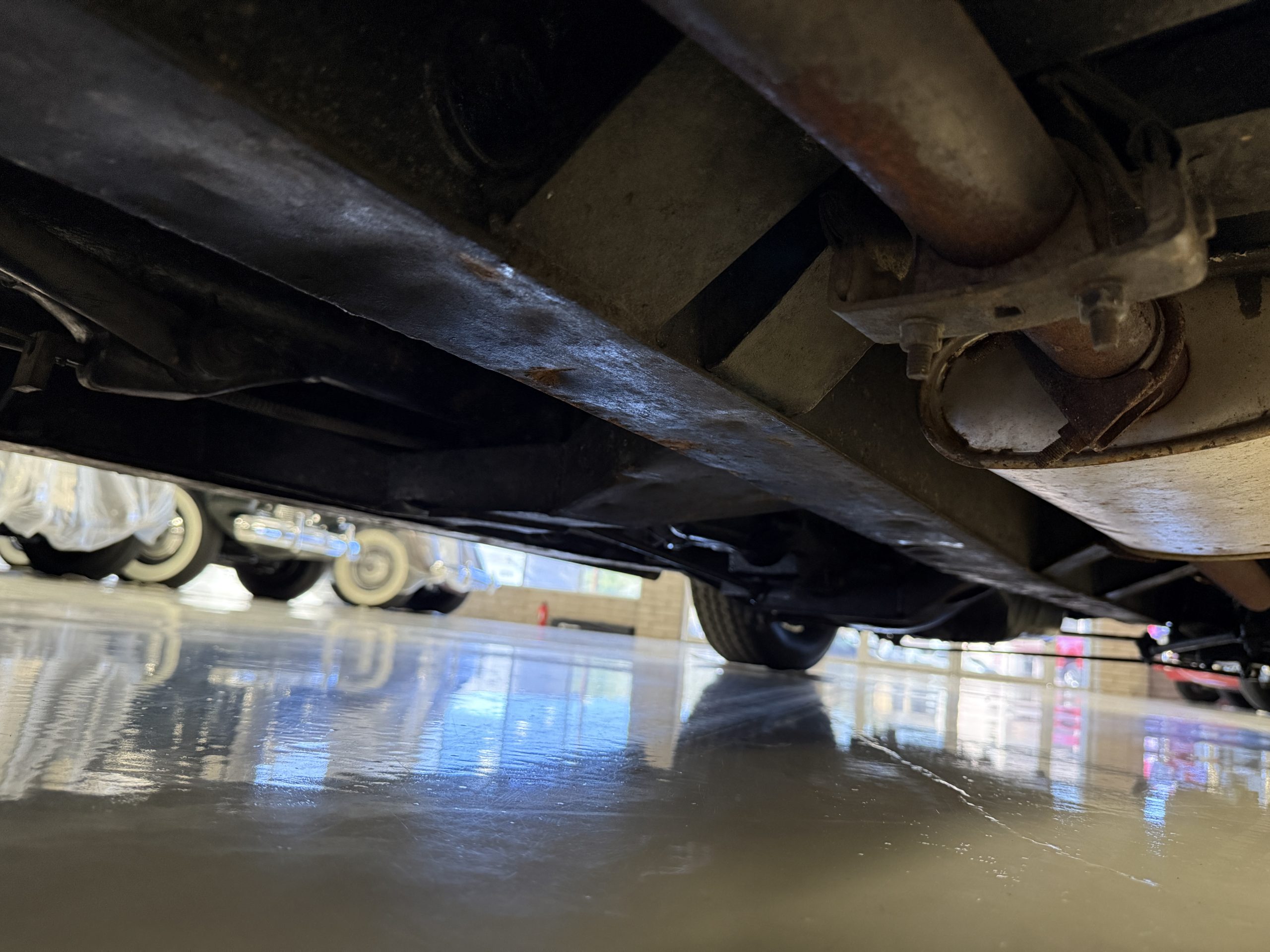 Red-painted 15″ steel wheels wear chrome wire covers, and they are mounted with 215/75 Coker Classic whitewall radial tires that were installed in December 2024. A matching spare wheel with a Goodyear bias-ply tire is stowed in the trunk. The Le Mans rides on a 108″ wheelbase and utilizes a box-section frame, front trailing-arm suspension derived from the Healey Silverstone, and a coil-sprung solid rear axle. Stopping power is provided by four-wheel drum brakes that were overhauled in December 2024 with the installation of replacement wheel cylinders and hoses.