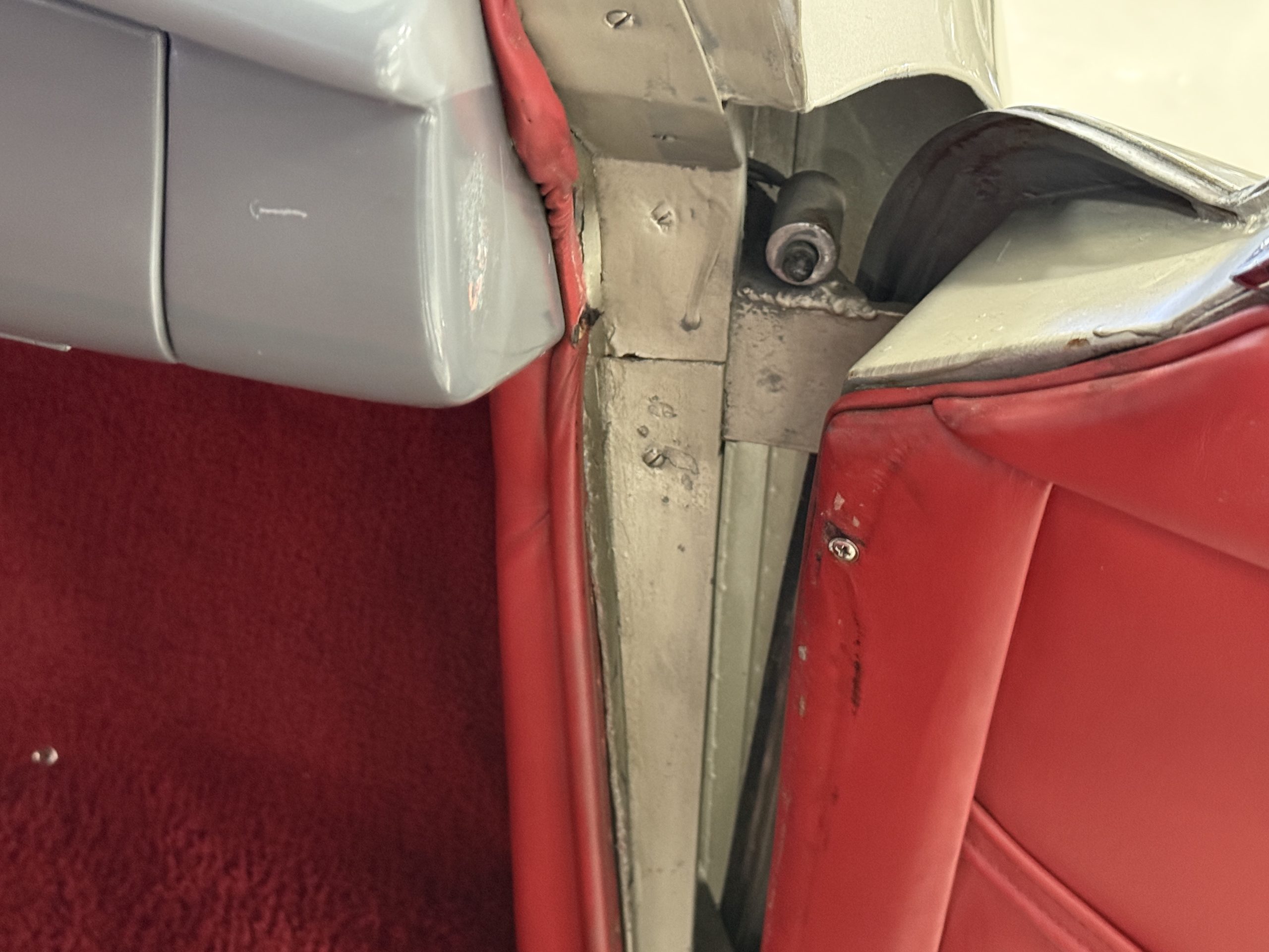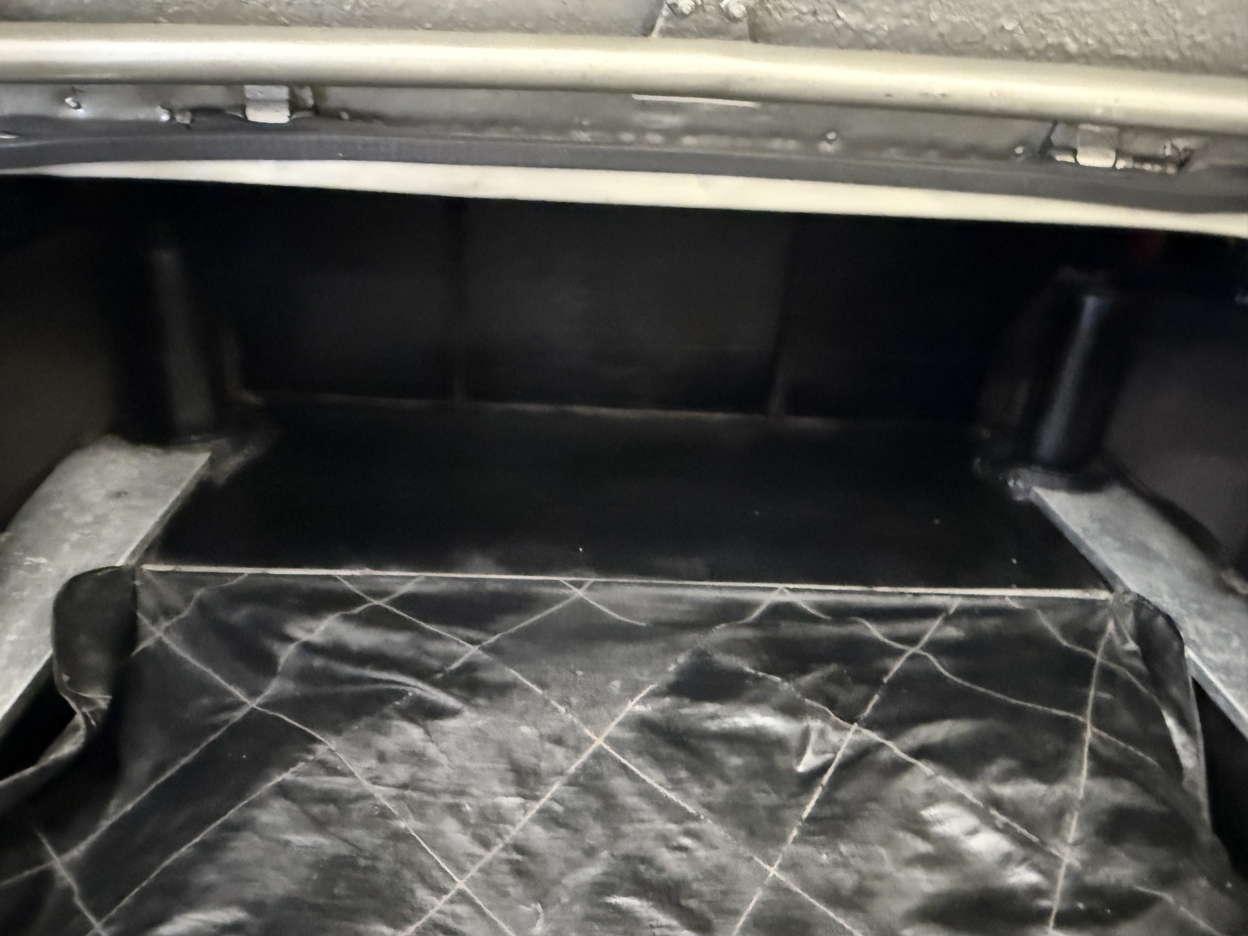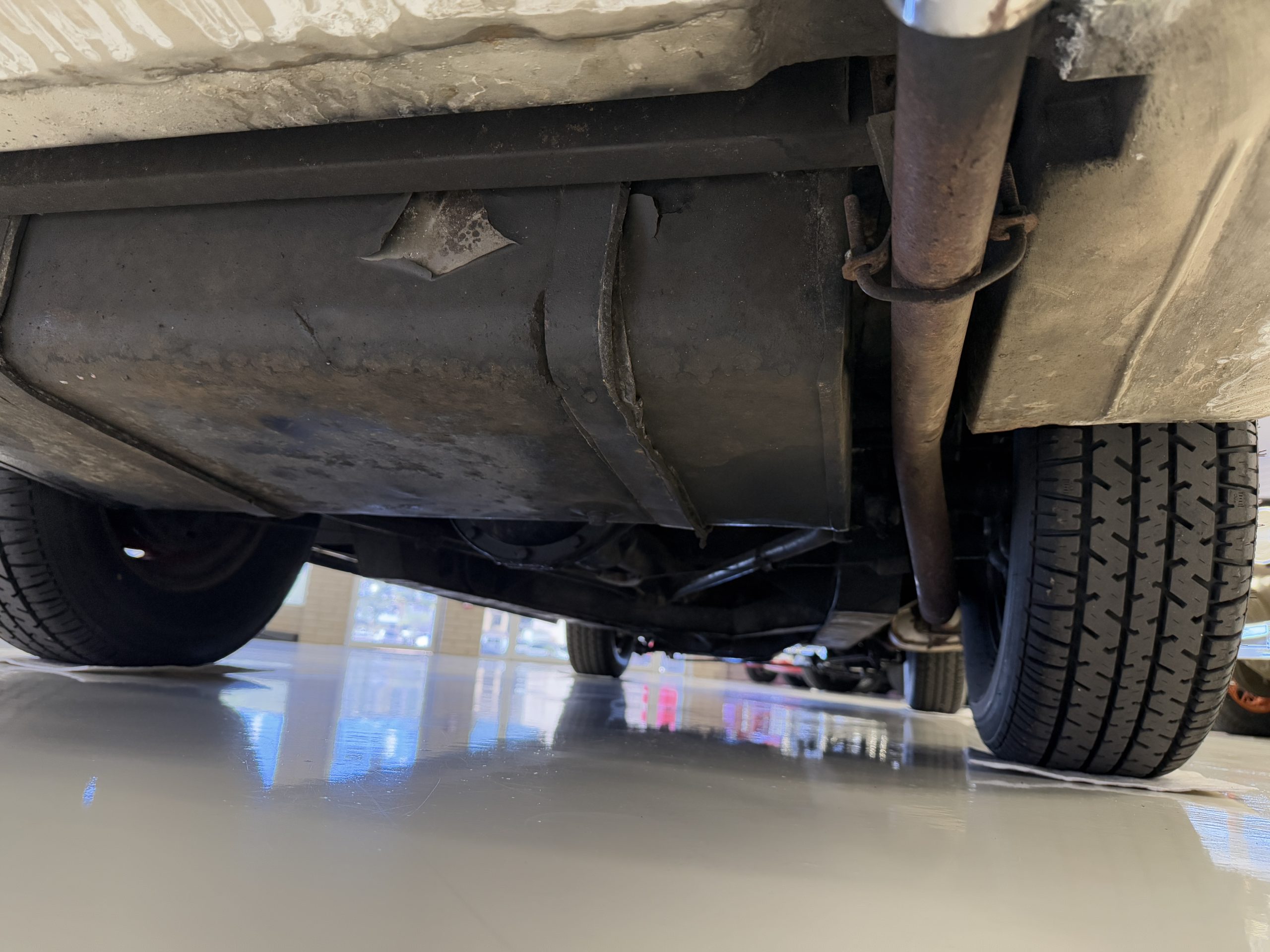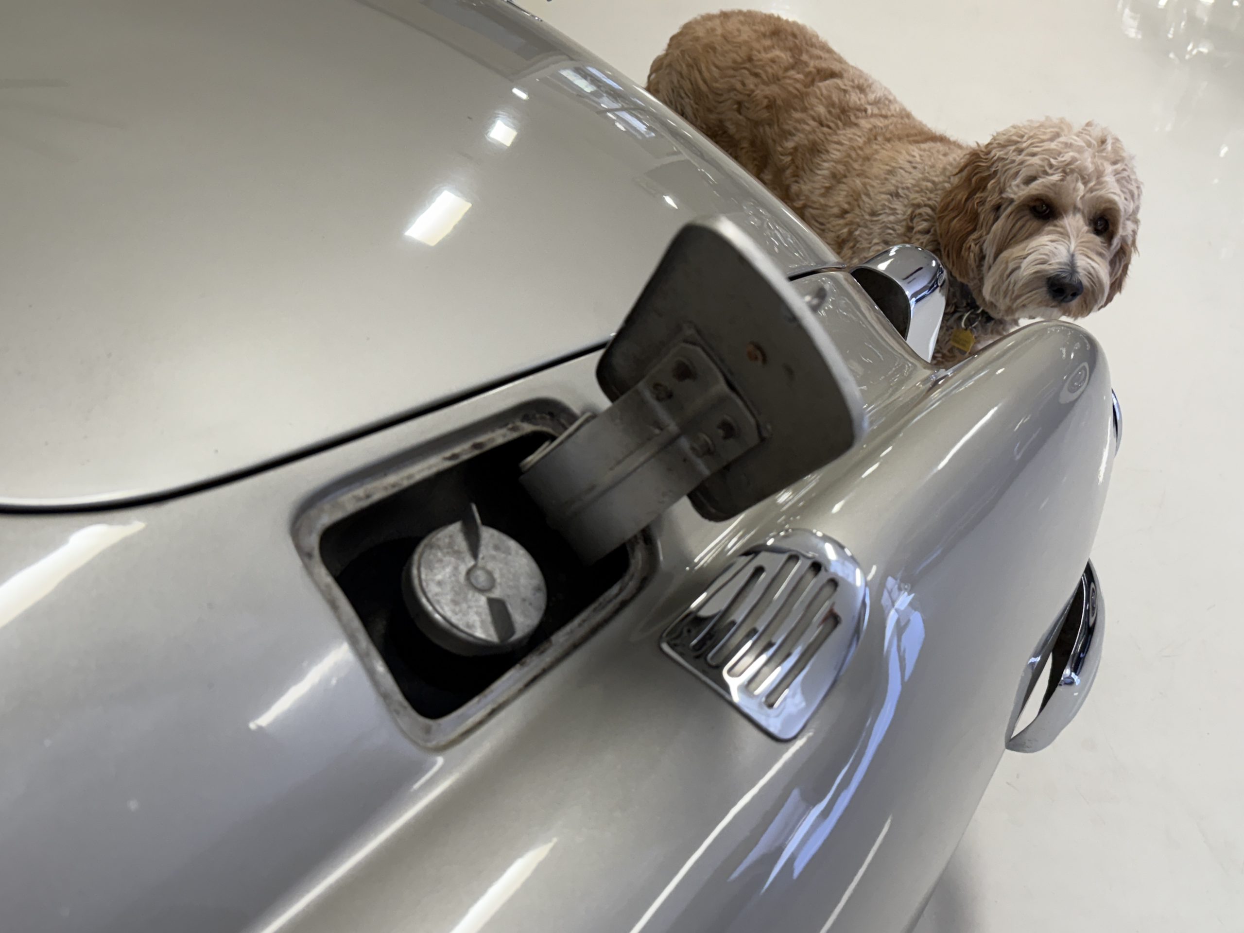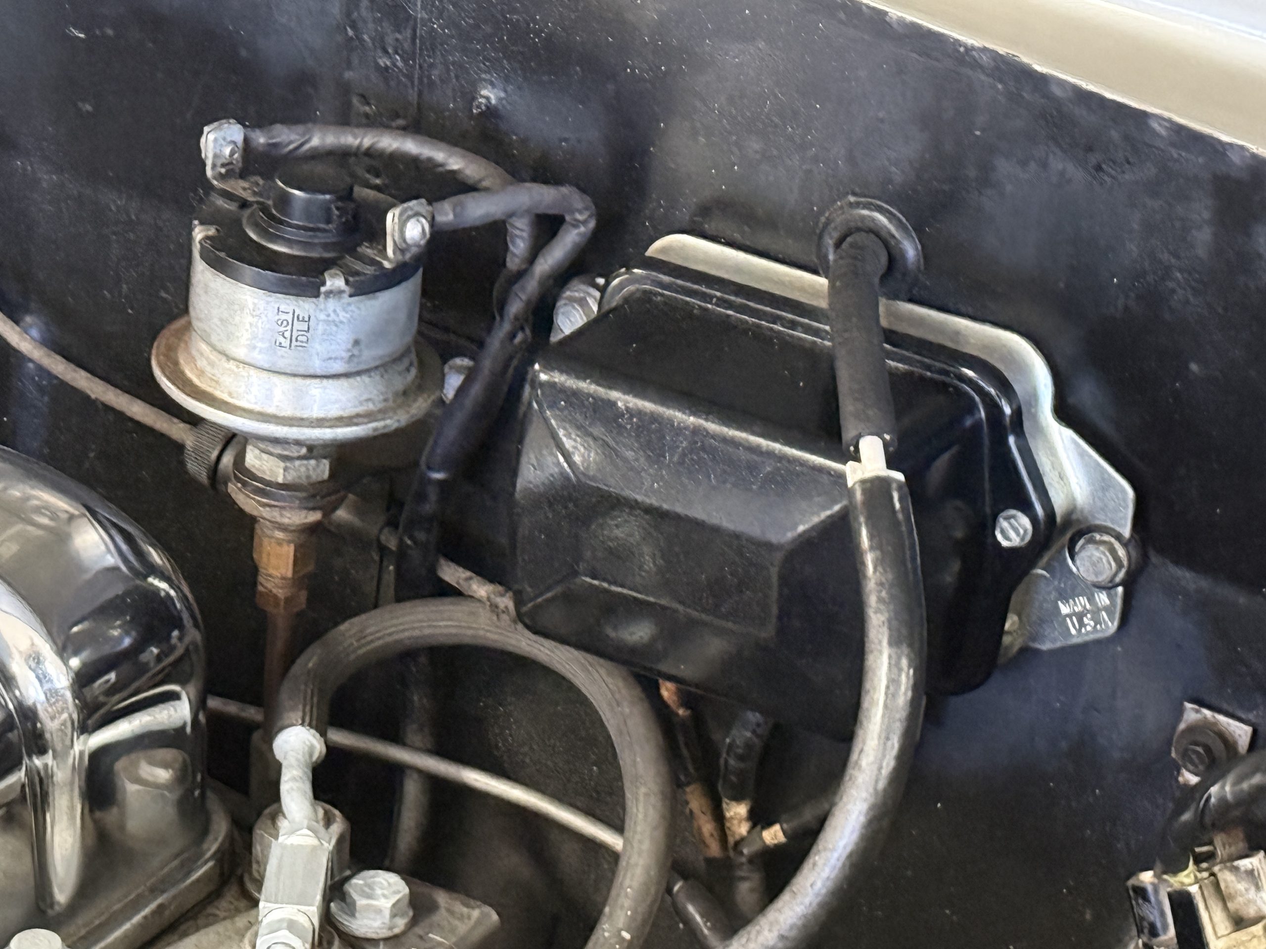 Red-painted 15″ steel wheels wear chrome wire covers, and they are mounted with 215/75 Coker Classic whitewall radial tires that were installed in December 2024. A matching spare wheel with a Goodyear bias-ply tire is stowed in the trunk. The Le Mans rides on a 108″ wheelbase and utilizes a box-section frame, front trailing-arm suspension derived from the Healey Silverstone, and a coil-sprung solid rear axle. Stopping power is provided by four-wheel drum brakes that were overhauled in December 2024 with the installation of replacement wheel cylinders and hoses.