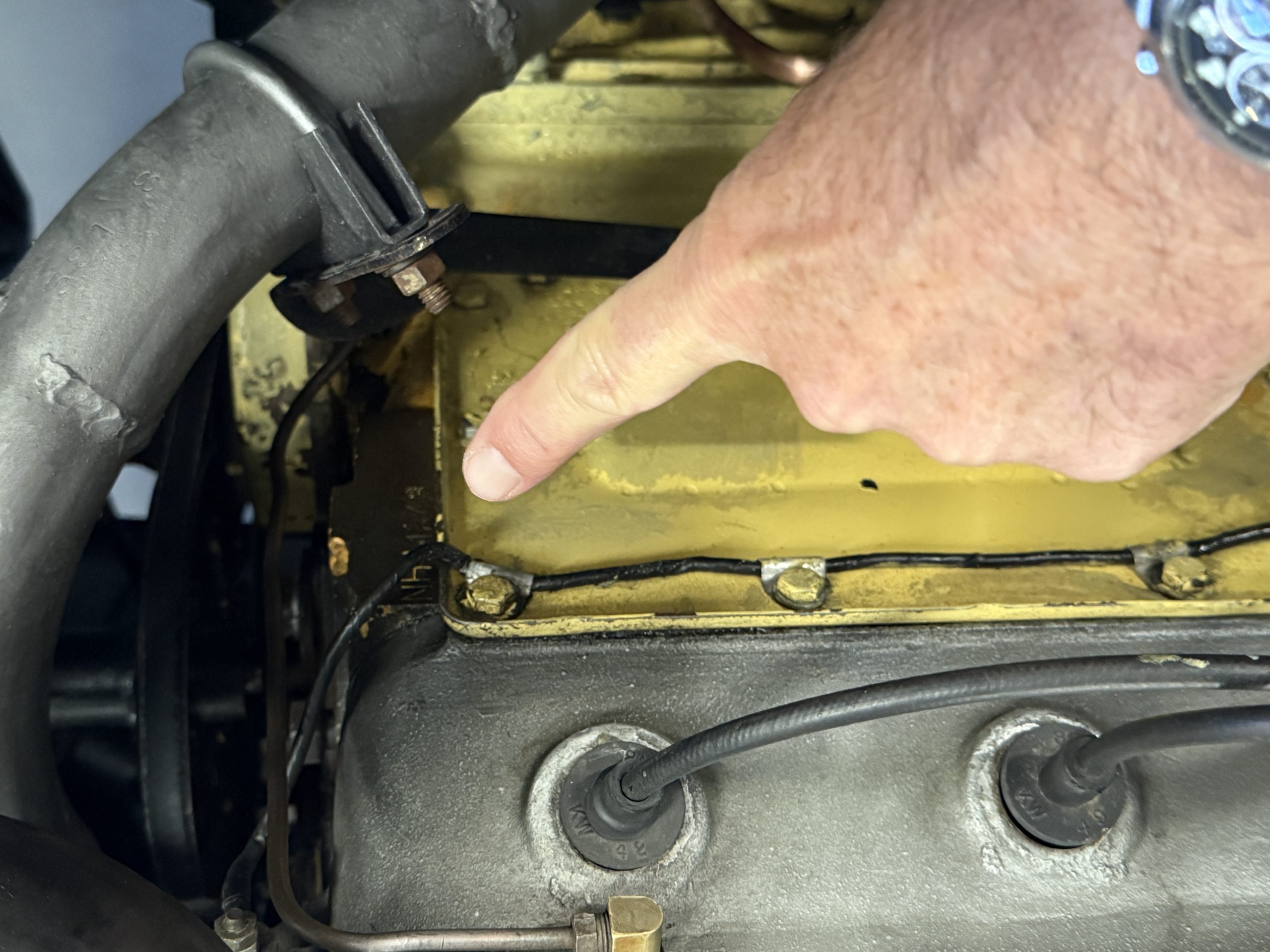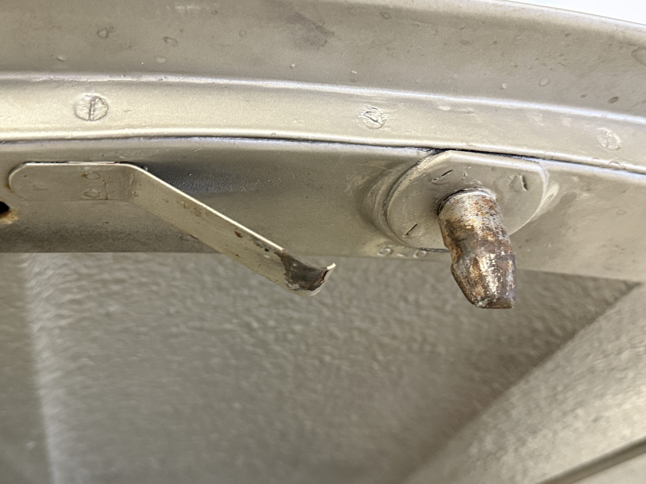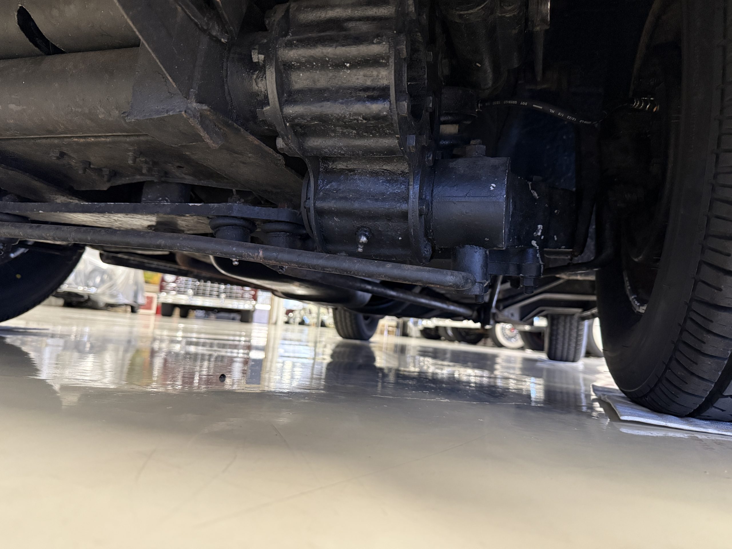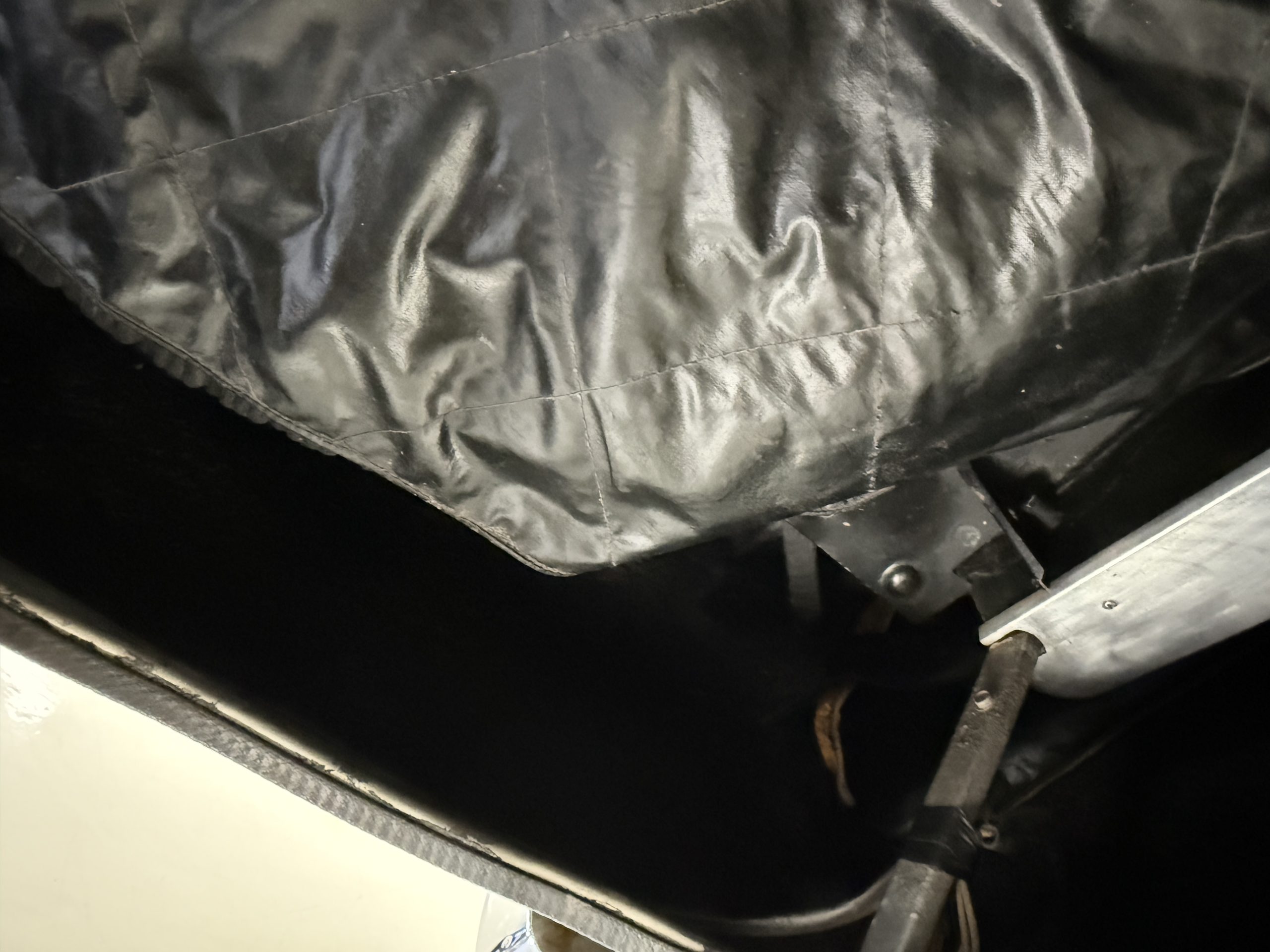 Red-painted 15″ steel wheels wear chrome wire covers, and they are mounted with 215/75 Coker Classic whitewall radial tires that were installed in December 2024. A matching spare wheel with a Goodyear bias-ply tire is stowed in the trunk. The Le Mans rides on a 108″ wheelbase and utilizes a box-section frame, front trailing-arm suspension derived from the Healey Silverstone, and a coil-sprung solid rear axle. Stopping power is provided by four-wheel drum brakes that were overhauled in December 2024 with the installation of replacement wheel cylinders and hoses.