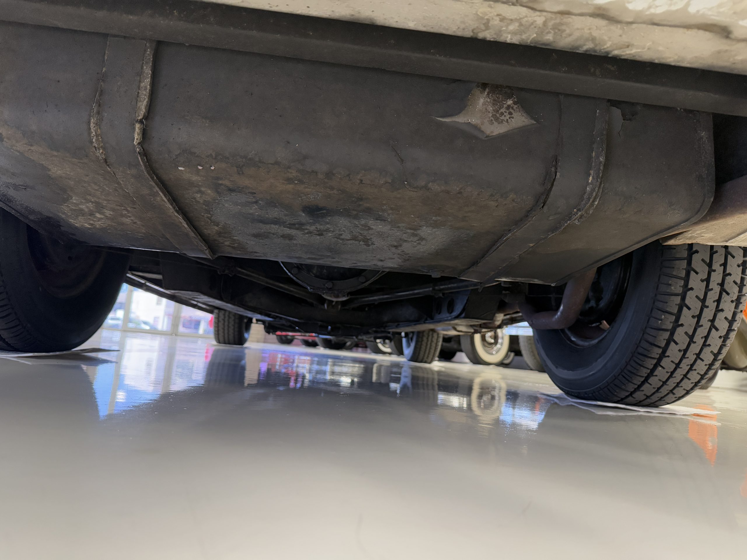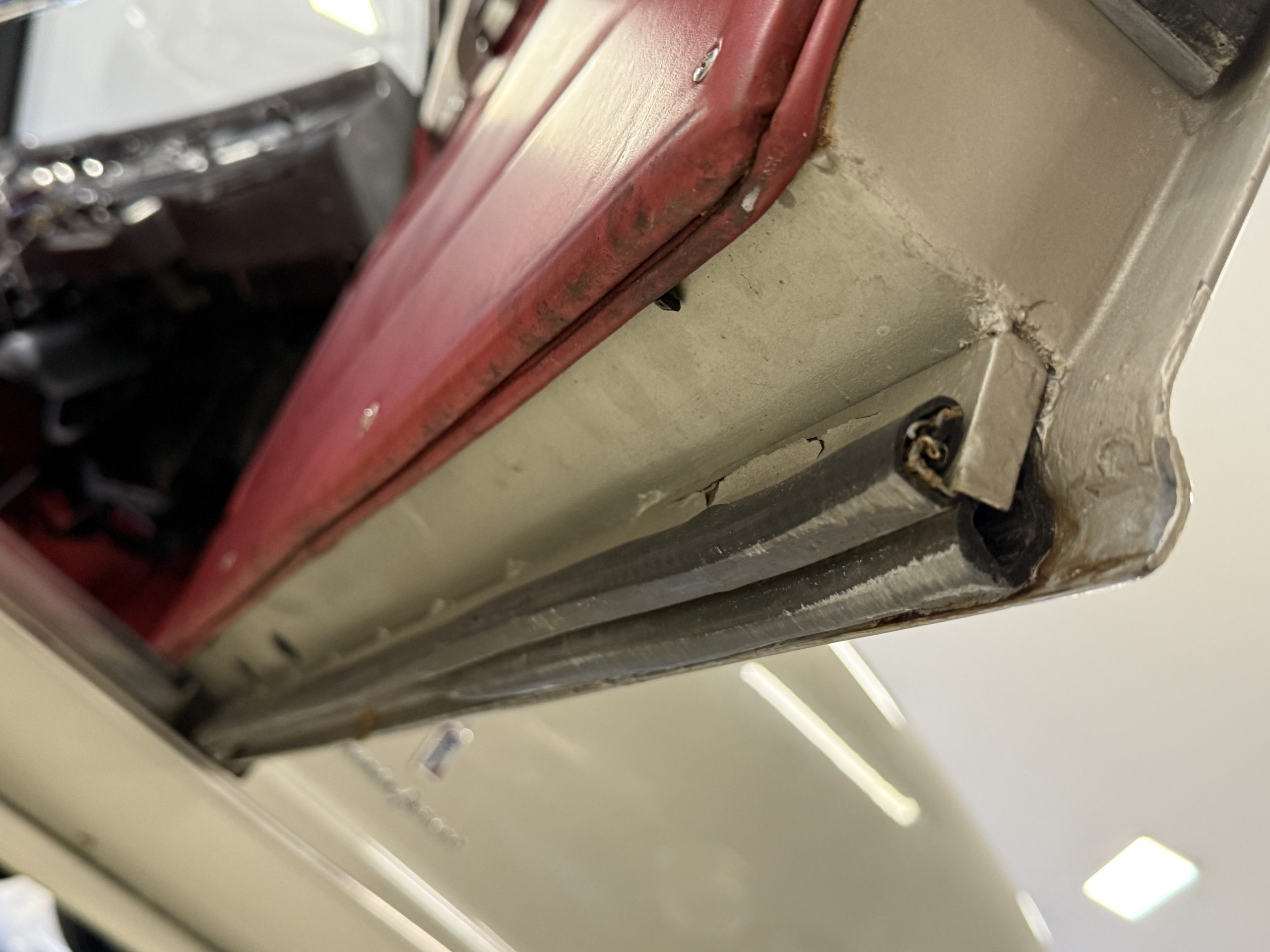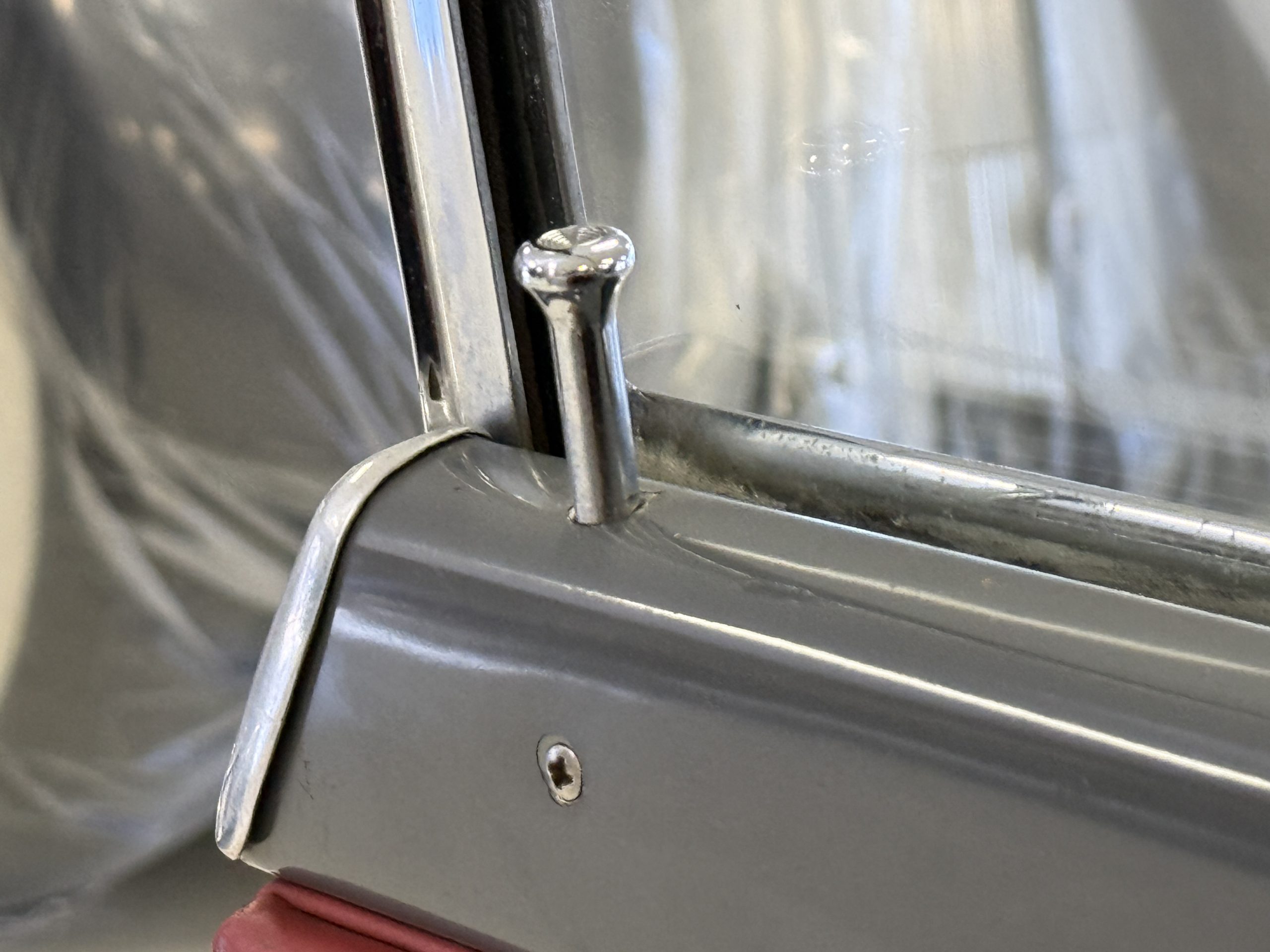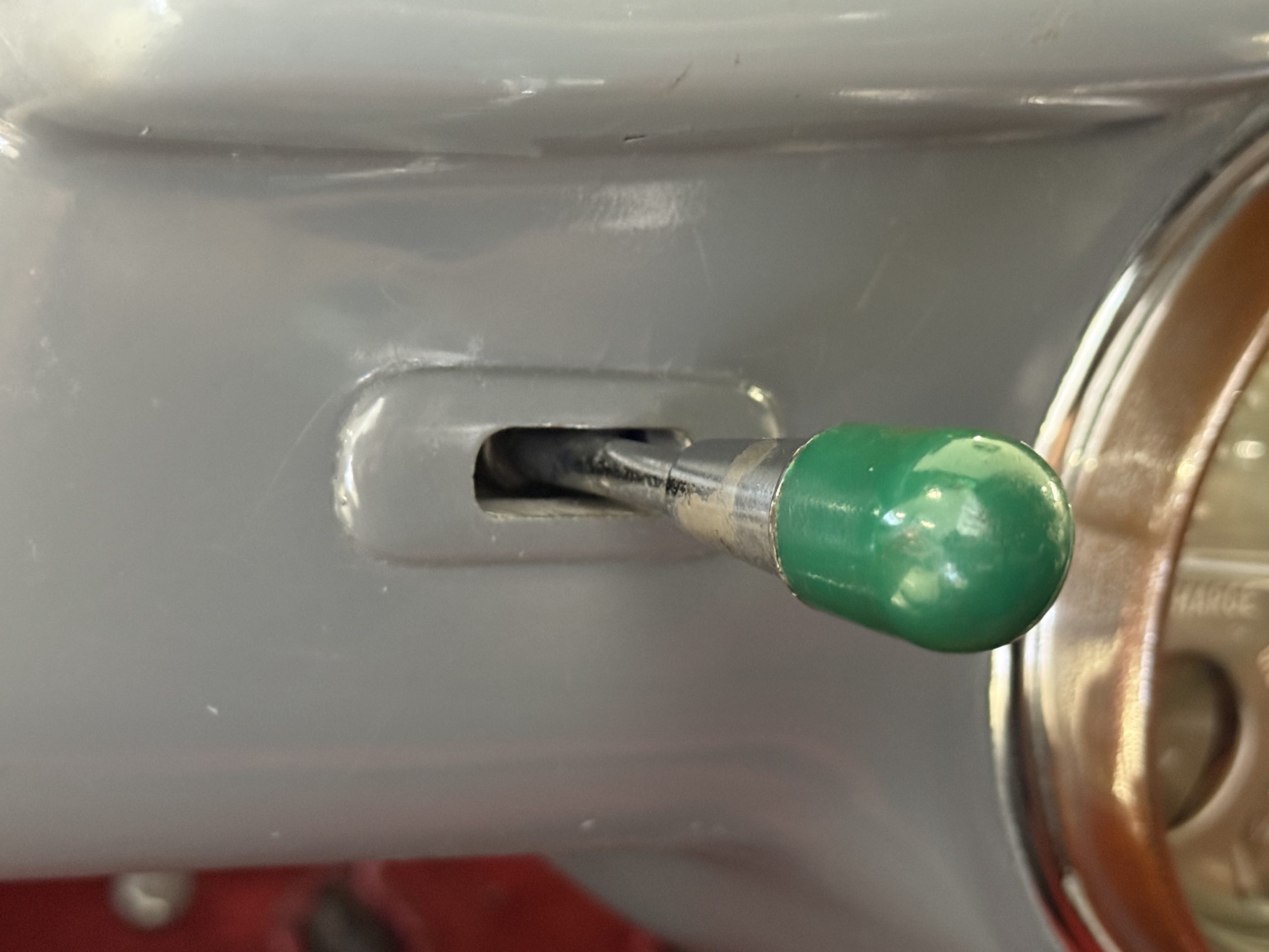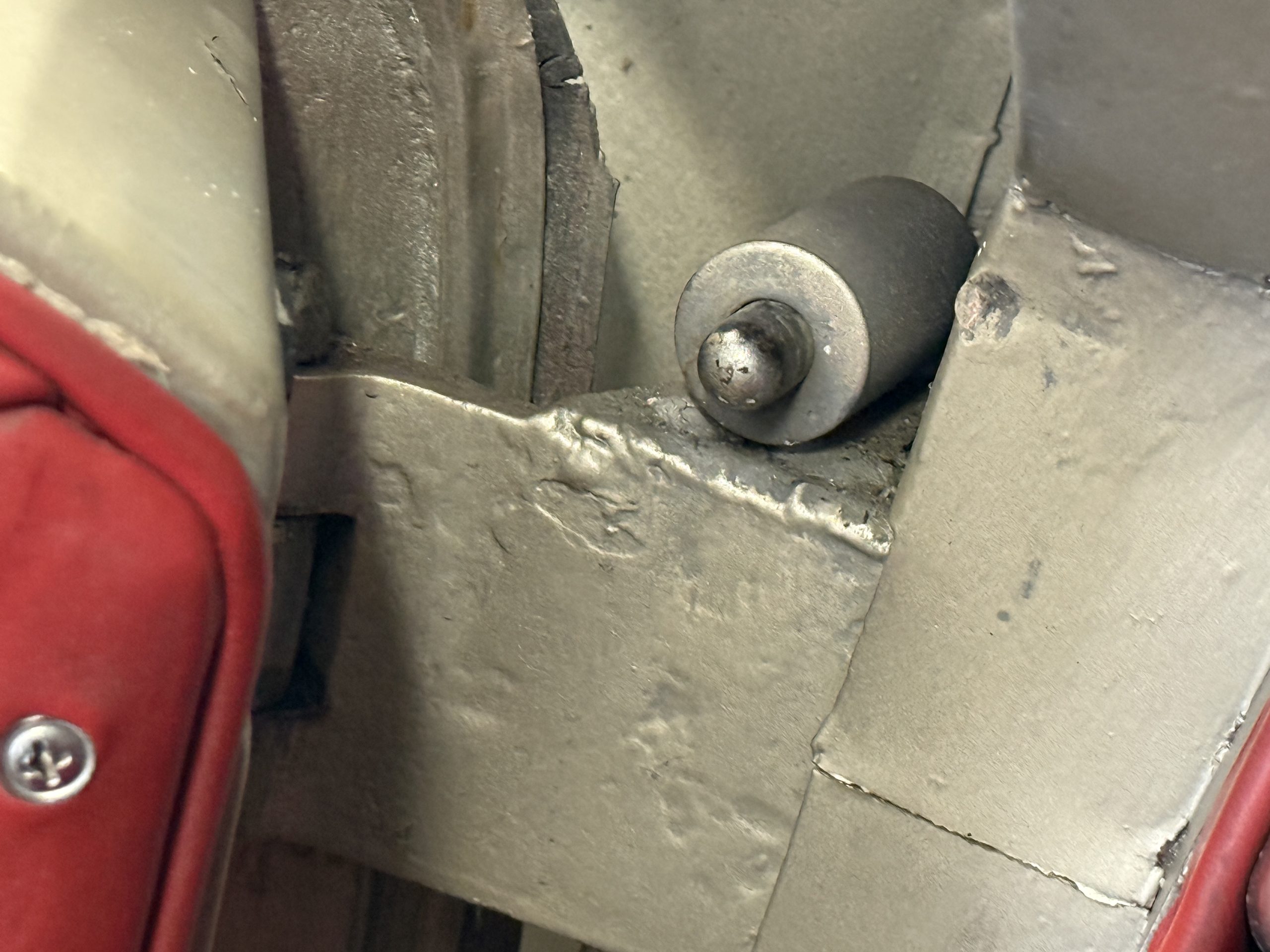 Red-painted 15″ steel wheels wear chrome wire covers, and they are mounted with 215/75 Coker Classic whitewall radial tires that were installed in December 2024. A matching spare wheel with a Goodyear bias-ply tire is stowed in the trunk. The Le Mans rides on a 108″ wheelbase and utilizes a box-section frame, front trailing-arm suspension derived from the Healey Silverstone, and a coil-sprung solid rear axle. Stopping power is provided by four-wheel drum brakes that were overhauled in December 2024 with the installation of replacement wheel cylinders and hoses.