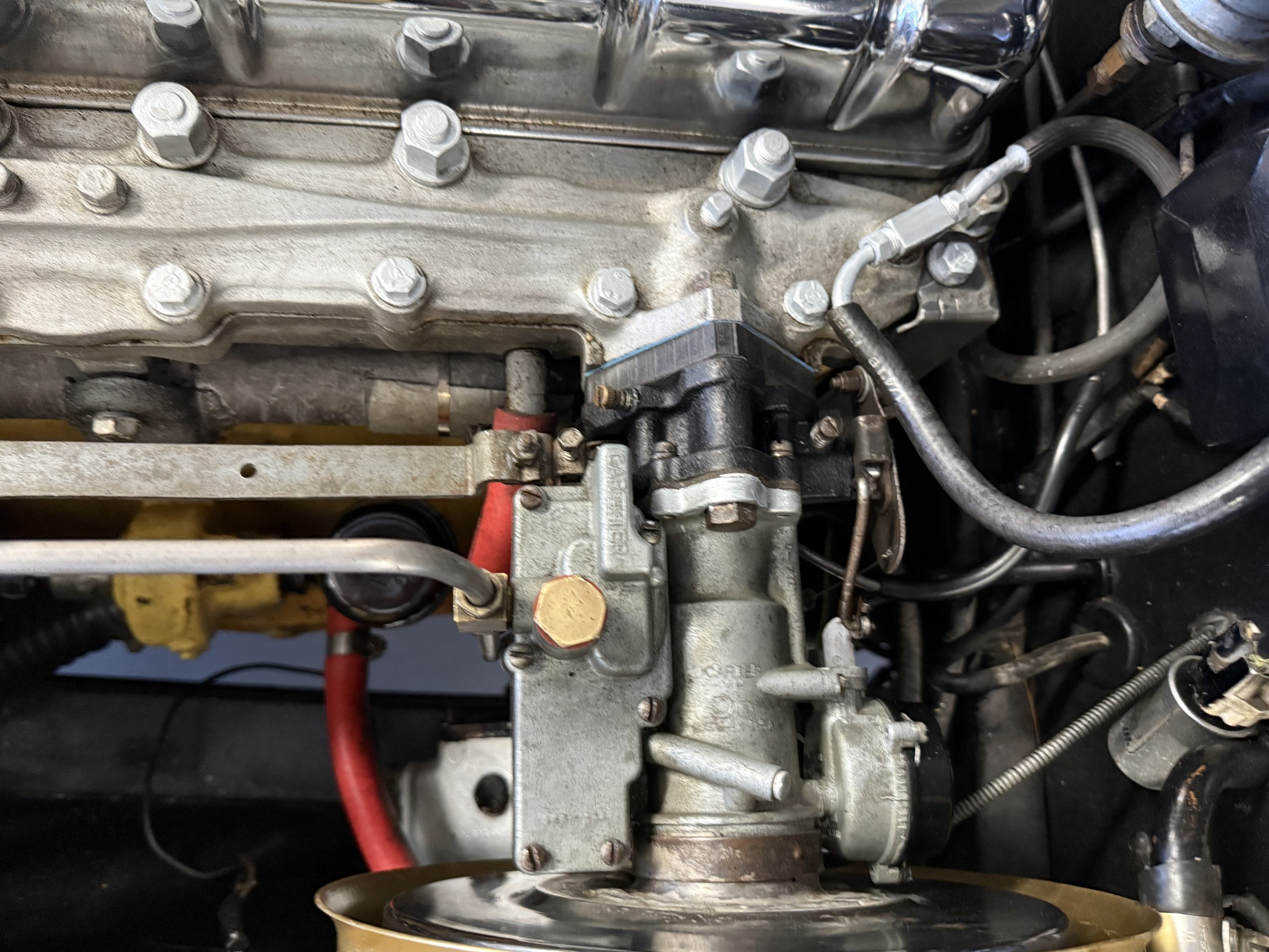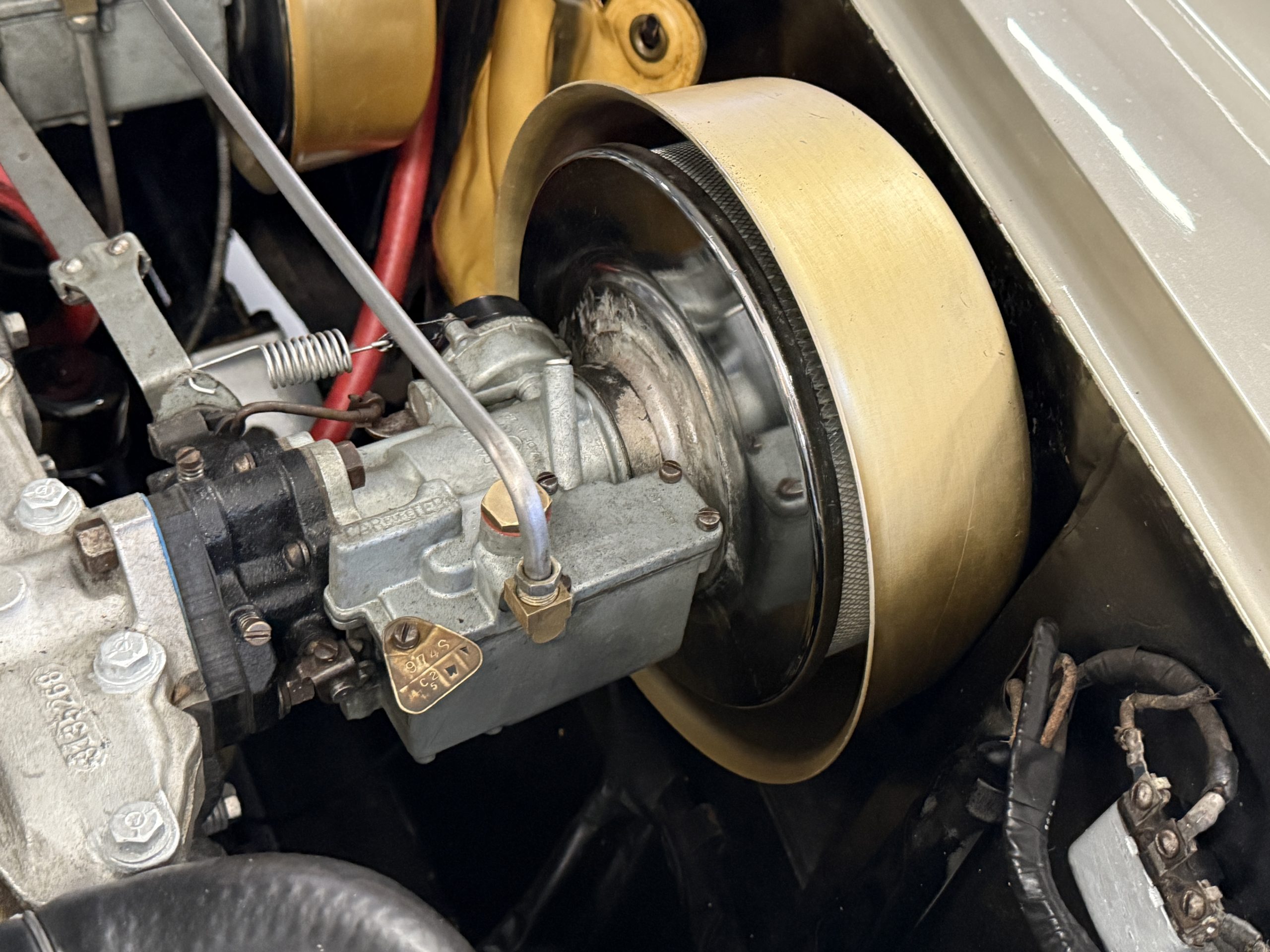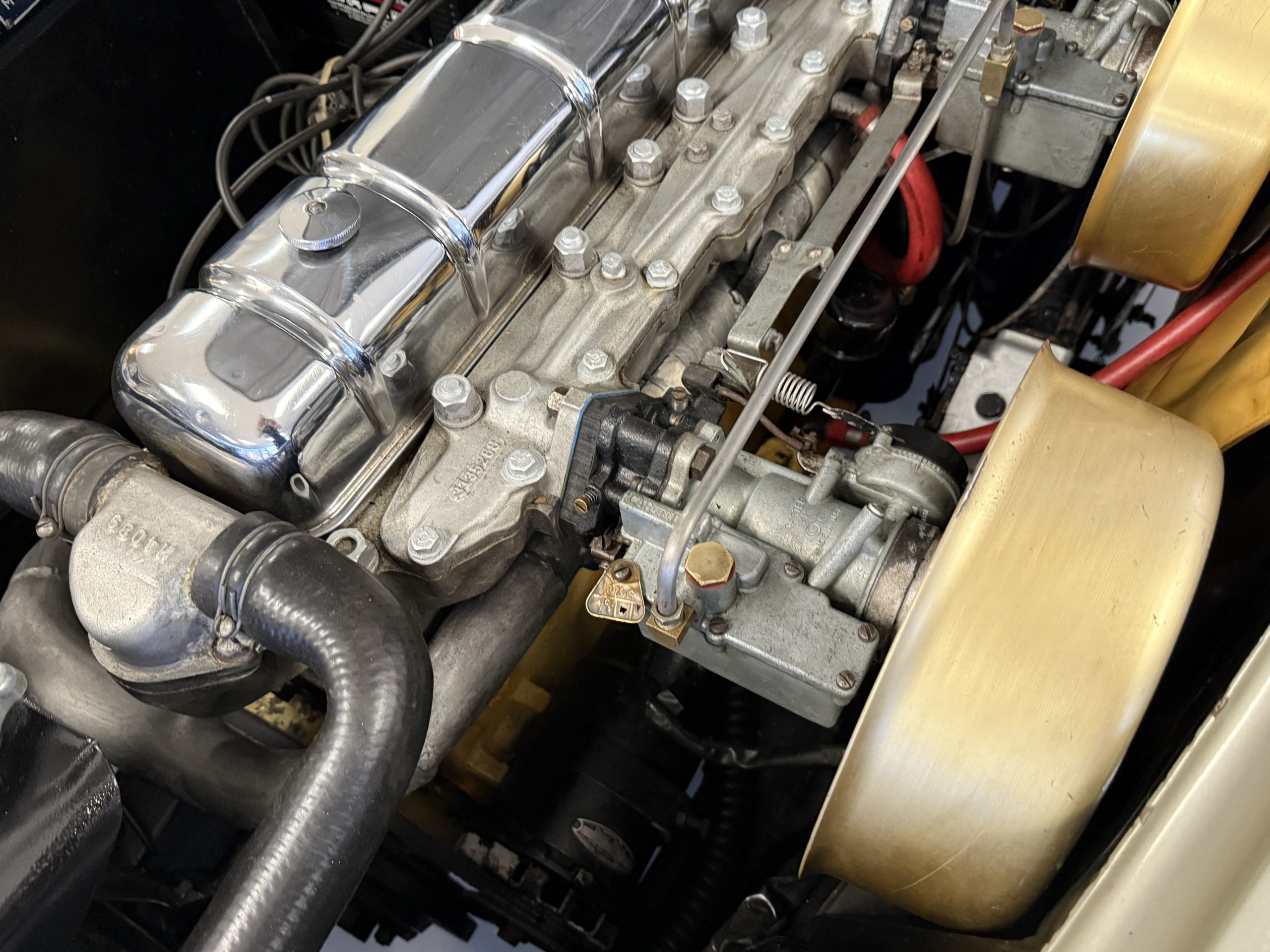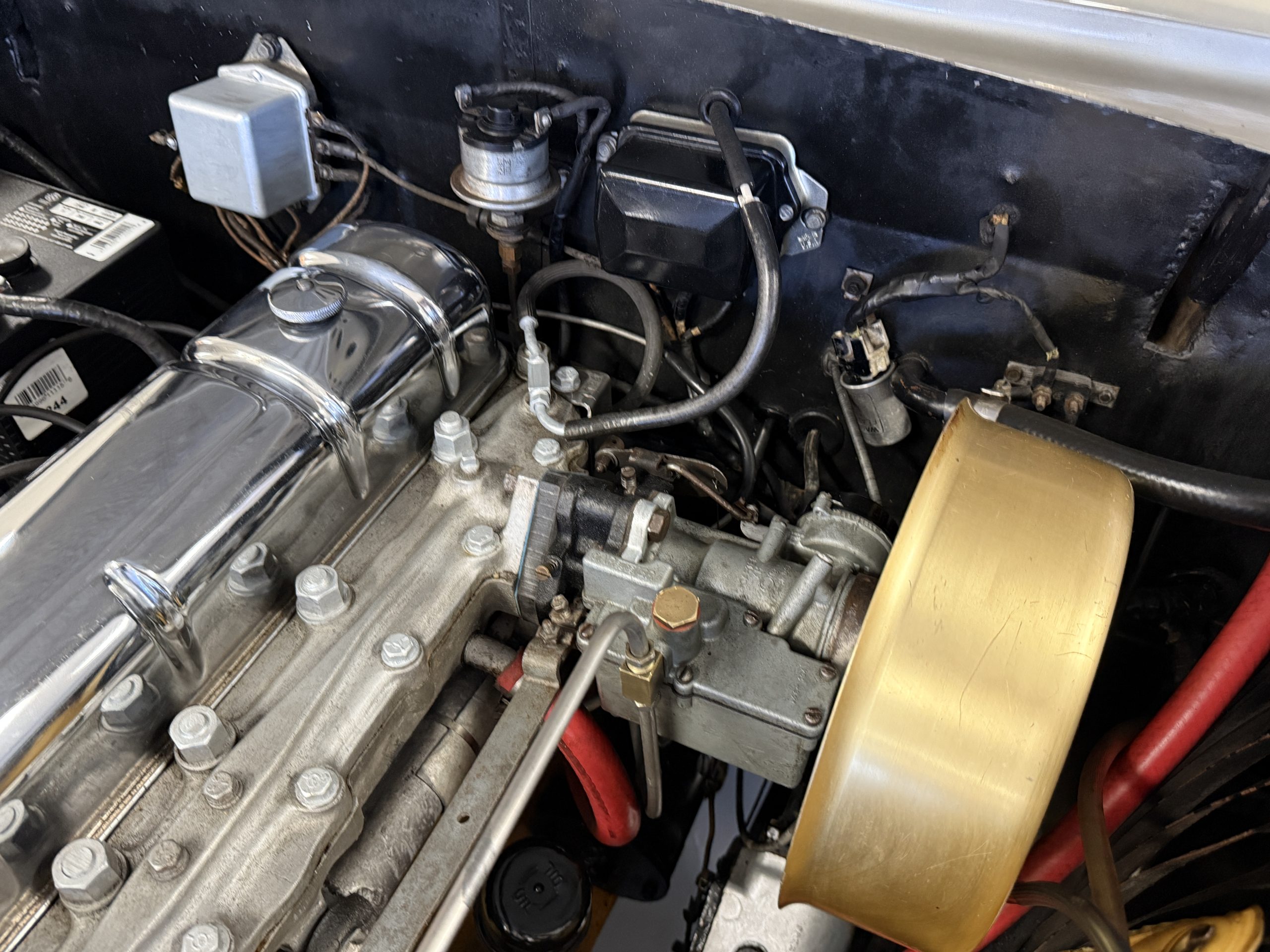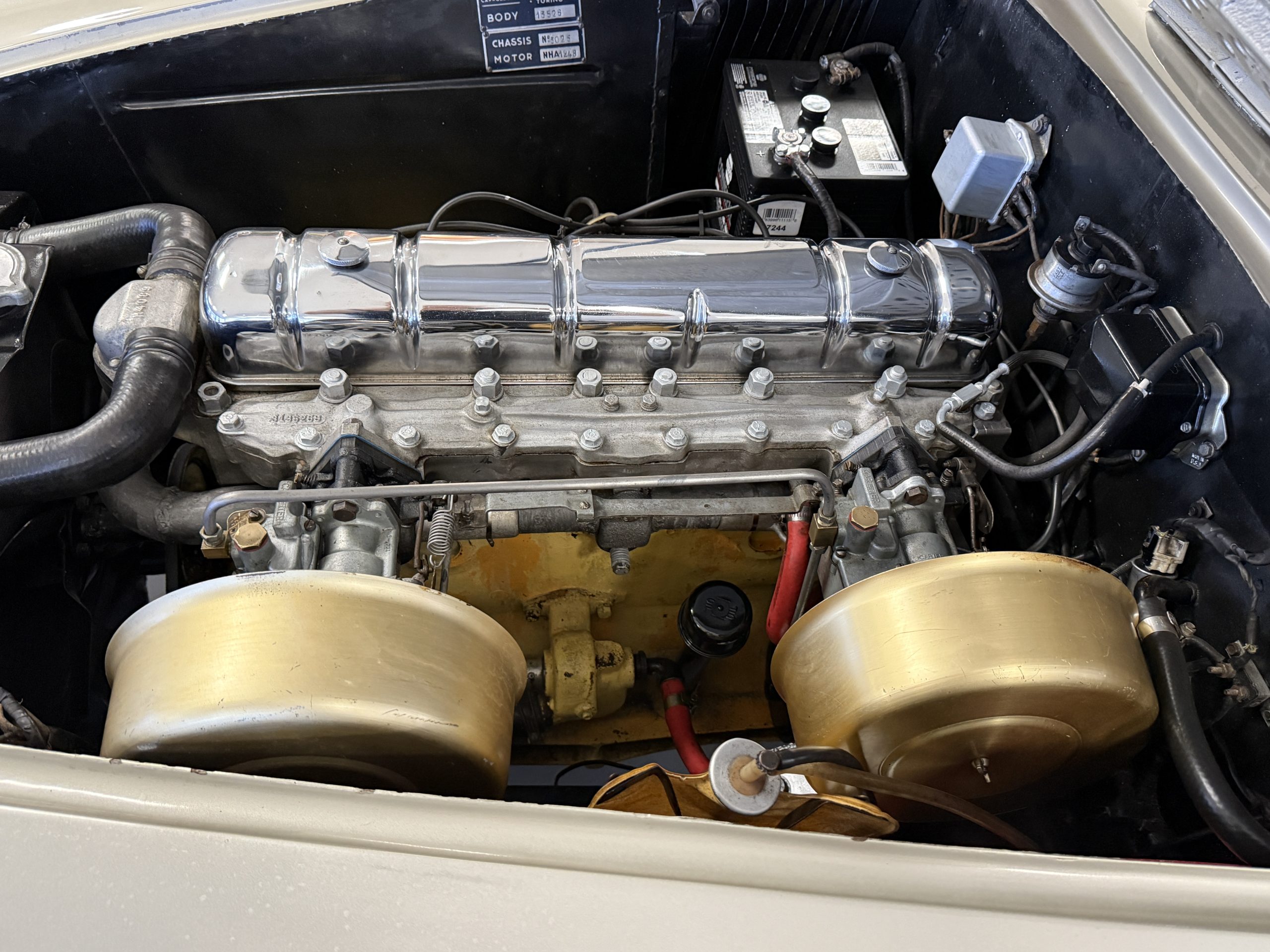 The “Le Mans Dual Jetfire” inline-six was increased in displacement to 252.6ci for 1952–1954 Nash-Healey production and was rated at 140 horsepower. The dual side-draft Carter carburetors were rebuilt in November 2024, and a valve adjustment was performed. Replacement spark plugs, engine mounts, fuel lines, a radiator cap, and an accessory belt were also installed at that time. Results from a recent compression test can be seen in the photo gallery below.