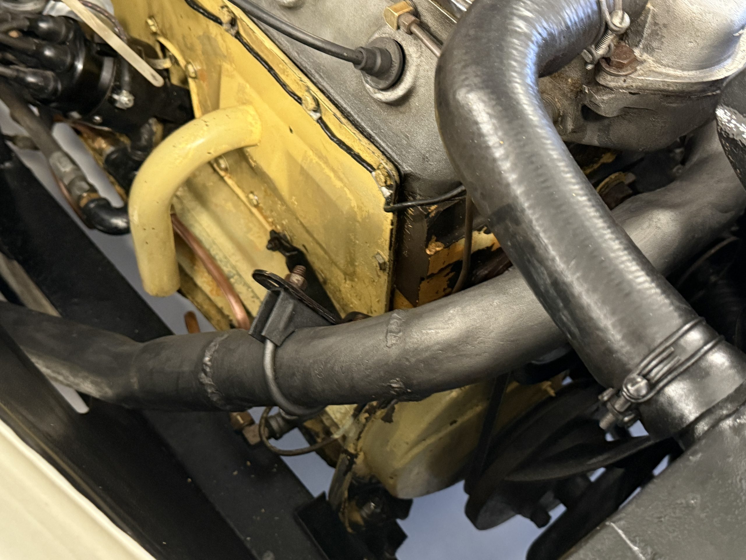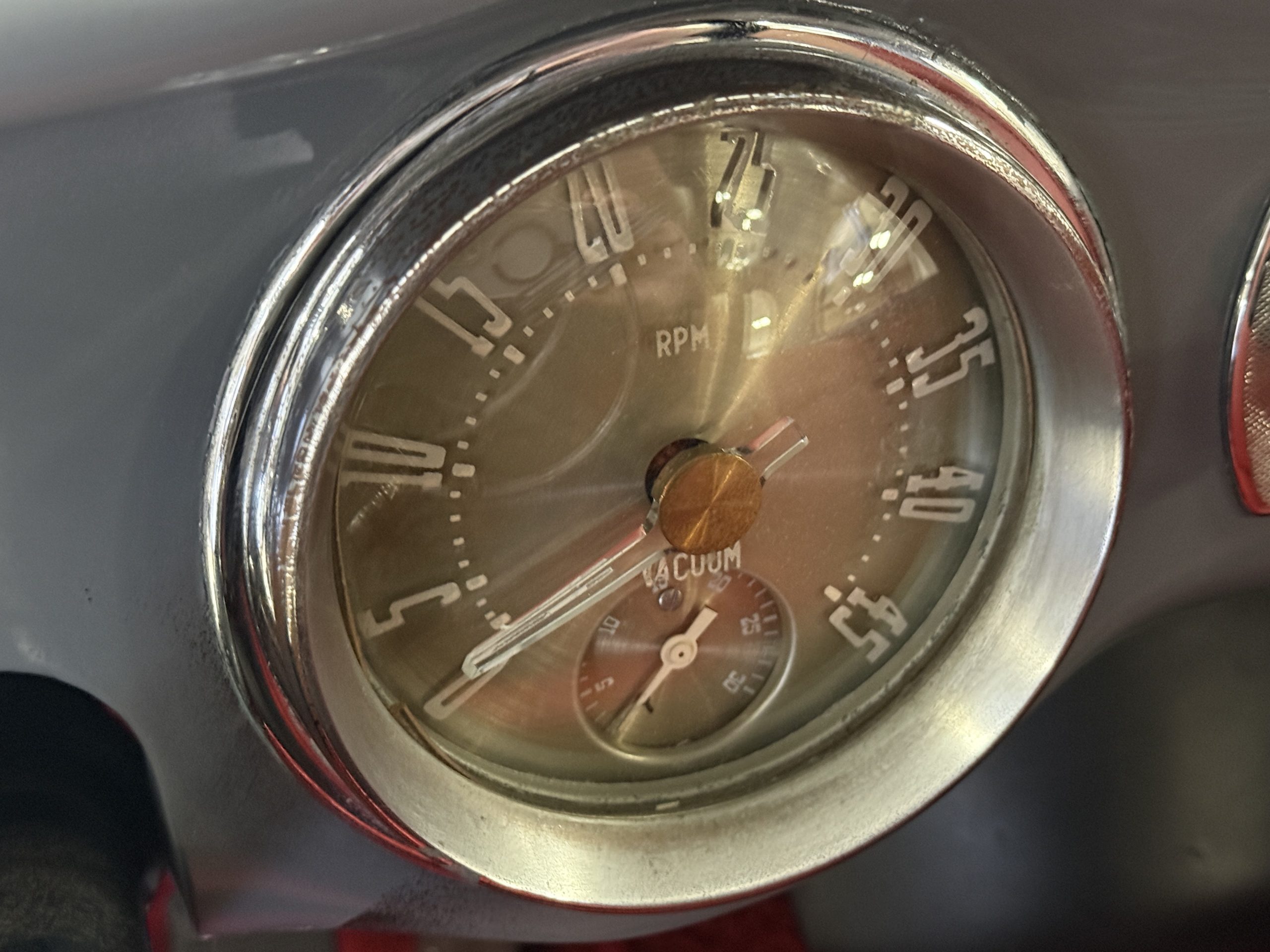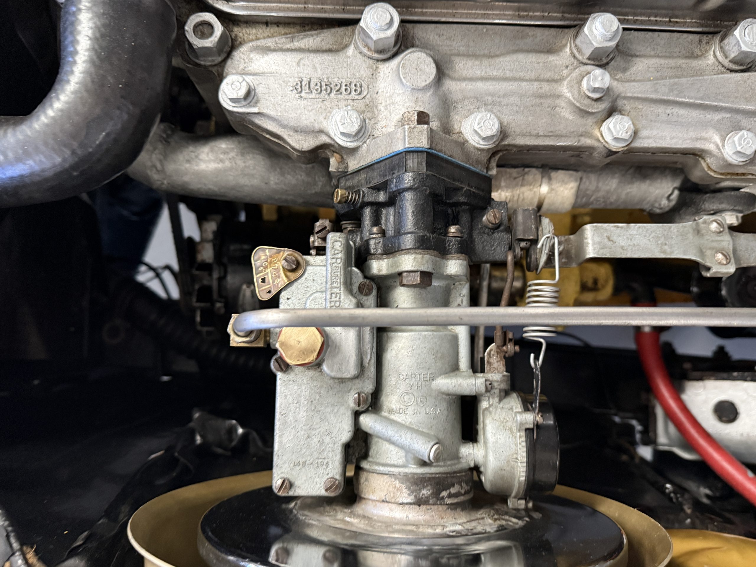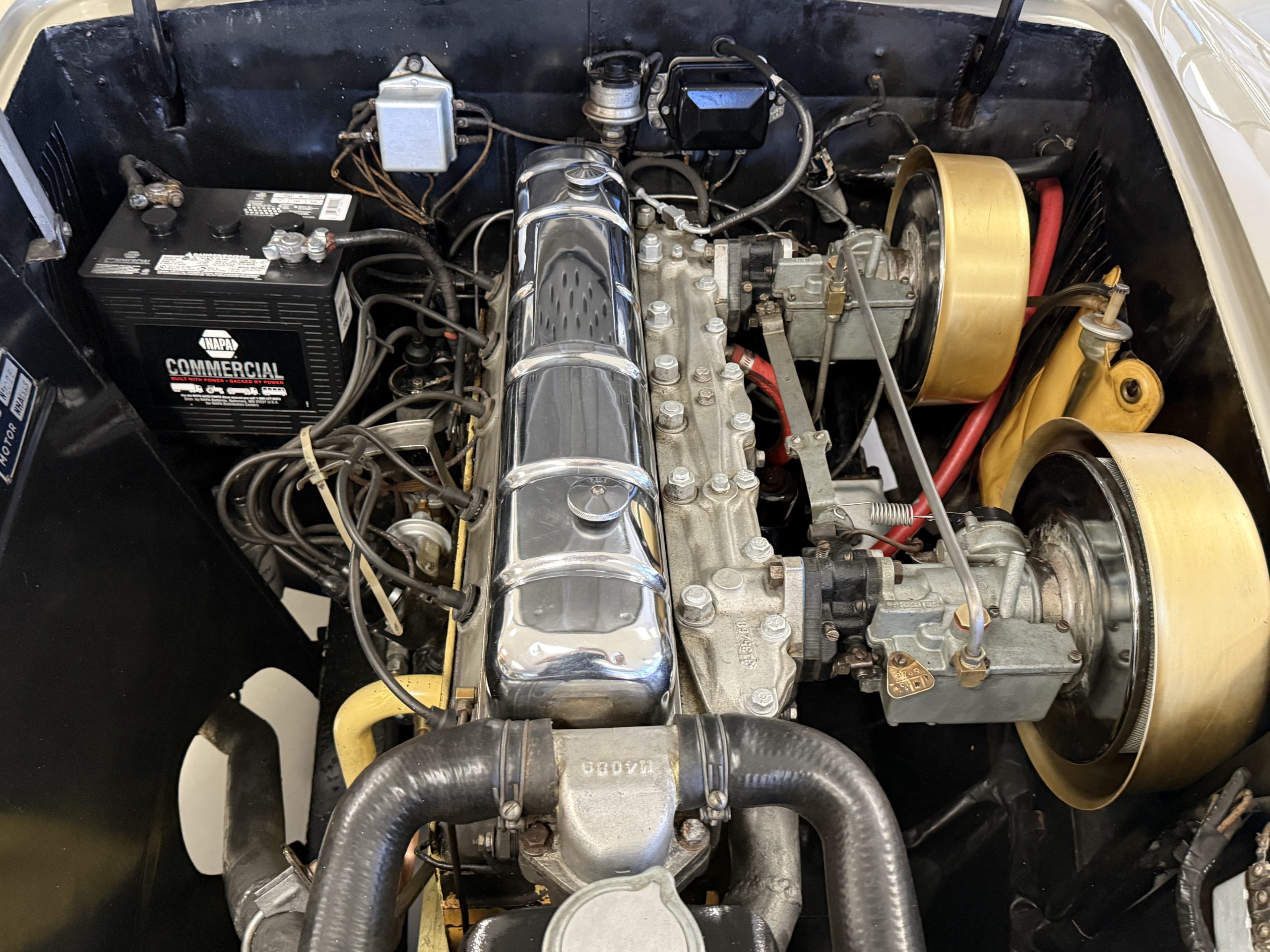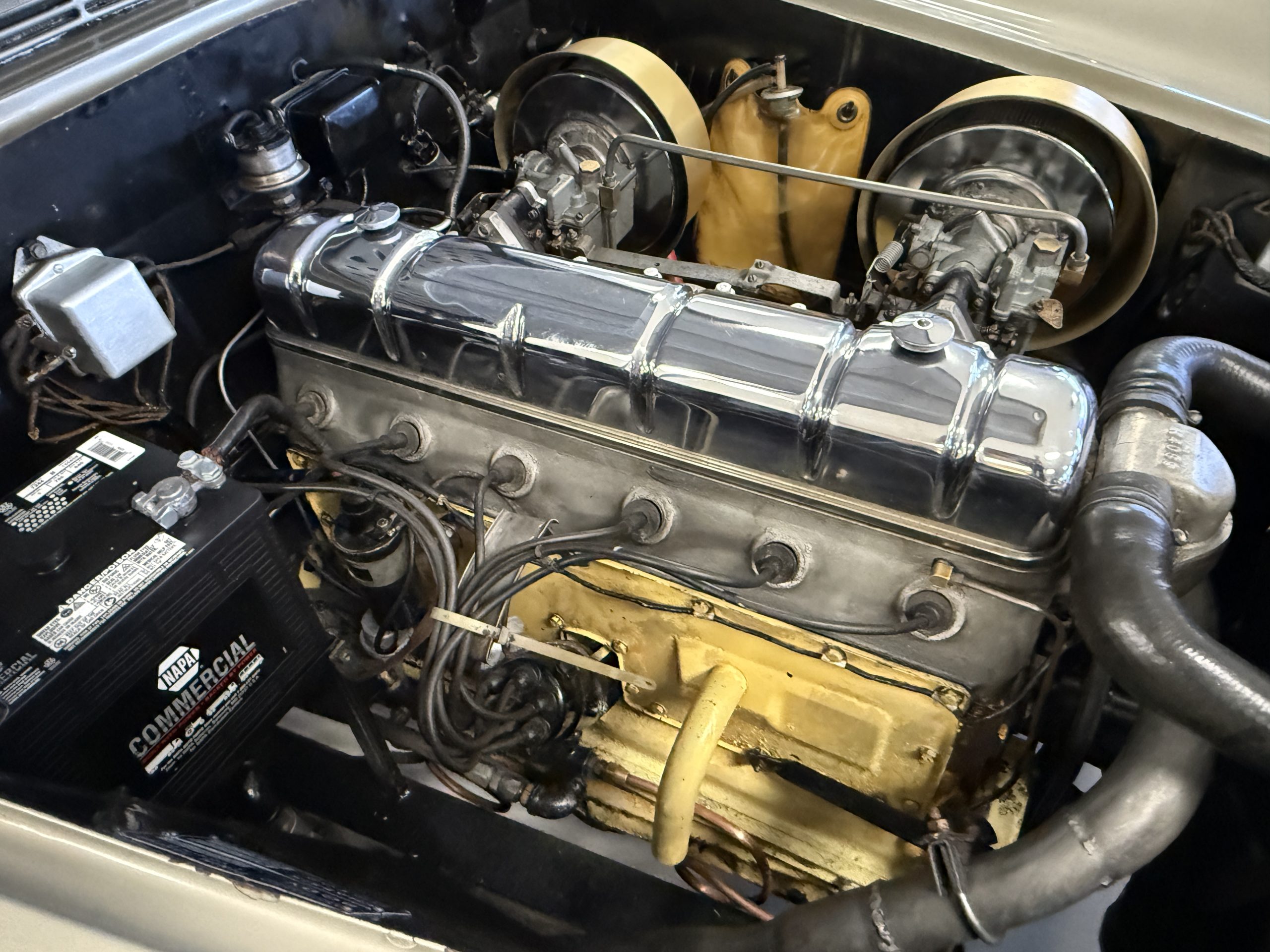 The “Le Mans Dual Jetfire” inline-six was increased in displacement to 252.6ci for 1952–1954 Nash-Healey production and was rated at 140 horsepower. The dual side-draft Carter carburetors were rebuilt in November 2024, and a valve adjustment was performed. Replacement spark plugs, engine mounts, fuel lines, a radiator cap, and an accessory belt were also installed at that time. Results from a recent compression test can be seen in the photo gallery below.