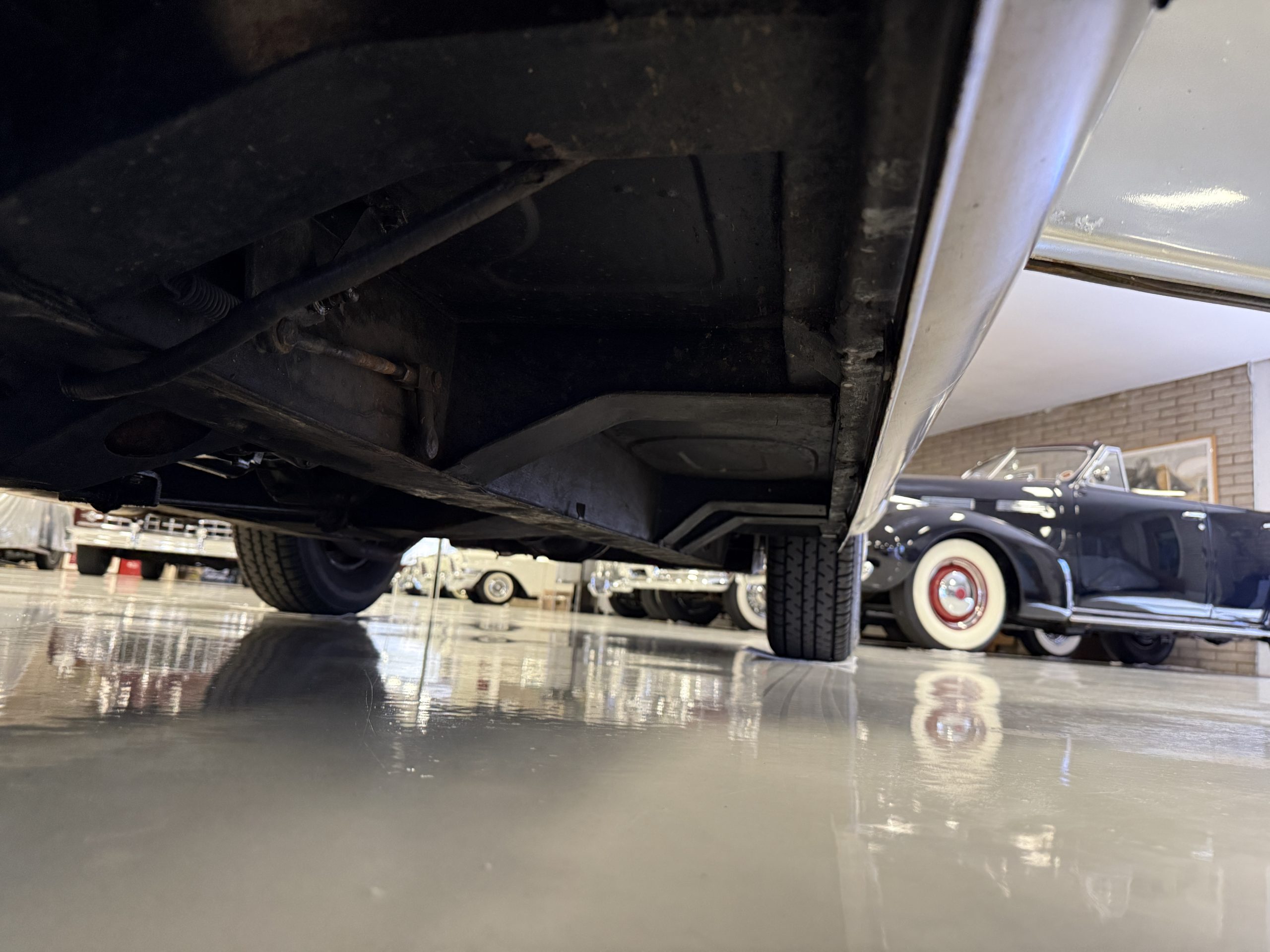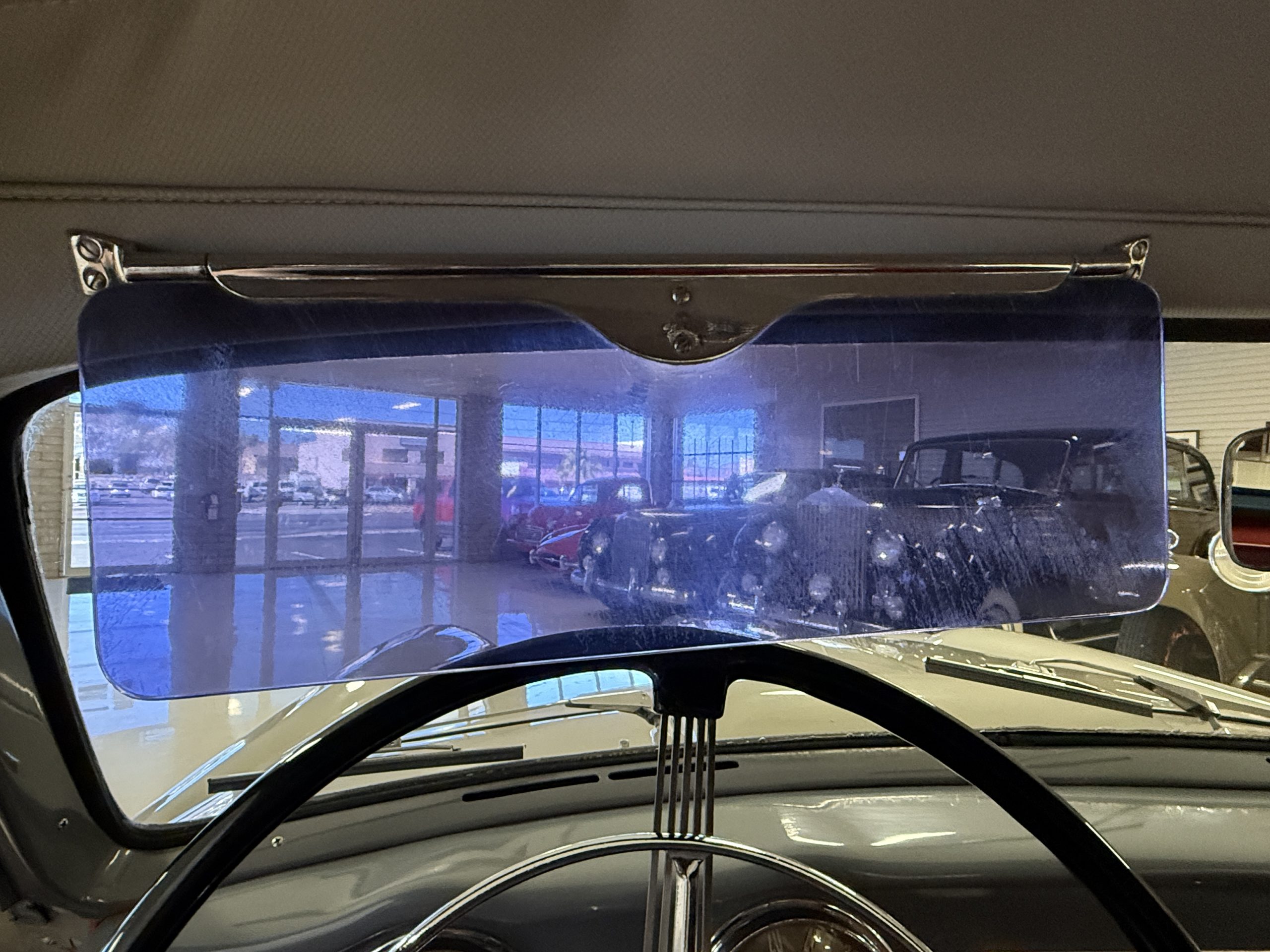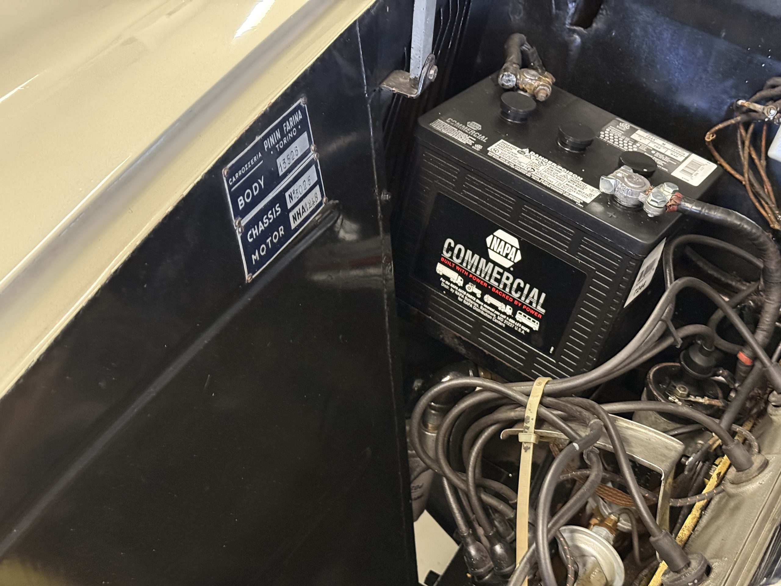 This example was repainted in platinum metallic under previous ownership and features headlights incorporated into the grille, a faux hood scoop, Pinin Farina fender badges, a single-piece rear window, tail fins, and chrome bumpers with overriders.