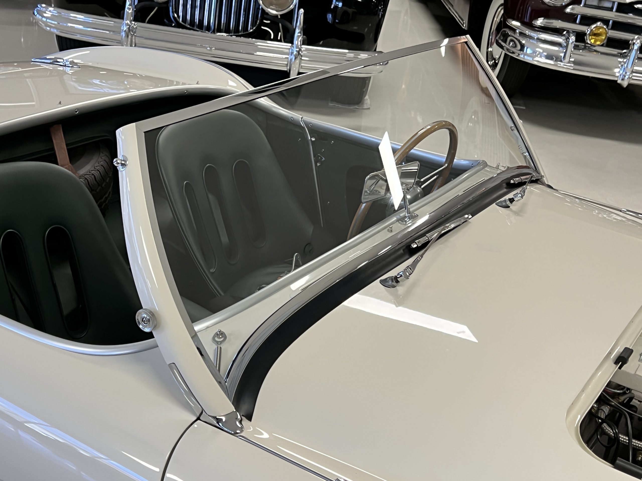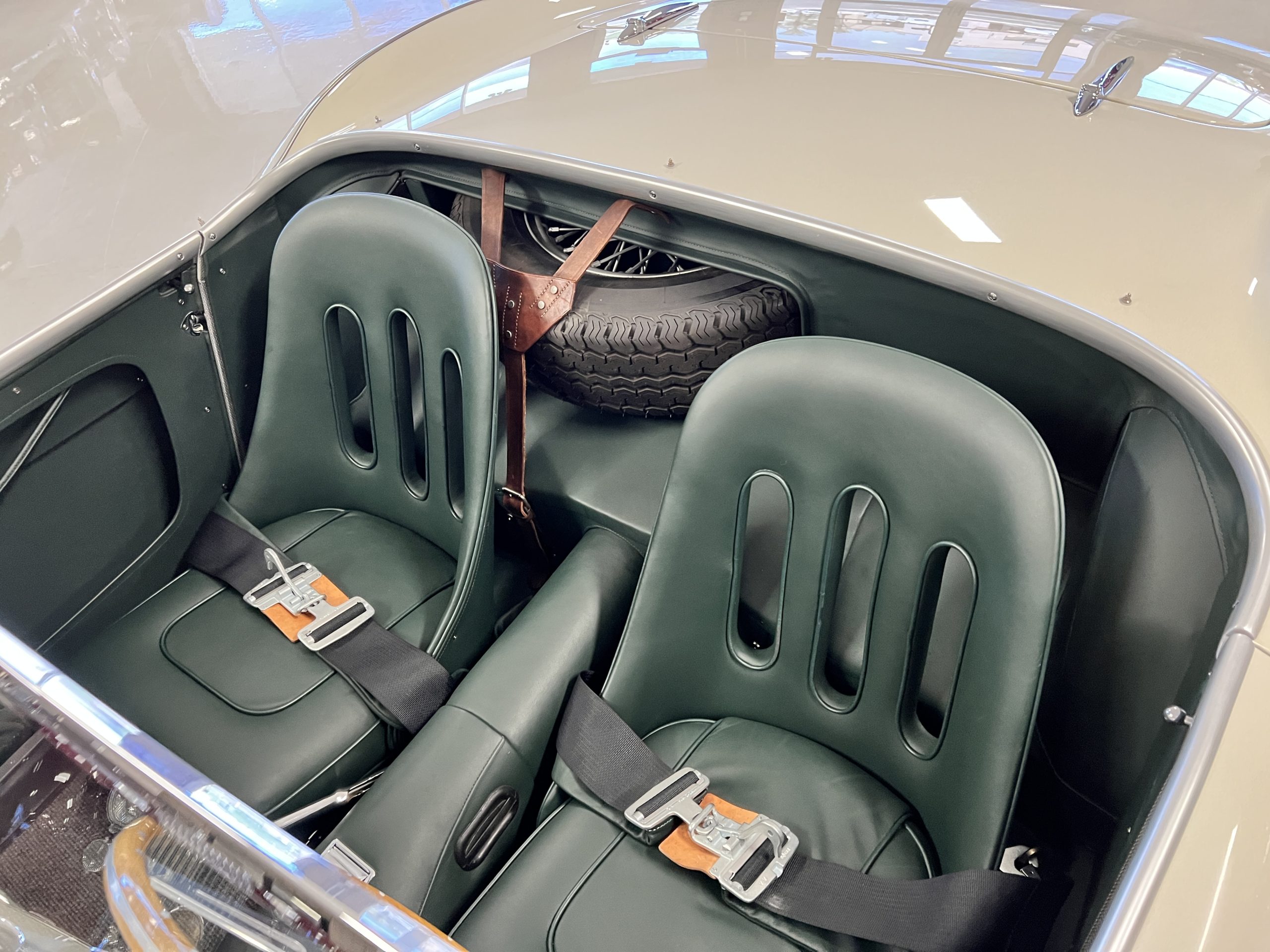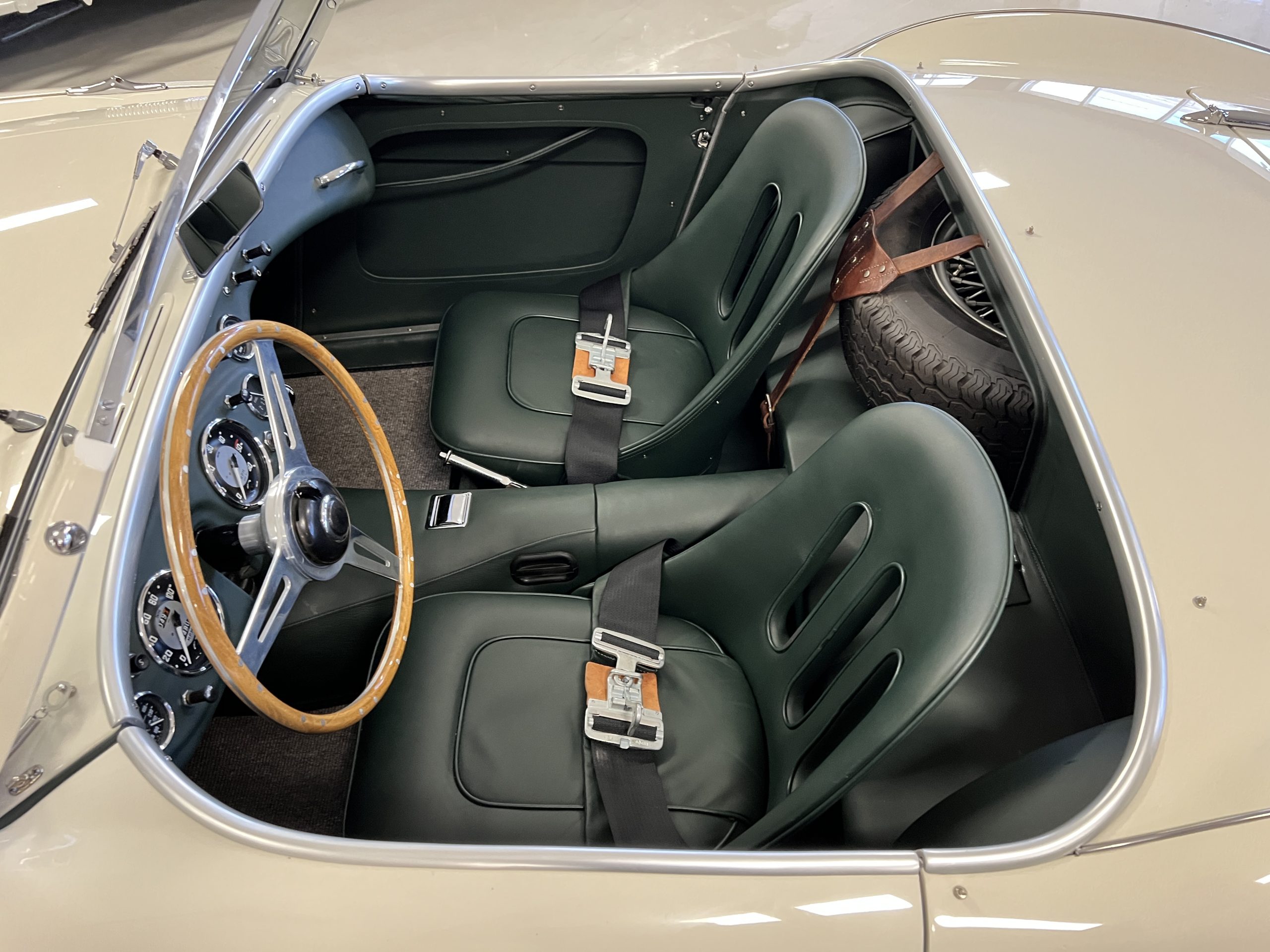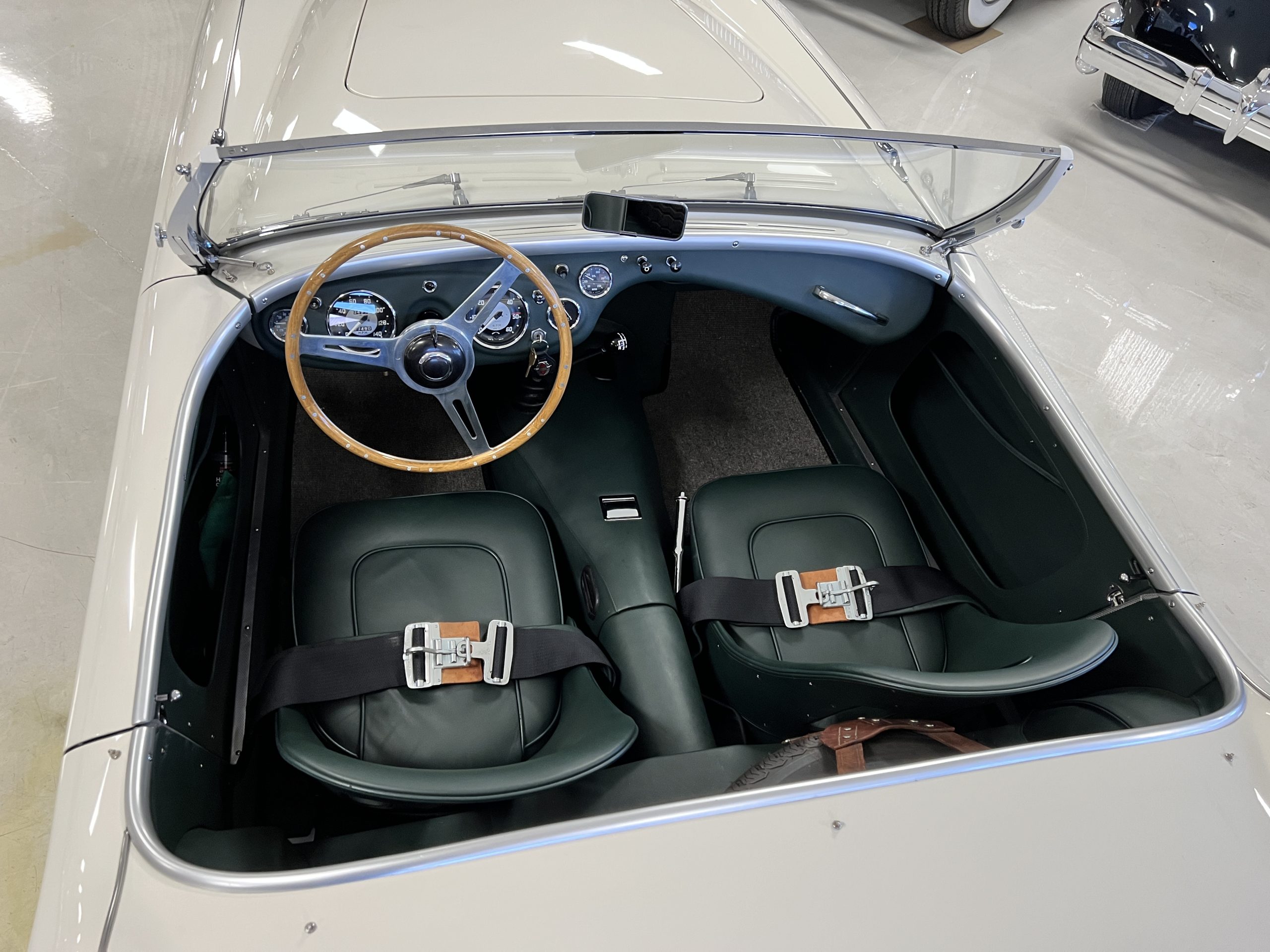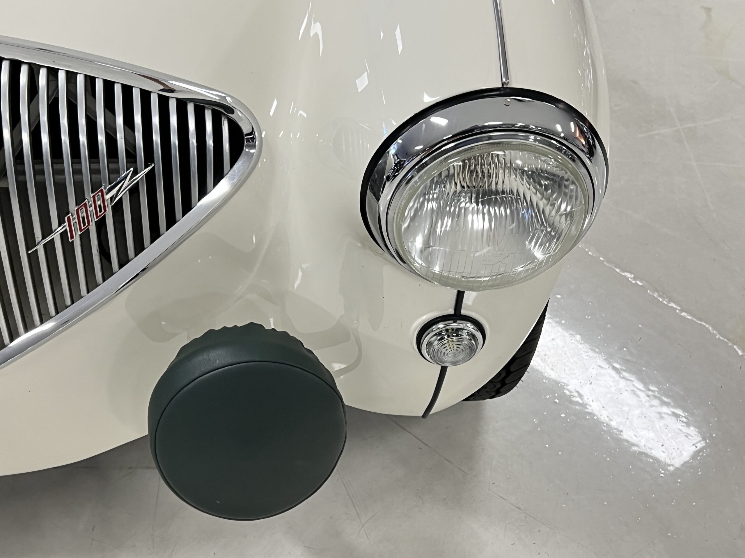 The interior features custom made 100S reproduction seats that are finished in a beautiful green leather hides personally selected. The leather is as-new. The dash and instrumentation is all restored and functioning great. The 100S comes with two tonneau covers and carpet overlays. The convertible top has not been installed and only the unrestored top bows are included.