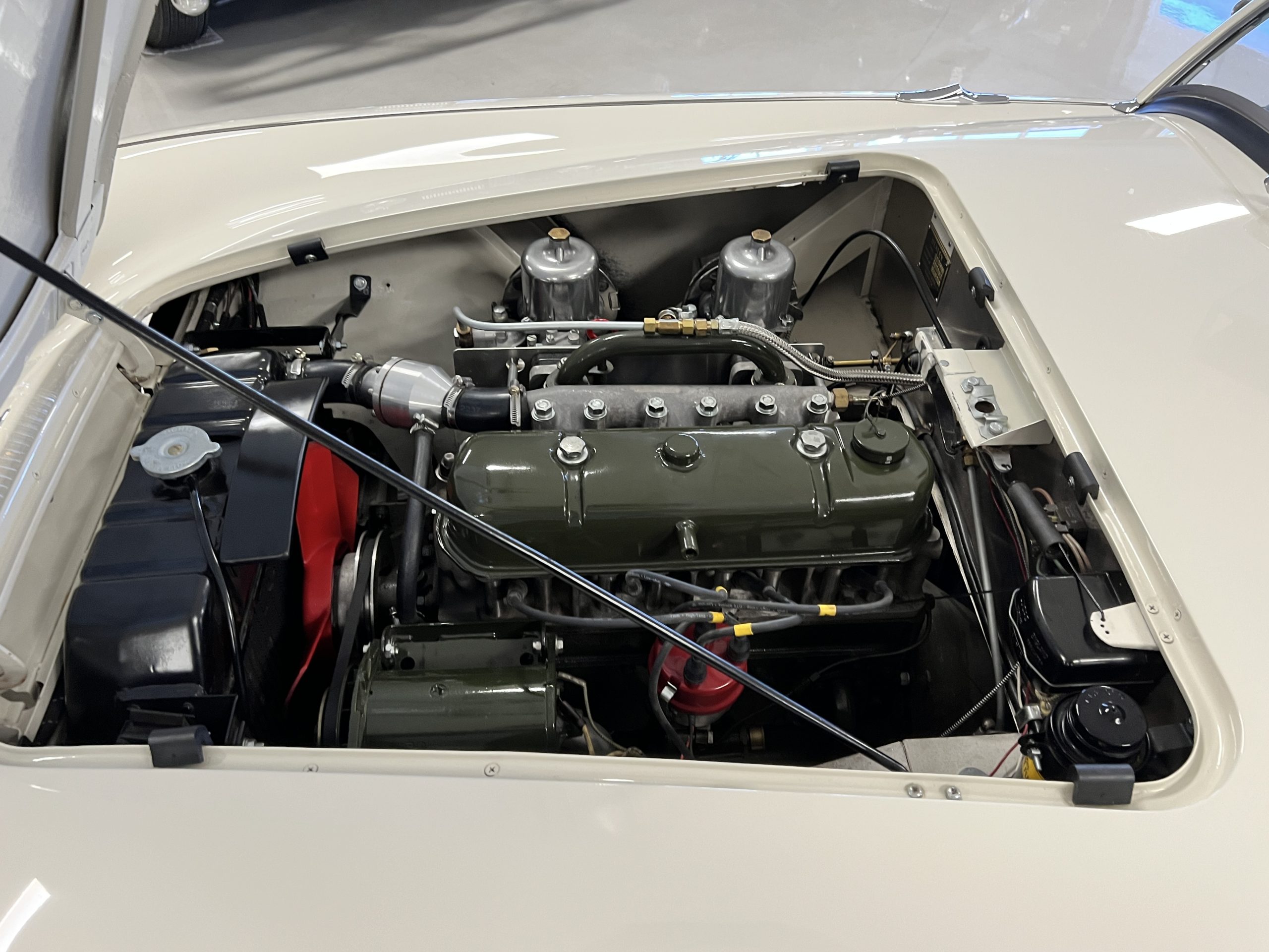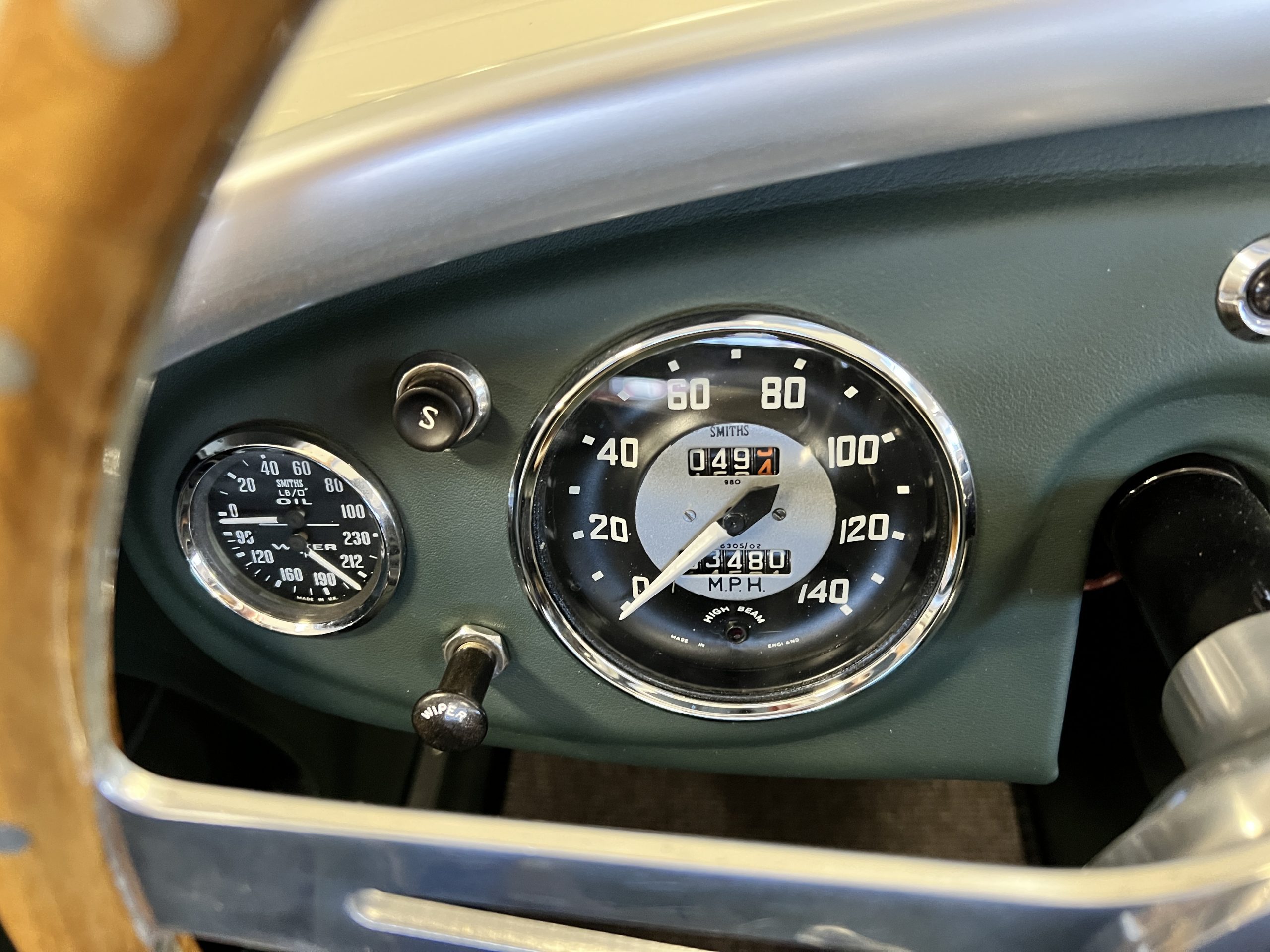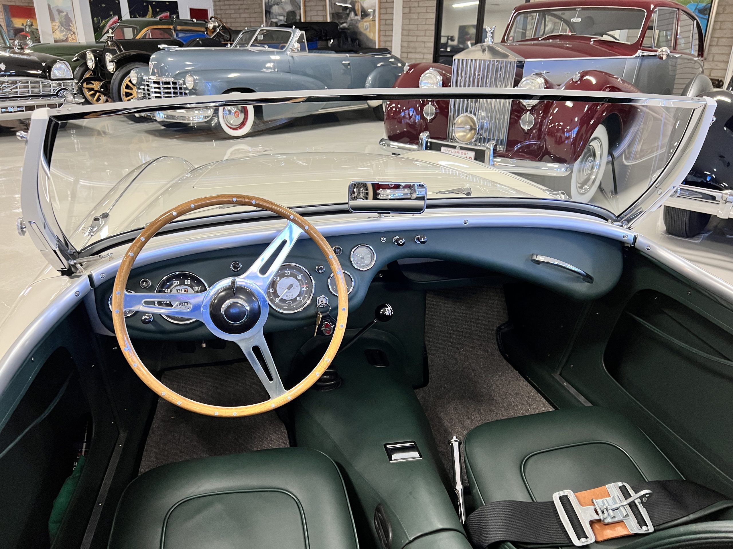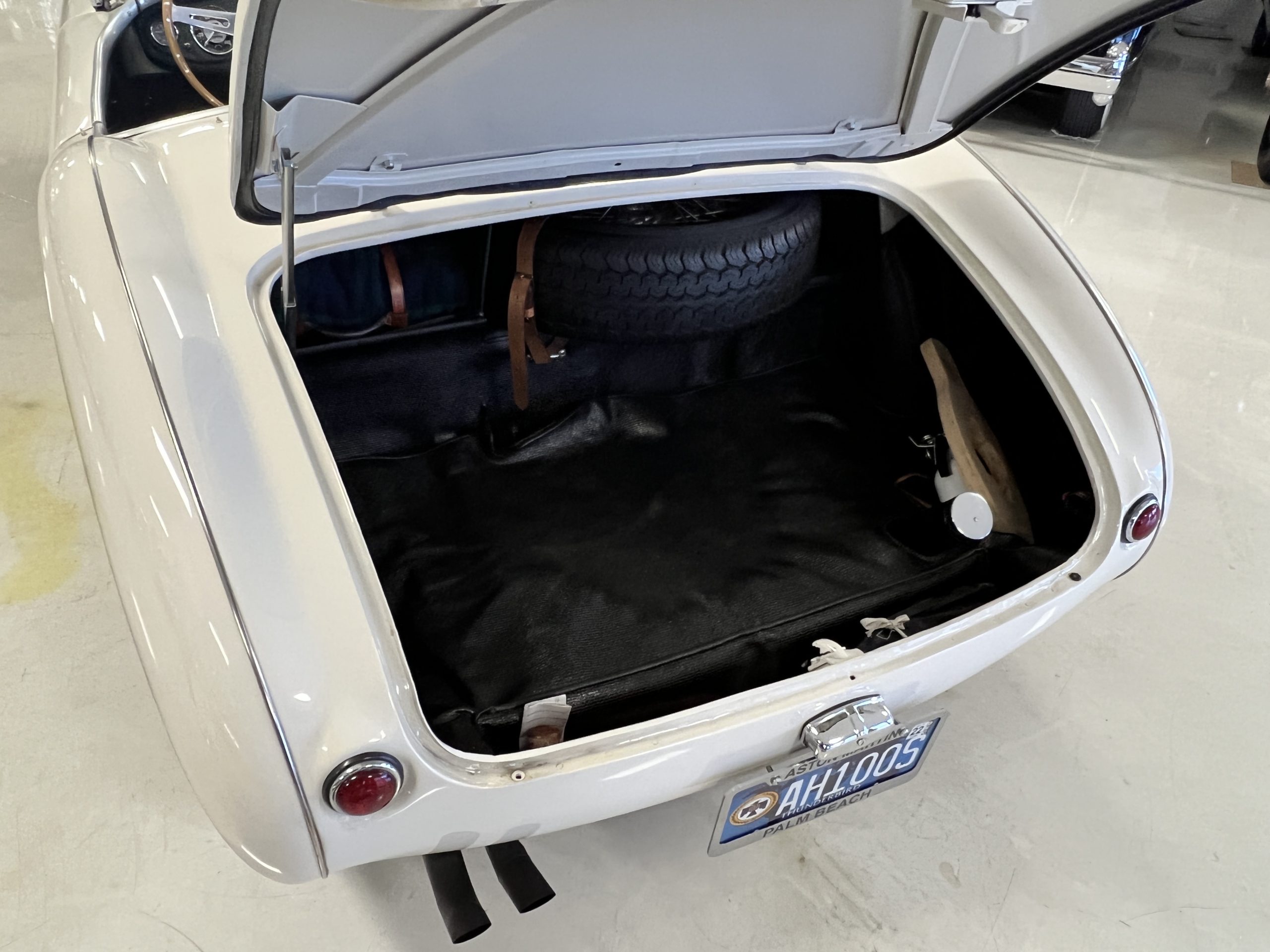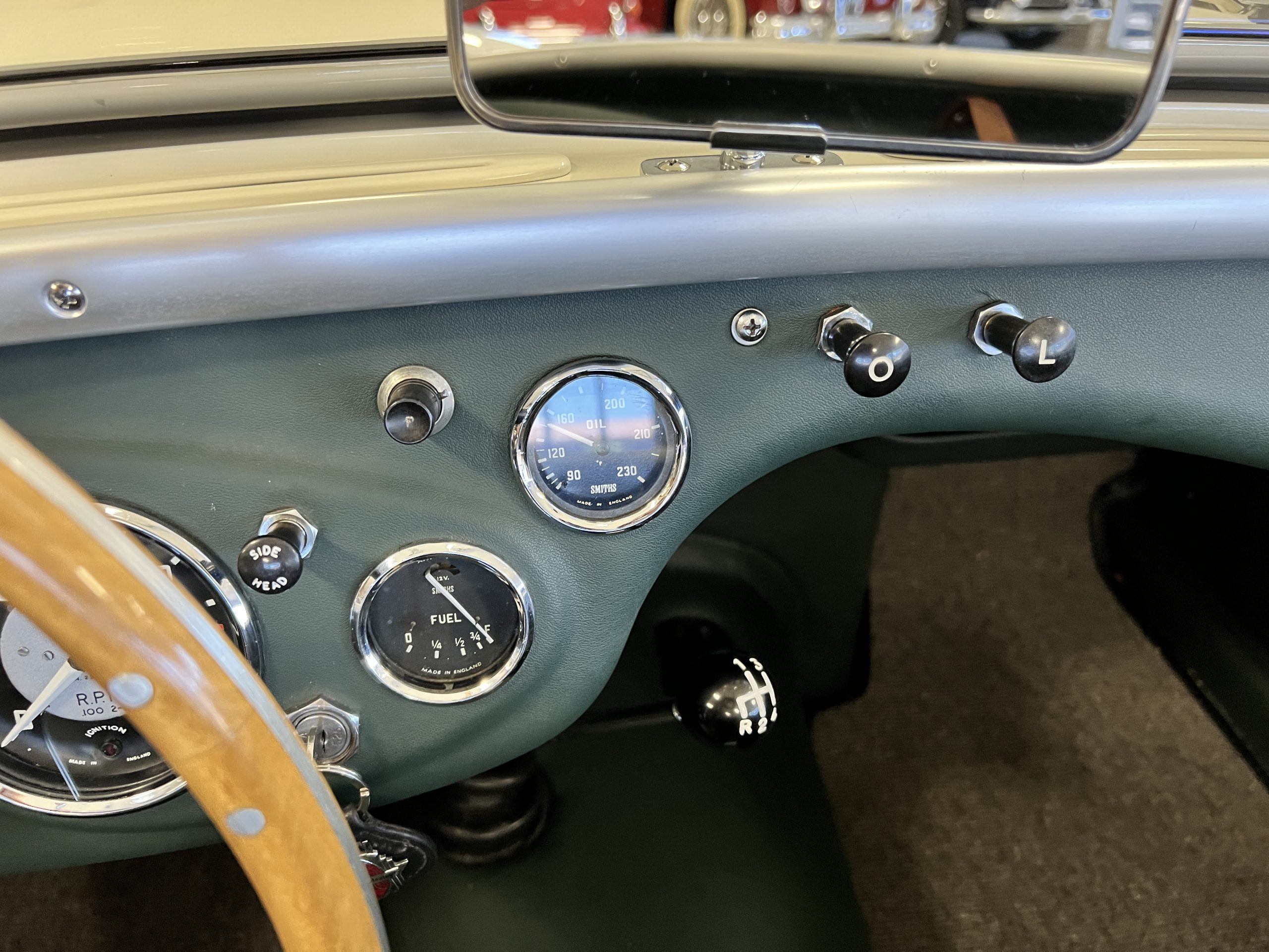 The interior features custom made 100S reproduction seats that are finished in a beautiful green leather hides personally selected. The leather is as-new. The dash and instrumentation is all restored and functioning great. The 100S comes with two tonneau covers and carpet overlays. The convertible top has not been installed and only the unrestored top bows are included.