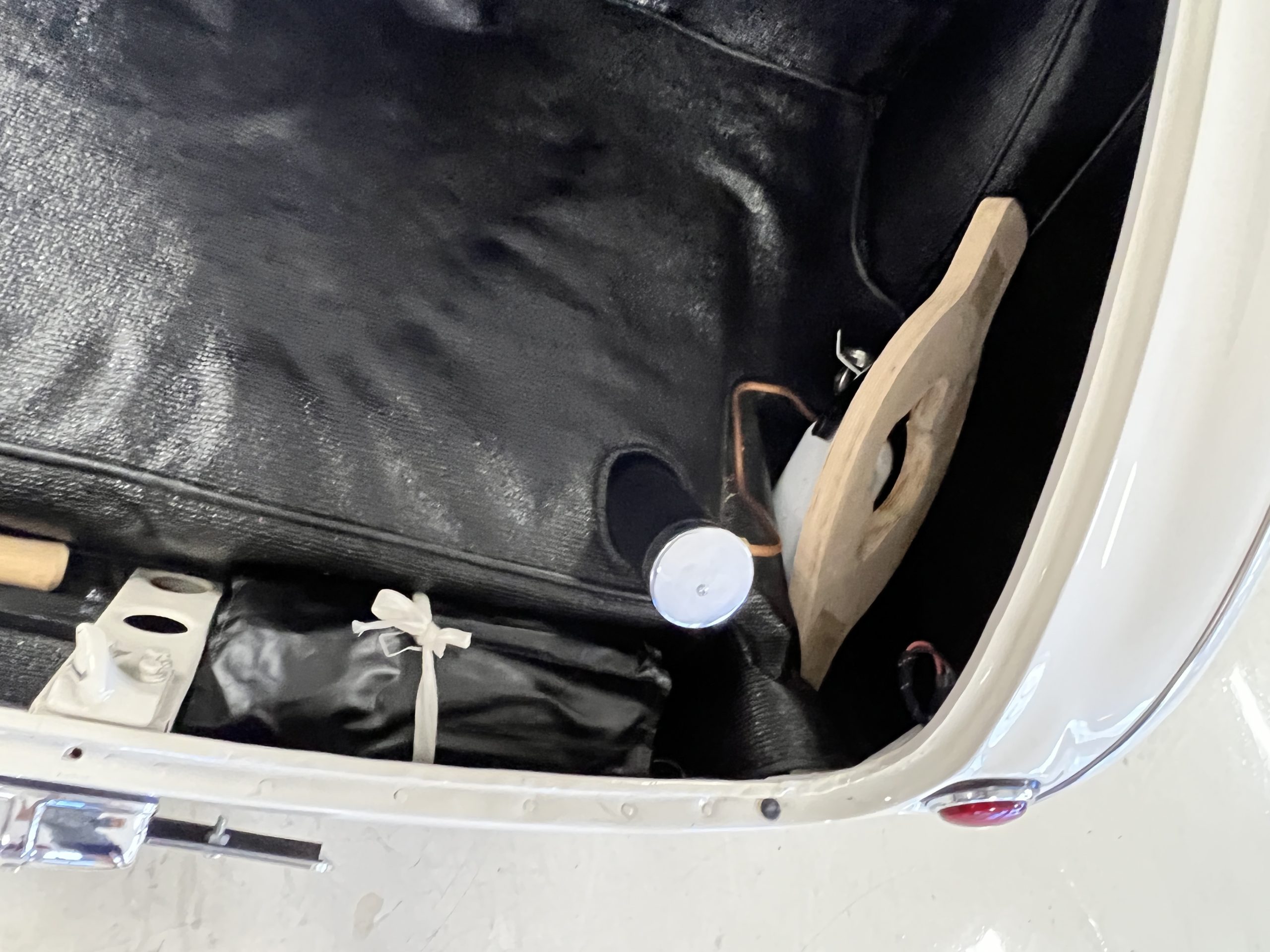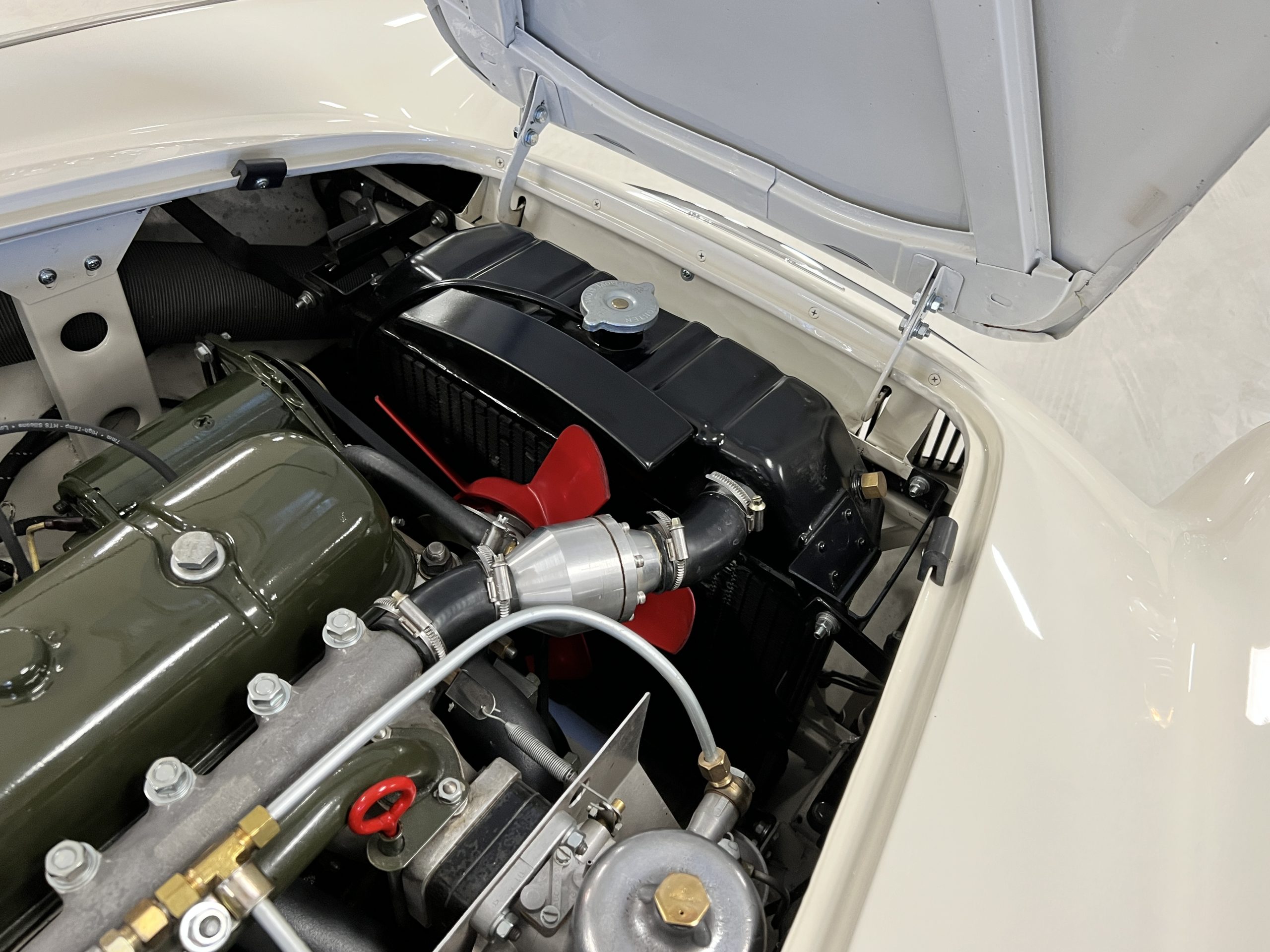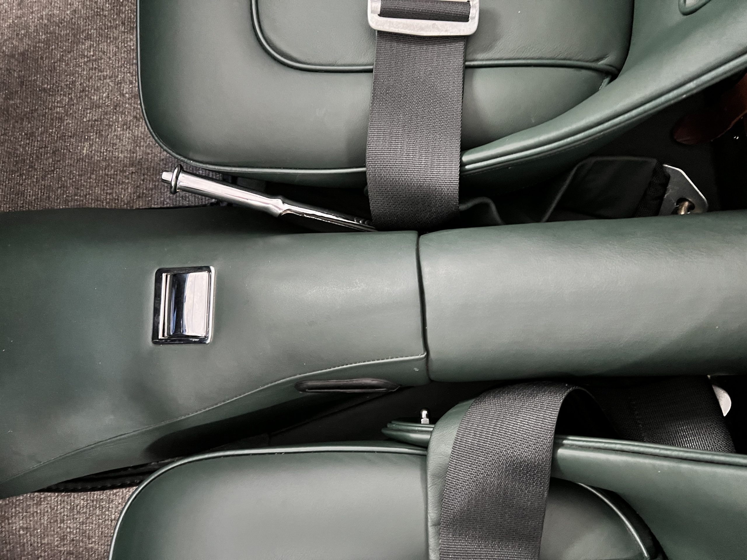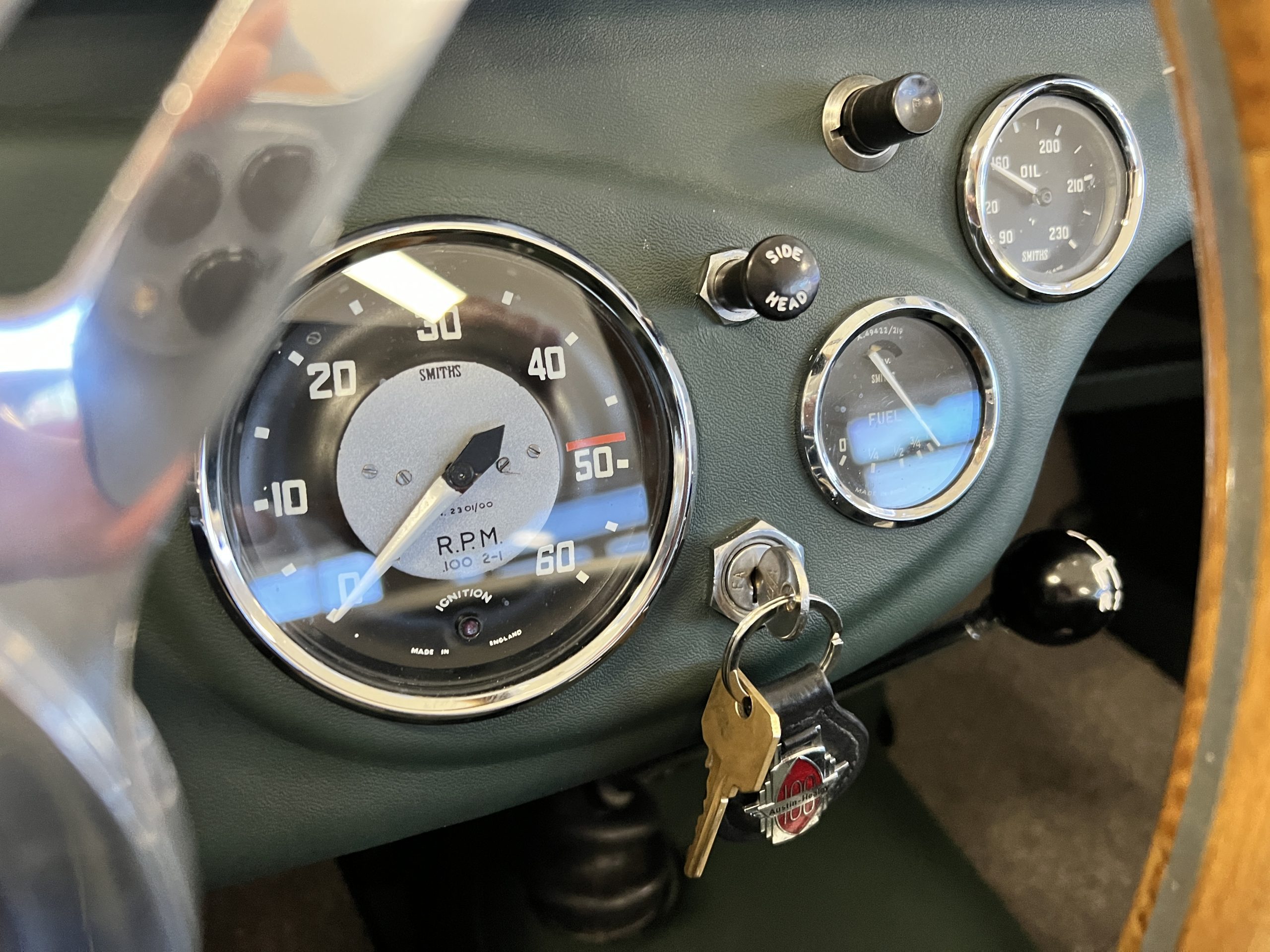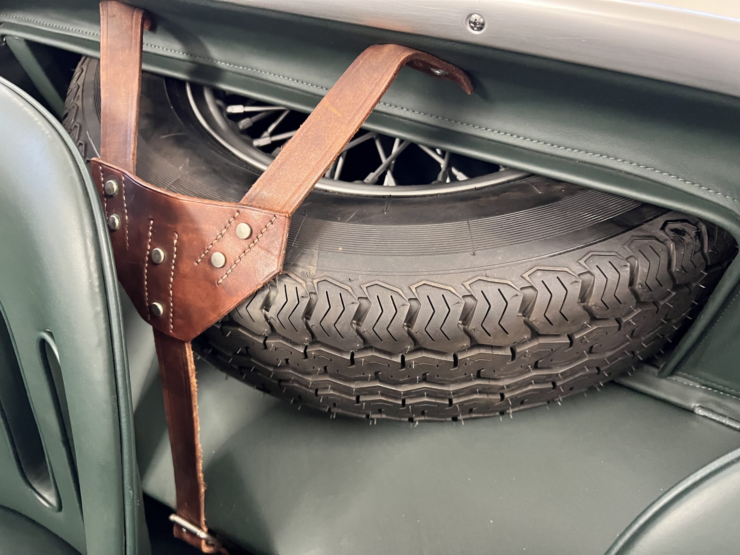 The interior features custom made 100S reproduction seats that are finished in a beautiful green leather hides personally selected. The leather is as-new. The dash and instrumentation is all restored and functioning great. The 100S comes with two tonneau covers and carpet overlays. The convertible top has not been installed and only the unrestored top bows are included.