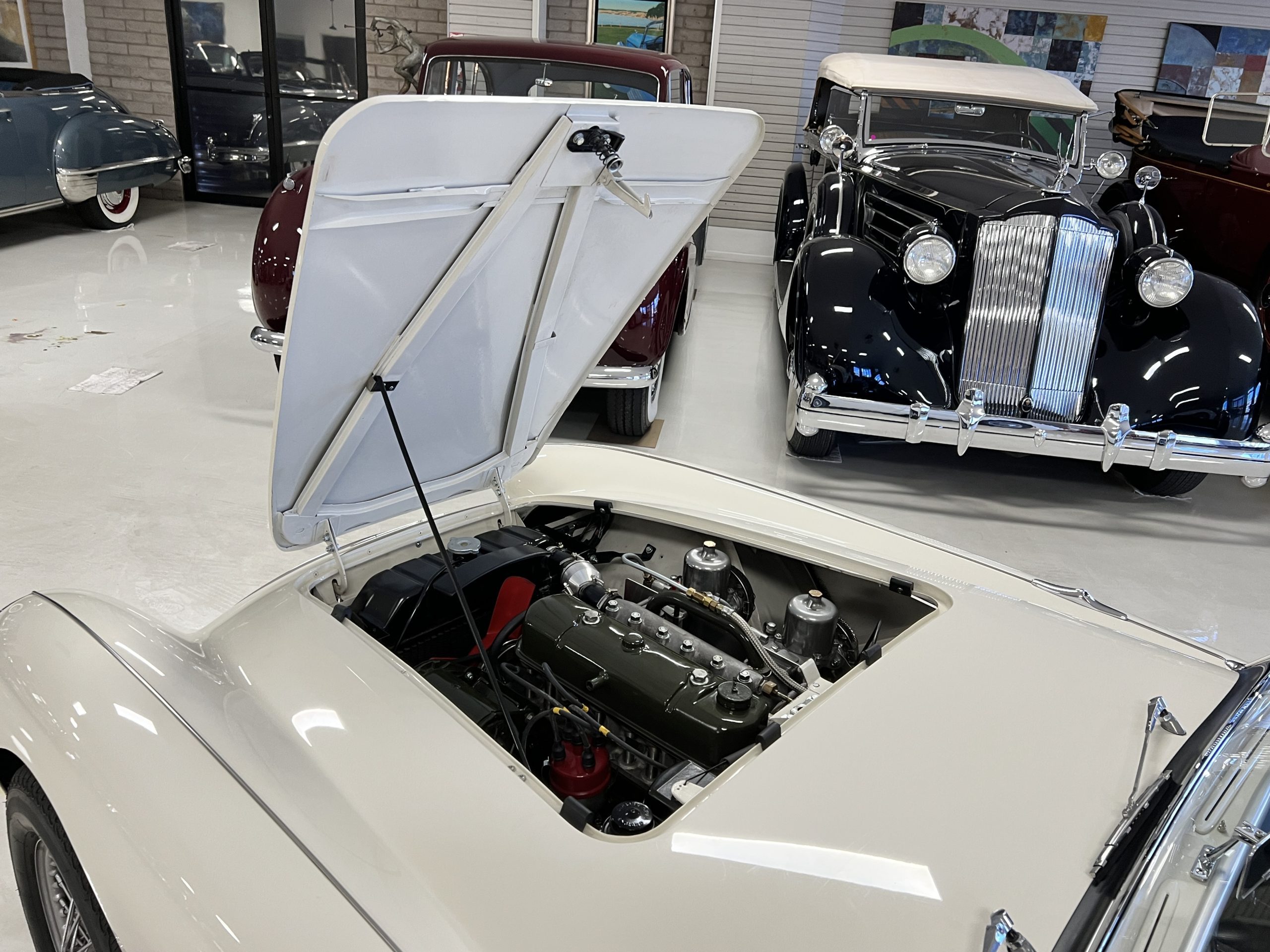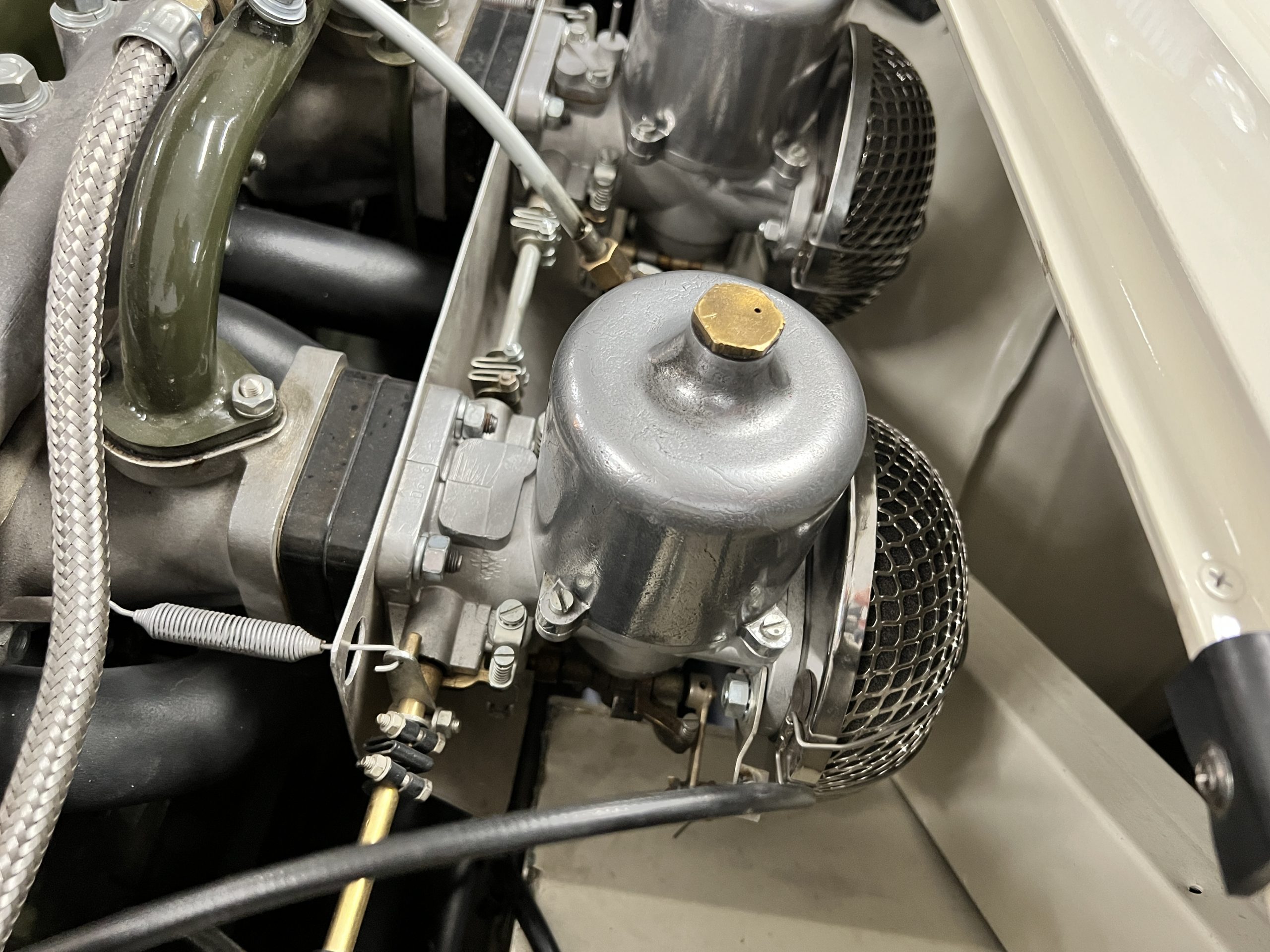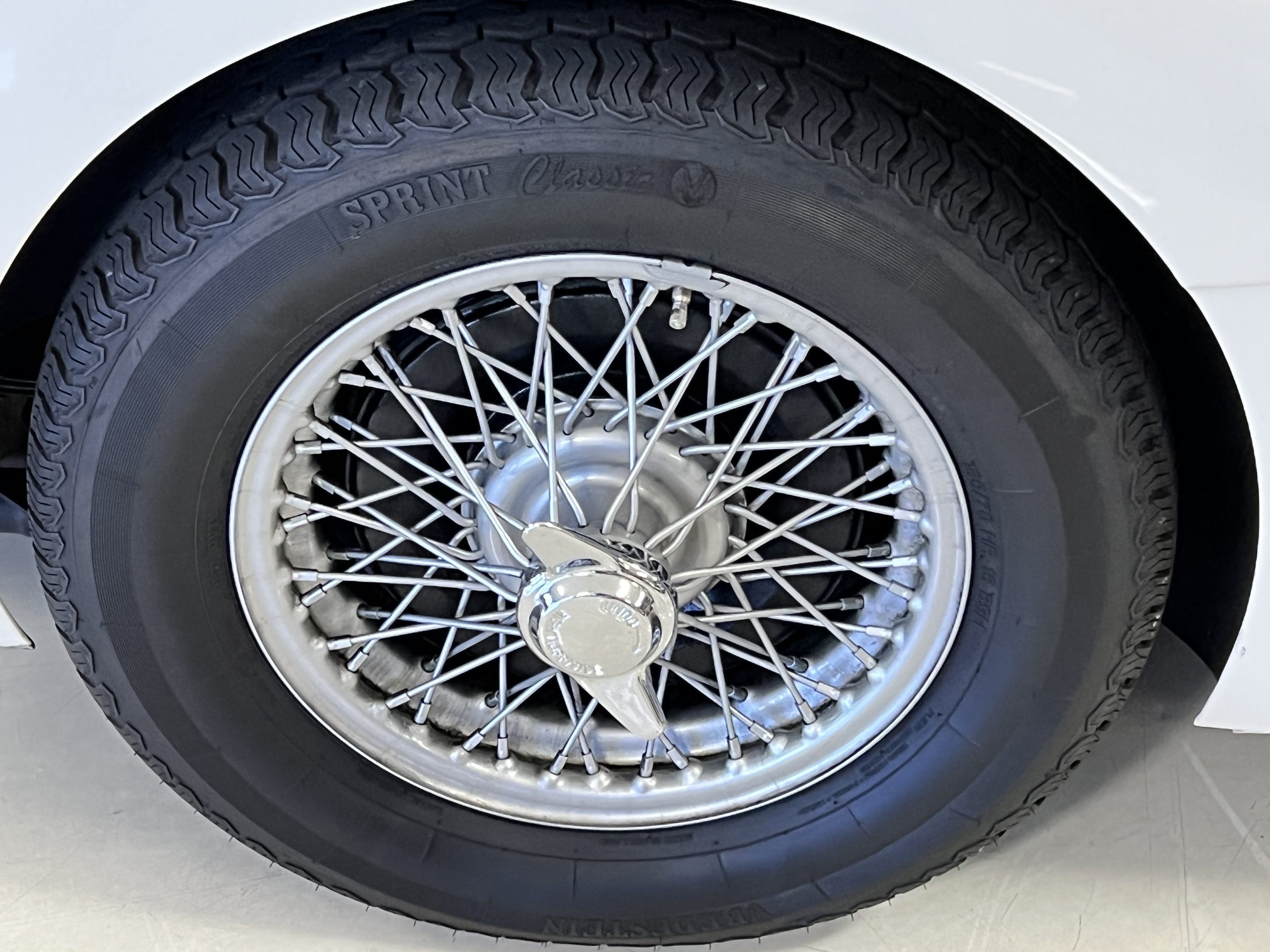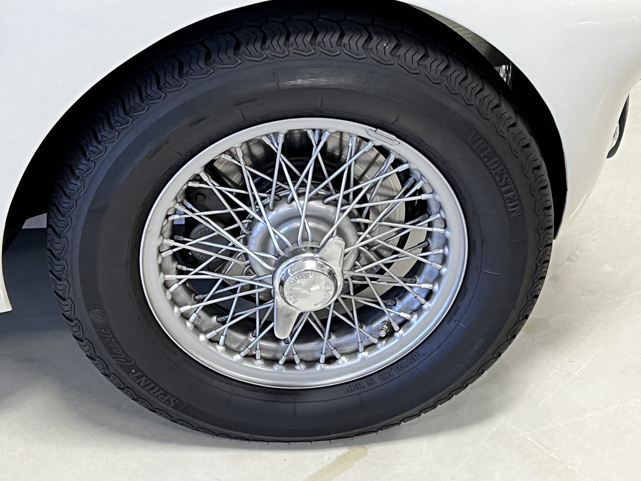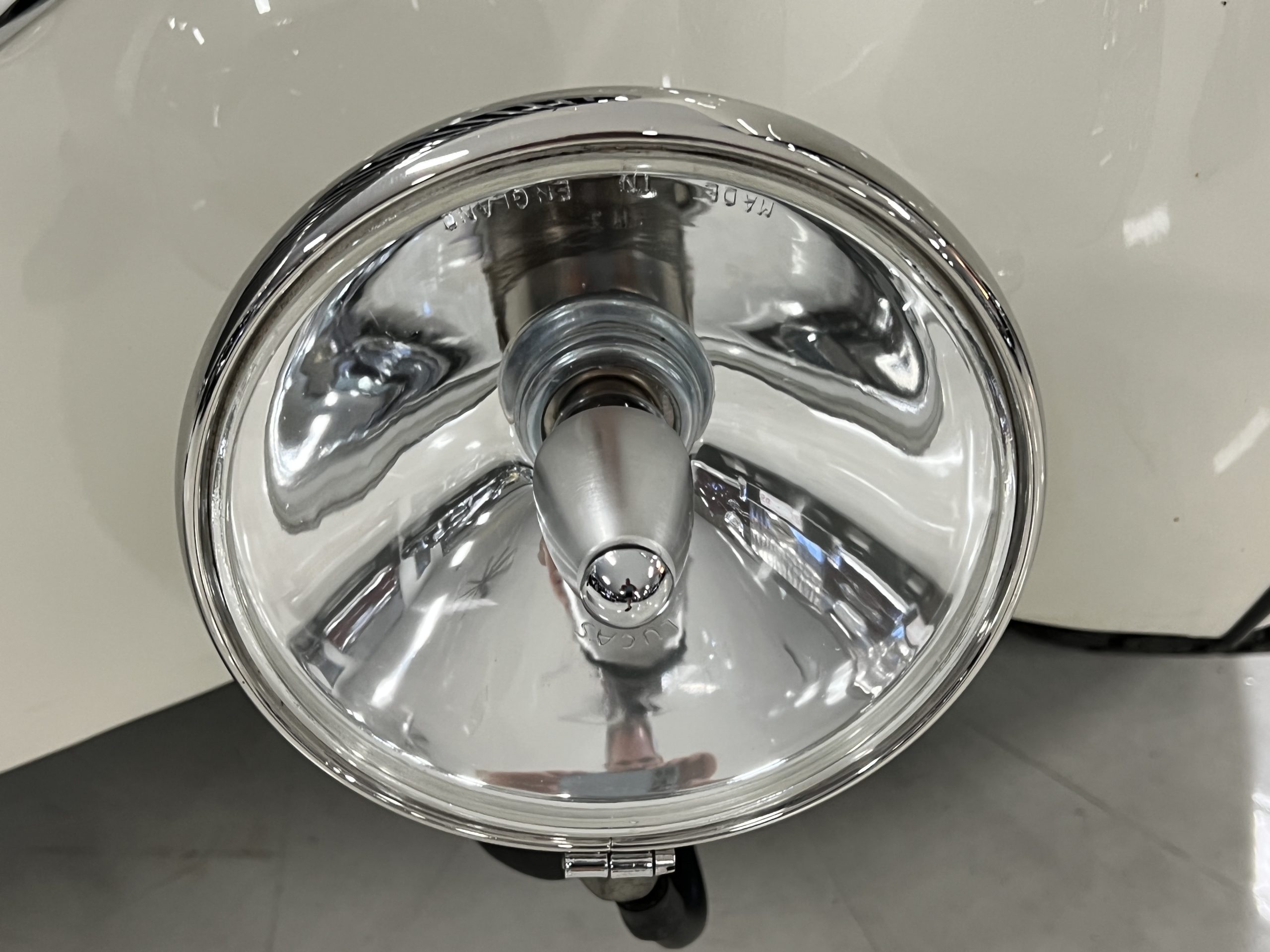 The livery is in the period correct Old English White. The upgraded gray painted 60-spoke wire wheels look great. The Lucas driving lights and deletion of the bumpers add to its visual appeal as well as making it look much like the 100S’s.