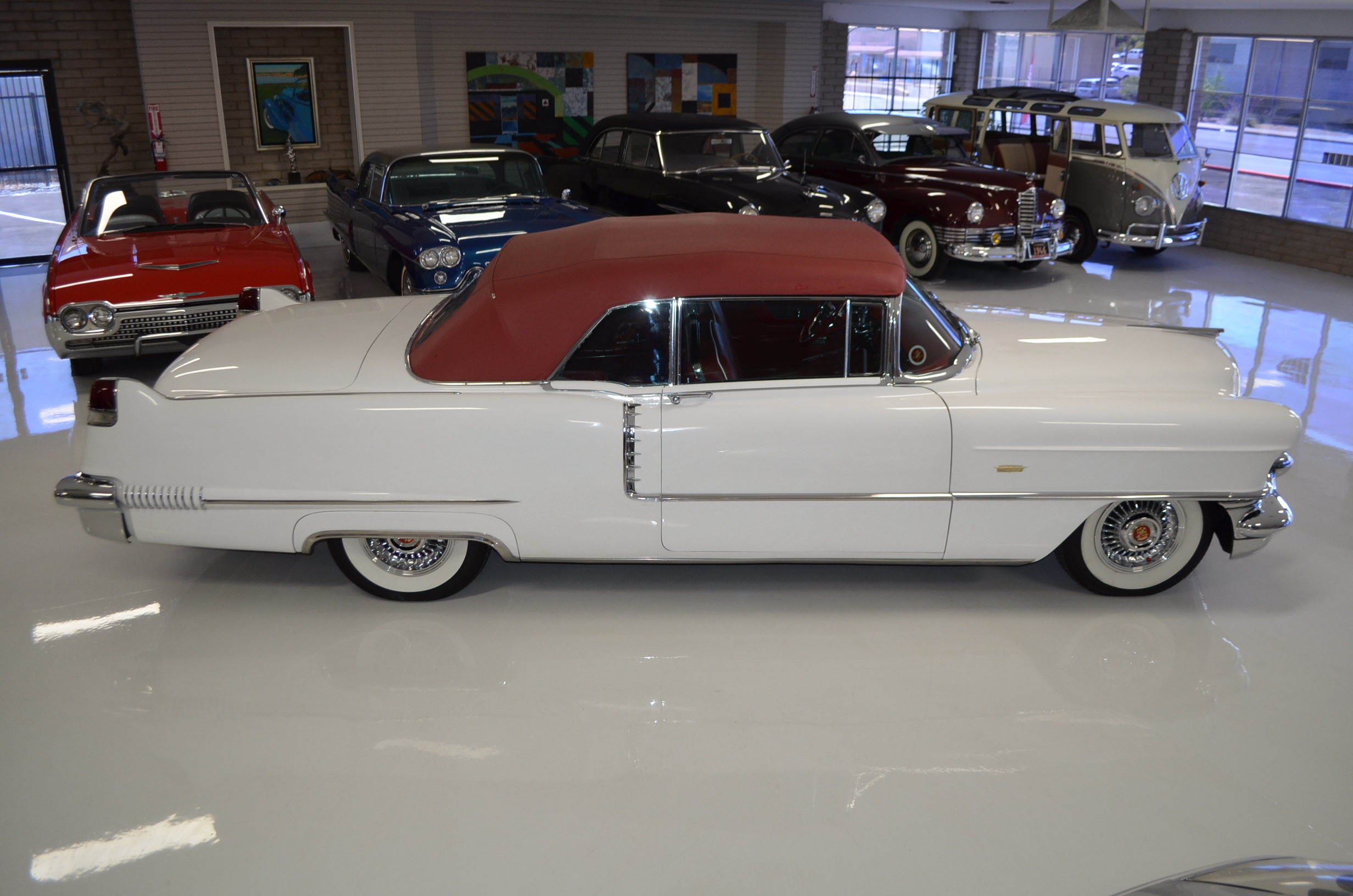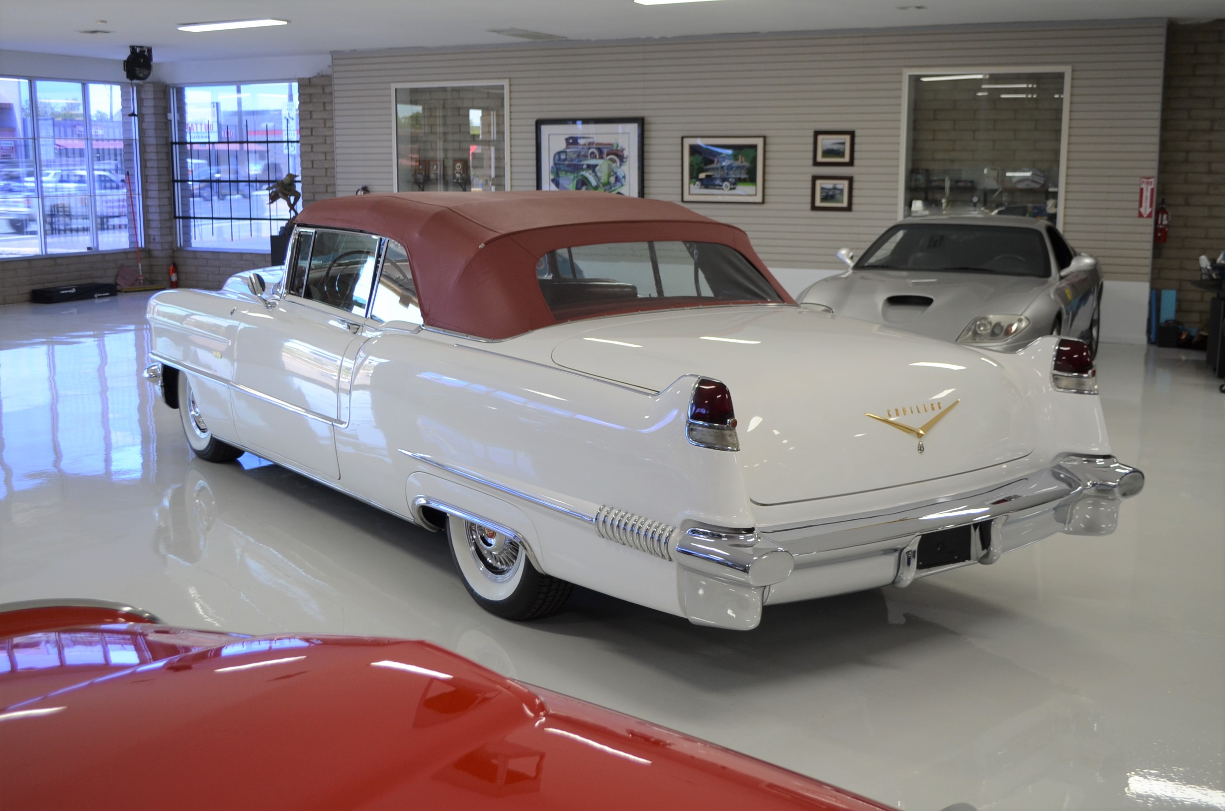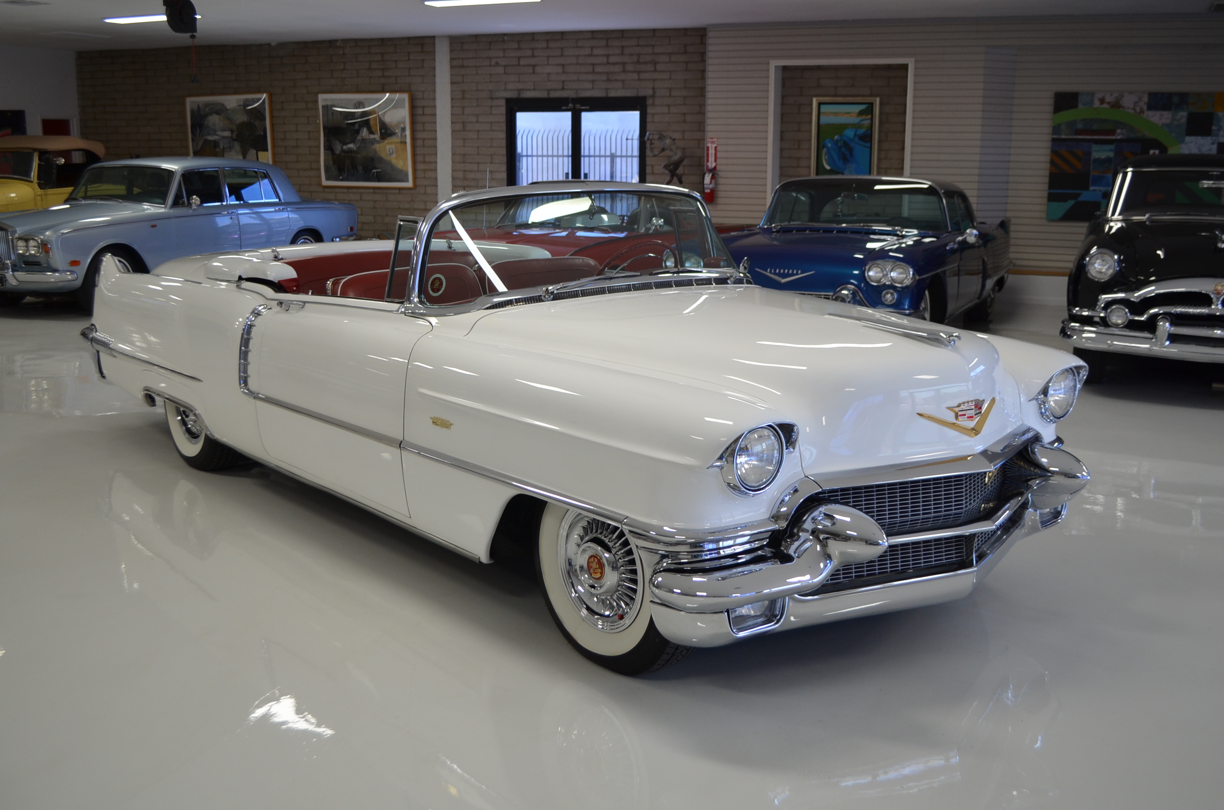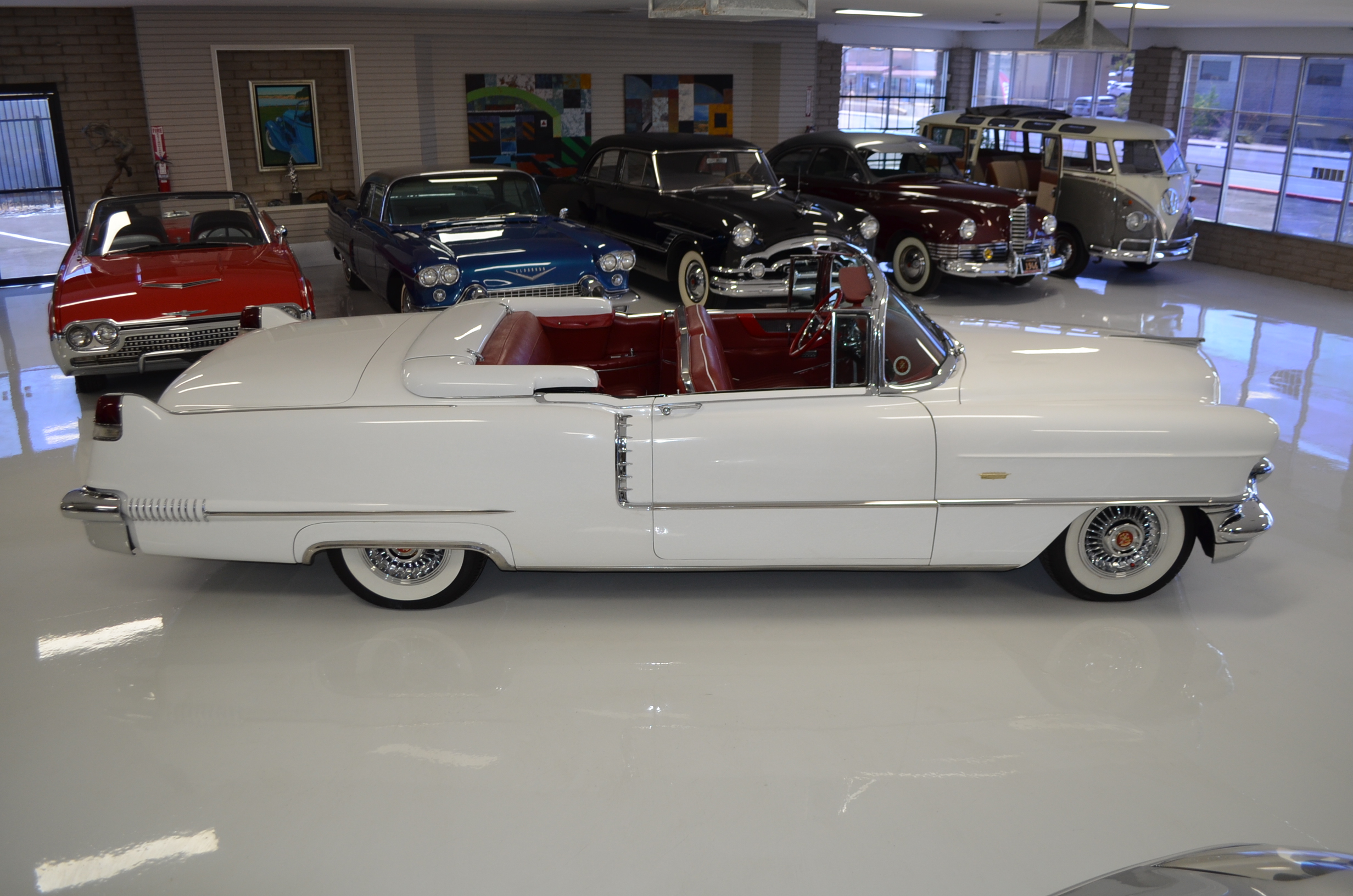 A beautiful older restoration that would be accepted at most concours events and is ready for tours. We love the white livery with the red convertible top and red leather interior. And the Saber wheels with Coker white wall radials give it a stunning look!