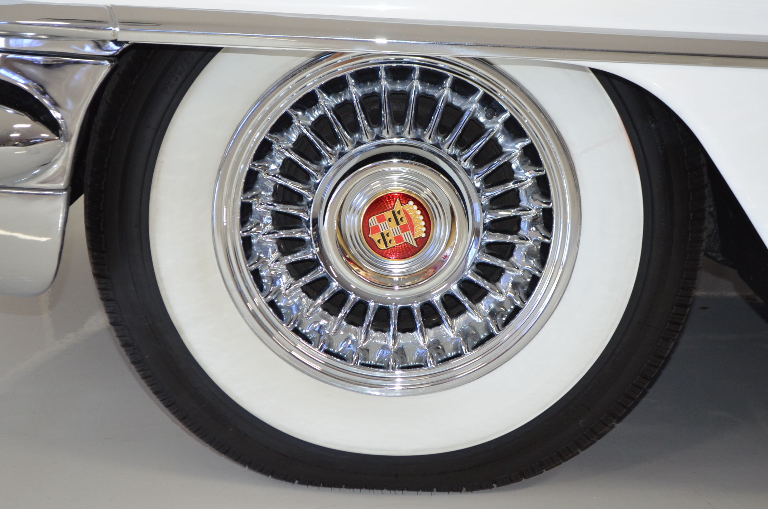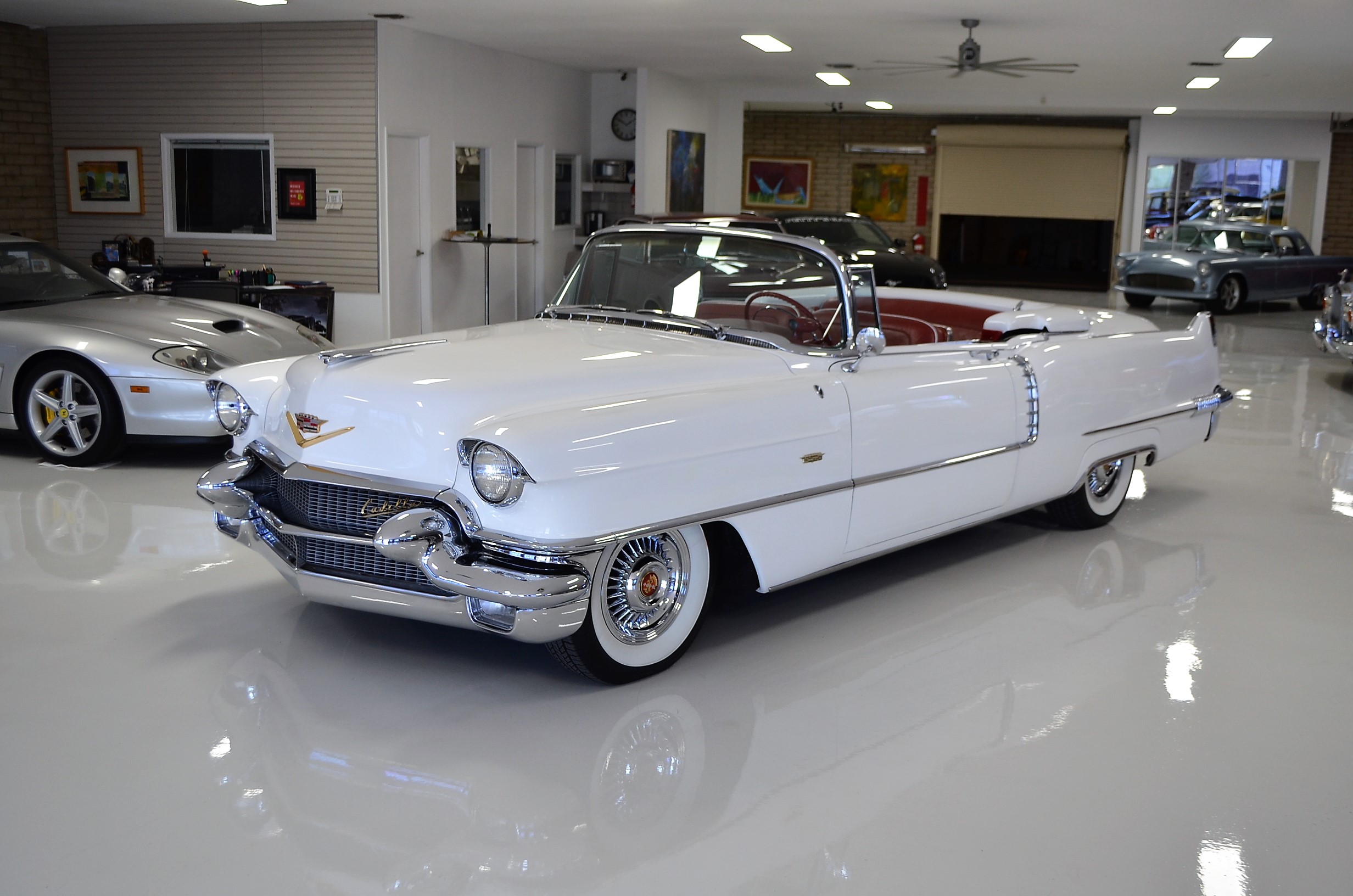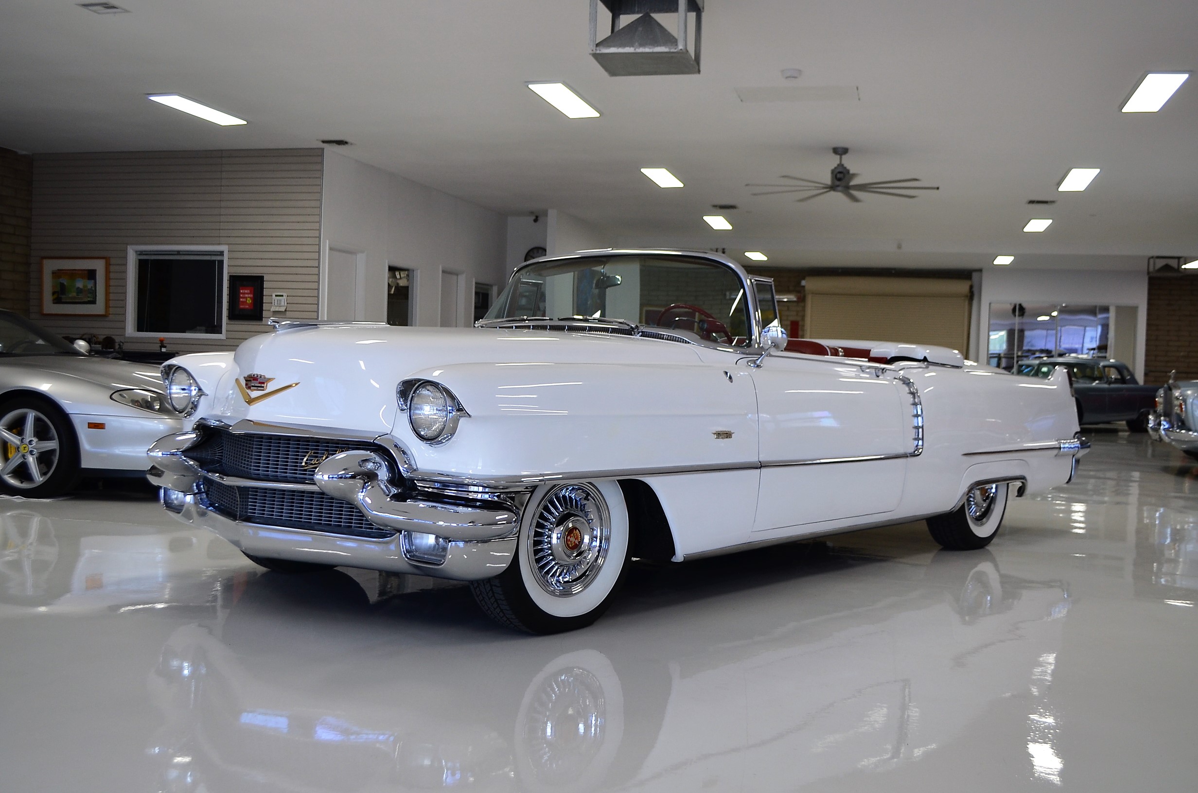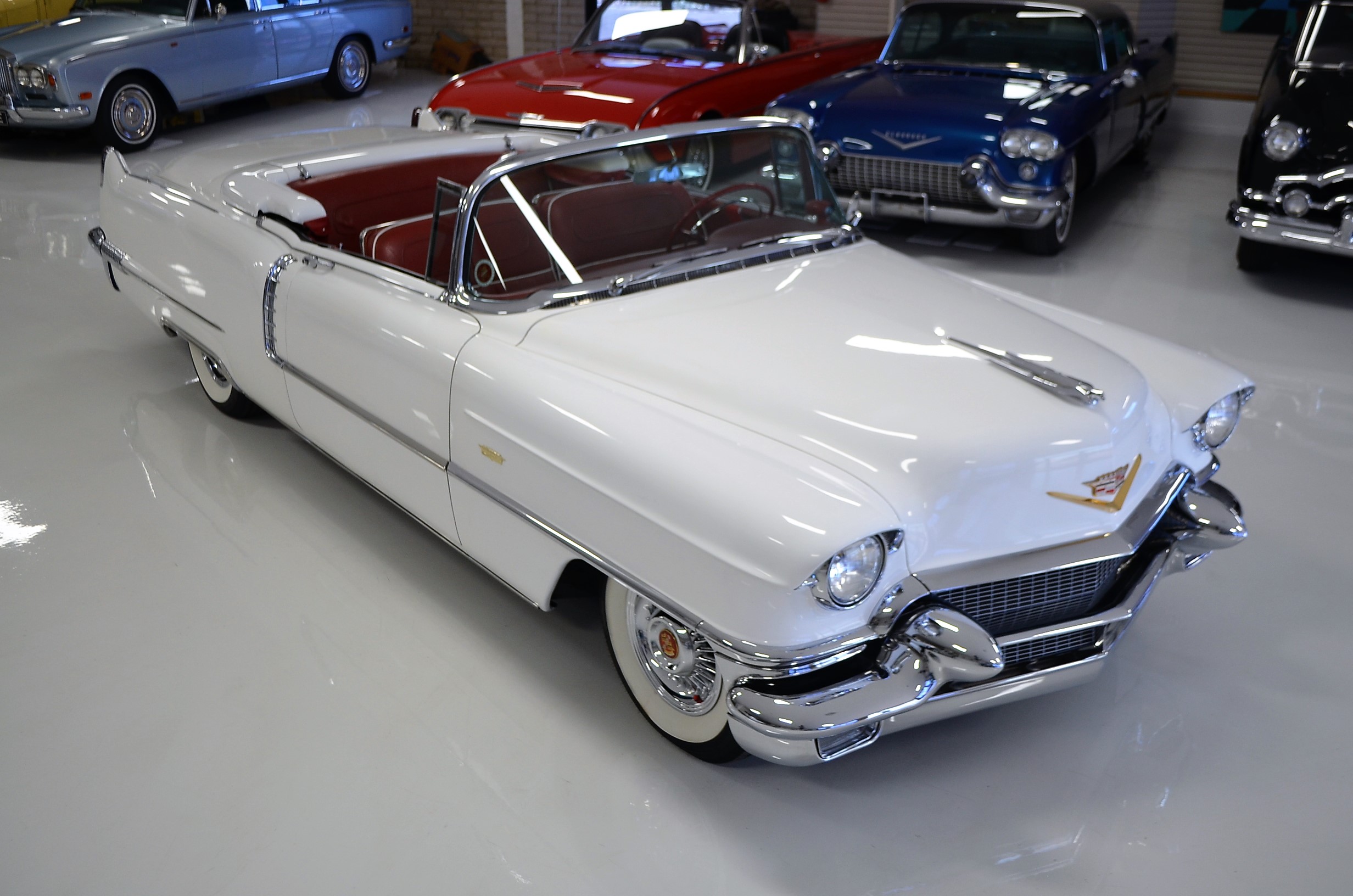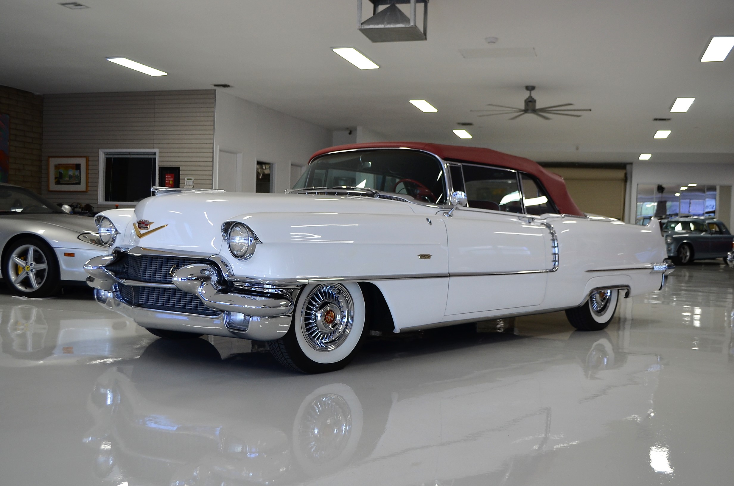 A beautiful older restoration that would be accepted at most concours events and is ready for tours. We love the white livery with the red convertible top and red leather interior. And the Saber wheels with Coker white wall radials give it a stunning look!