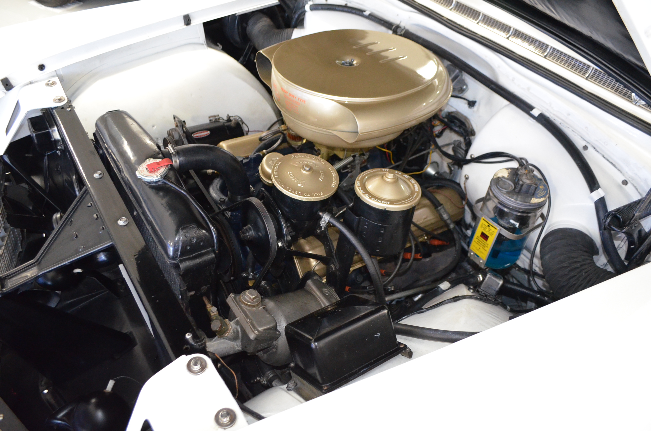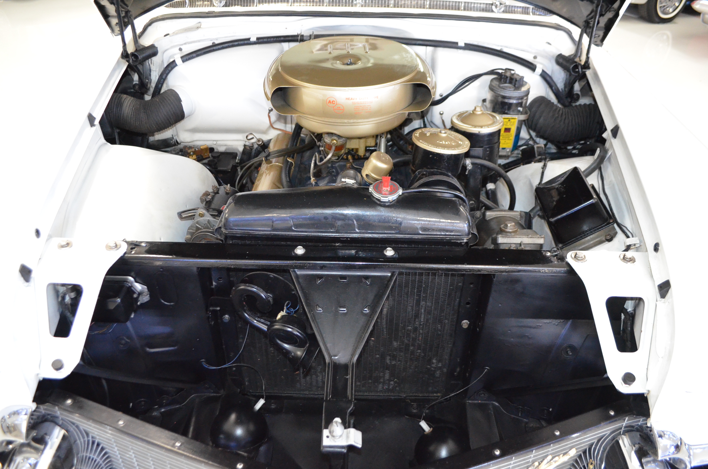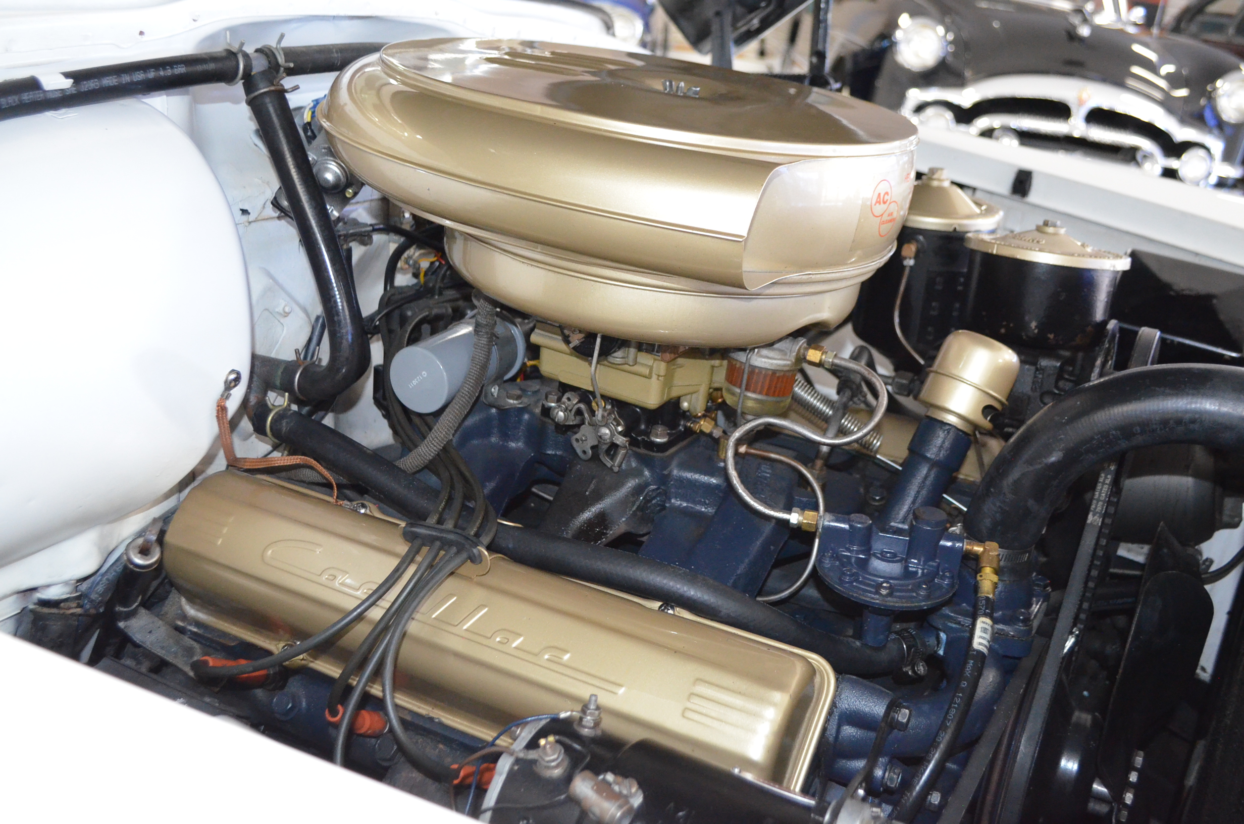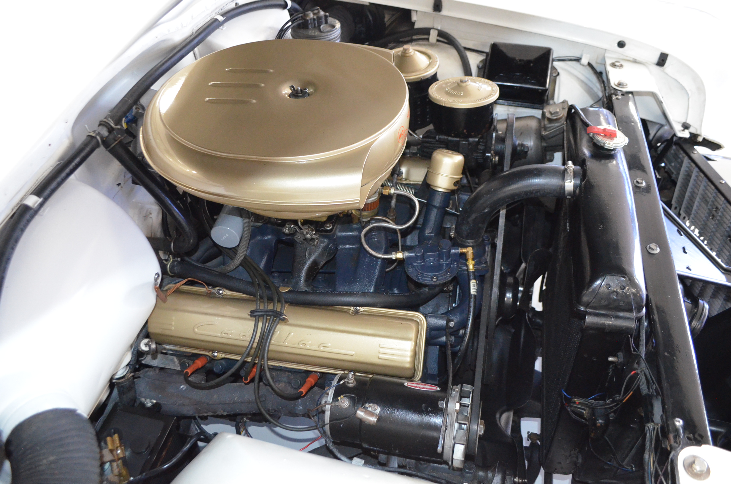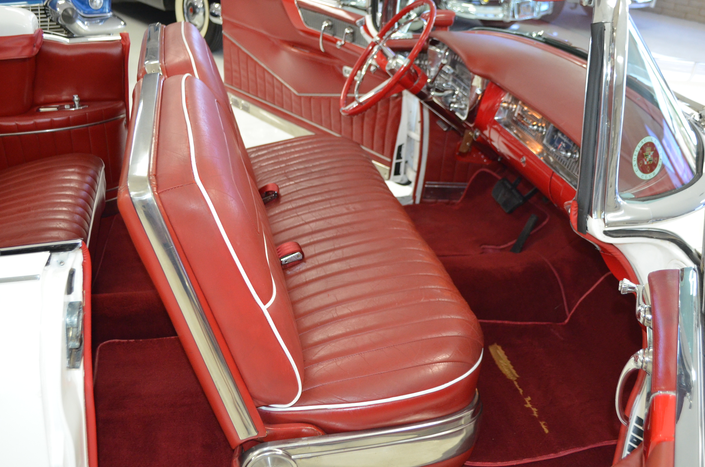 This was said to be an Arizona car that was sold at the Barrett-Jackson auction about 35 years ago. It had been fully restored mechanically and cosmetically. The buyer was a collector from Denver, CO who enjoyed the car for the next 30 years. For much of that time the car was stored and not driven. The Cadillac was then sold to the present owner, Ron Clubine from Colorado, who is quite an expert on 1956 Cadillacs. He recommissioned the car after acquiring it, including carpets, rebuilding the convertible top mechanisms and such. He also freshened the engine detailing, which is rather stunning in its current form.