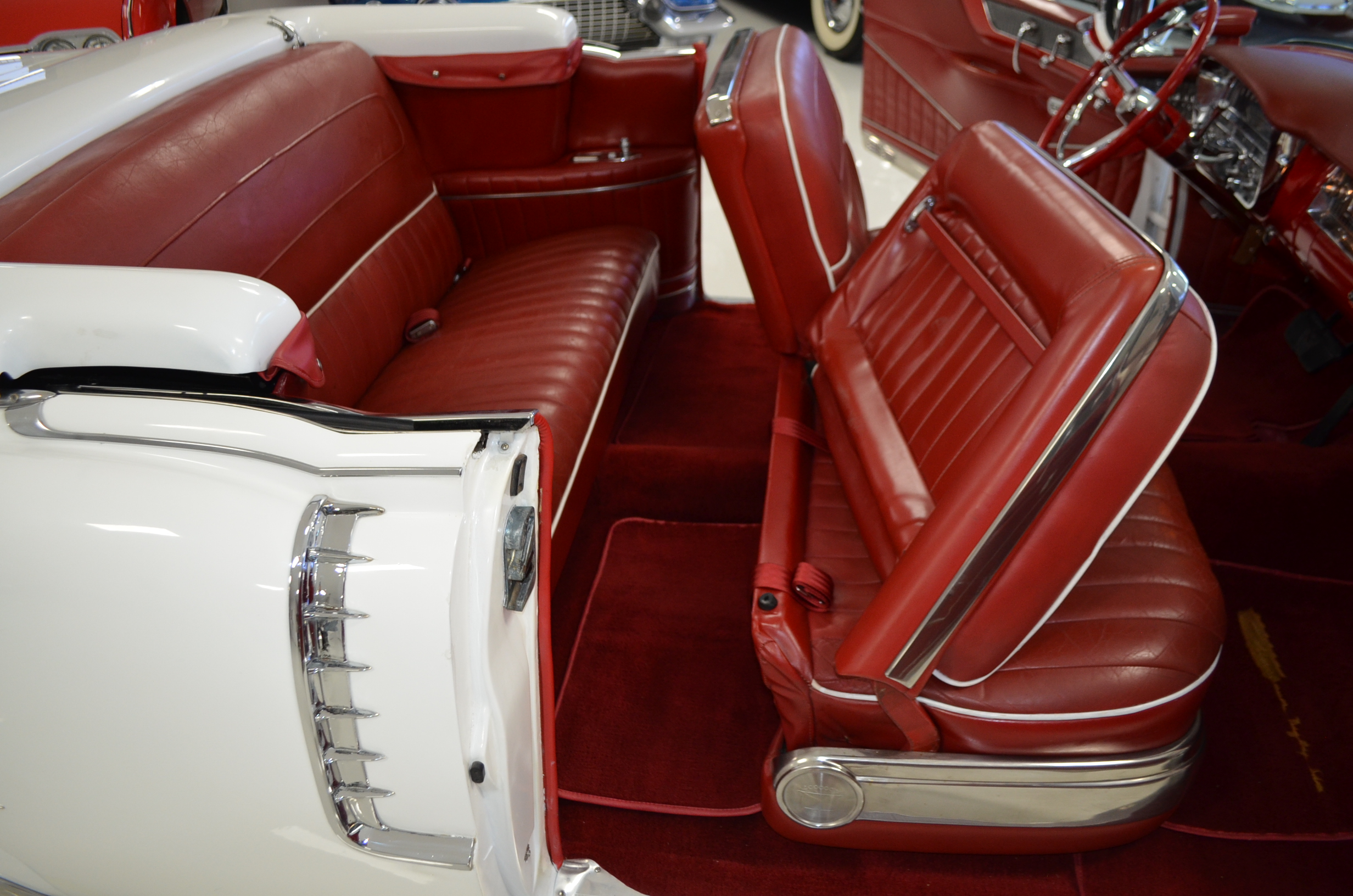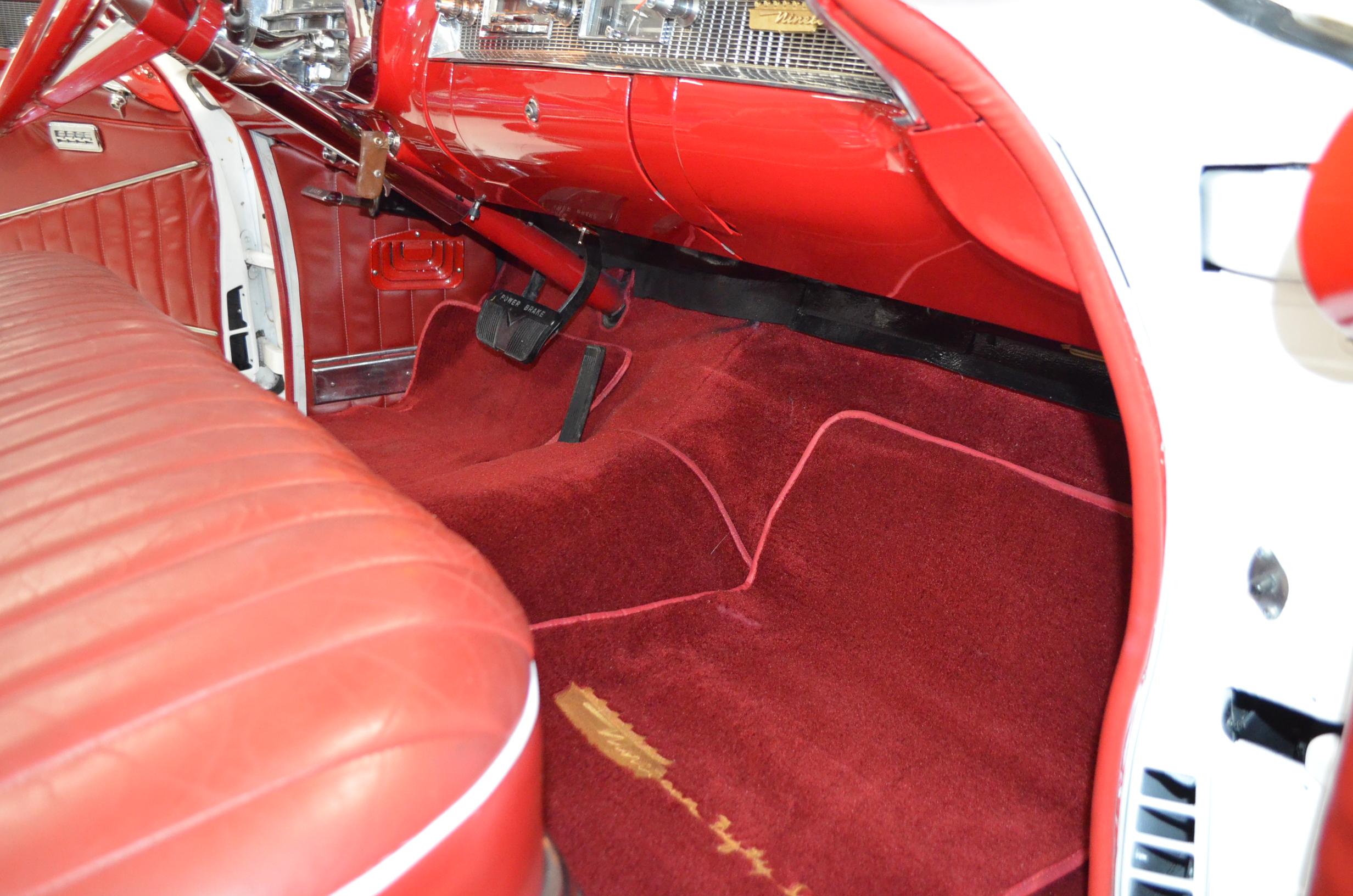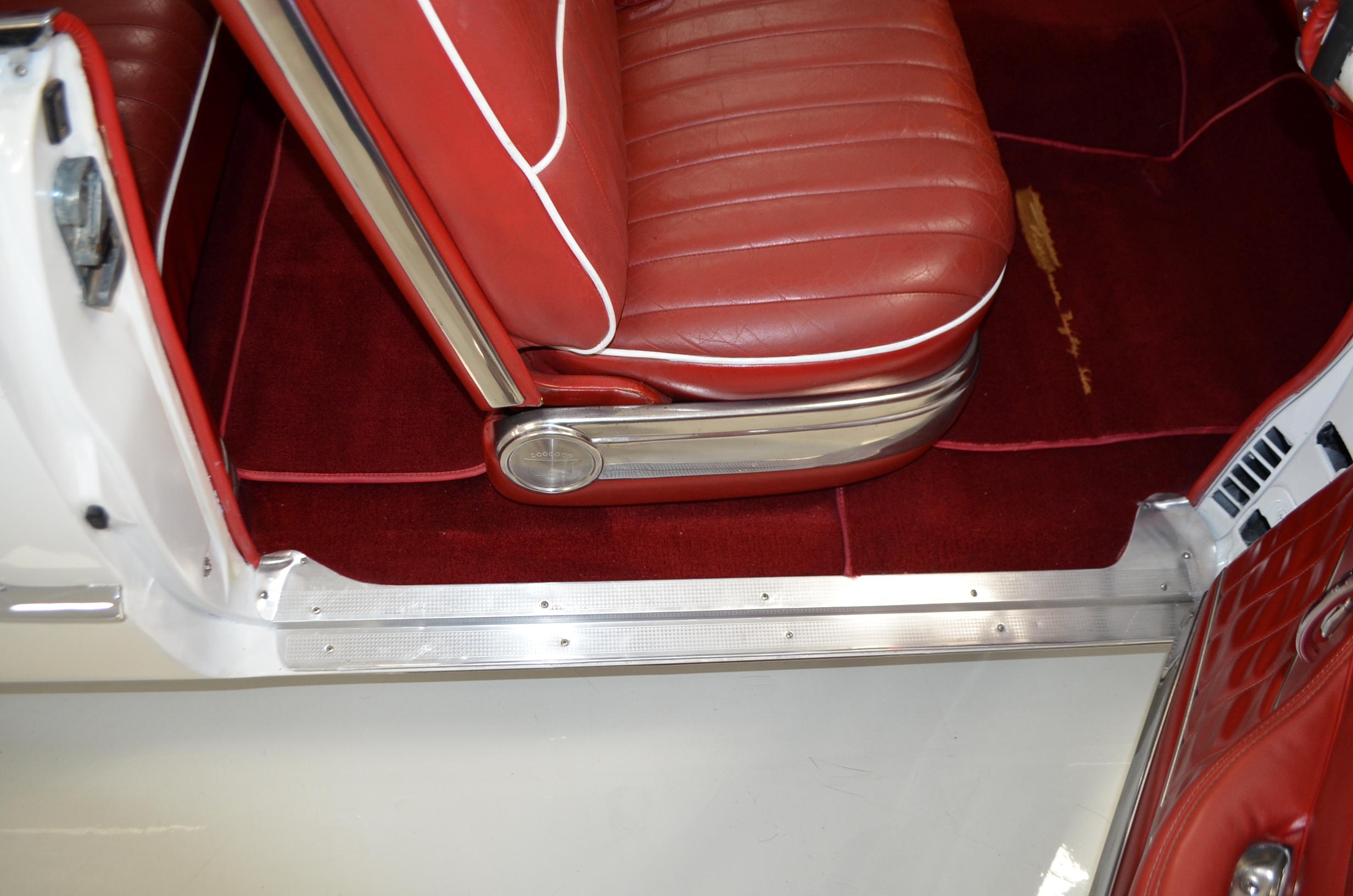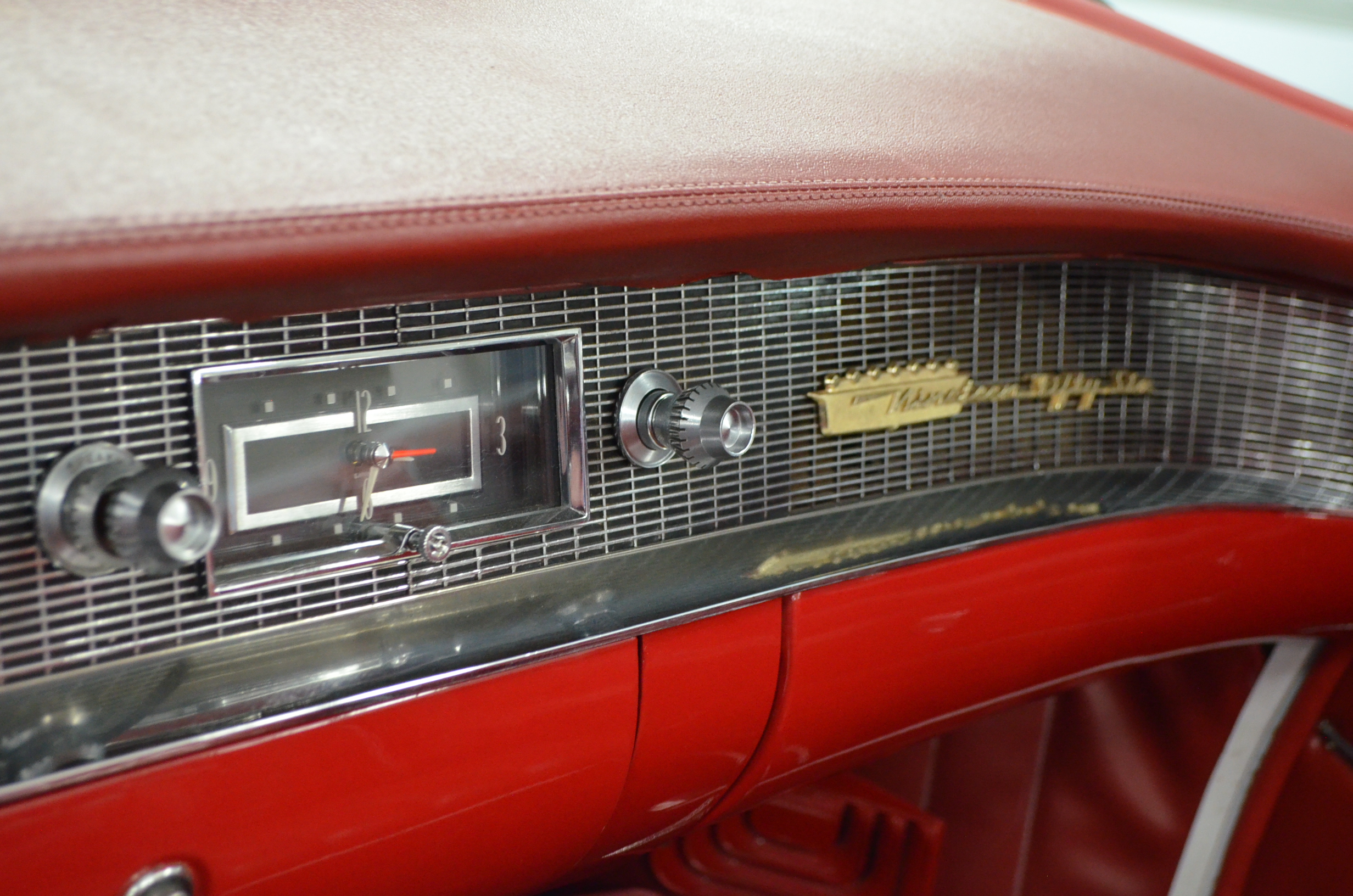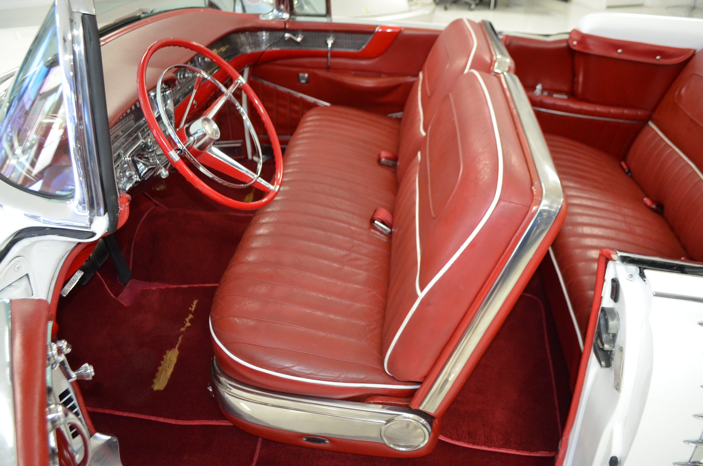 The carpets are new and in excellent condition. The red leather is older and showing cracks. There are no rips or holes, just the cracking from age. The leather is very soft and supple. The instruments are gorgeous and really complete the 1950’s look for the interior.