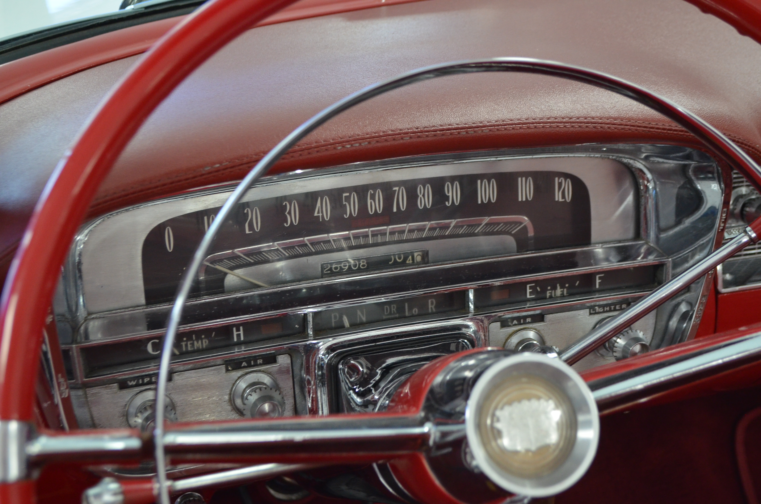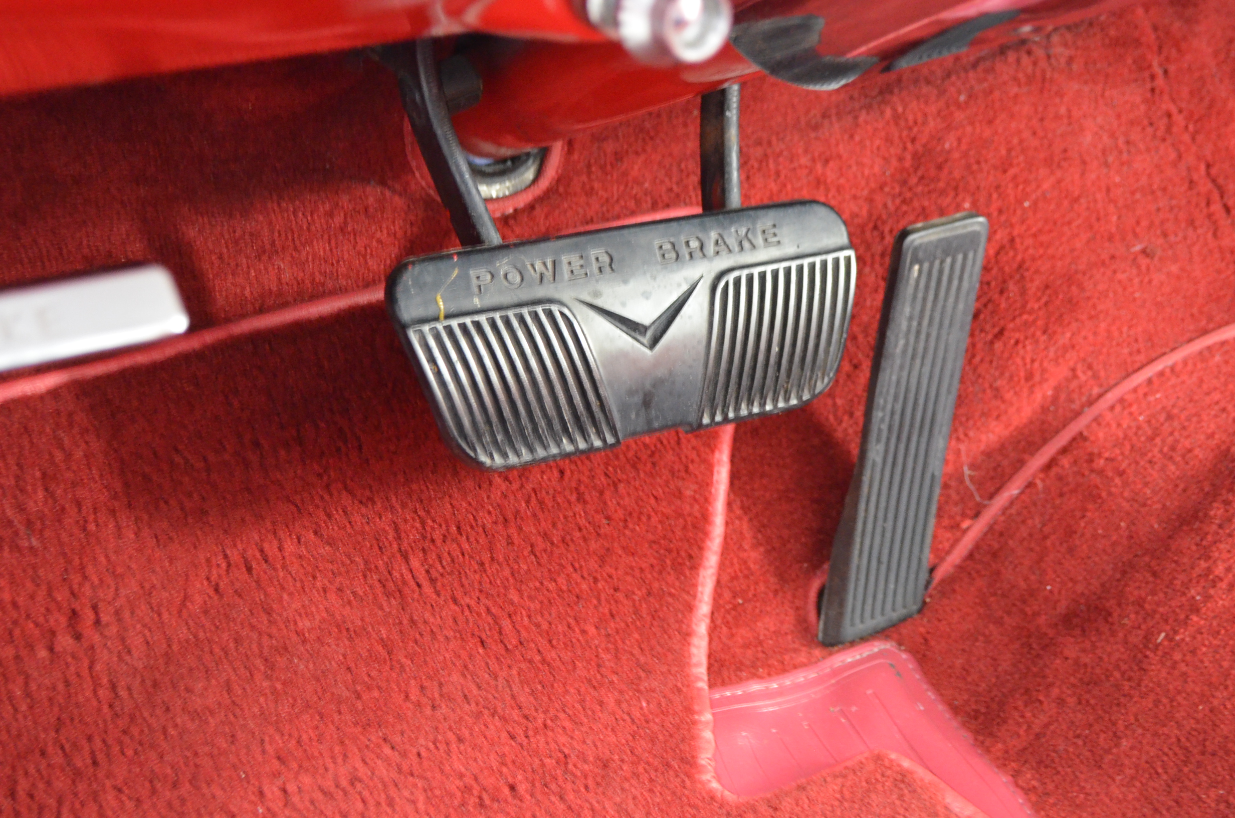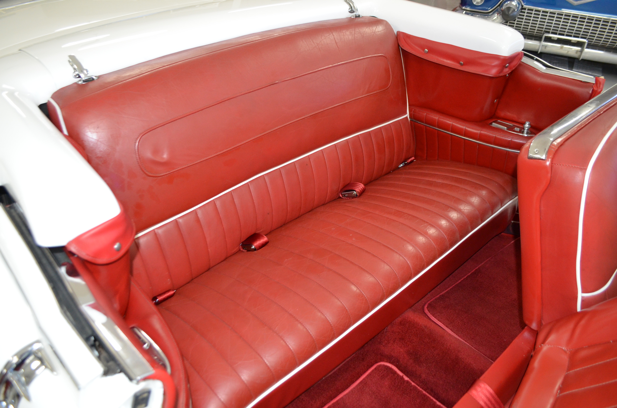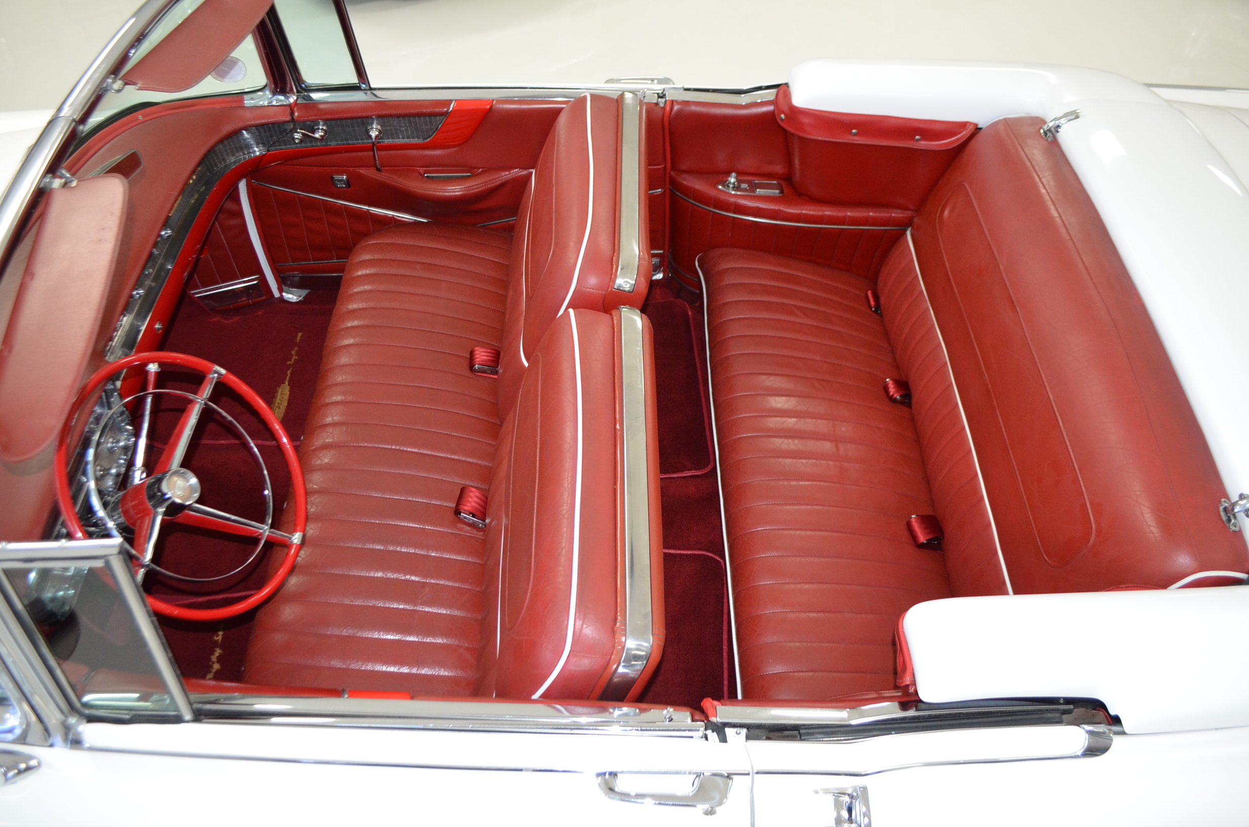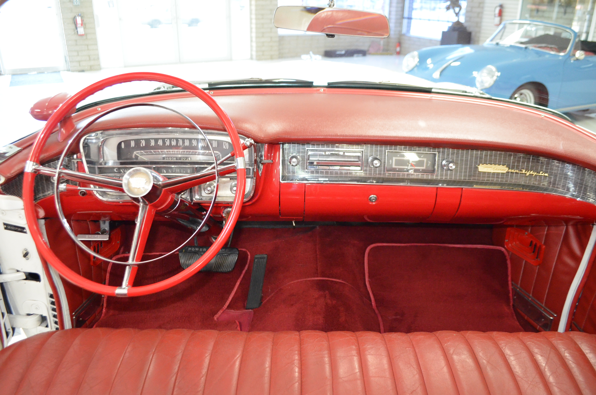 The carpets are new and in excellent condition. The red leather is older and showing cracks. There are no rips or holes, just the cracking from age. The leather is very soft and supple. The instruments are gorgeous and really complete the 1950’s look for the interior.