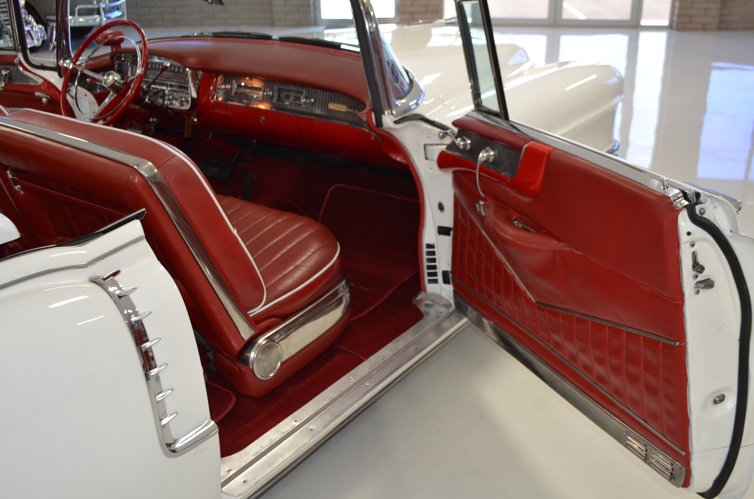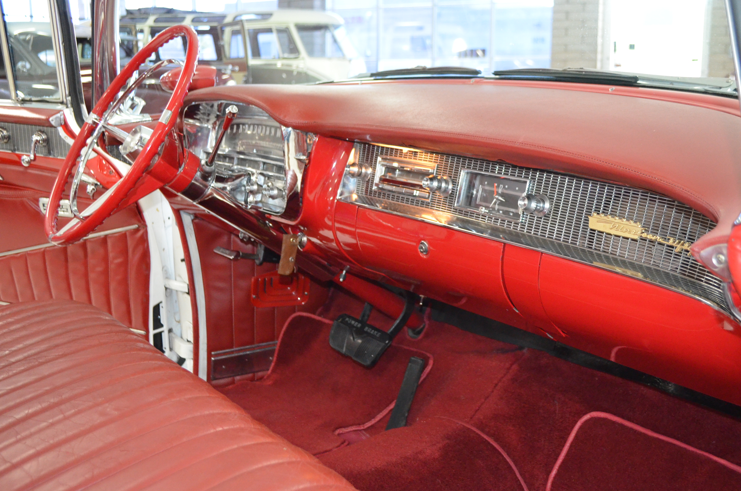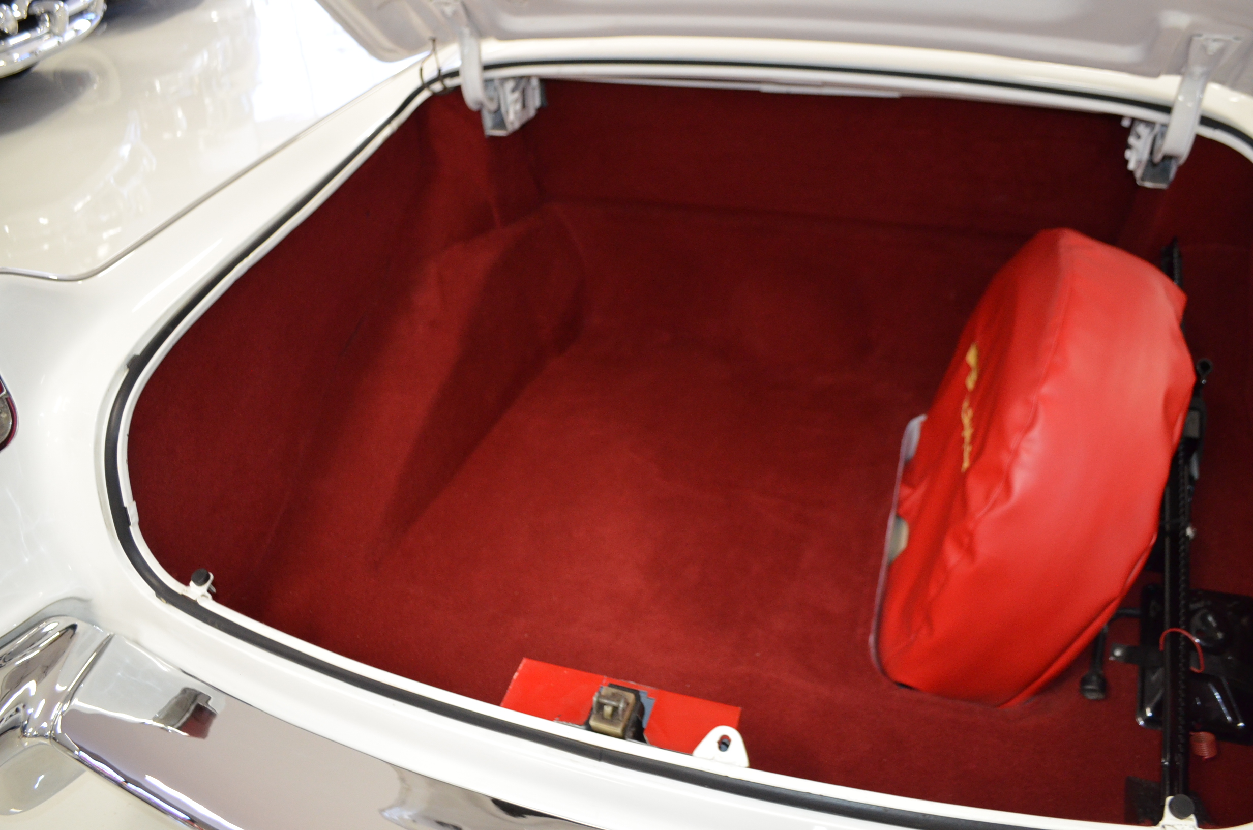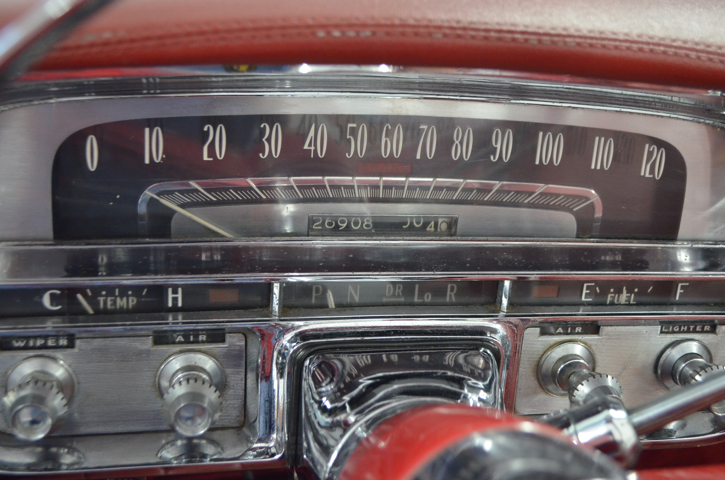 The carpets are new and in excellent condition. The red leather is older and showing cracks. There are no rips or holes, just the cracking from age. The leather is very soft and supple. The instruments are gorgeous and really complete the 1950’s look for the interior.