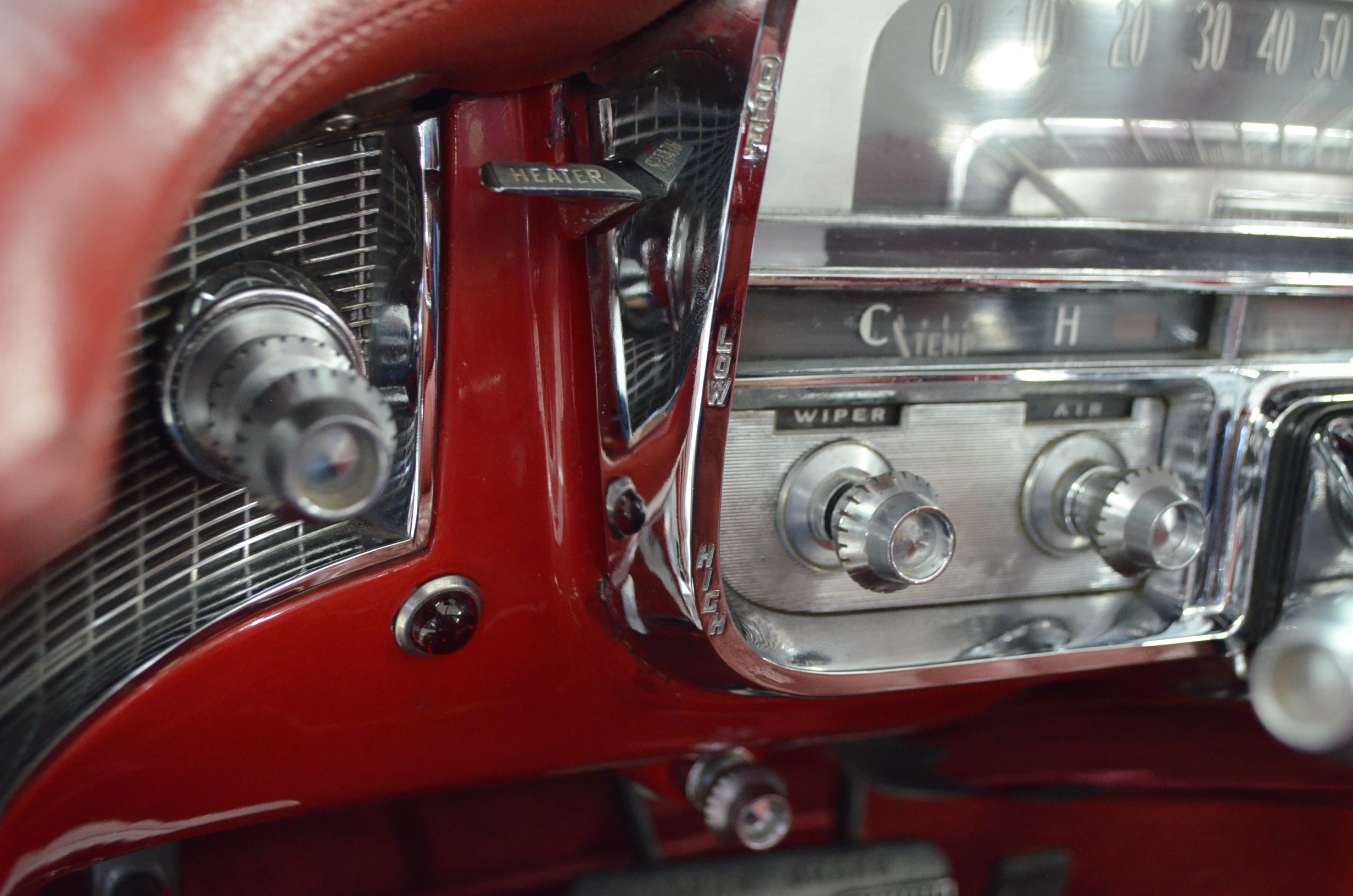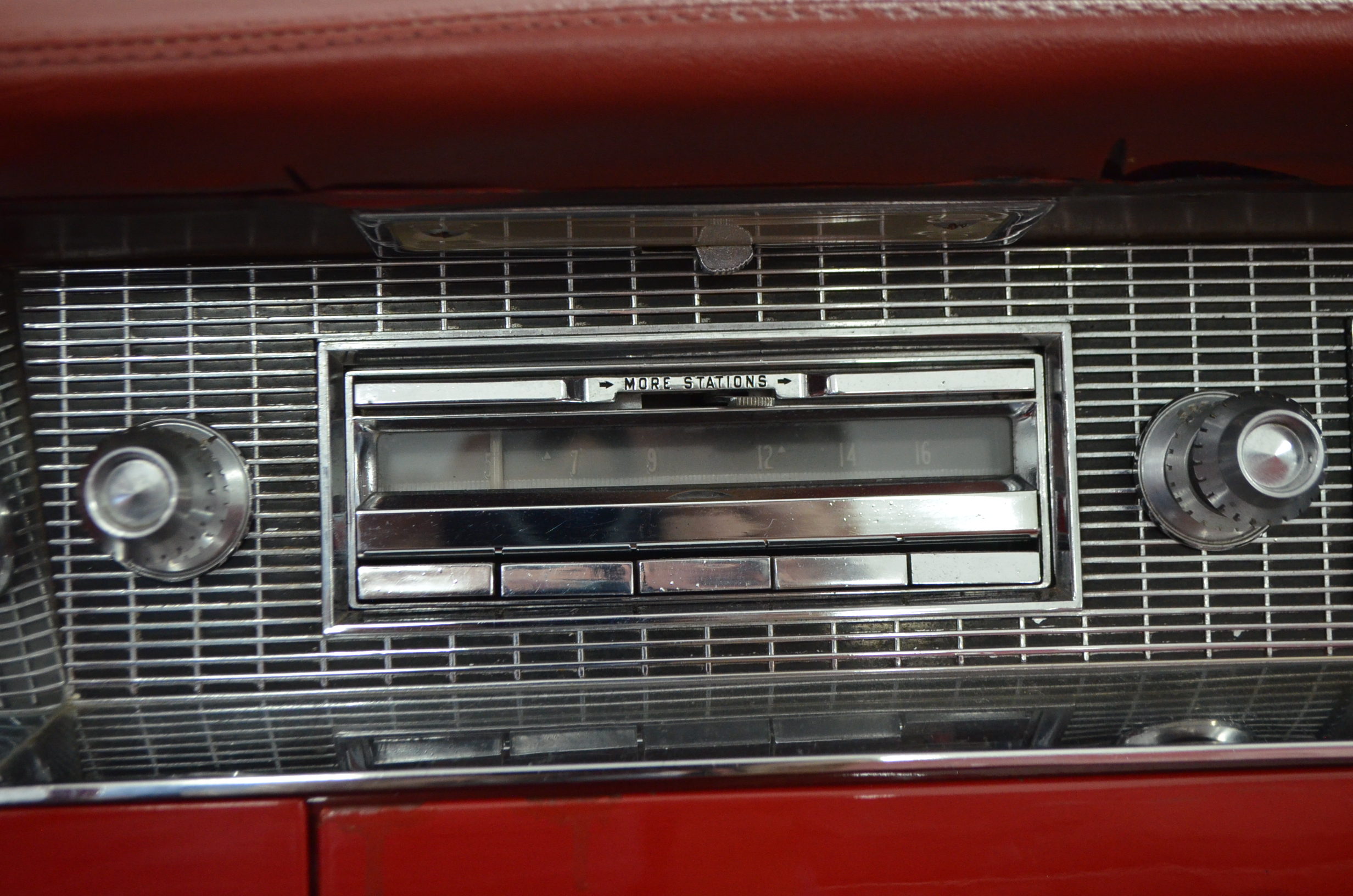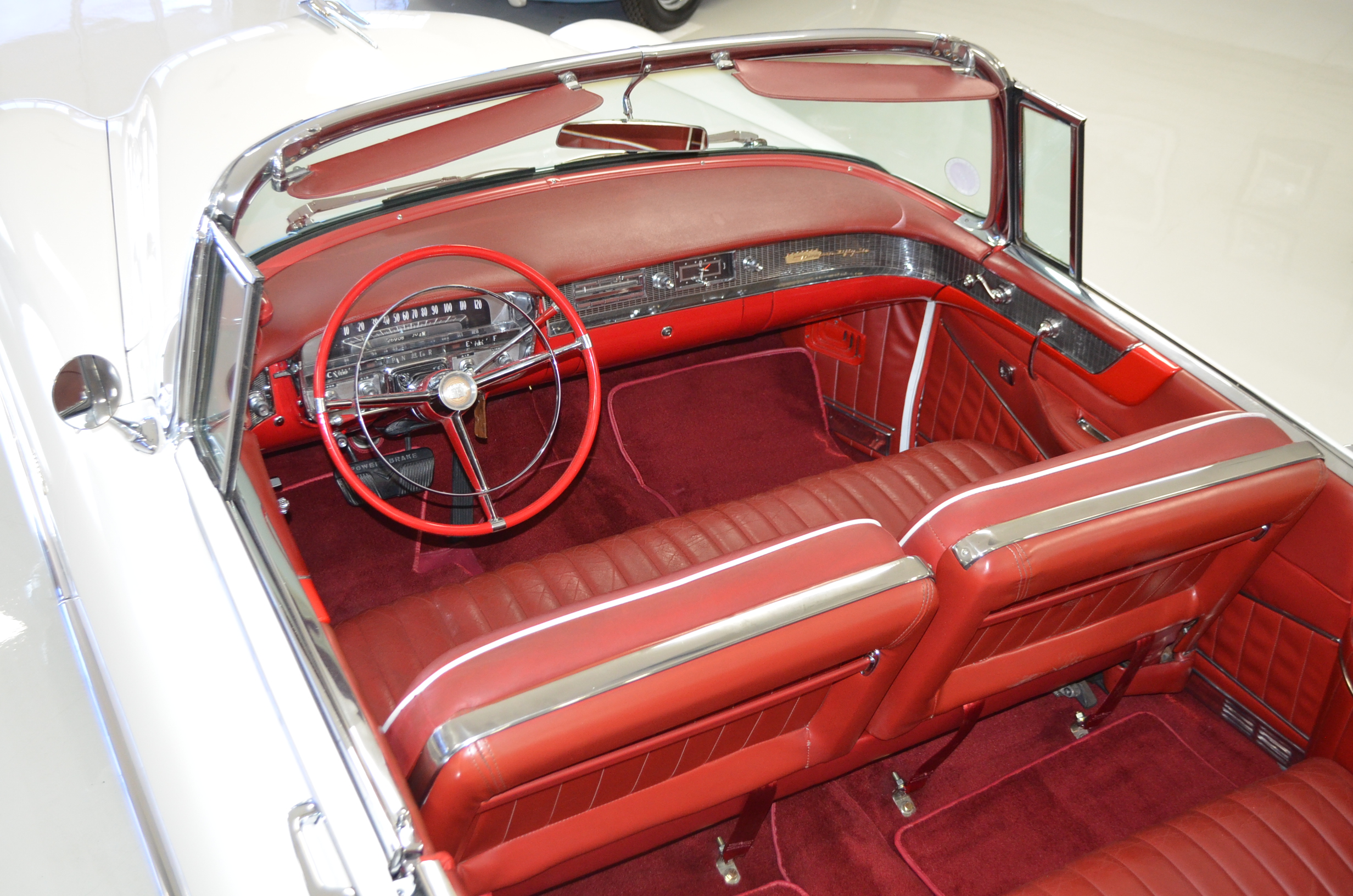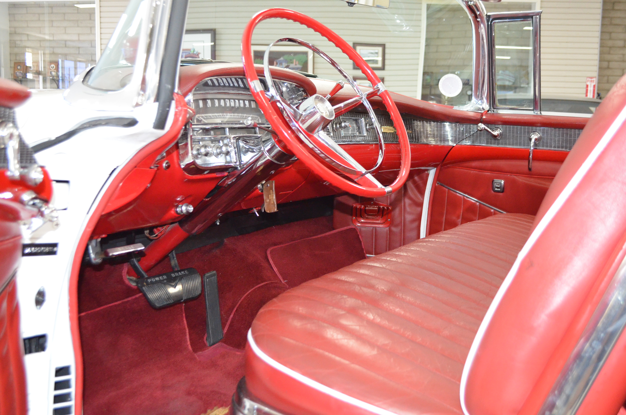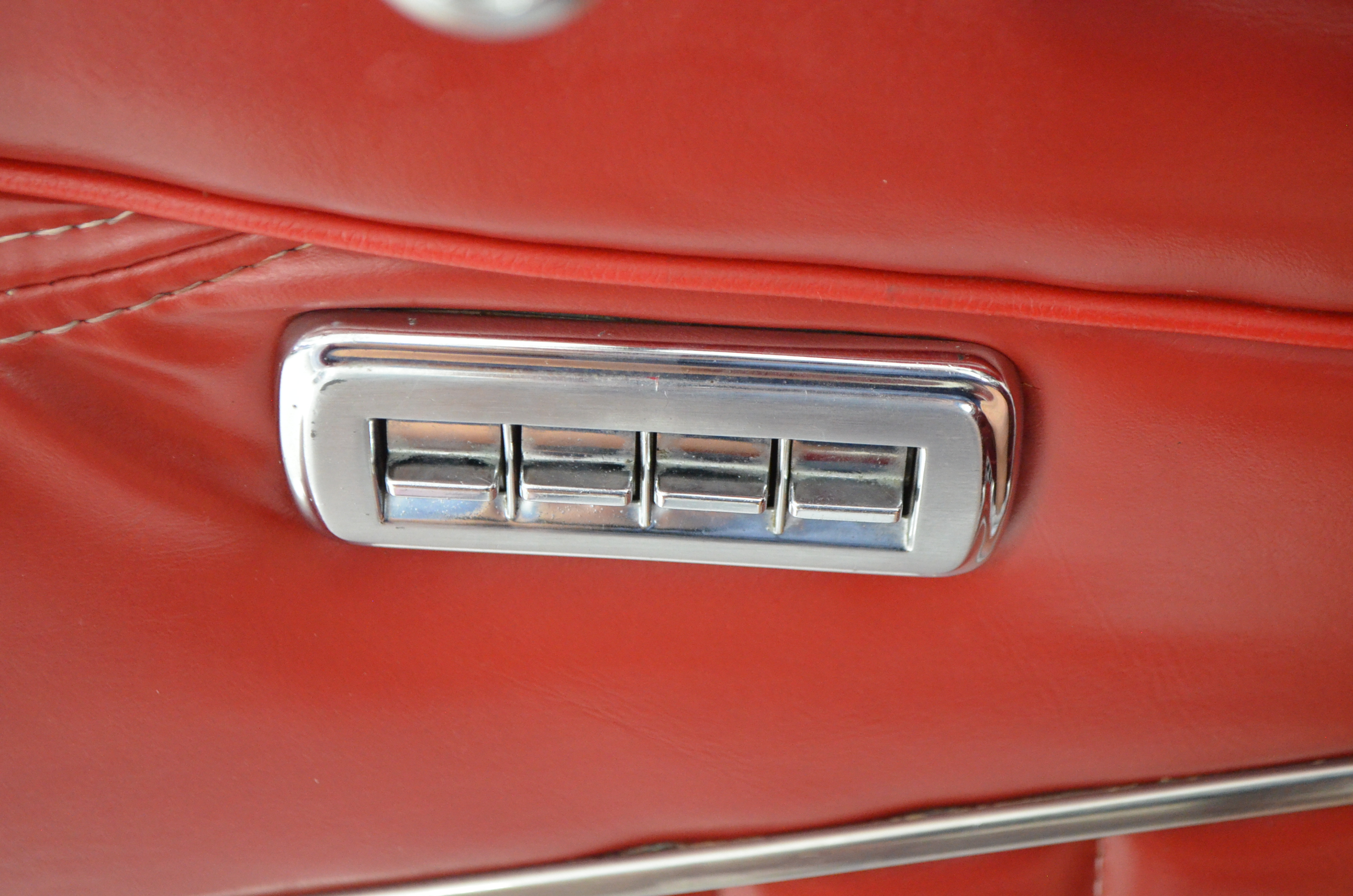 The carpets are new and in excellent condition. The red leather is older and showing cracks. There are no rips or holes, just the cracking from age. The leather is very soft and supple. The instruments are gorgeous and really complete the 1950’s look for the interior.