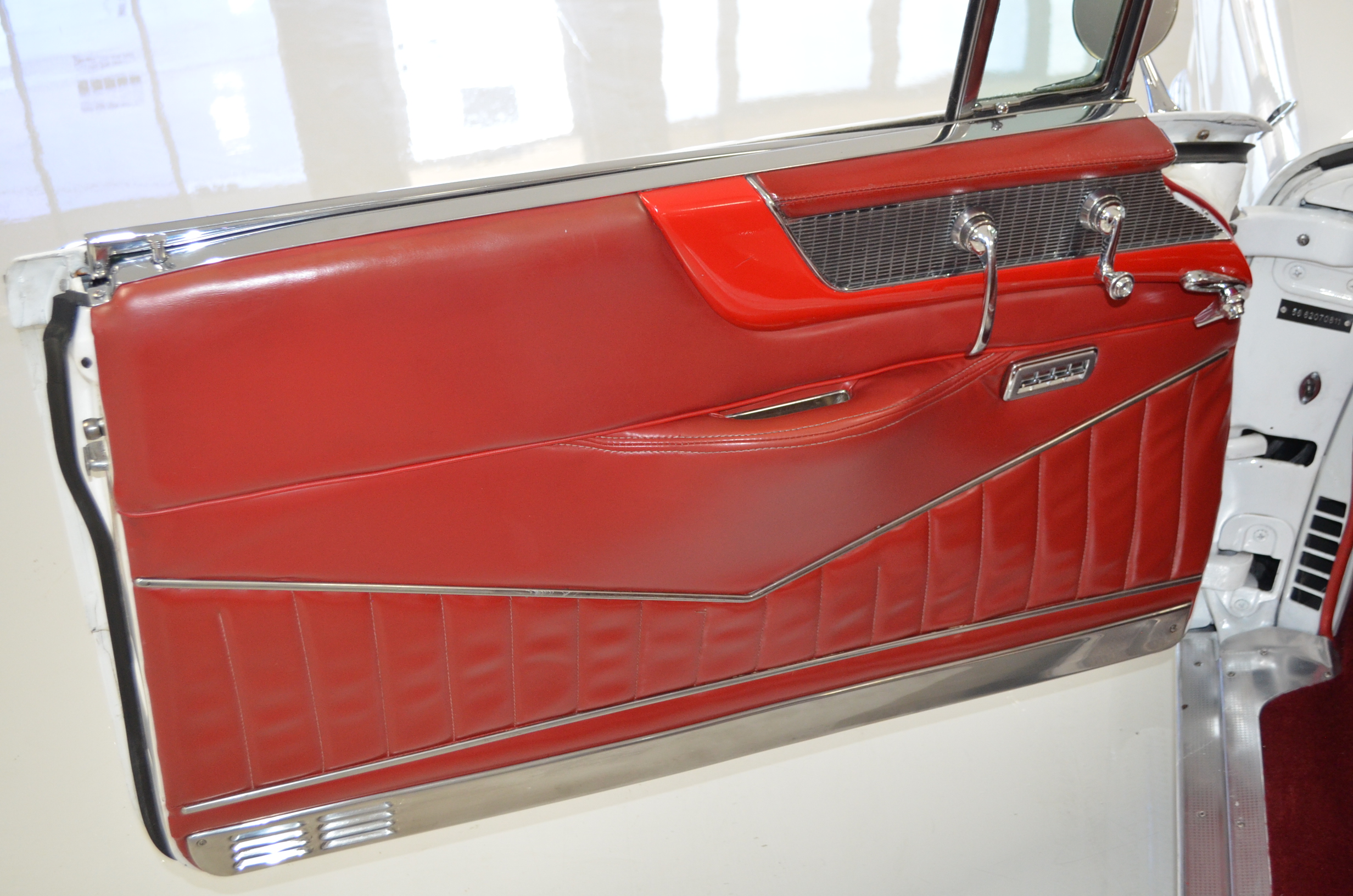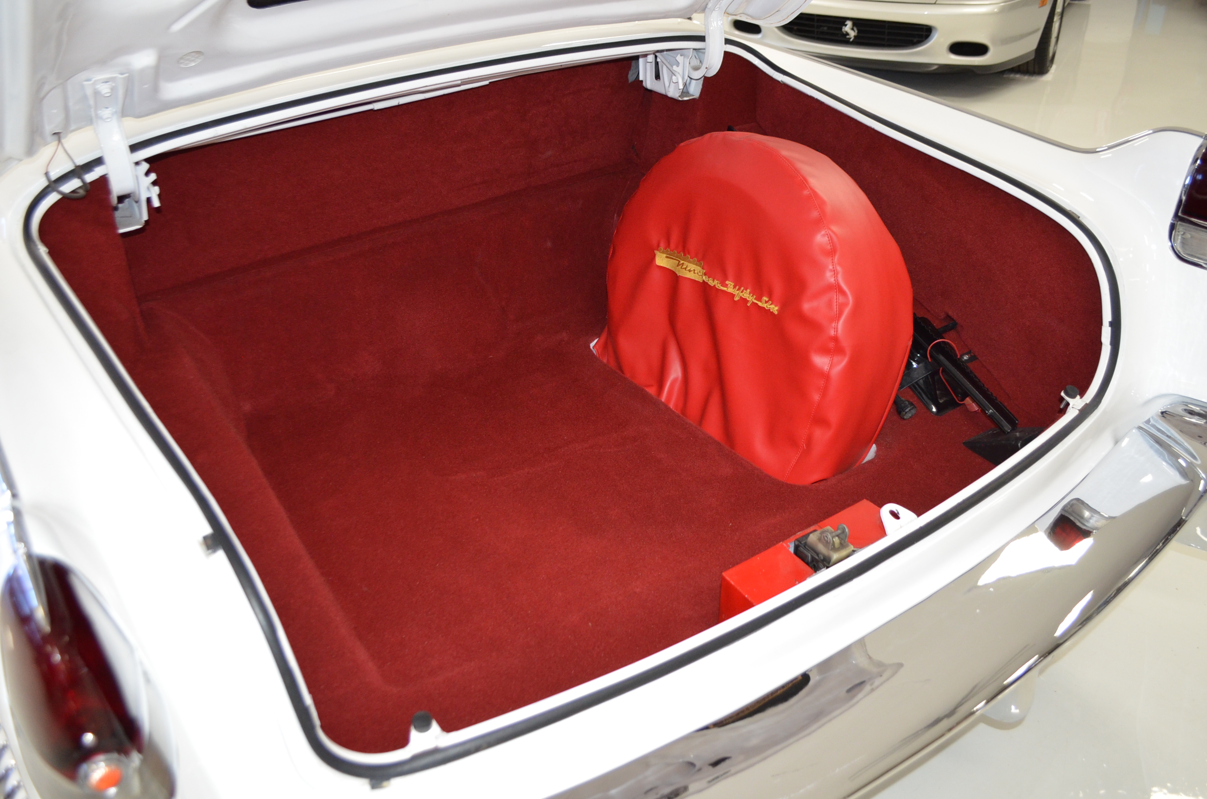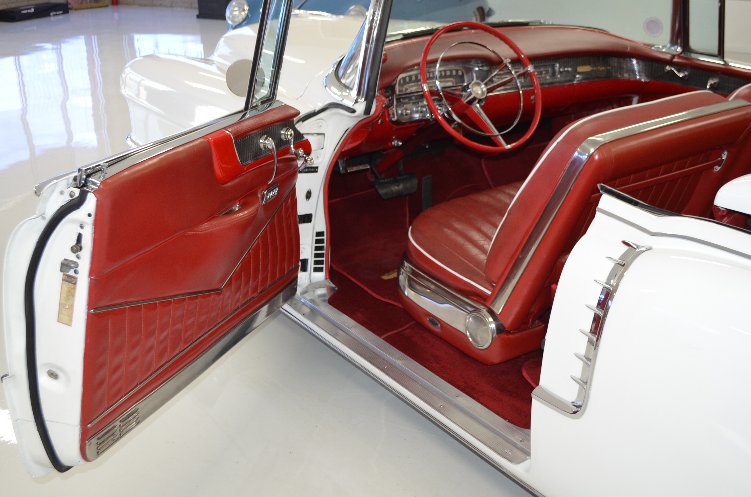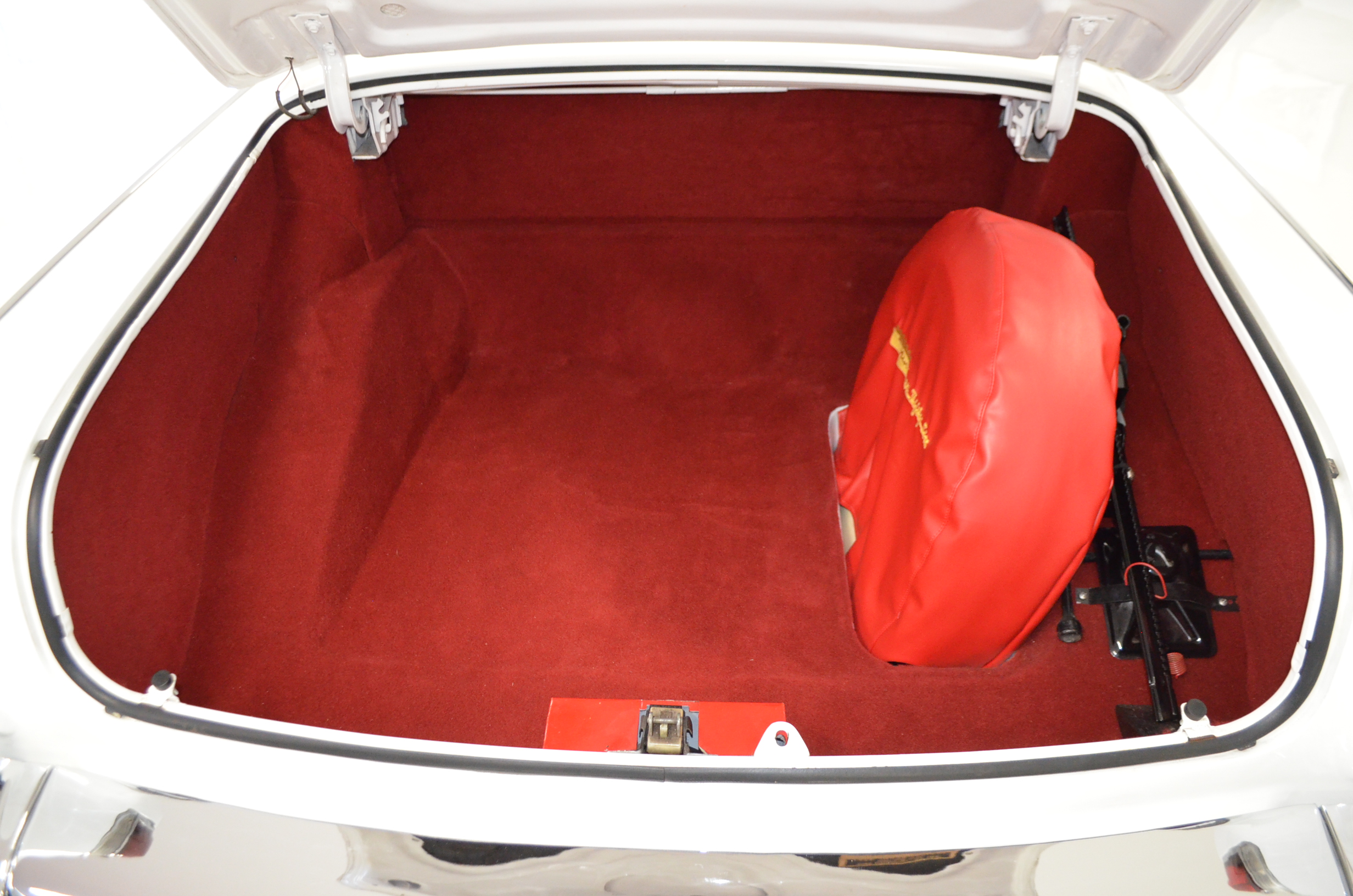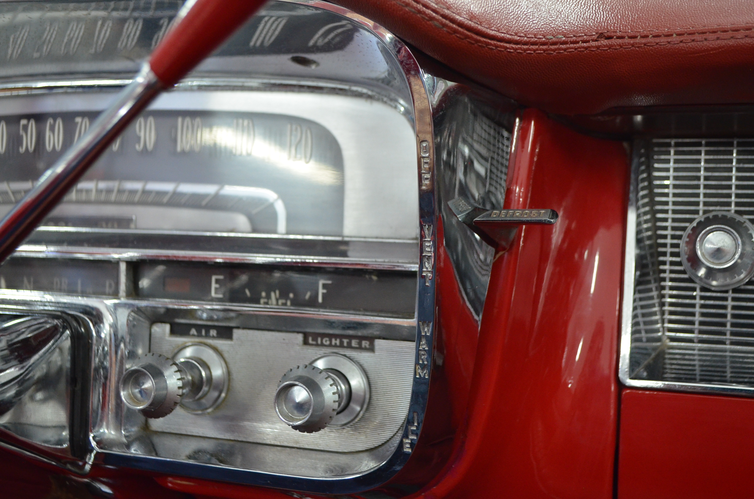 The carpets are new and in excellent condition. The red leather is older and showing cracks. There are no rips or holes, just the cracking from age. The leather is very soft and supple. The instruments are gorgeous and really complete the 1950’s look for the interior.