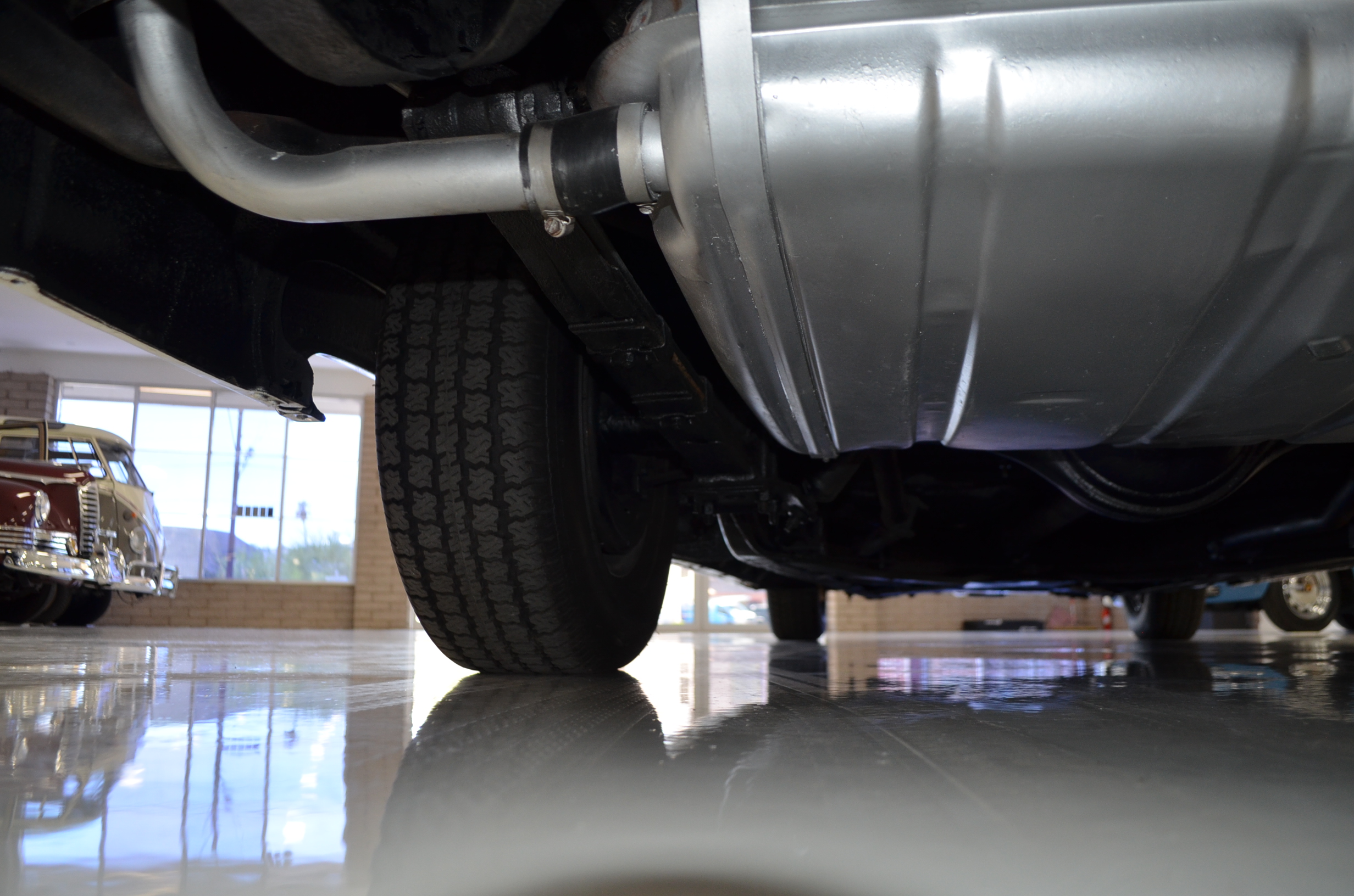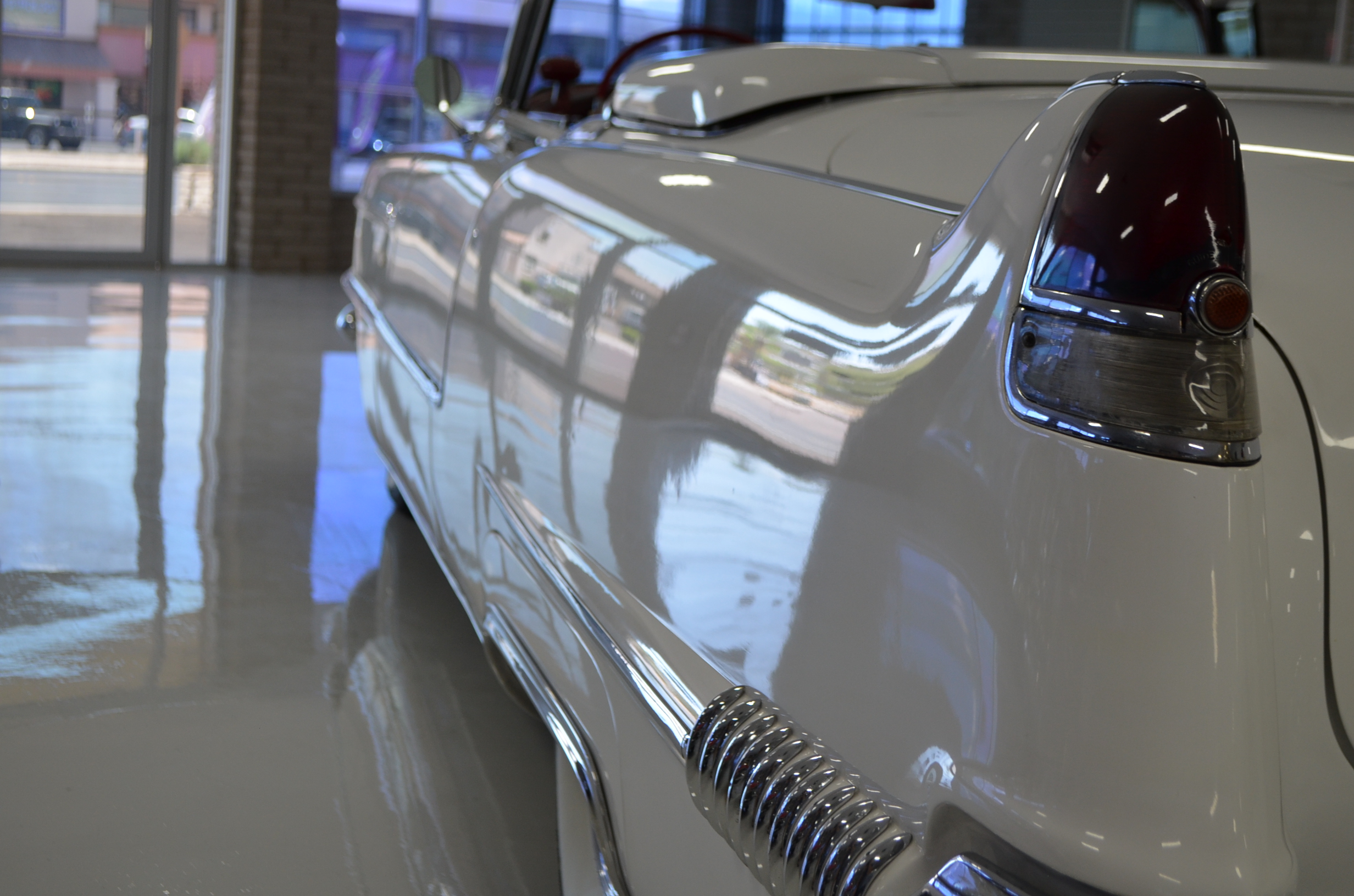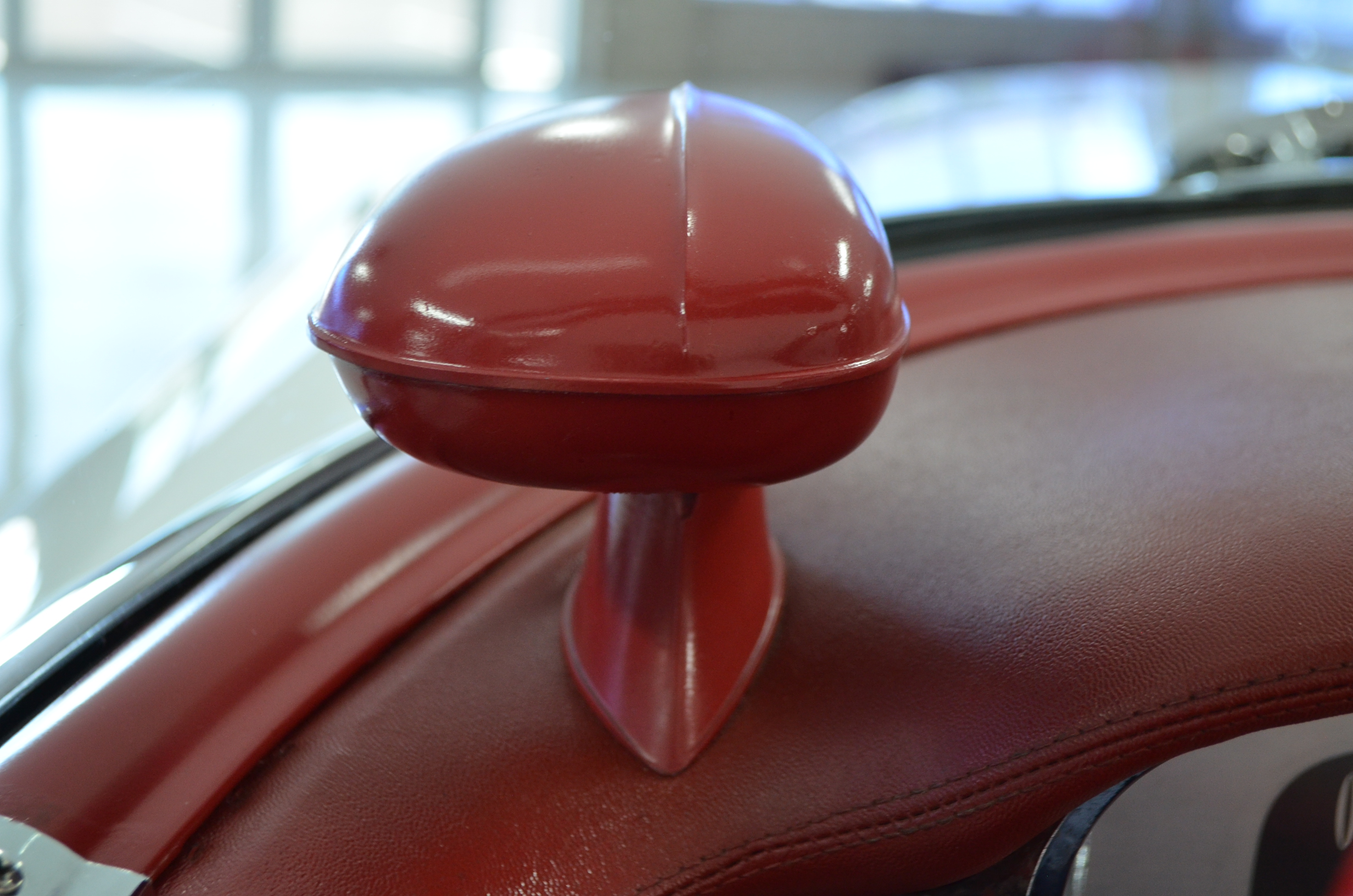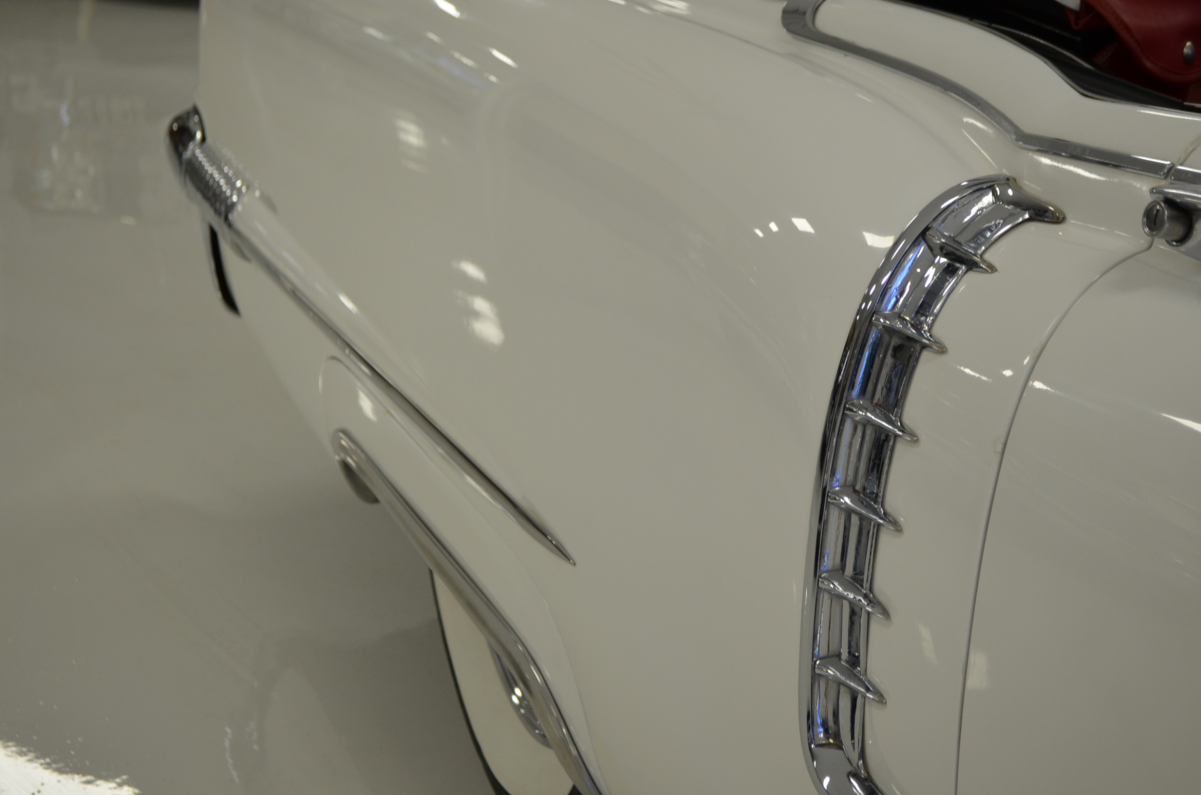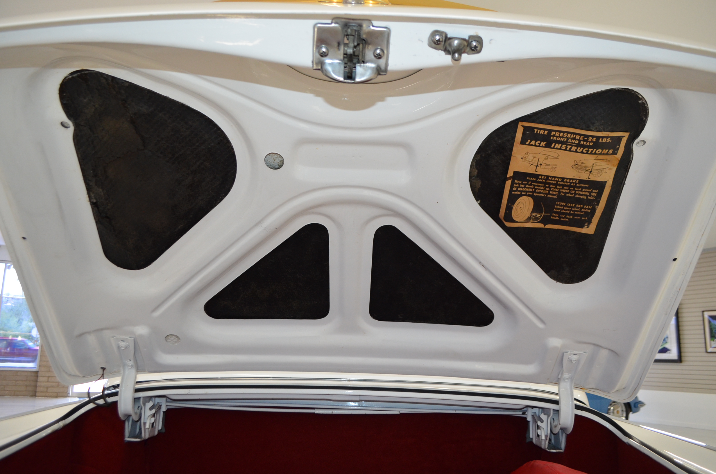 The carpets are new and in excellent condition. The red leather is older and showing cracks. There are no rips or holes, just the cracking from age. The leather is very soft and supple. The instruments are gorgeous and really complete the 1950’s look for the interior.