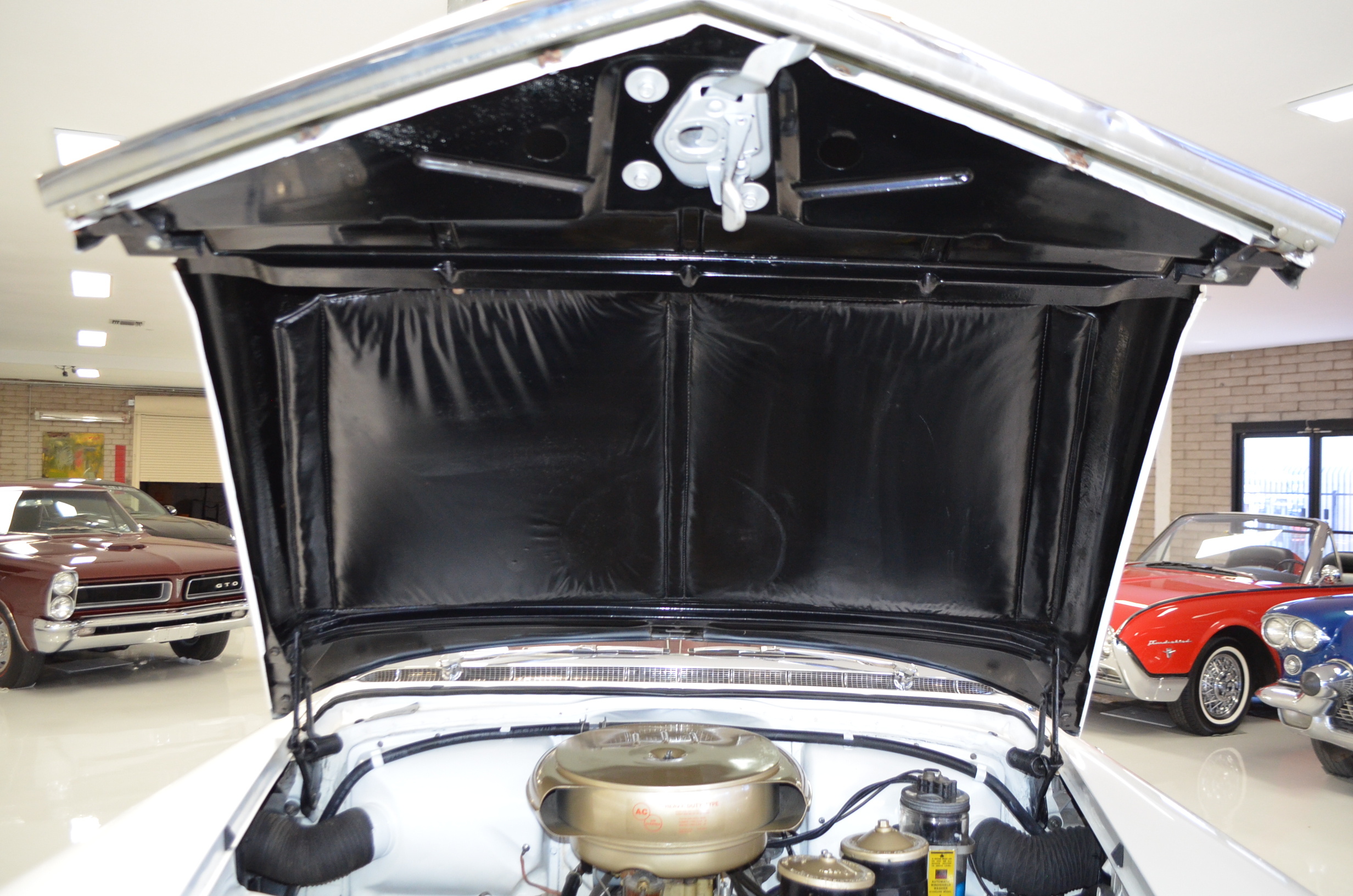 The convertible top mechanisms are all newer and work well. The top itself appears to have been dyed red to match the interior. The top is in good condition with some small blemishes showing. And the parade top boot fits well to the car and gives it a custom look.