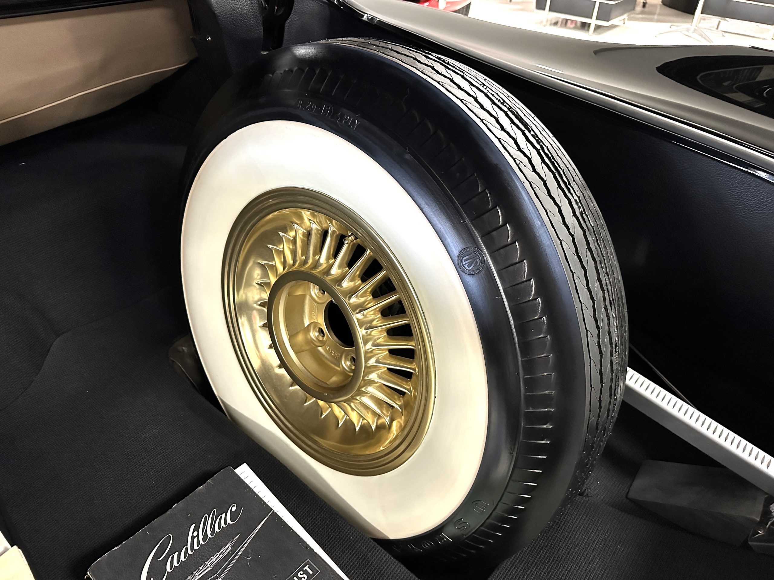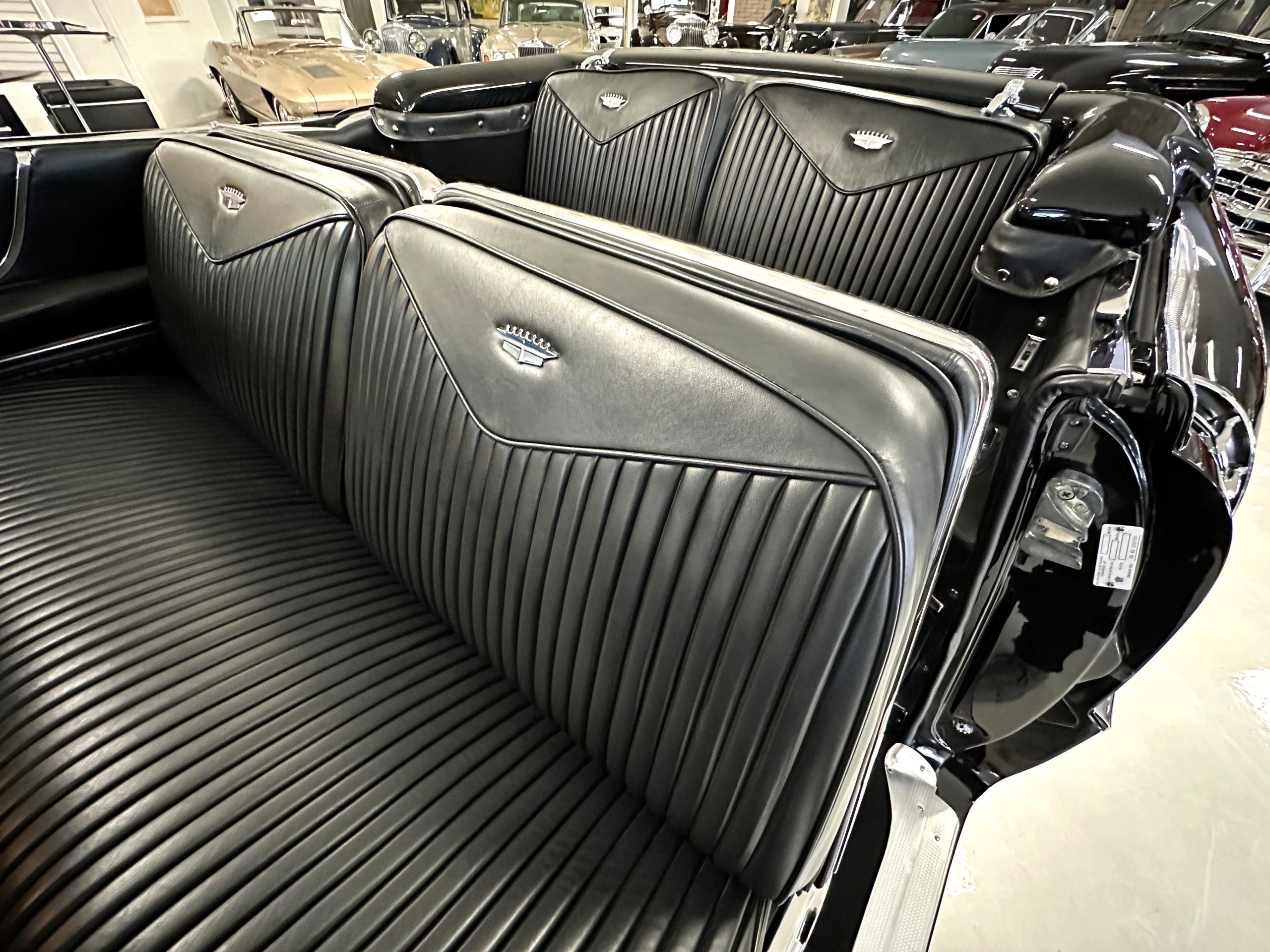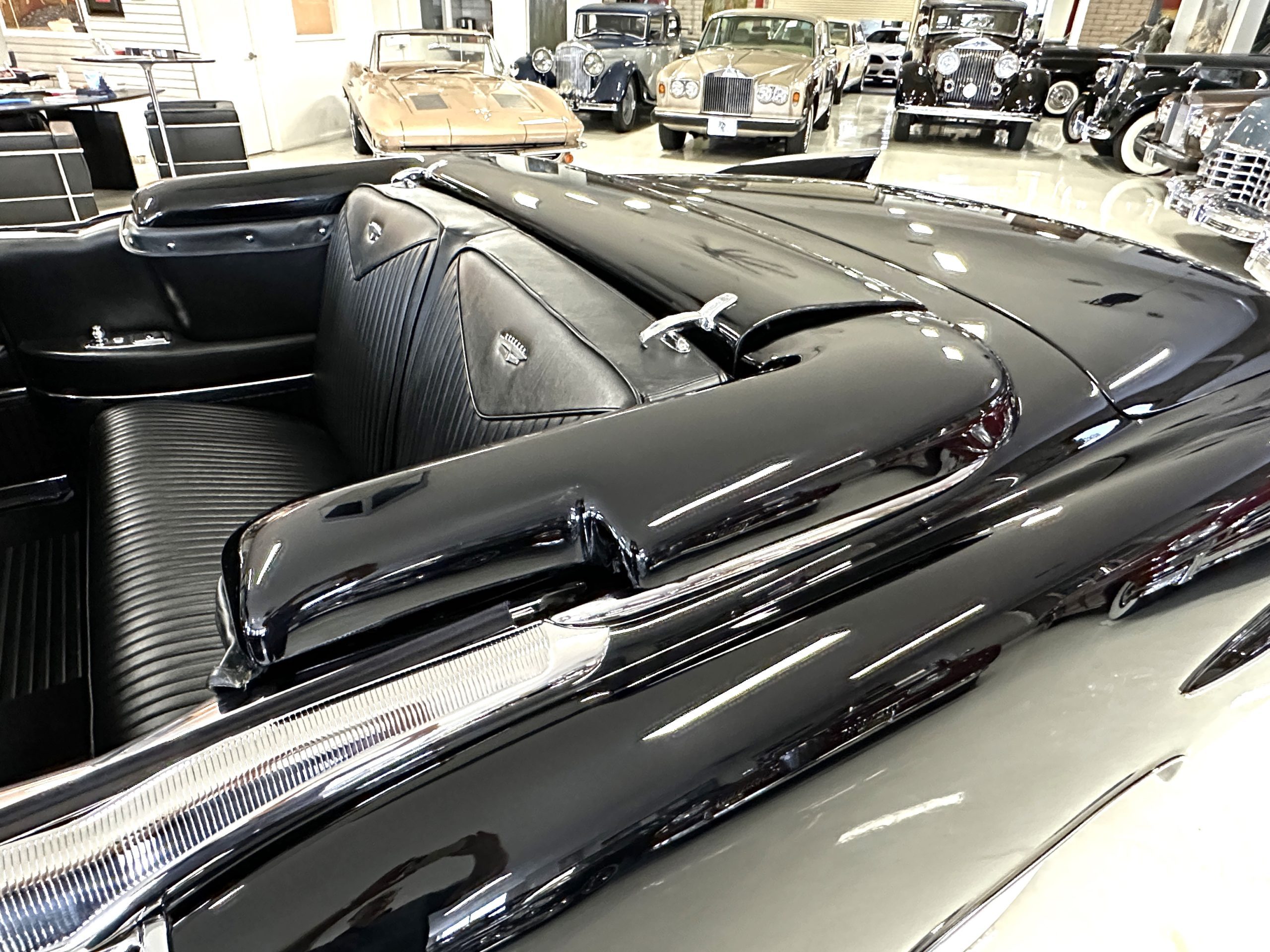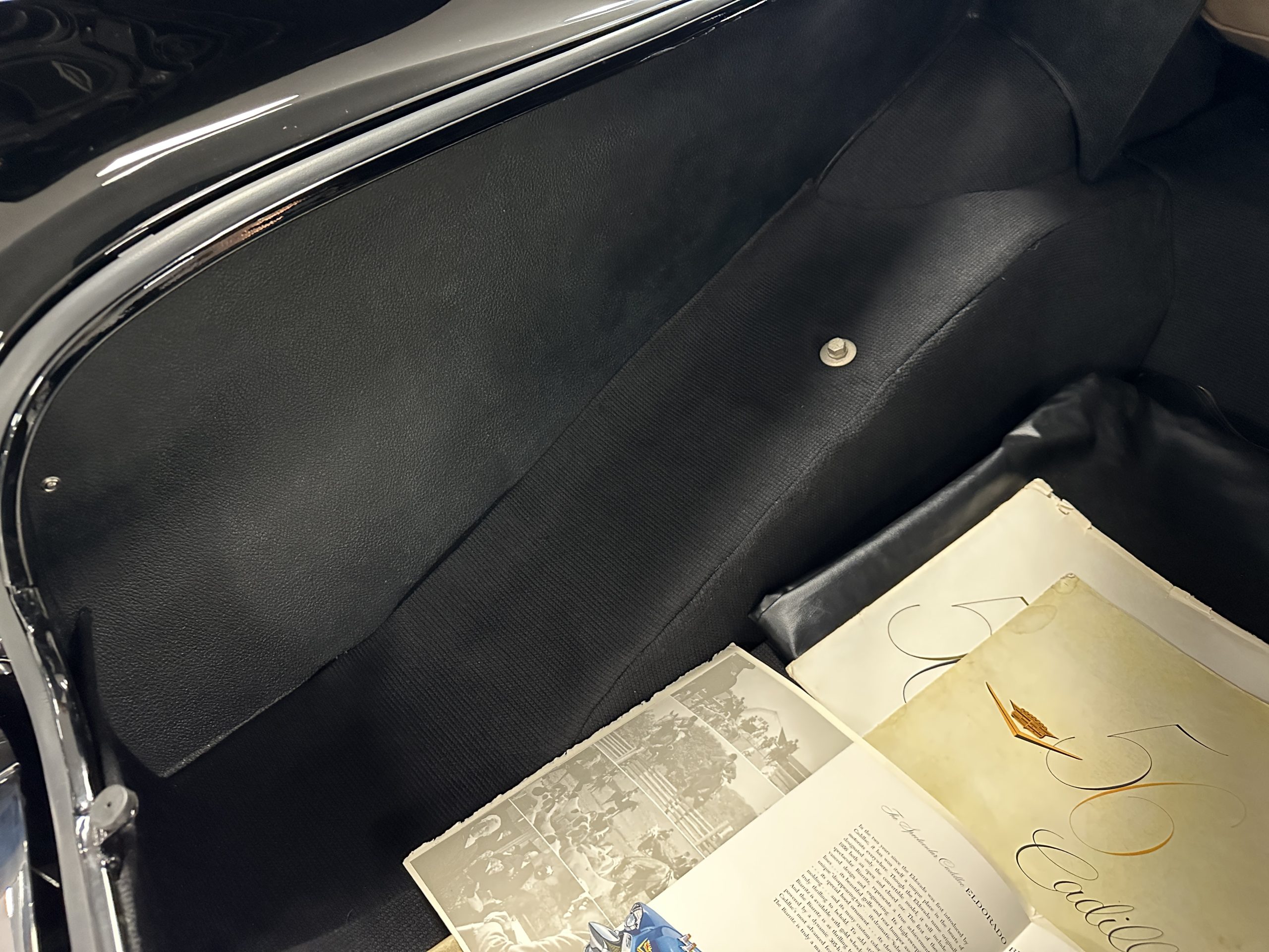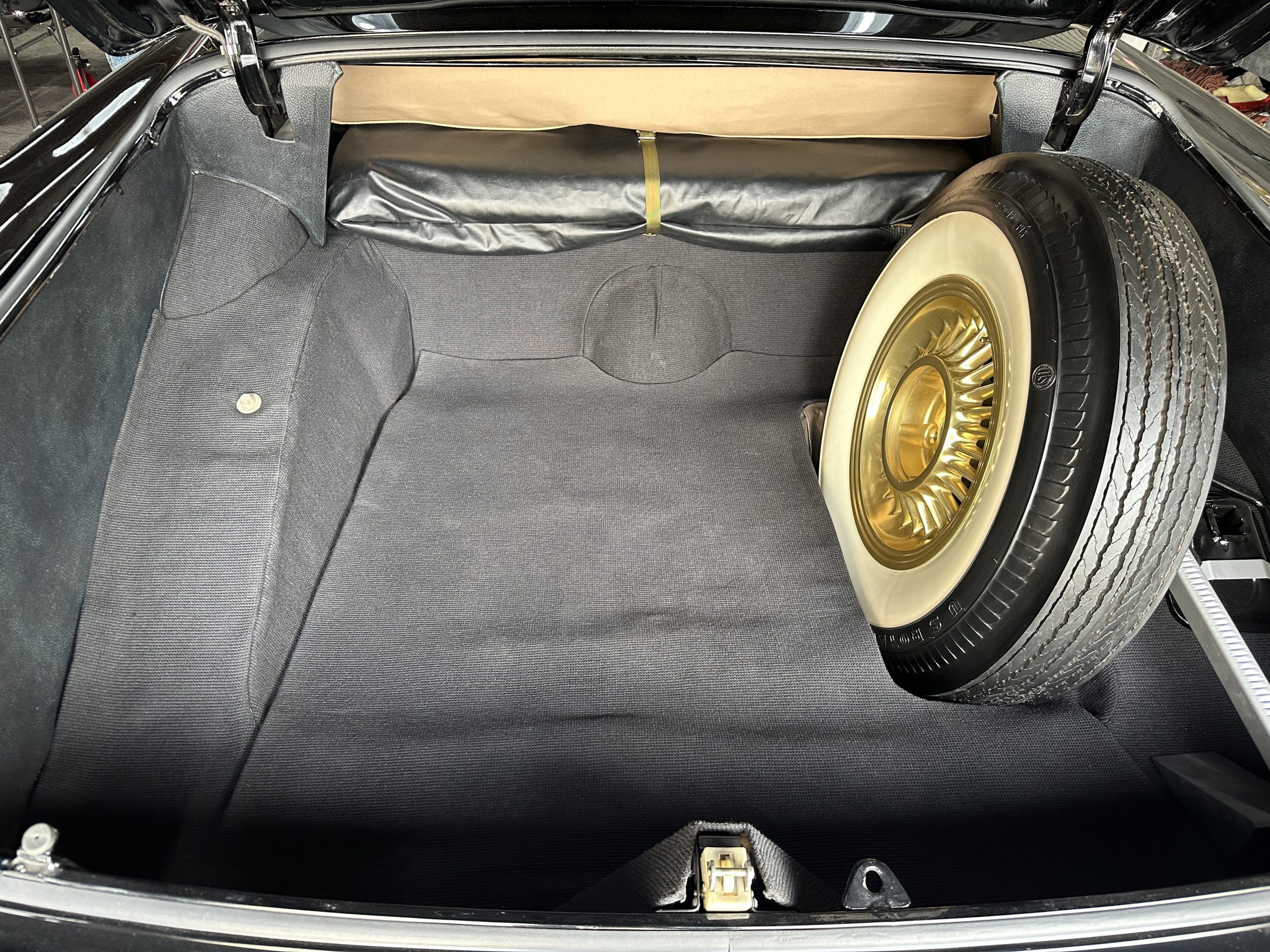 The gorgeous factory black paint (Paint Code 10) is absolutely stunning. She has incredible luster and is polished to perfection presenting a deep and rich mirror finish. The original and NOS trim details have all been meticulously replated and also polished to perfection. The door caps and side moldings are in as-new condition and devoid of imperfections. The 200-plus piece front grill was painstakingly completely disassembled and anodized in the correct gold color in California and includes a NOS Cadillac script logo. The gorgeous three-piece Sabre wheels were restored and anodized in the correct gold color by Valley Wire Wheels. She has perfect and correct new black vinyl power convertible top (Top Code 2) that had never been down before our photo shoot and operates flawlessly. The Parade Boot is in new condition and comes complete with the storage case which fits nicely into place inside the trunk with the factory correct holding straps.