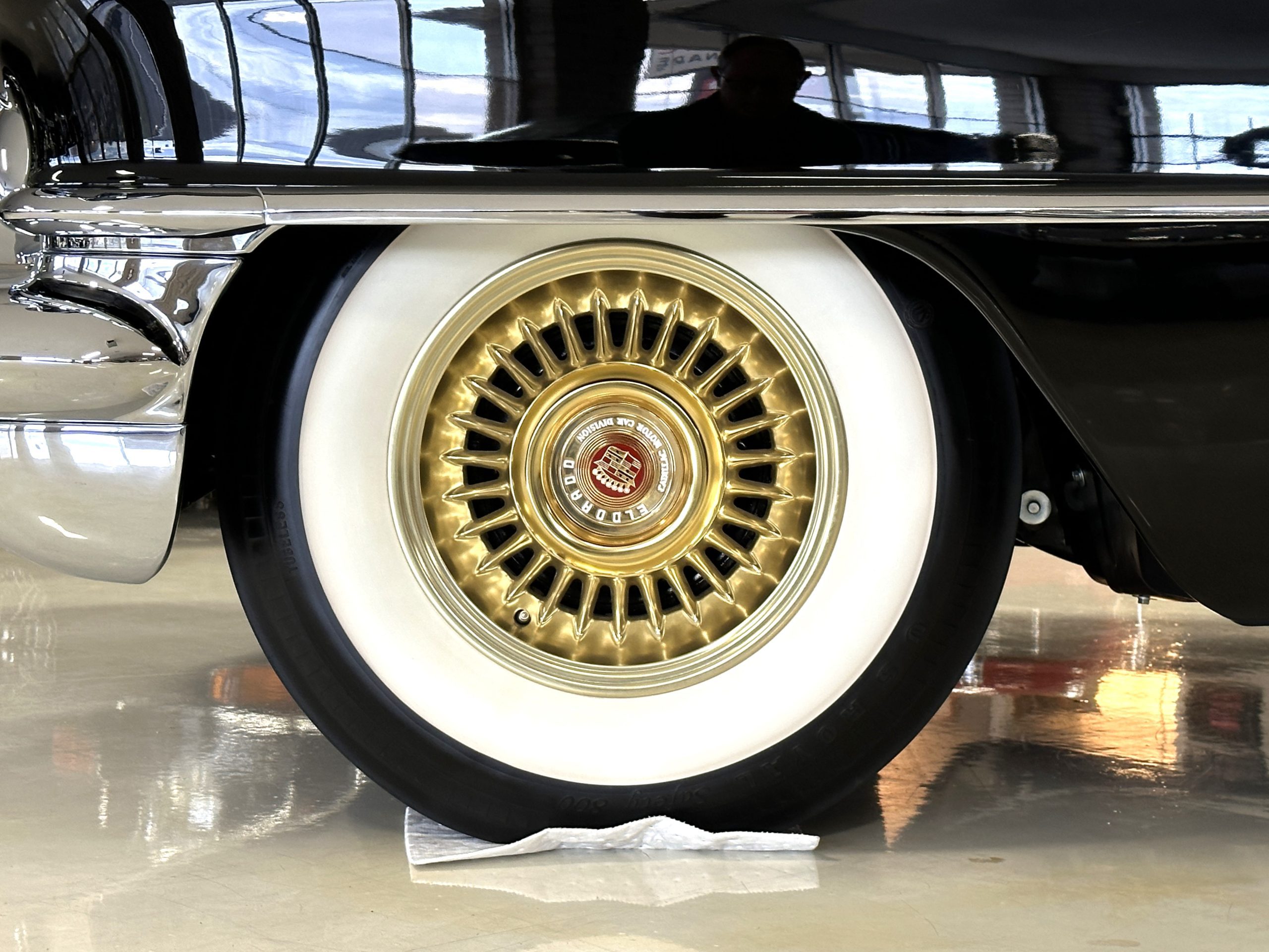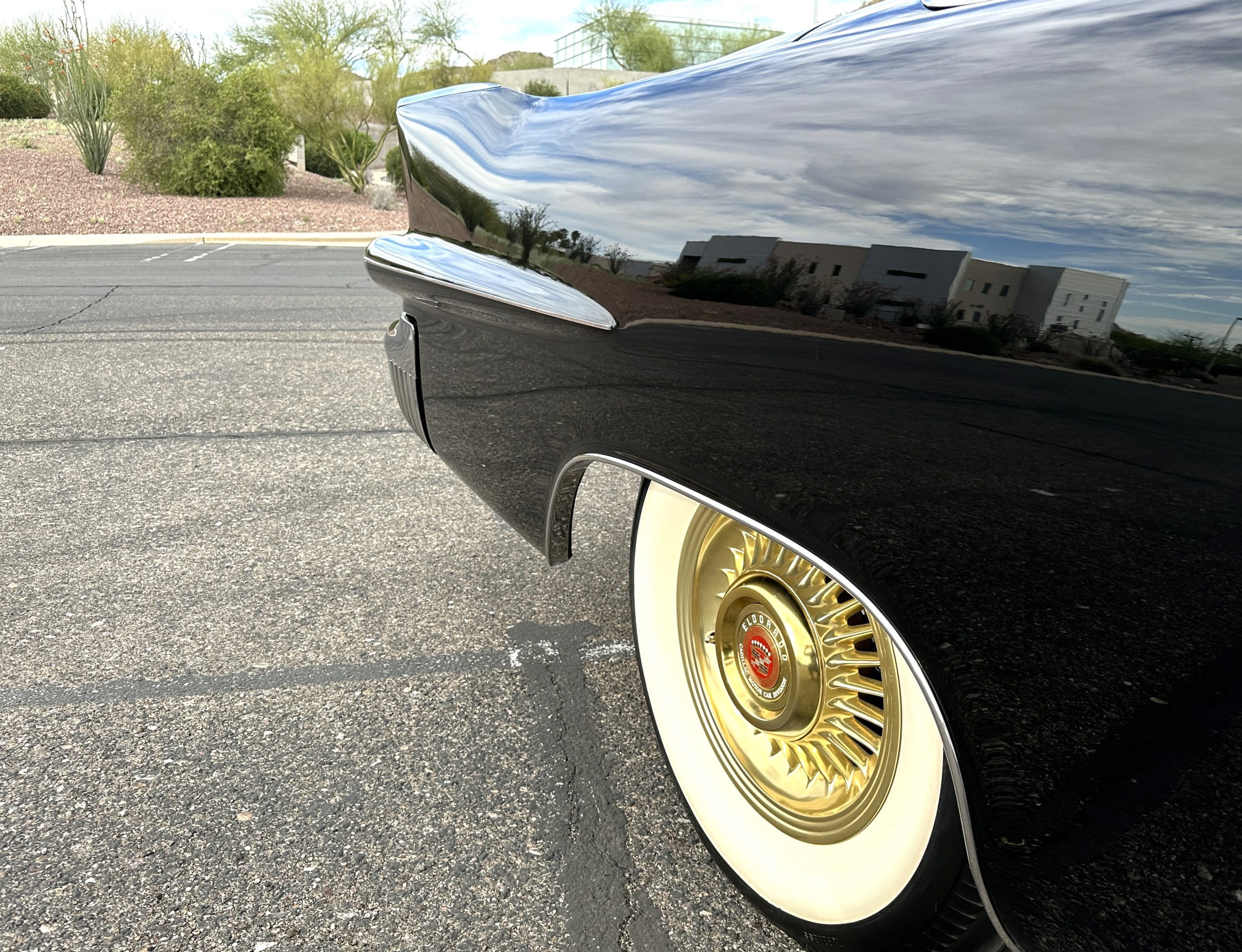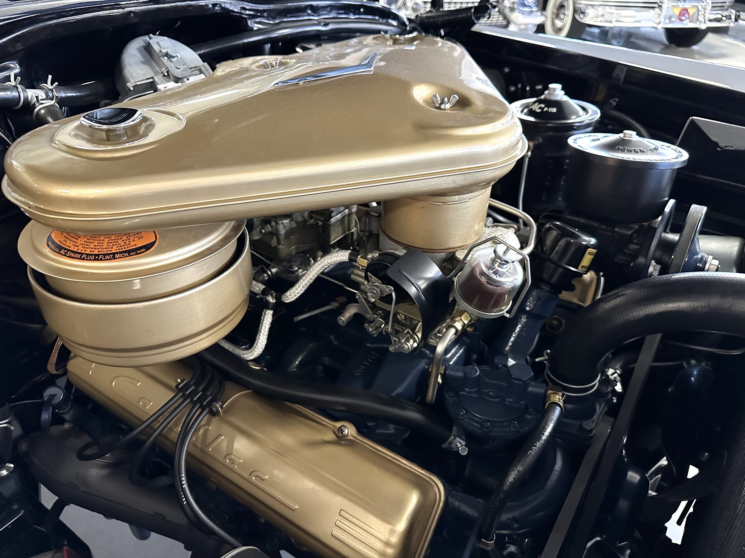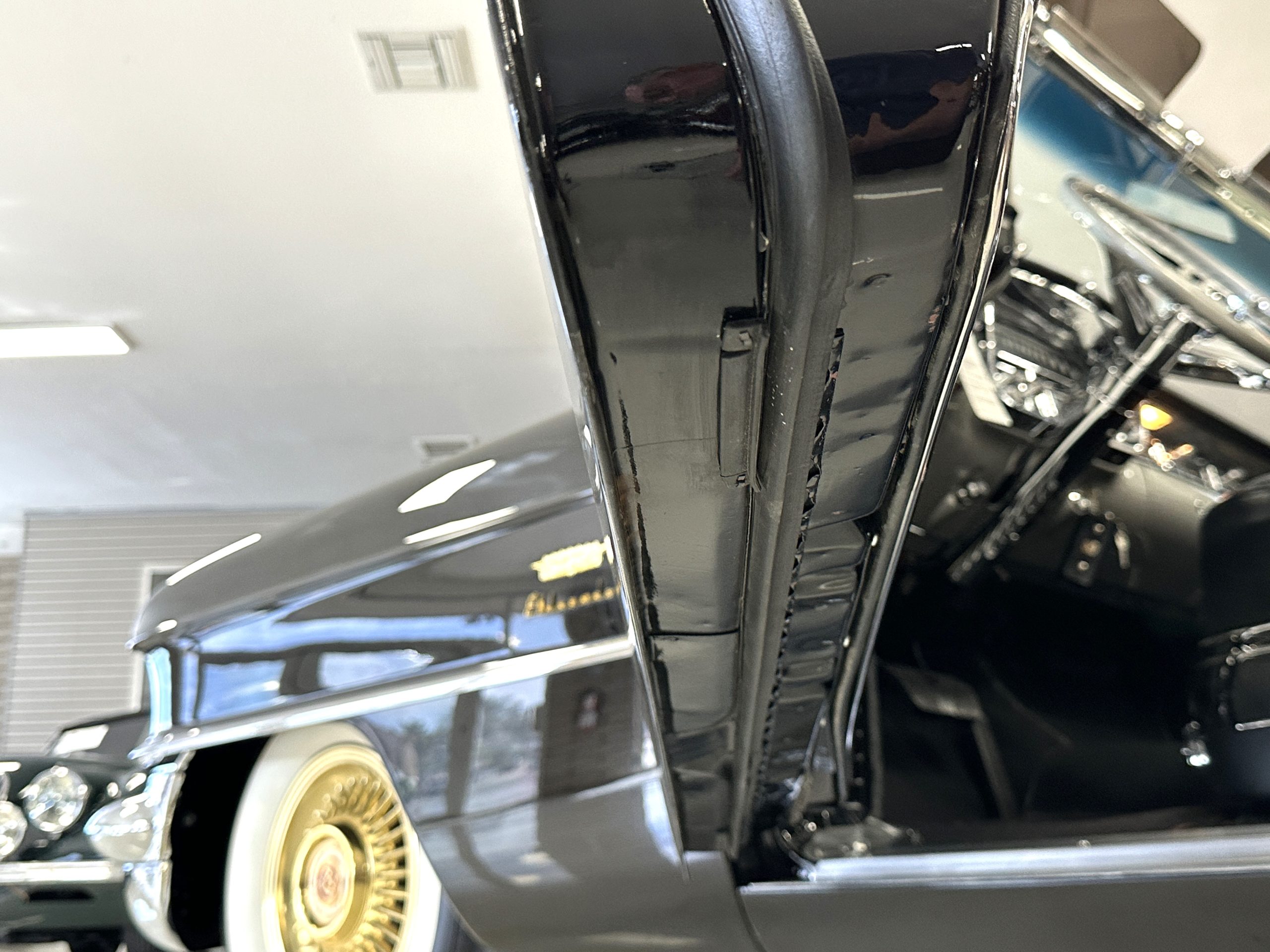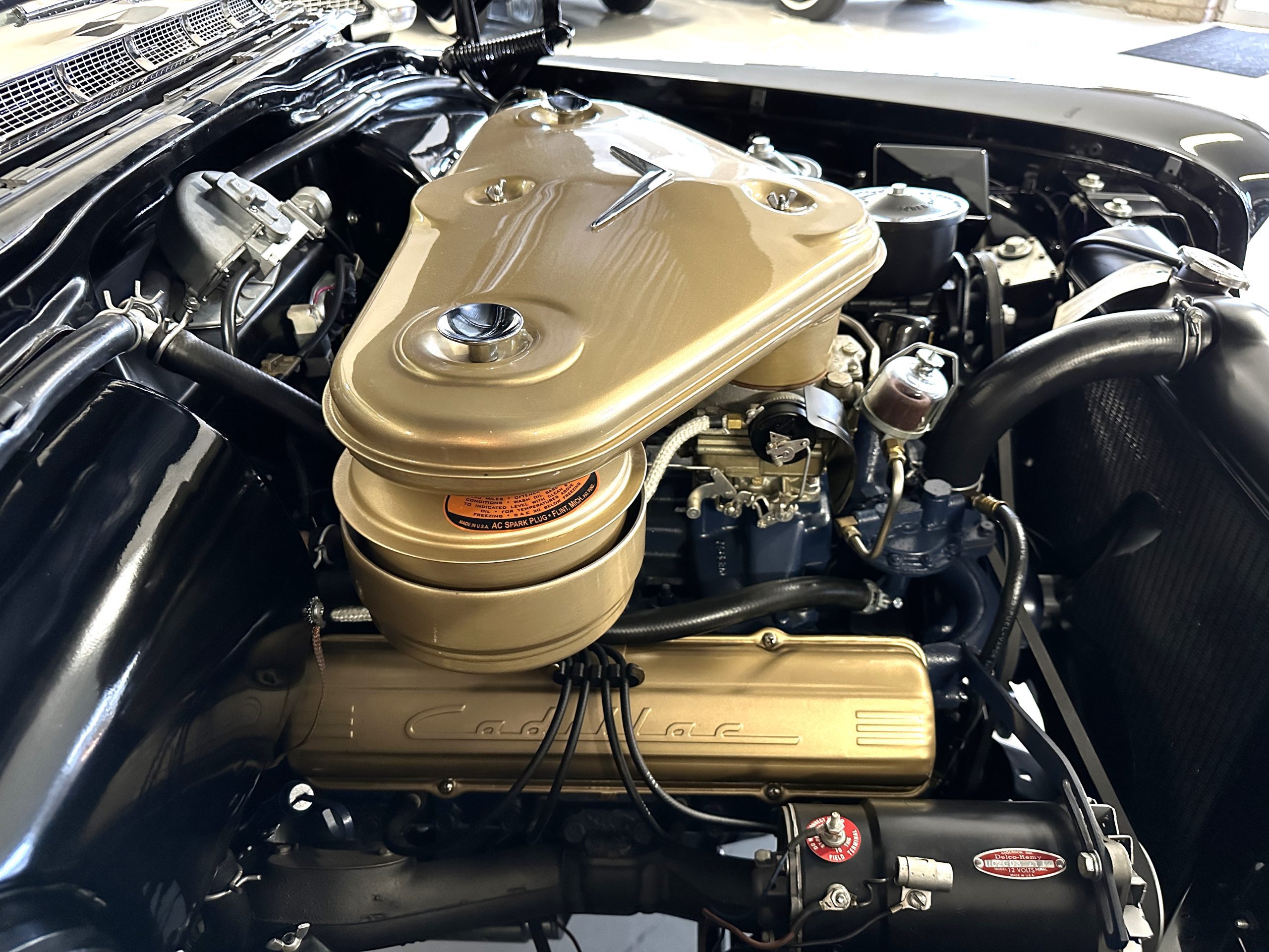 The gorgeous factory black paint (Paint Code 10) is absolutely stunning. She has incredible luster and is polished to perfection presenting a deep and rich mirror finish. The original and NOS trim details have all been meticulously replated and also polished to perfection. The door caps and side moldings are in as-new condition and devoid of imperfections. The 200-plus piece front grill was painstakingly completely disassembled and anodized in the correct gold color in California and includes a NOS Cadillac script logo. The gorgeous three-piece Sabre wheels were restored and anodized in the correct gold color by Valley Wire Wheels. She has perfect and correct new black vinyl power convertible top (Top Code 2) that had never been down before our photo shoot and operates flawlessly. The Parade Boot is in new condition and comes complete with the storage case which fits nicely into place inside the trunk with the factory correct holding straps.