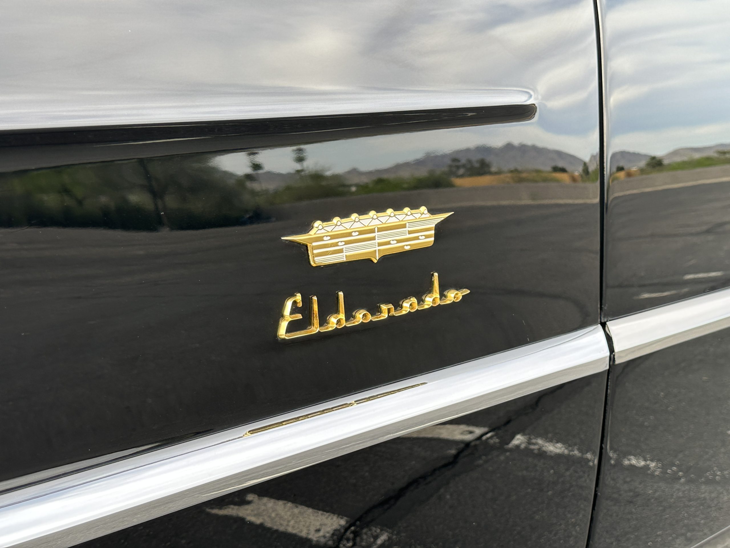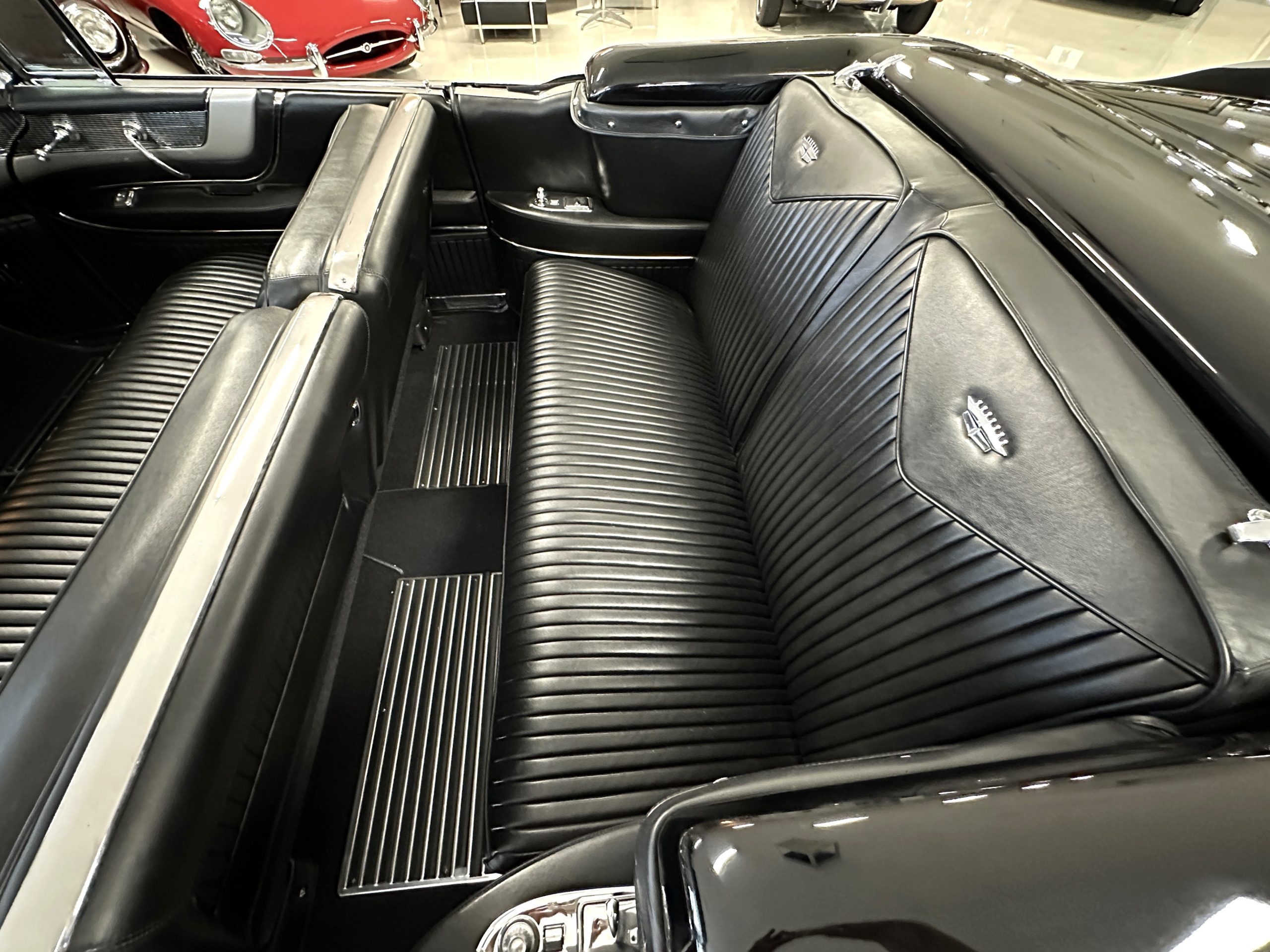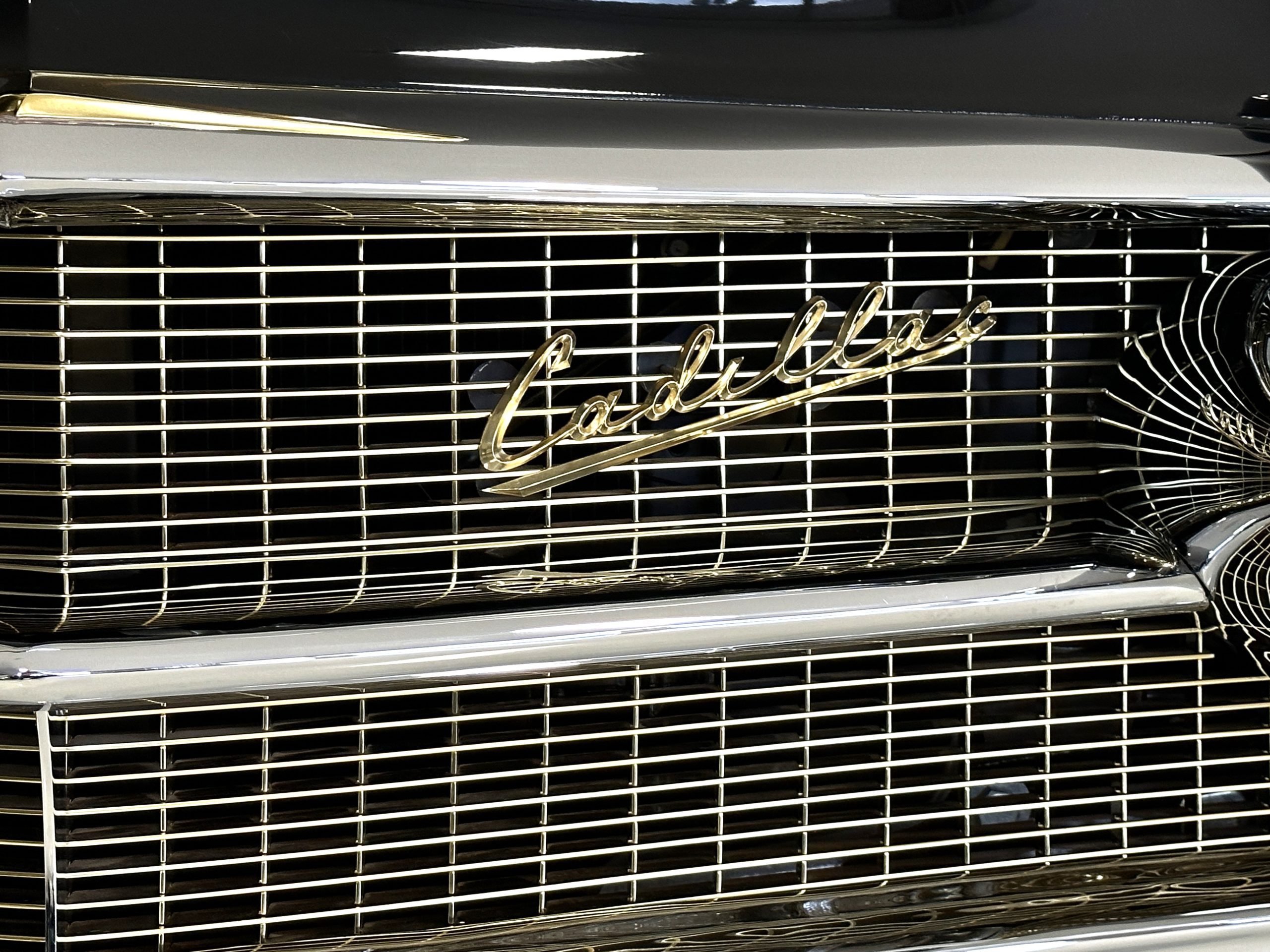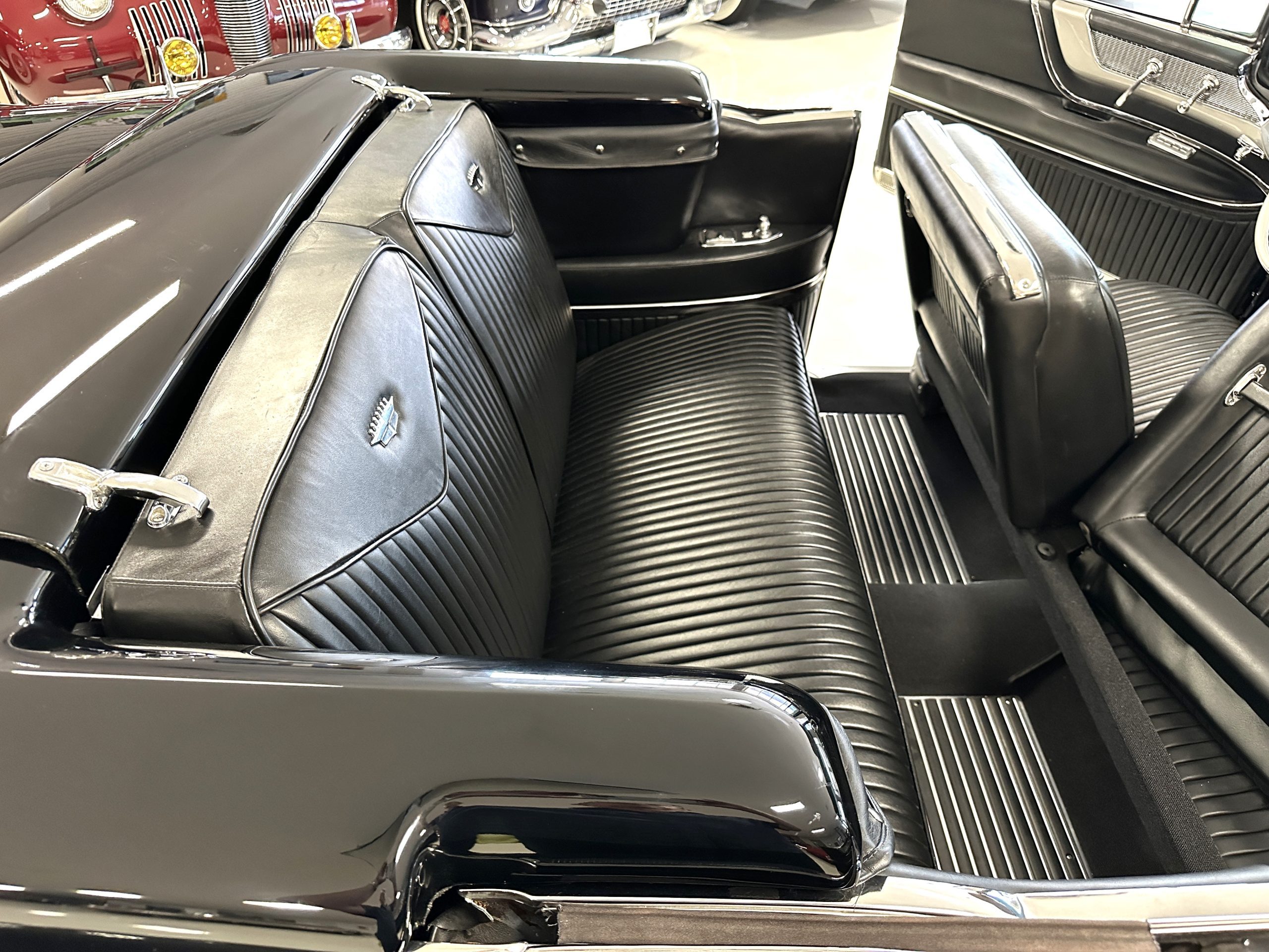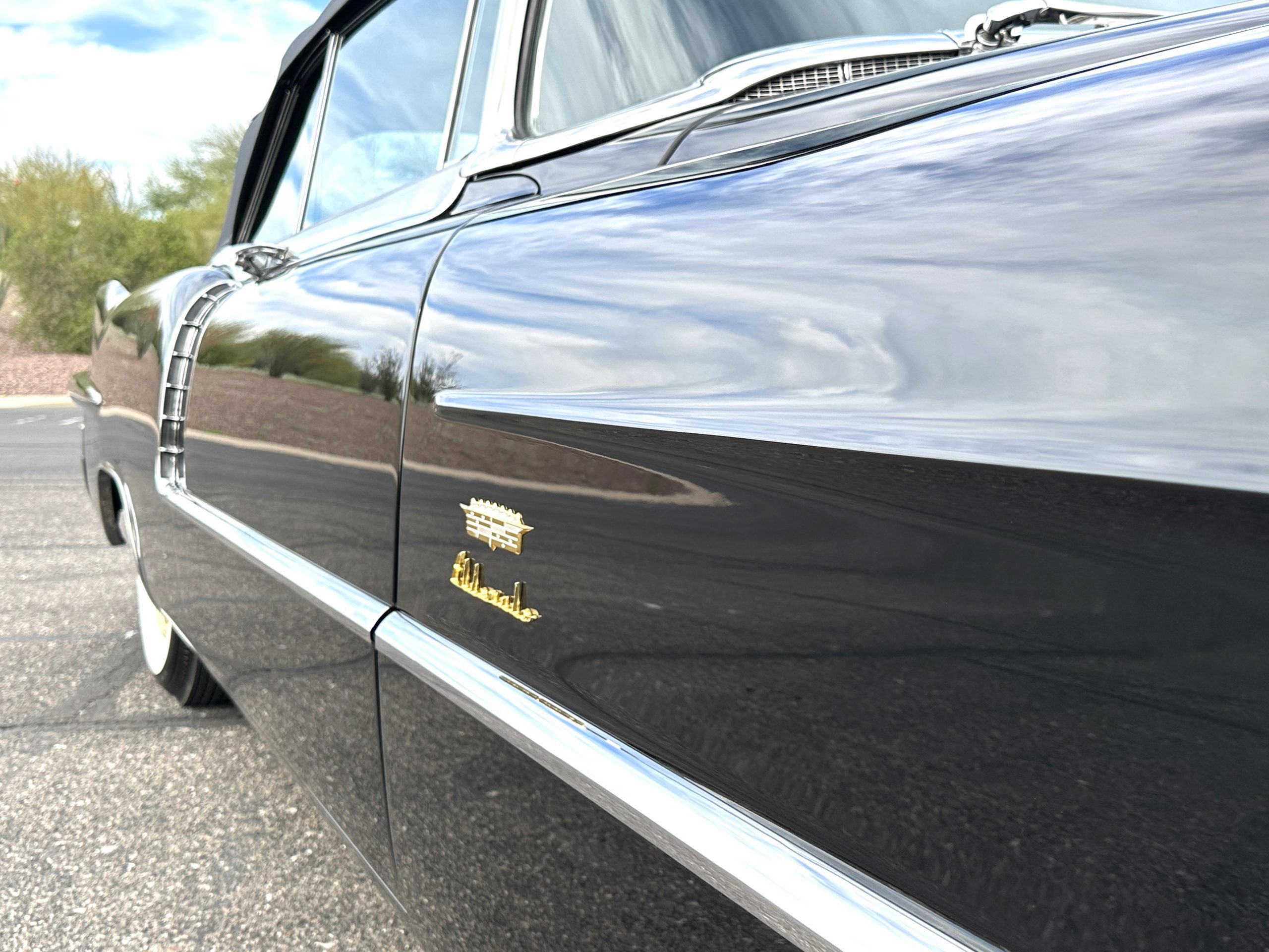 The gorgeous factory black paint (Paint Code 10) is absolutely stunning. She has incredible luster and is polished to perfection presenting a deep and rich mirror finish. The original and NOS trim details have all been meticulously replated and also polished to perfection. The door caps and side moldings are in as-new condition and devoid of imperfections. The 200-plus piece front grill was painstakingly completely disassembled and anodized in the correct gold color in California and includes a NOS Cadillac script logo. The gorgeous three-piece Sabre wheels were restored and anodized in the correct gold color by Valley Wire Wheels. She has perfect and correct new black vinyl power convertible top (Top Code 2) that had never been down before our photo shoot and operates flawlessly. The Parade Boot is in new condition and comes complete with the storage case which fits nicely into place inside the trunk with the factory correct holding straps.
