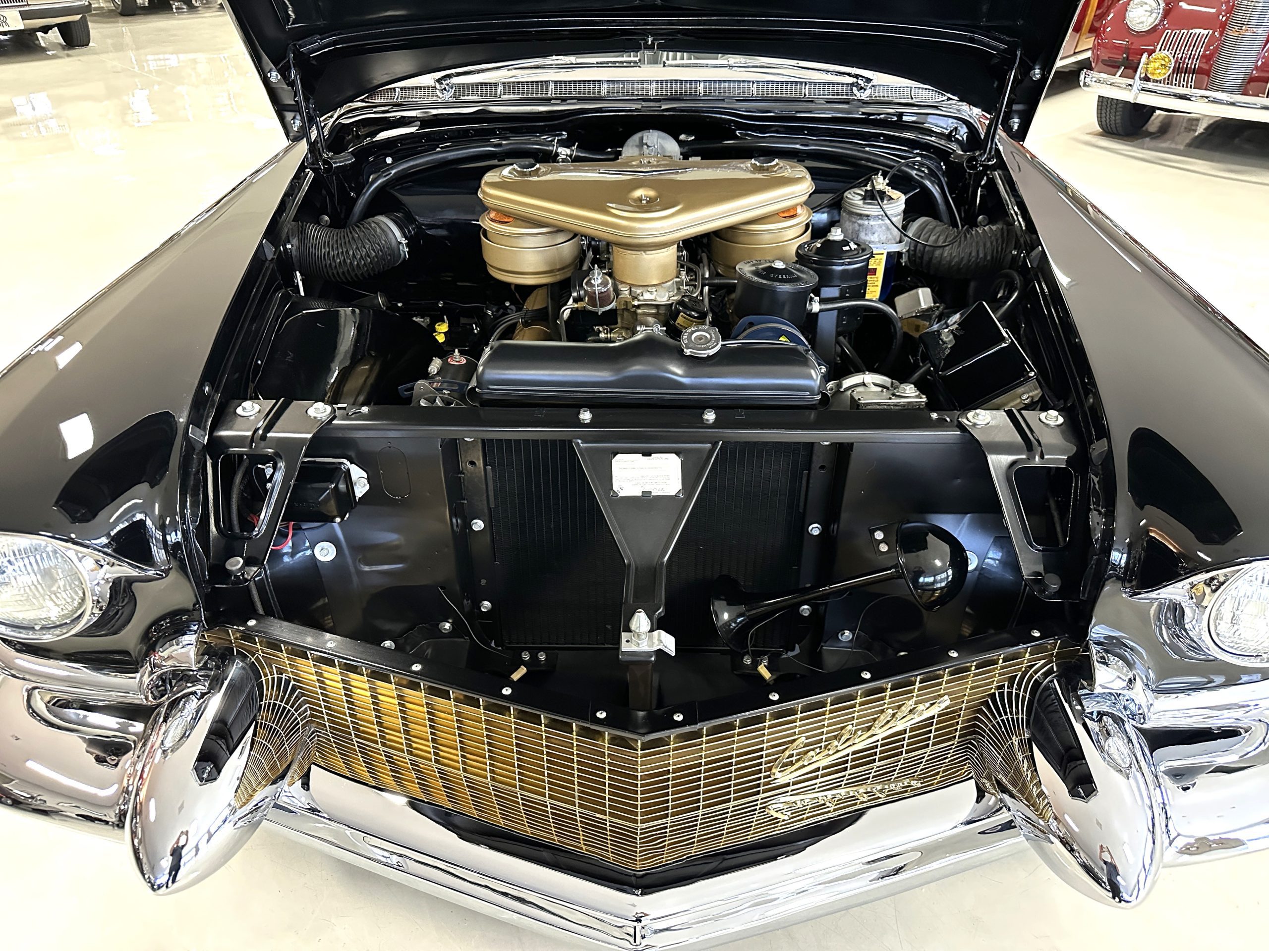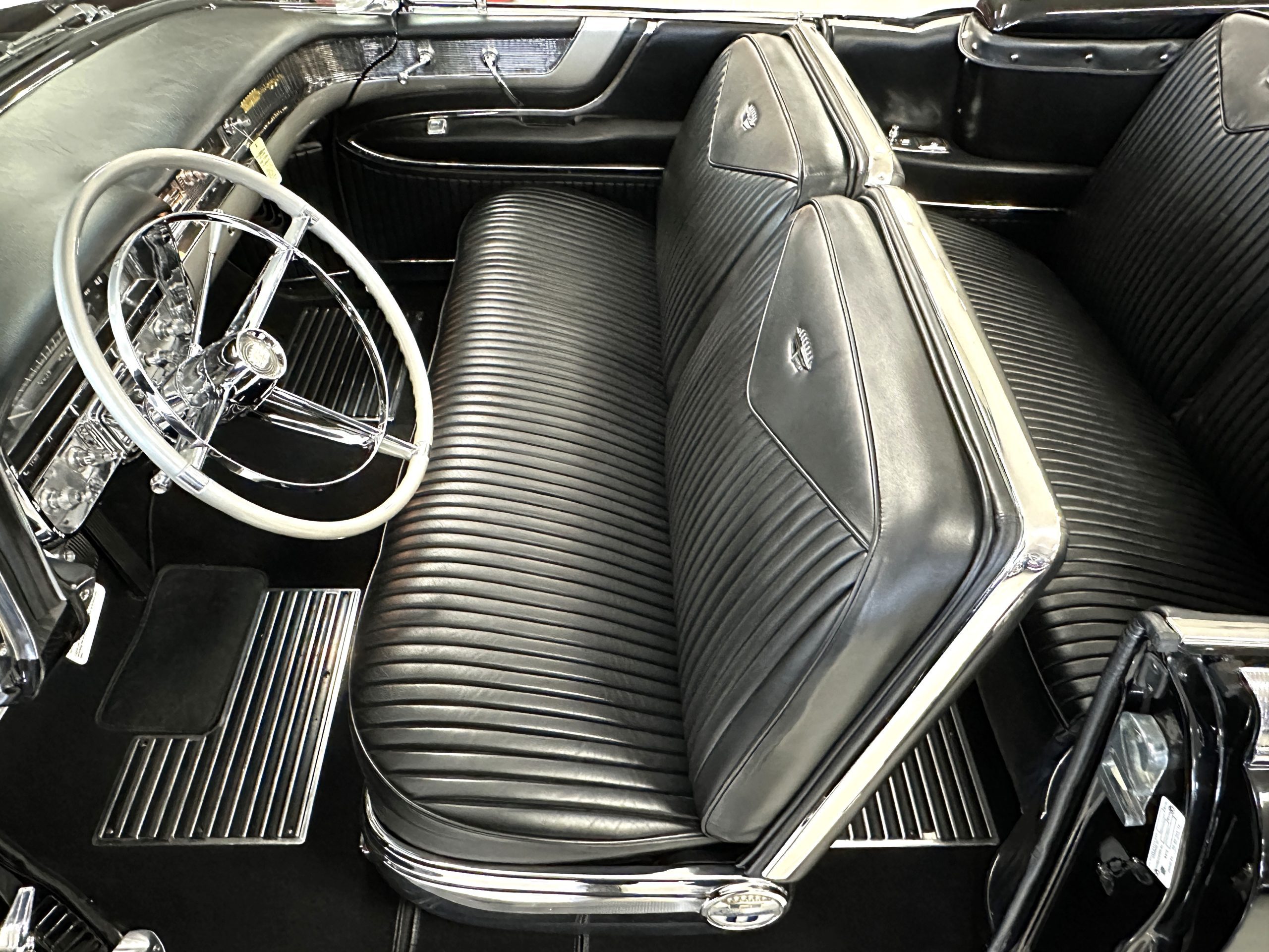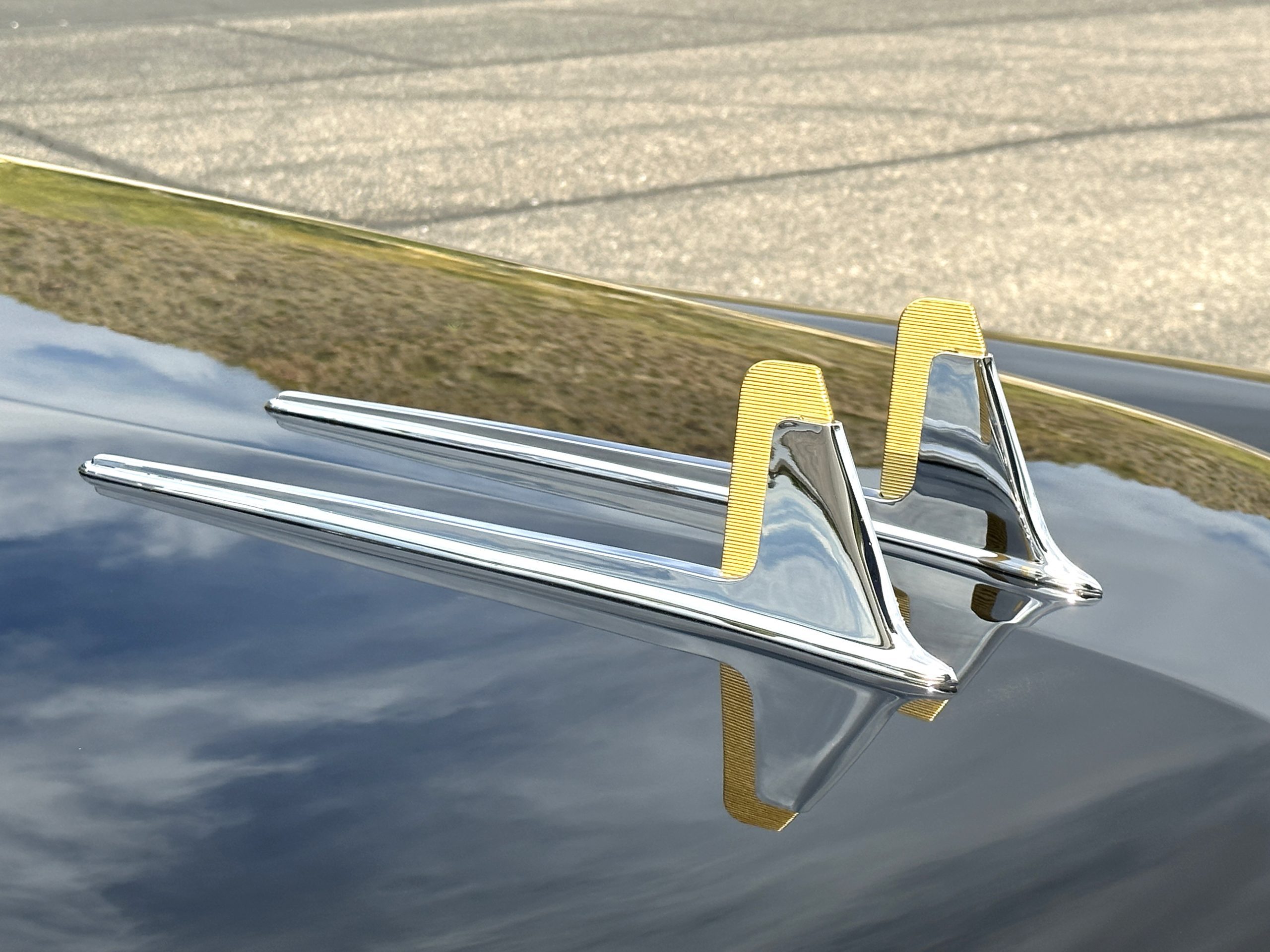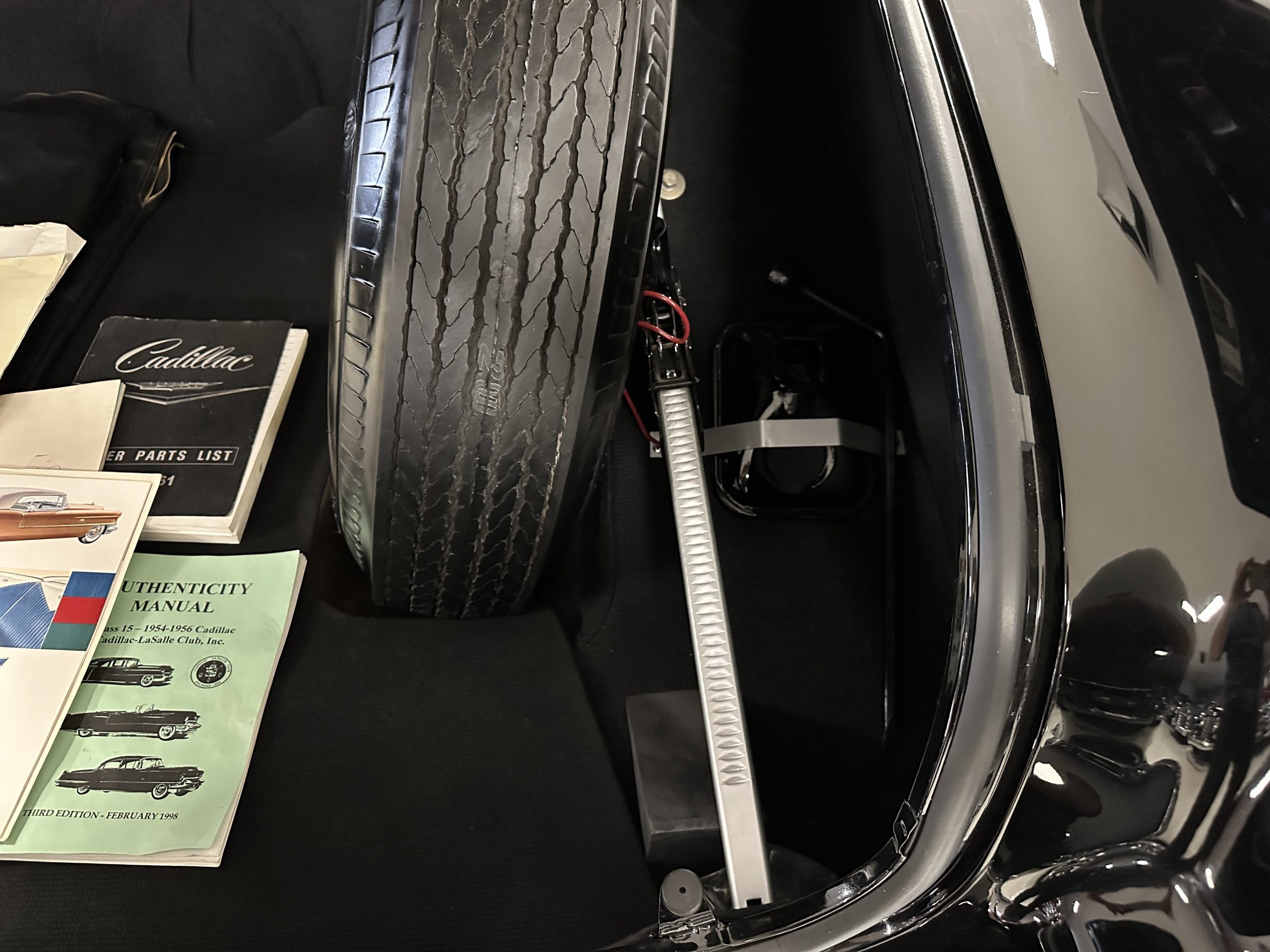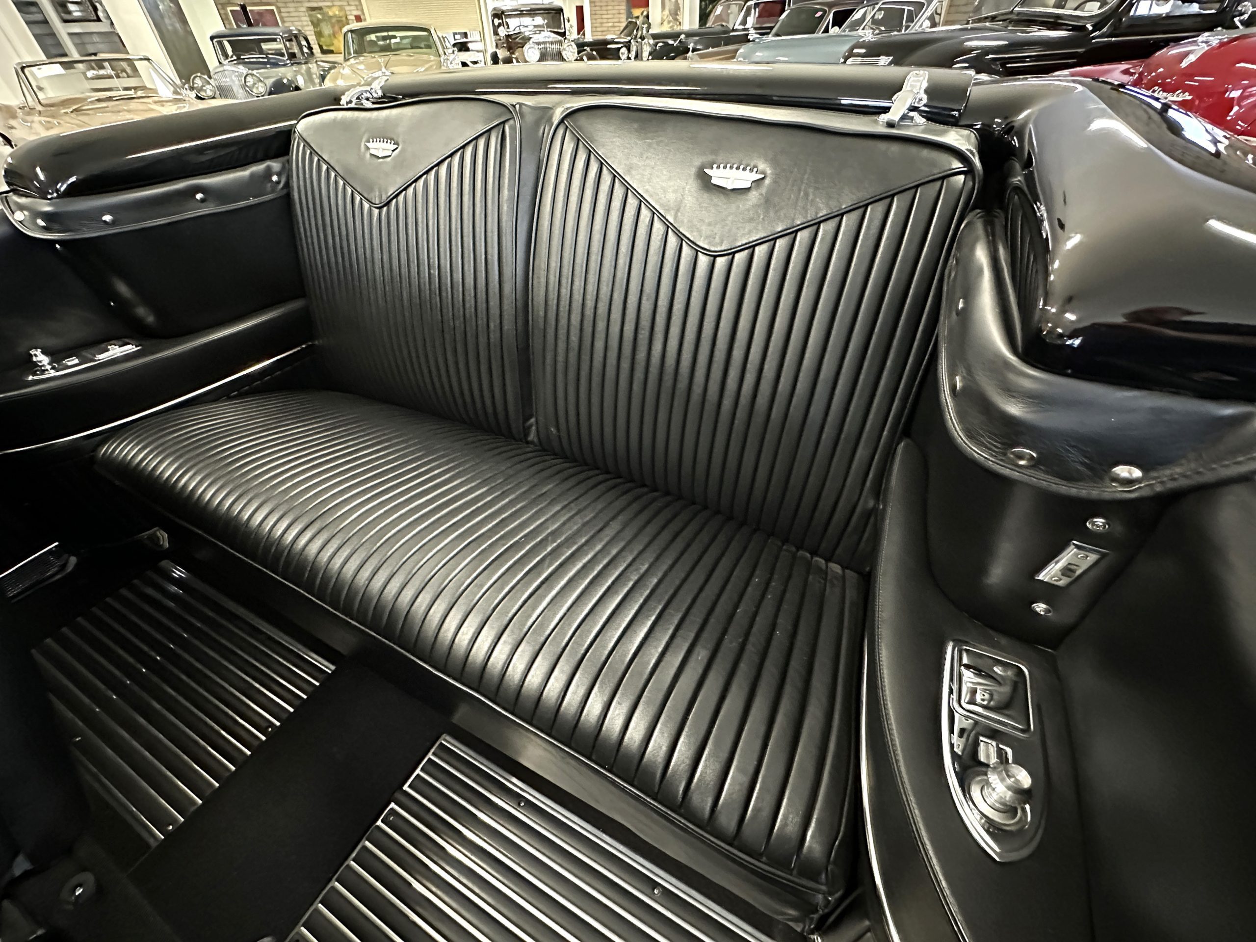 The gorgeous factory black paint (Paint Code 10) is absolutely stunning. She has incredible luster and is polished to perfection presenting a deep and rich mirror finish. The original and NOS trim details have all been meticulously replated and also polished to perfection. The door caps and side moldings are in as-new condition and devoid of imperfections. The 200-plus piece front grill was painstakingly completely disassembled and anodized in the correct gold color in California and includes a NOS Cadillac script logo. The gorgeous three-piece Sabre wheels were restored and anodized in the correct gold color by Valley Wire Wheels. She has perfect and correct new black vinyl power convertible top (Top Code 2) that had never been down before our photo shoot and operates flawlessly. The Parade Boot is in new condition and comes complete with the storage case which fits nicely into place inside the trunk with the factory correct holding straps.