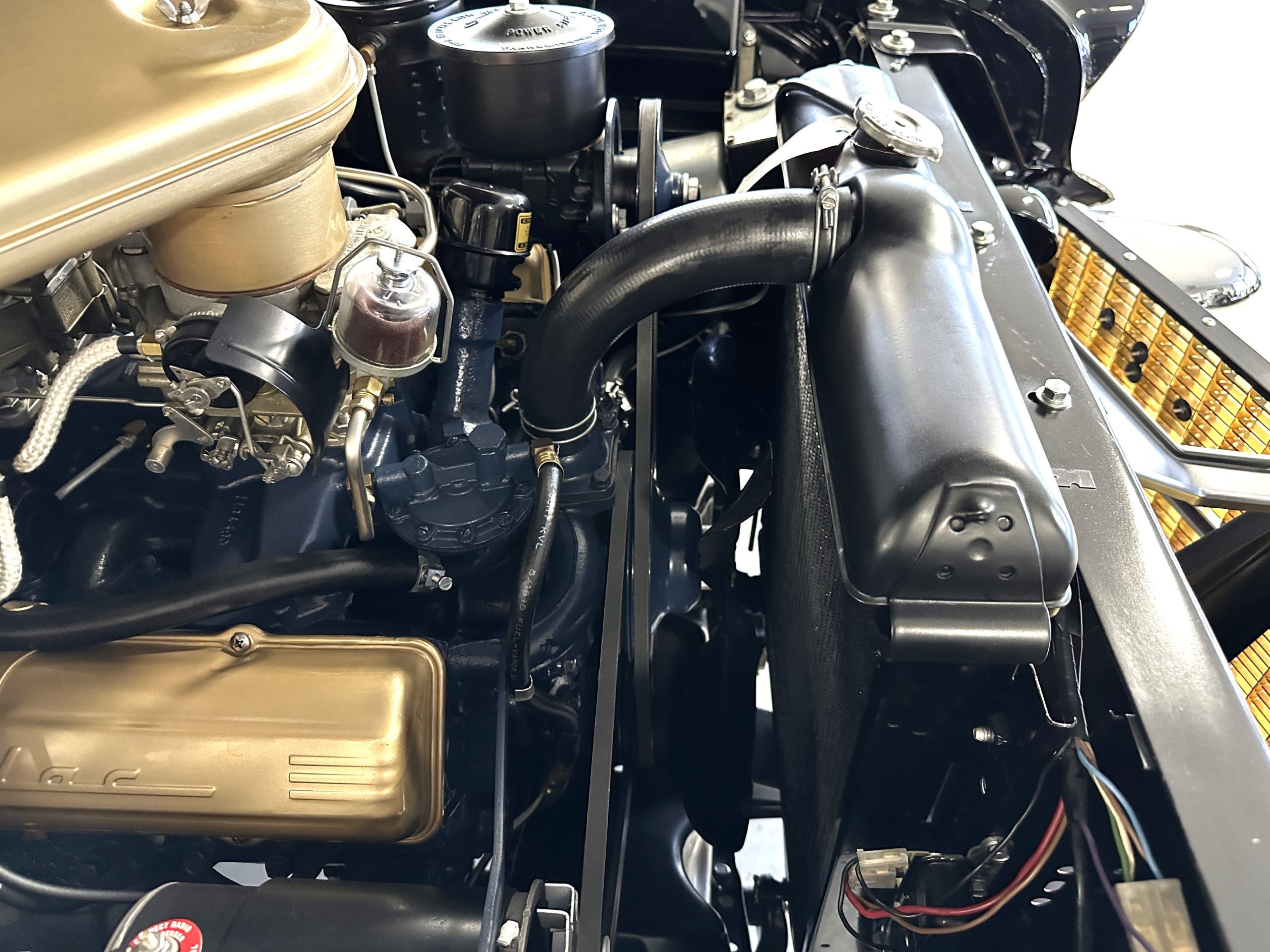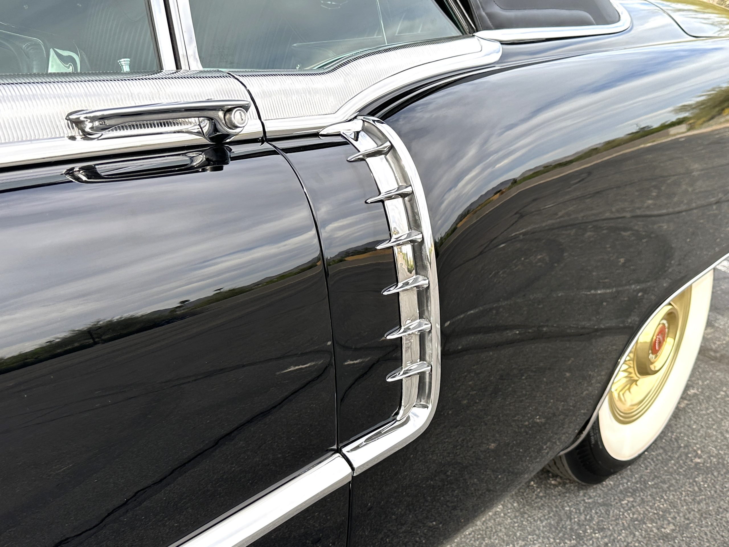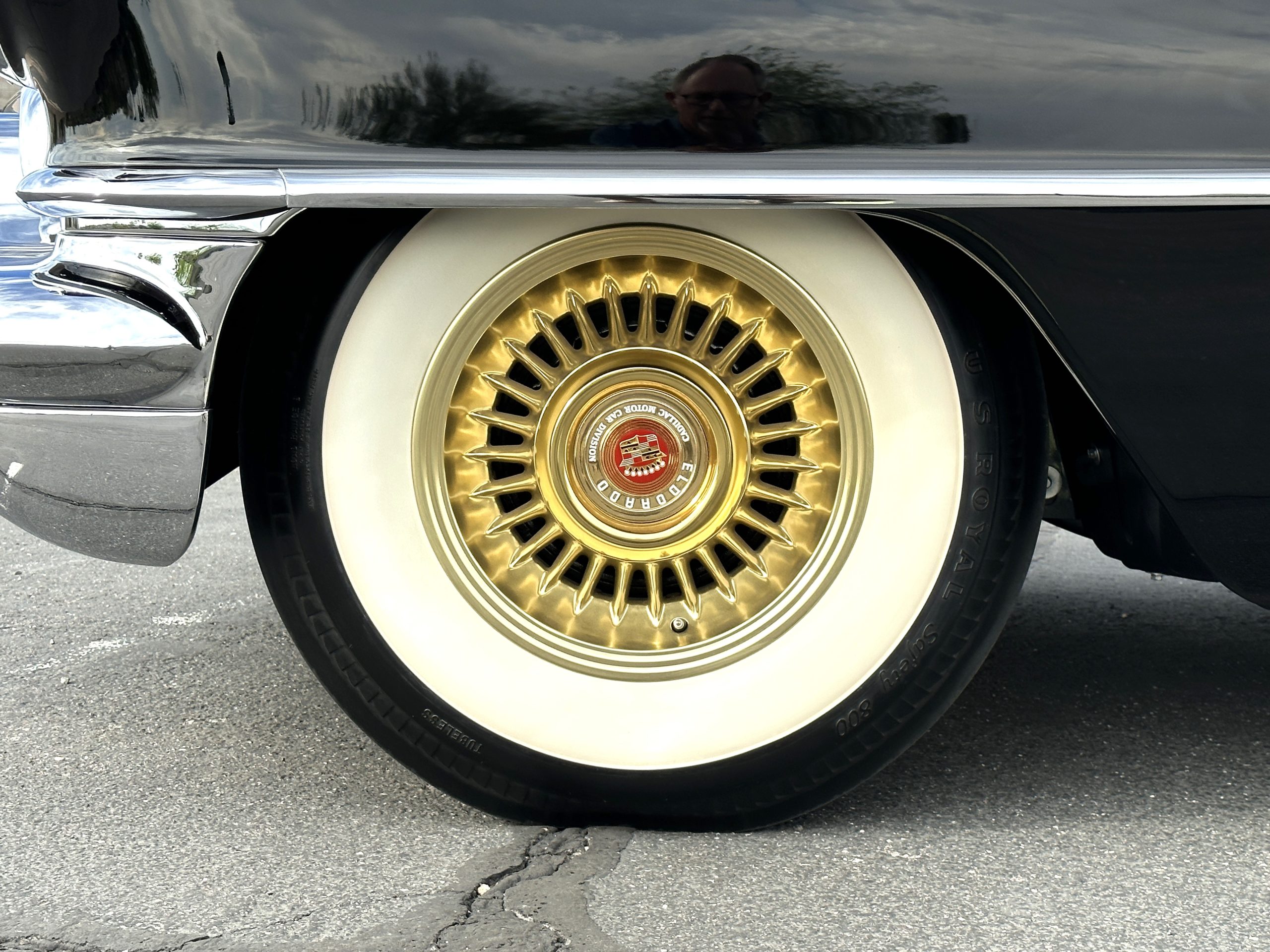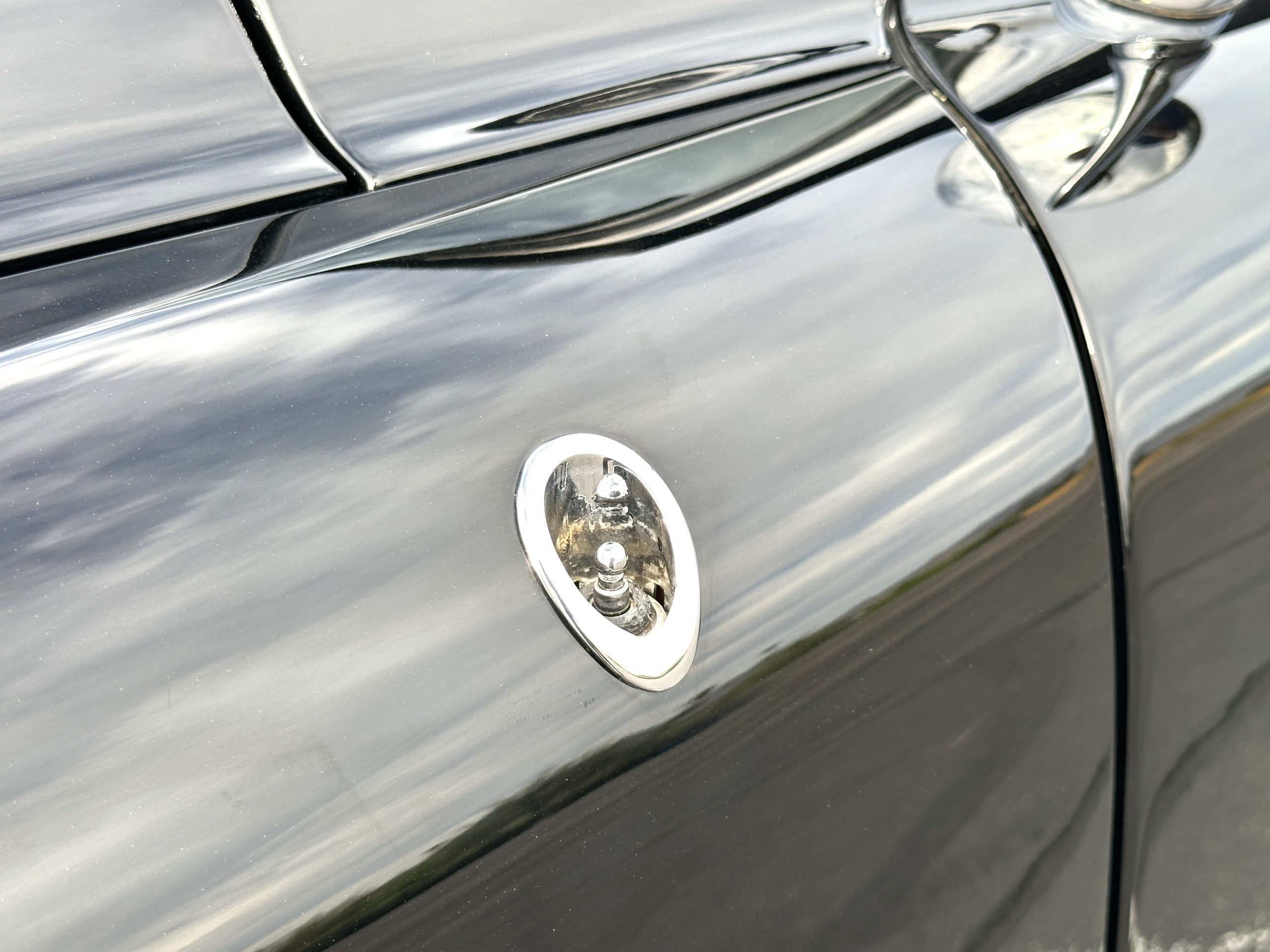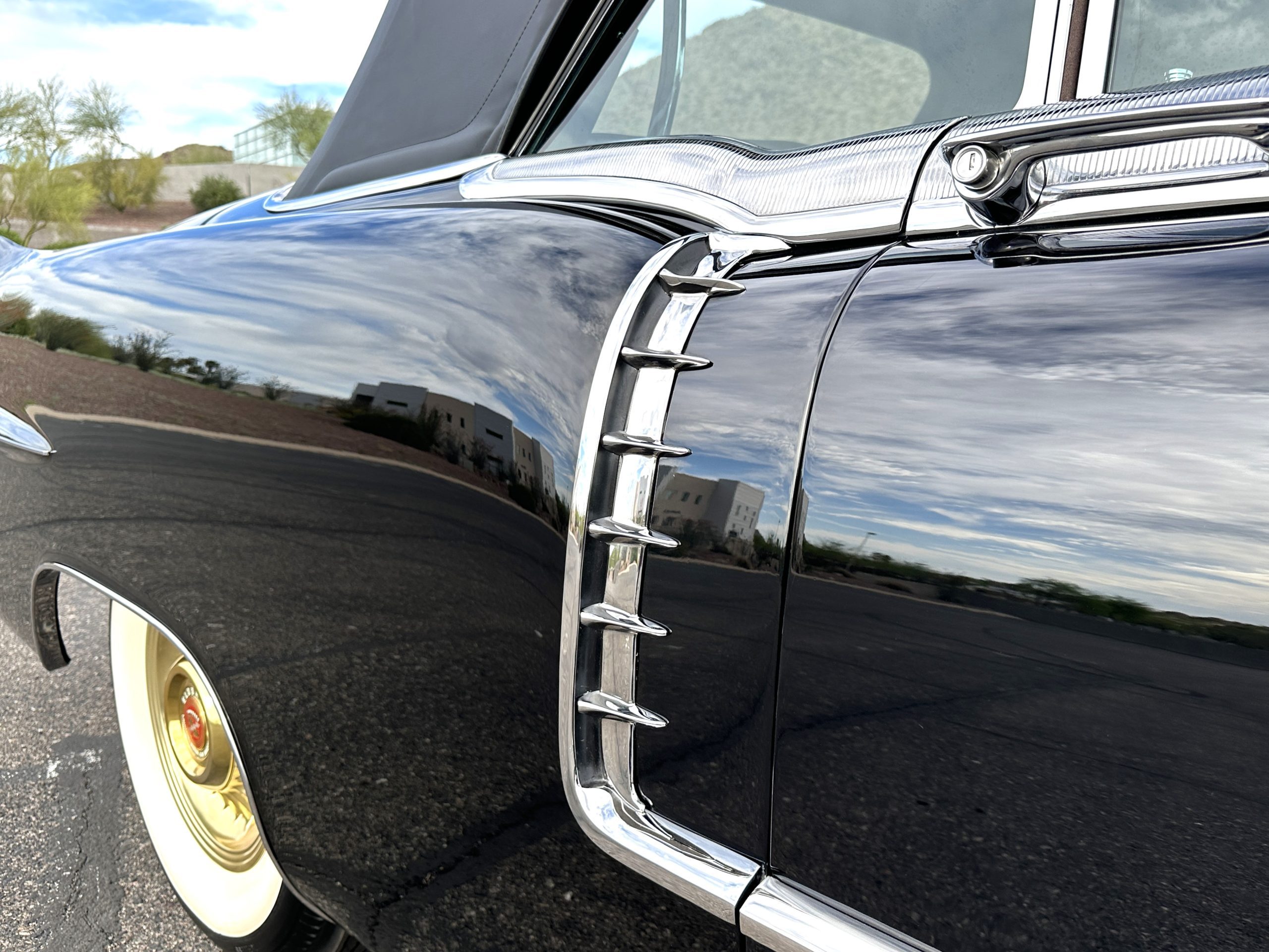 The gorgeous factory black paint (Paint Code 10) is absolutely stunning. She has incredible luster and is polished to perfection presenting a deep and rich mirror finish. The original and NOS trim details have all been meticulously replated and also polished to perfection. The door caps and side moldings are in as-new condition and devoid of imperfections. The 200-plus piece front grill was painstakingly completely disassembled and anodized in the correct gold color in California and includes a NOS Cadillac script logo. The gorgeous three-piece Sabre wheels were restored and anodized in the correct gold color by Valley Wire Wheels. She has perfect and correct new black vinyl power convertible top (Top Code 2) that had never been down before our photo shoot and operates flawlessly. The Parade Boot is in new condition and comes complete with the storage case which fits nicely into place inside the trunk with the factory correct holding straps.