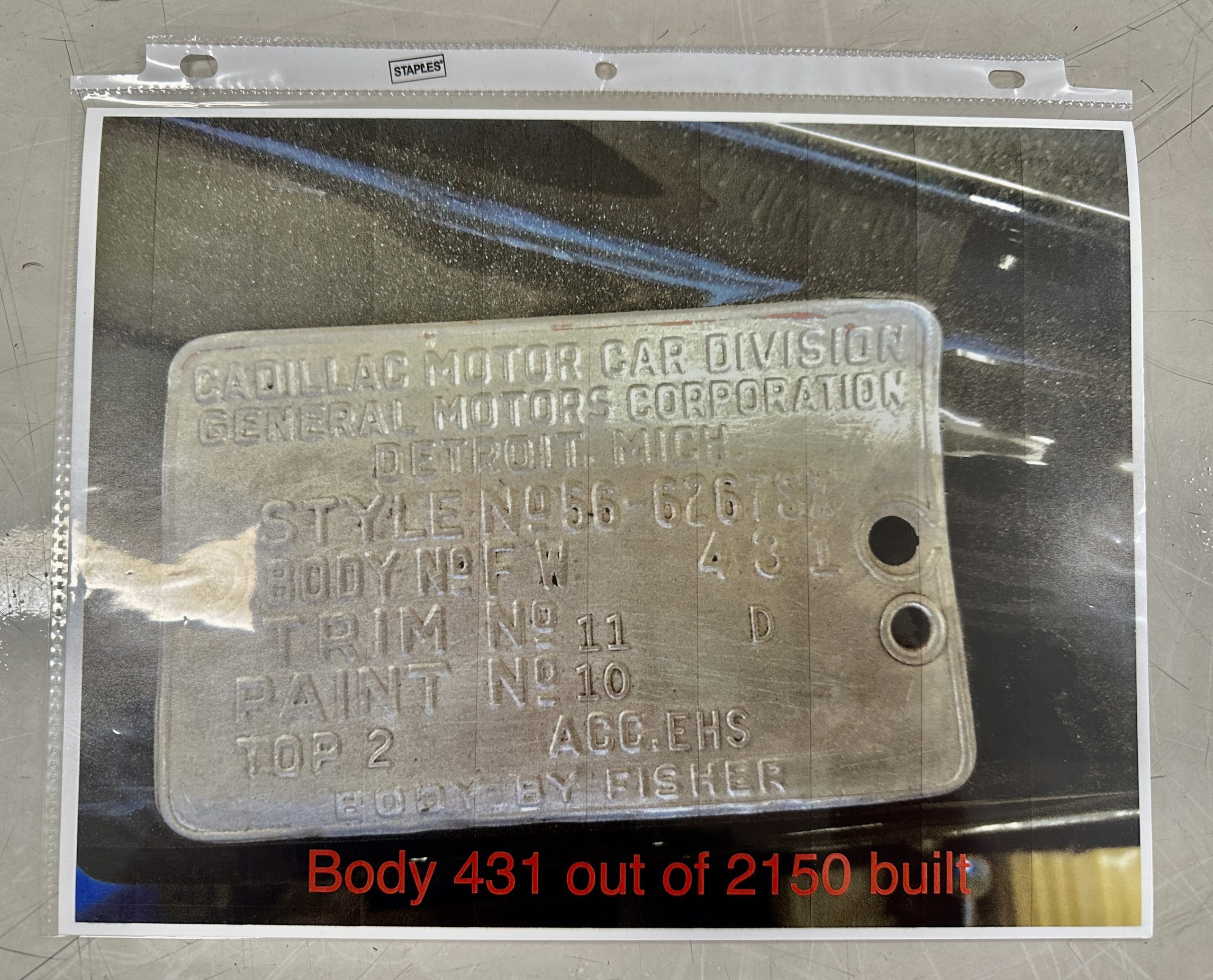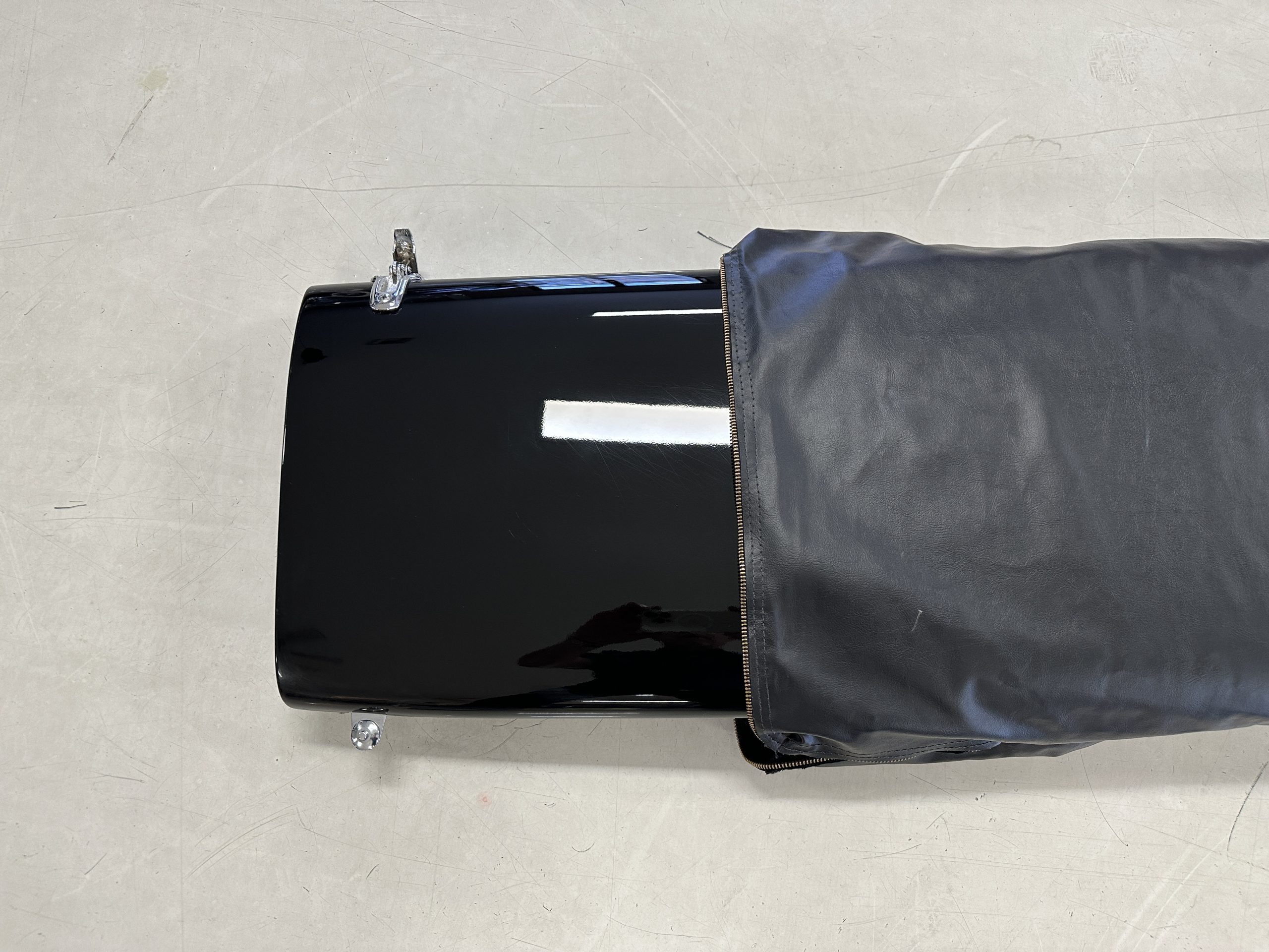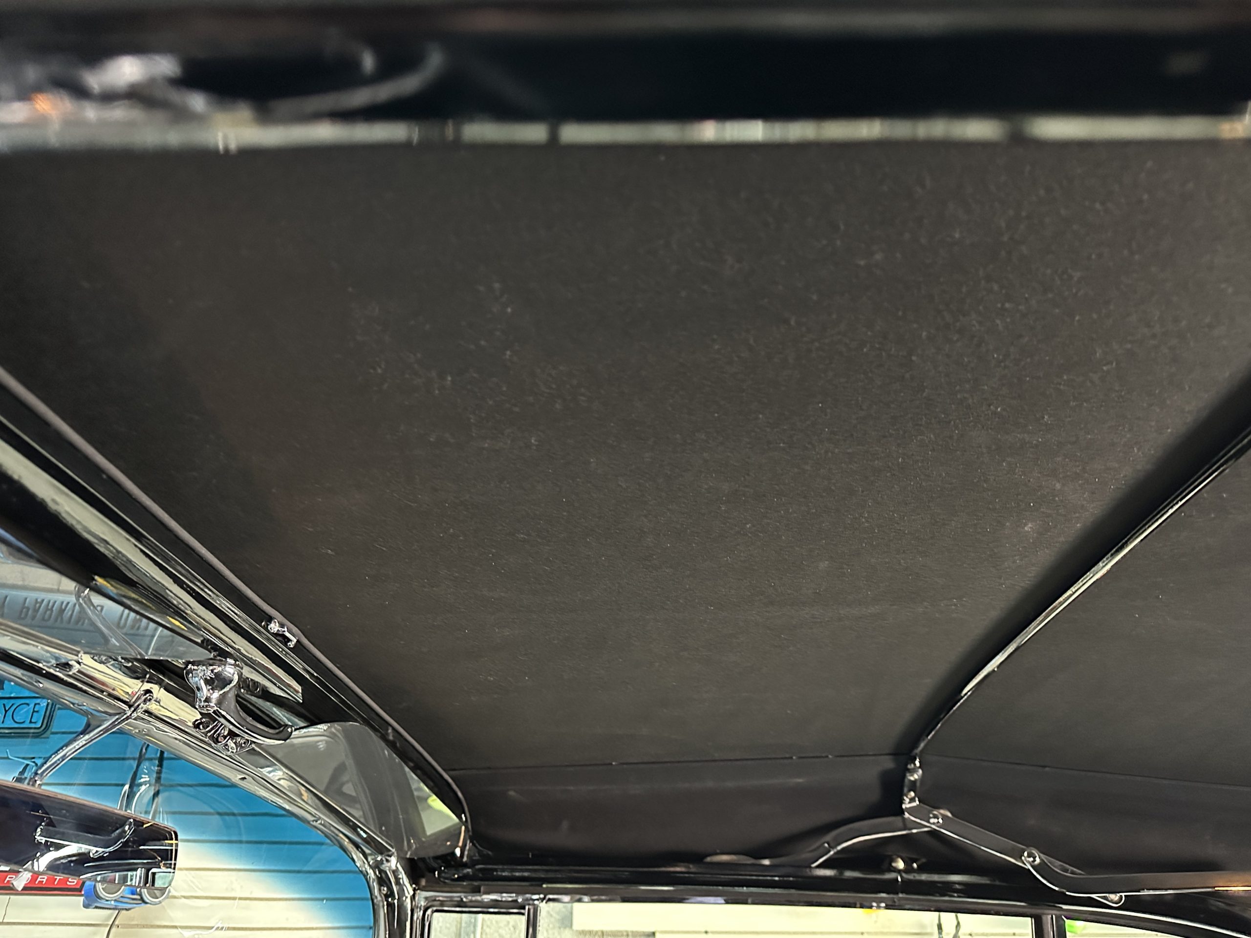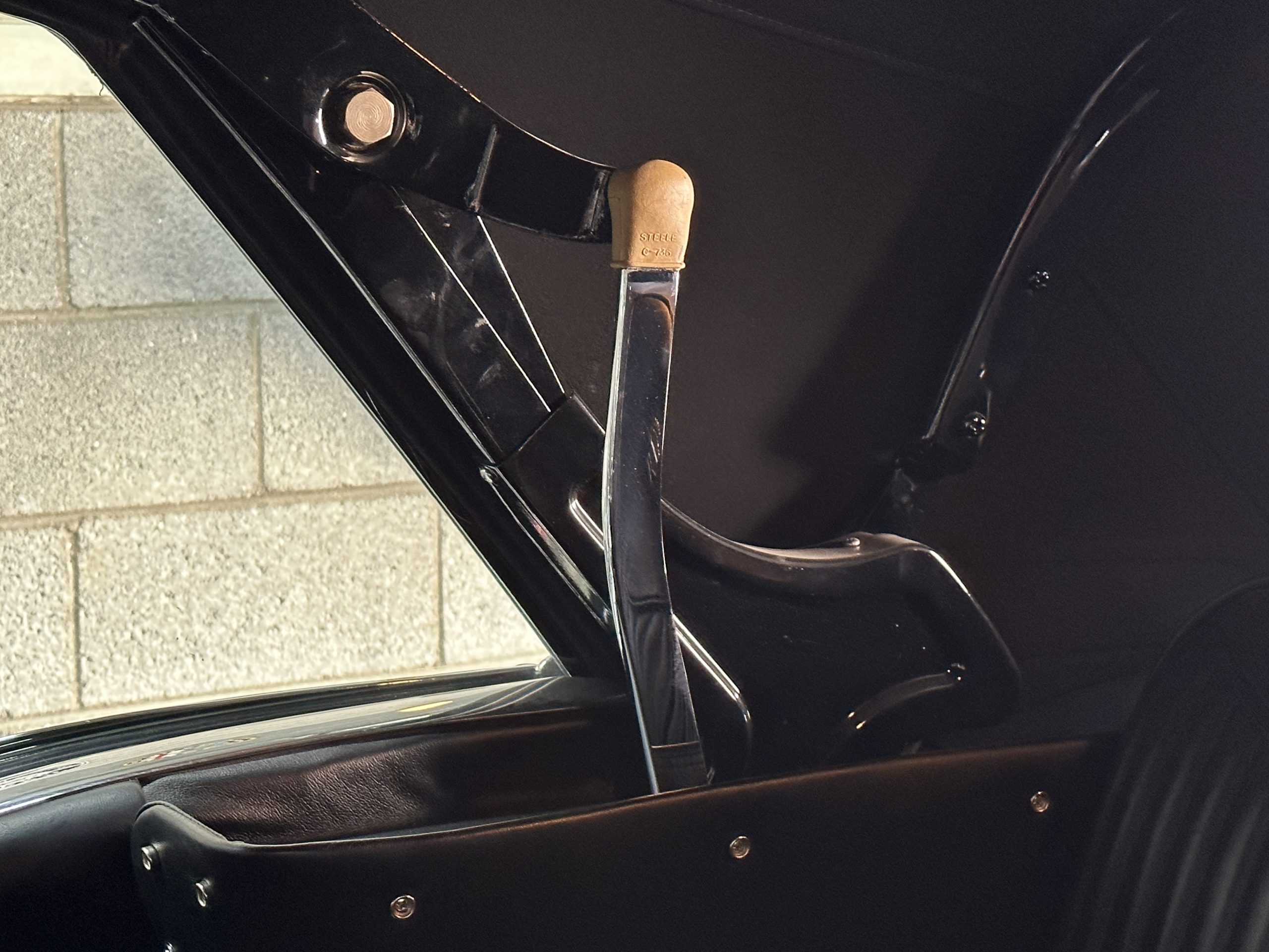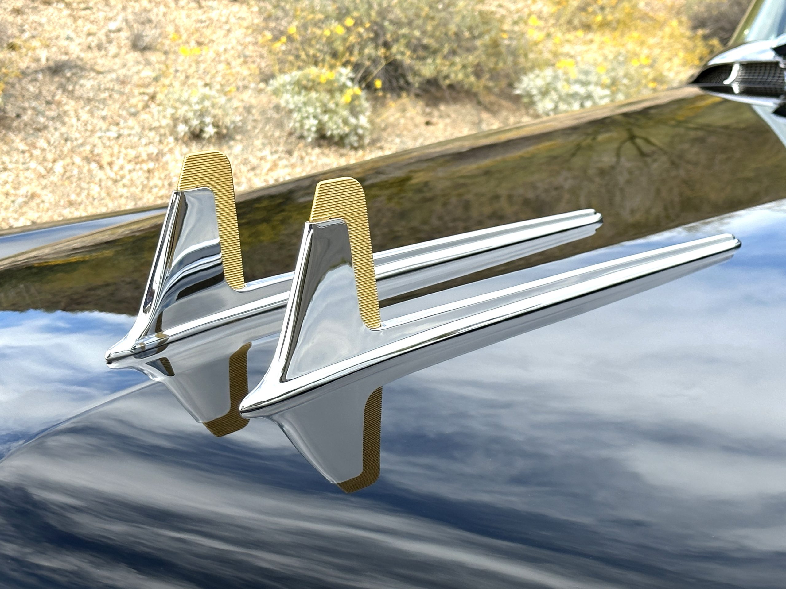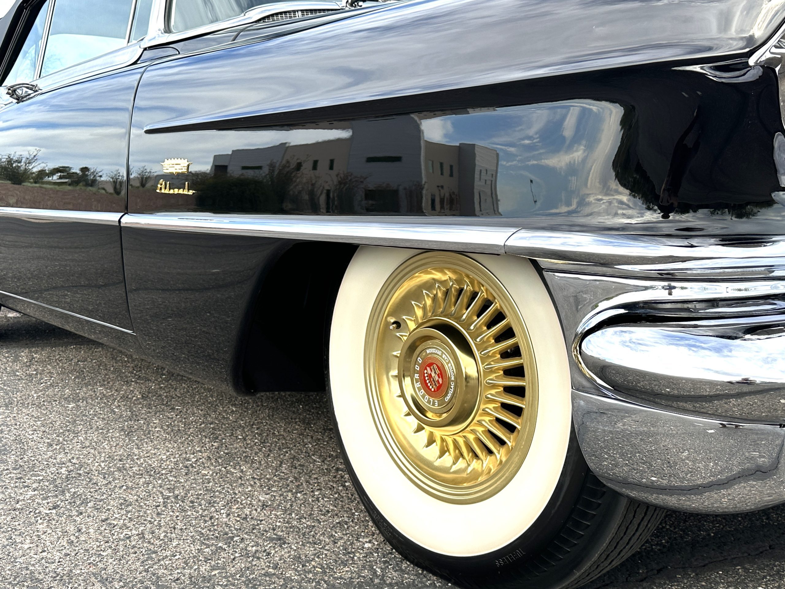 The gorgeous factory black paint (Paint Code 10) is absolutely stunning. She has incredible luster and is polished to perfection presenting a deep and rich mirror finish. The original and NOS trim details have all been meticulously replated and also polished to perfection. The door caps and side moldings are in as-new condition and devoid of imperfections. The 200-plus piece front grill was painstakingly completely disassembled and anodized in the correct gold color in California and includes a NOS Cadillac script logo. The gorgeous three-piece Sabre wheels were restored and anodized in the correct gold color by Valley Wire Wheels. She has perfect and correct new black vinyl power convertible top (Top Code 2) that had never been down before our photo shoot and operates flawlessly. The Parade Boot is in new condition and comes complete with the storage case which fits nicely into place inside the trunk with the factory correct holding straps.