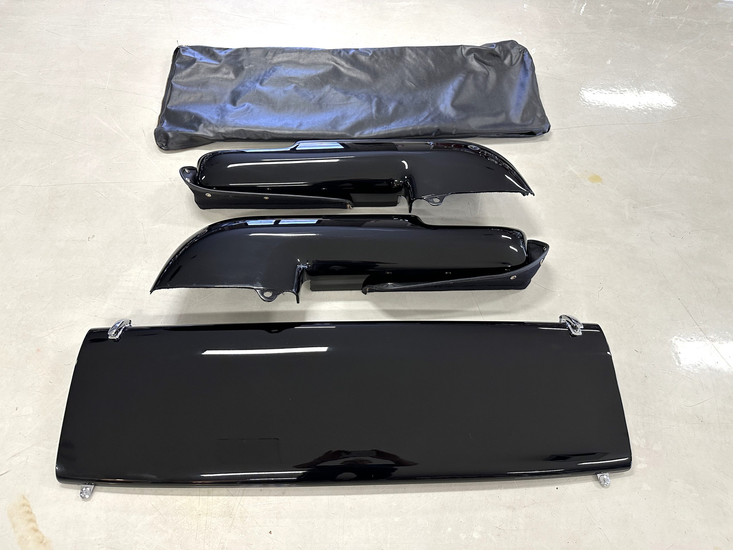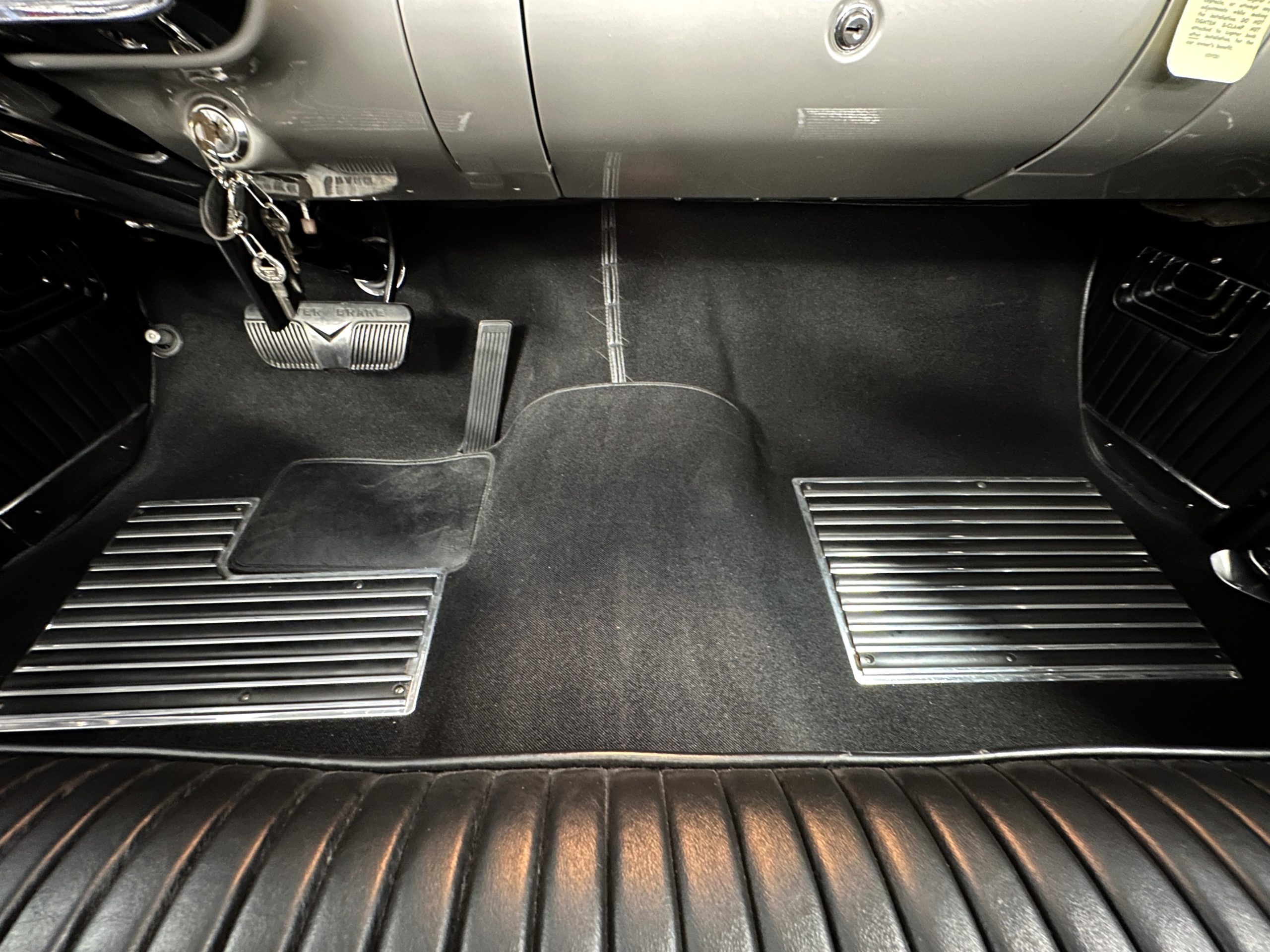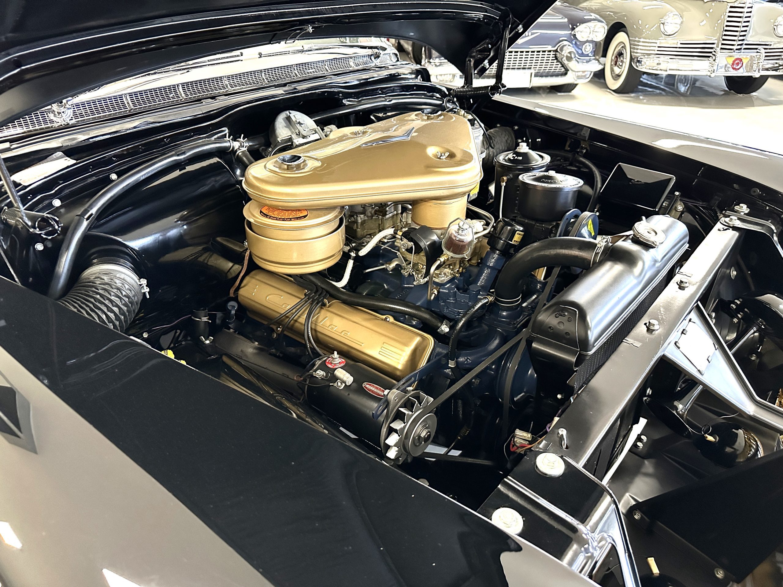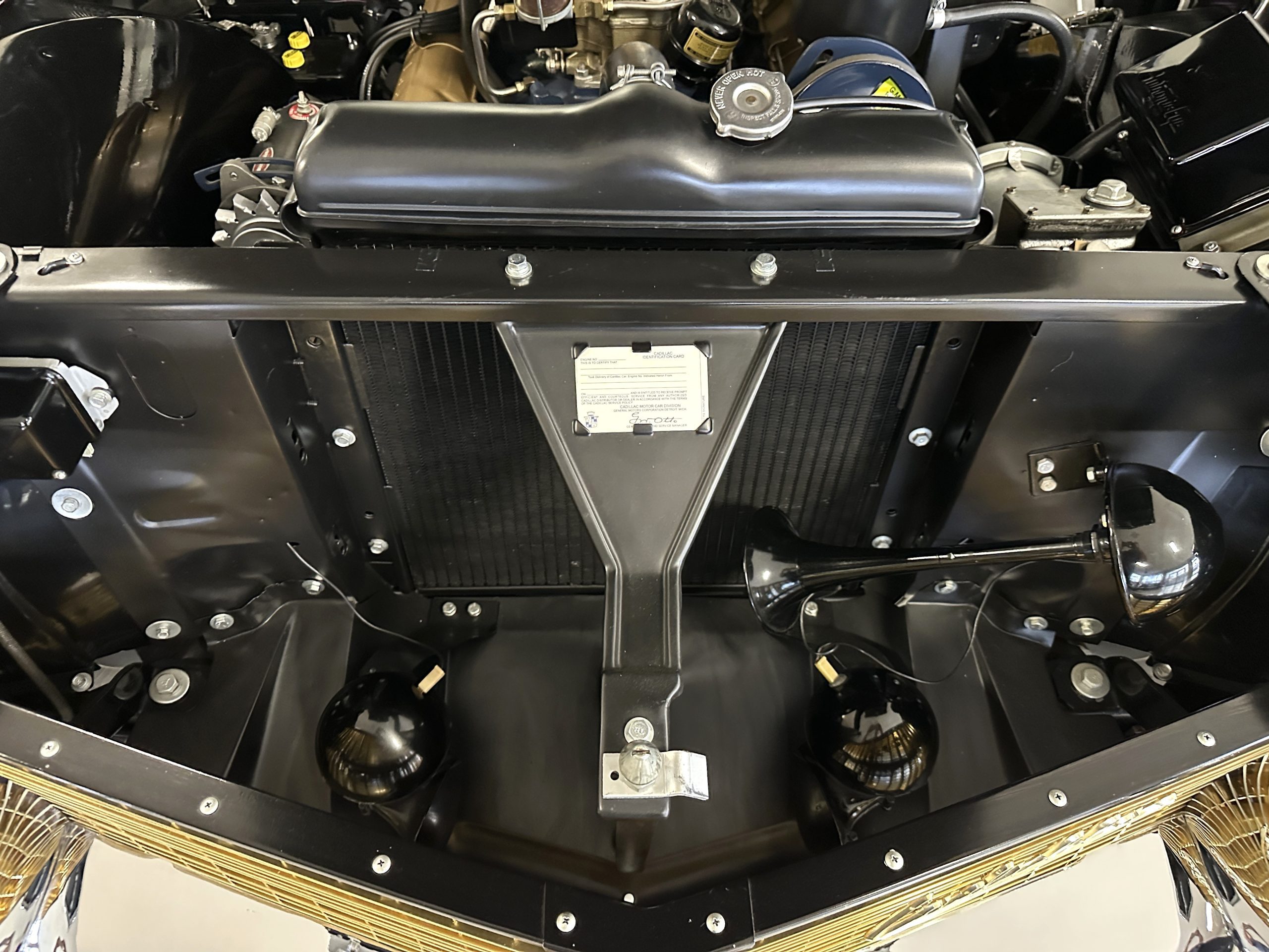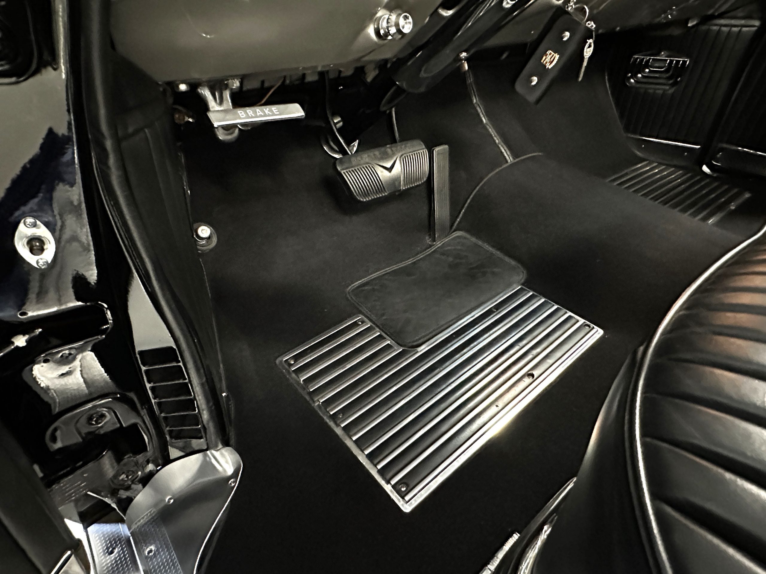 The gorgeous factory black paint (Paint Code 10) is absolutely stunning. She has incredible luster and is polished to perfection presenting a deep and rich mirror finish. The original and NOS trim details have all been meticulously replated and also polished to perfection. The door caps and side moldings are in as-new condition and devoid of imperfections. The 200-plus piece front grill was painstakingly completely disassembled and anodized in the correct gold color in California and includes a NOS Cadillac script logo. The gorgeous three-piece Sabre wheels were restored and anodized in the correct gold color by Valley Wire Wheels. She has perfect and correct new black vinyl power convertible top (Top Code 2) that had never been down before our photo shoot and operates flawlessly. The Parade Boot is in new condition and comes complete with the storage case which fits nicely into place inside the trunk with the factory correct holding straps.