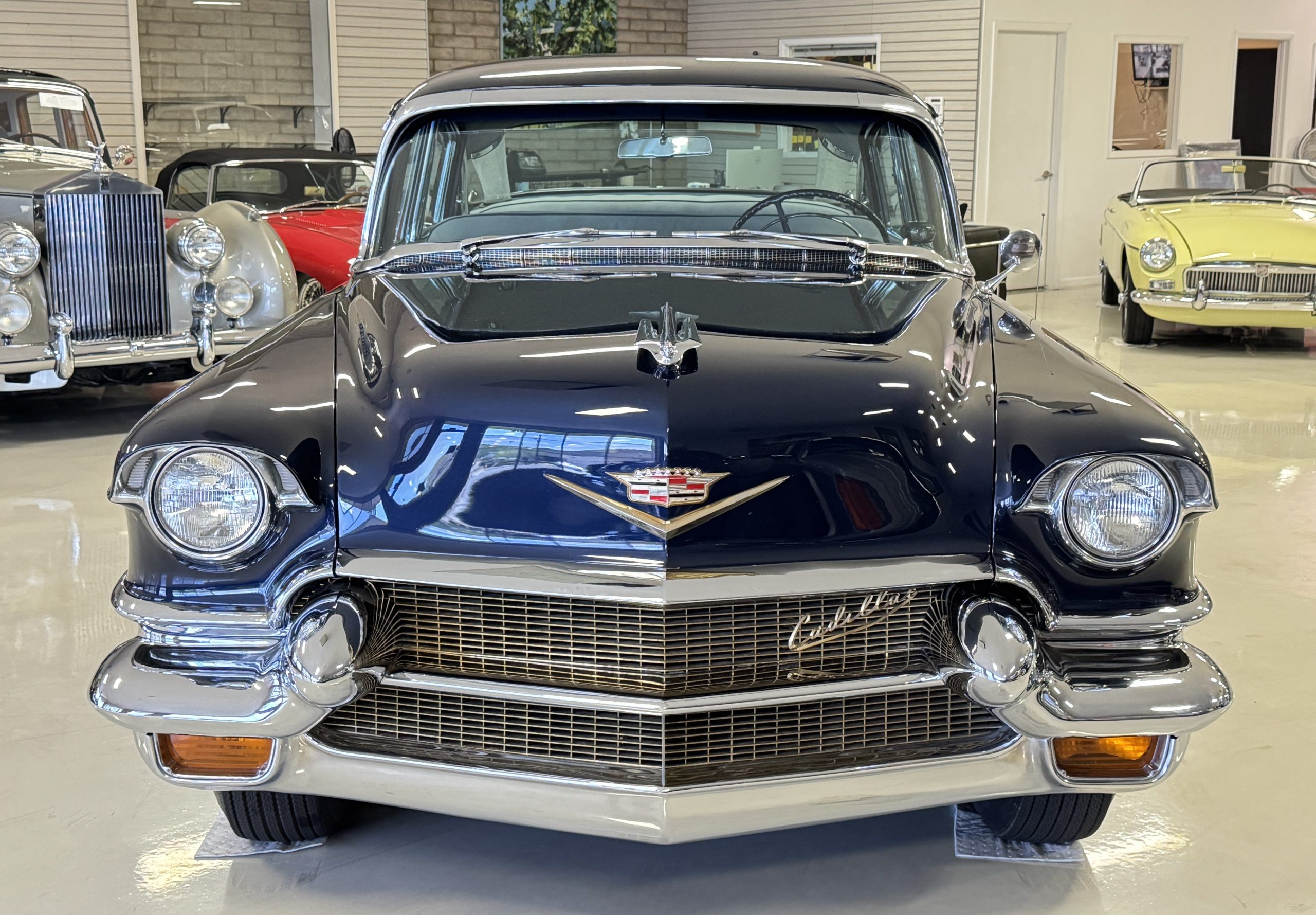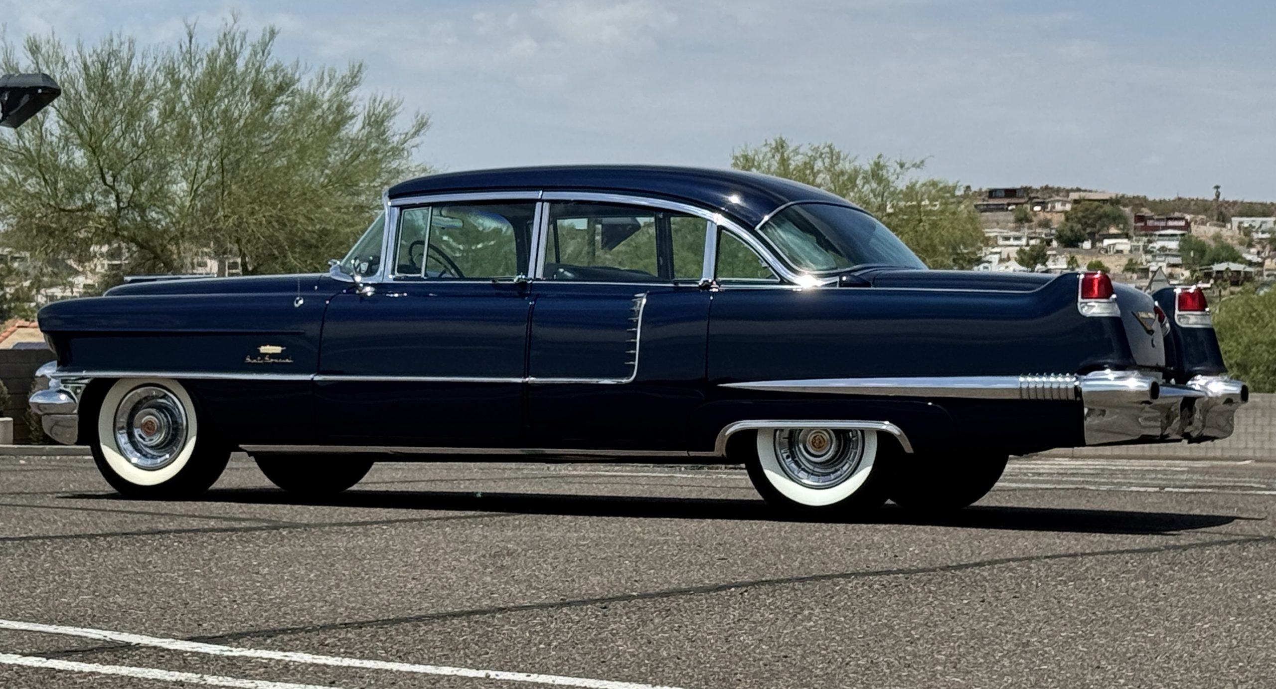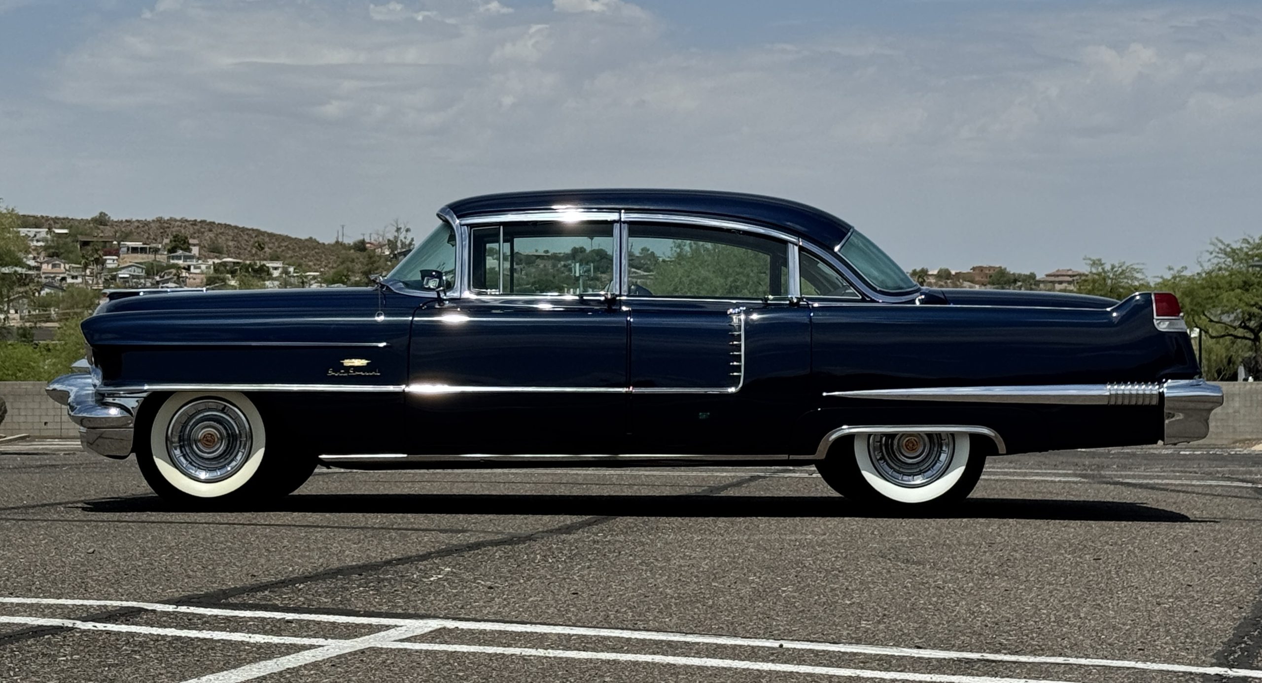 This is a beautiful 1956 Cadillac Fleetwood Sixty Special that is an older restoration that is in very good overall condition with 21,000 miles. The Sixty Special was top of the line model offered by Cadillac that has a spacious and luxurious interior similar to a limousine. The gorgeous Cobalt Blue exterior with the rare optional gold trim along with front and rear air conditioning, make this an ideal classic daily driver, weekend show car or touring.