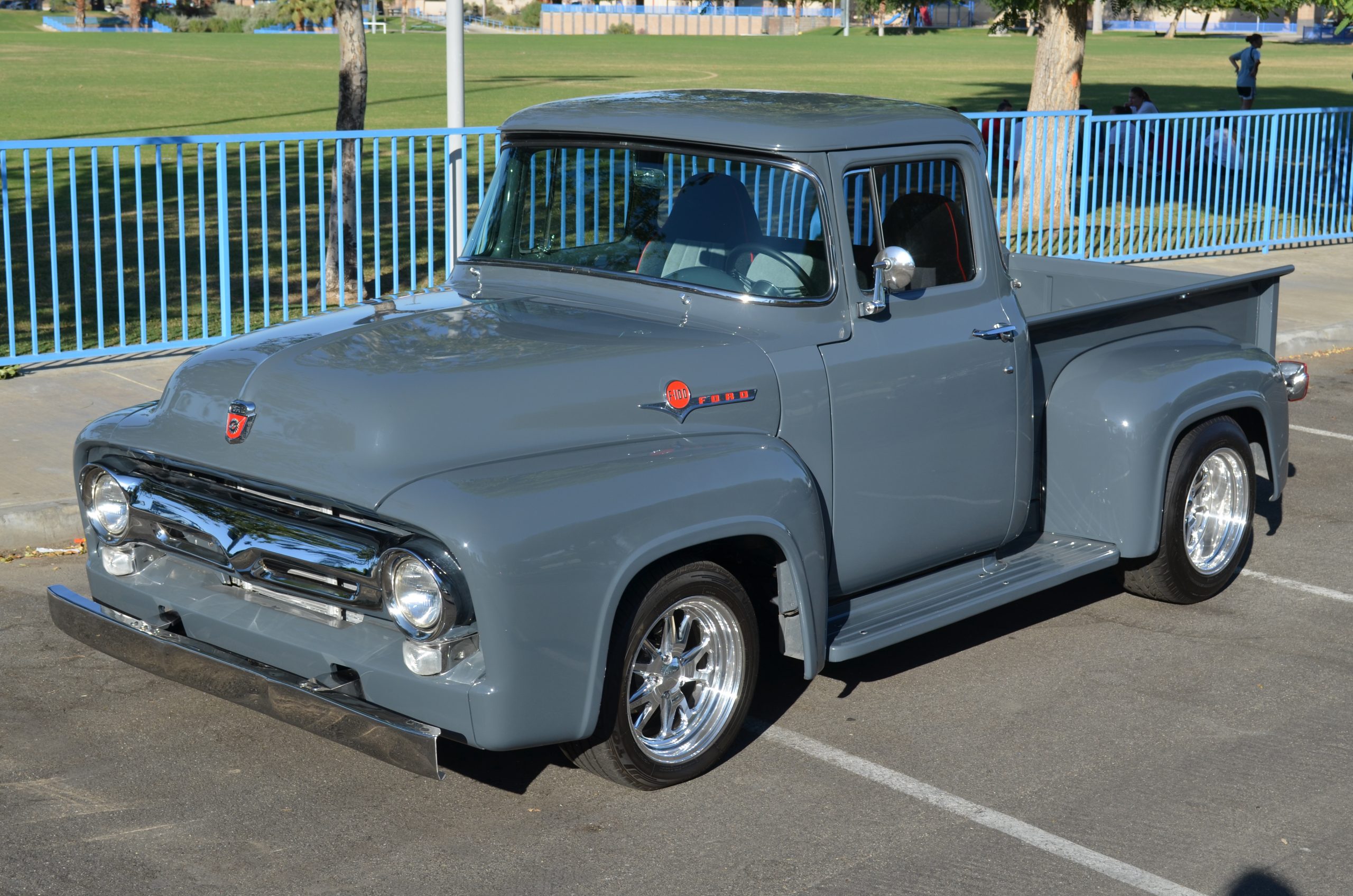 We are very proud to offer this new consignment. It is a gorgeous custom on a California since new 1956 Ford F-100 Big Window truck. This truck offers daily dependability and relative comfort, with Vintage Air air conditioning and full power… It is equipped with a fully tricked out looking 350 cu in Chevy V8 delivering approximately 300 HP with a Turbo 400 transmission. Watching it drive down the road with the rotating fully polished independent Corvette rear end is a trip!